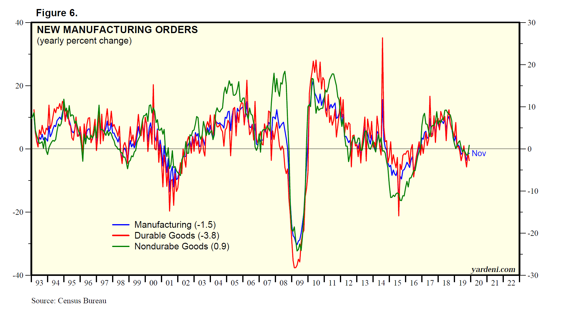 (3) Factory orders. The weakness in manufacturing was confirmed by the release yesterday of factory orders, which fell 1.5% y/y during November with durables down 3.8% and nondurables up only 0.9% (Fig. 6).