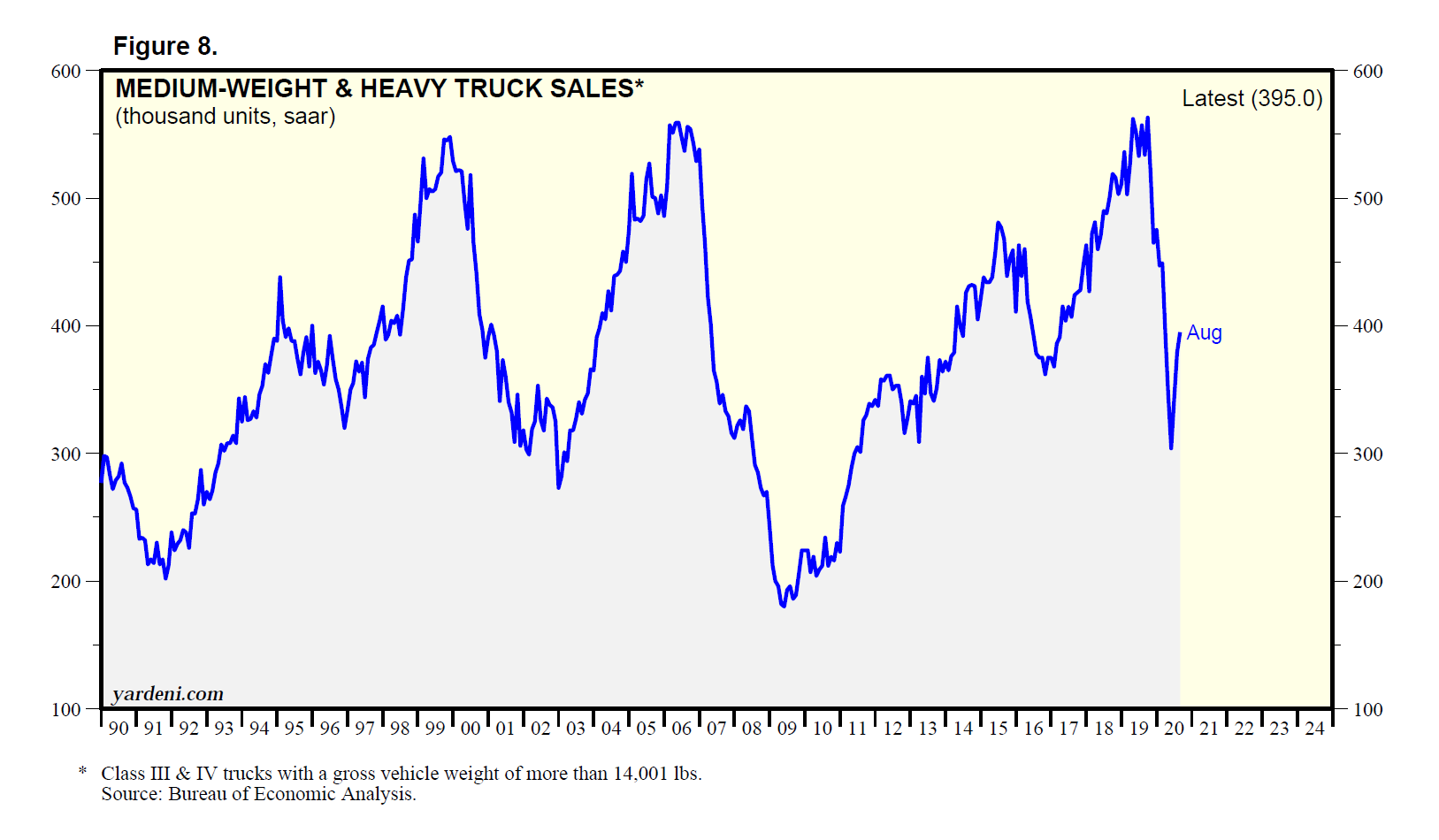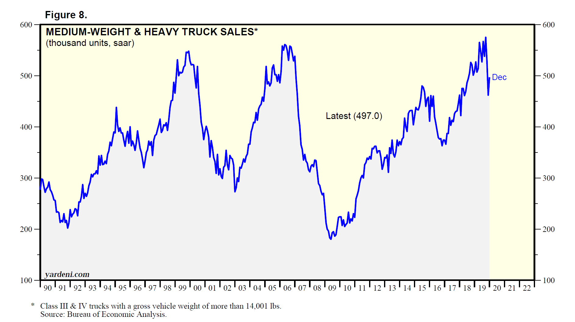 (4) Truck and rail traffic. Also on the weak side last November was the ATA truck tonnage index, which fell 3.5% m/m and 2.1% y/y (Fig. 7). However, it remains in a volatile range in record-high territory. Then again, medium-weight and heavy-weight truck sales dropped 12.3% m/m during November but recovered some of that loss with a 7.6% m/m gain during December (Fig. 8).