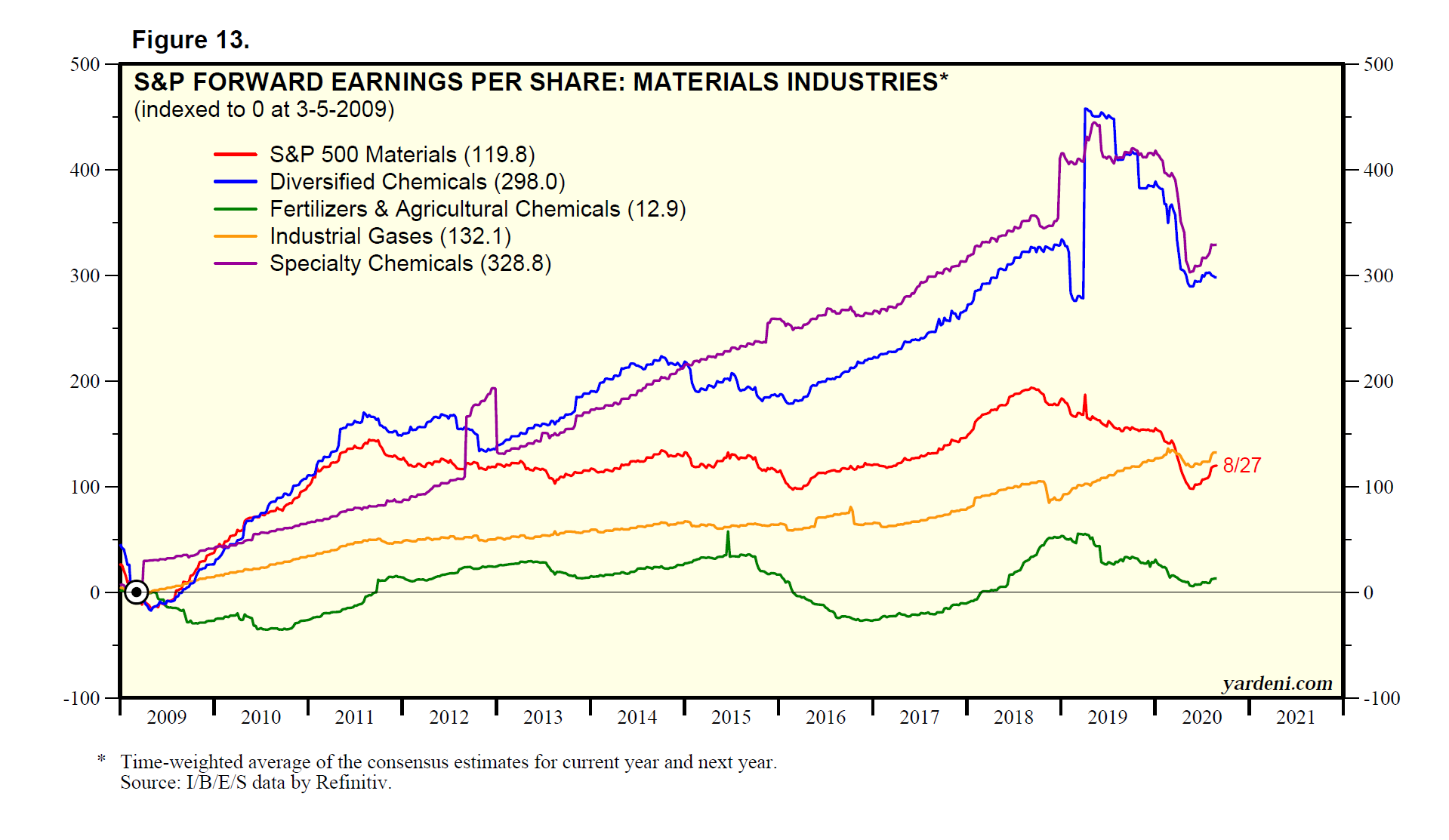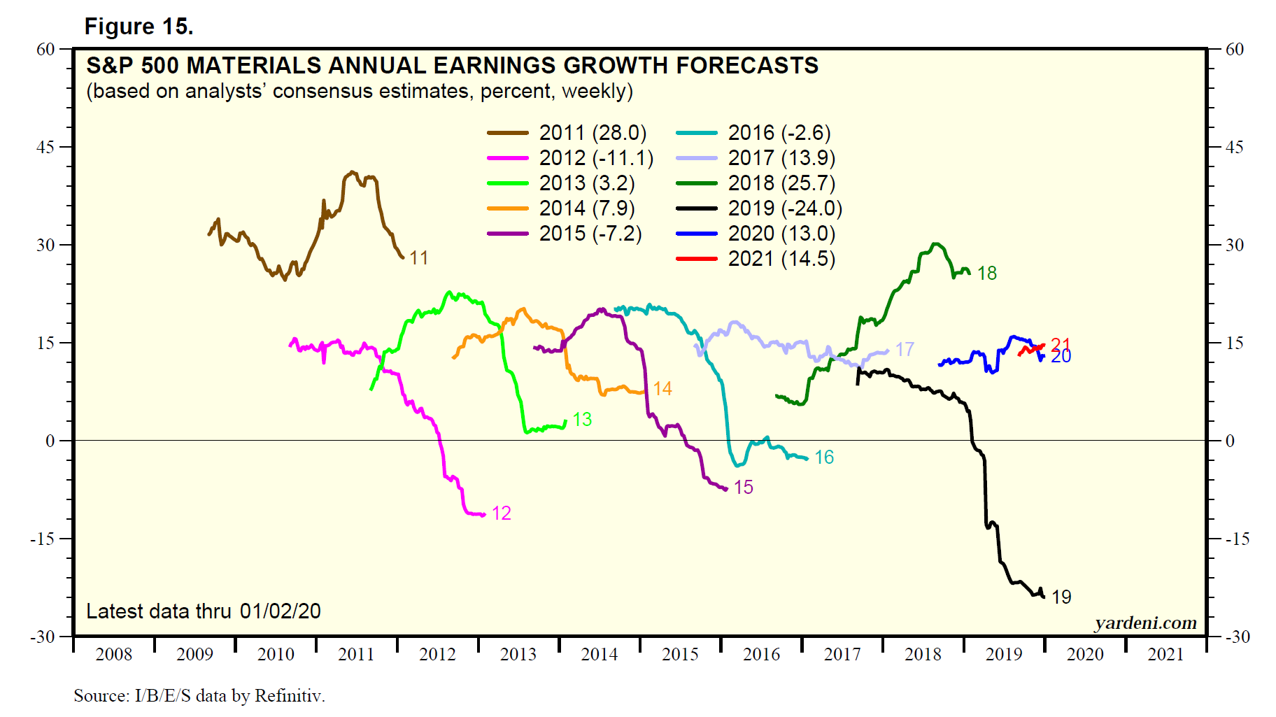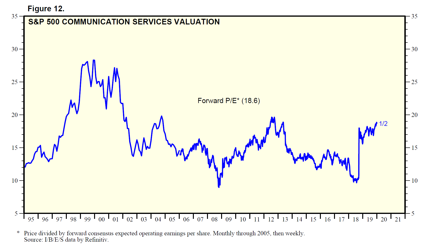 (4) High P/E but growing fast. A tougher call is what to do with sectors that are growing quickly and have a lot of good news reflected in their earnings multiple. The Consumer Discretionary sector’s forward P/E of 22.1 is almost twice its 12.5% 2020 earnings growth rate (Fig. 10 and Fig. 11). The same applies to Communications Services, which has a high forward P/E of 18.6 but also expected 2020 earnings growth of 10.8% (Fig. 12 and Fig. 13). The Materials sector is a surprise member of this category, with a 18.2 forward P/E and above-market earnings growth of 13.0% (Fig. 14 and Fig. 15).