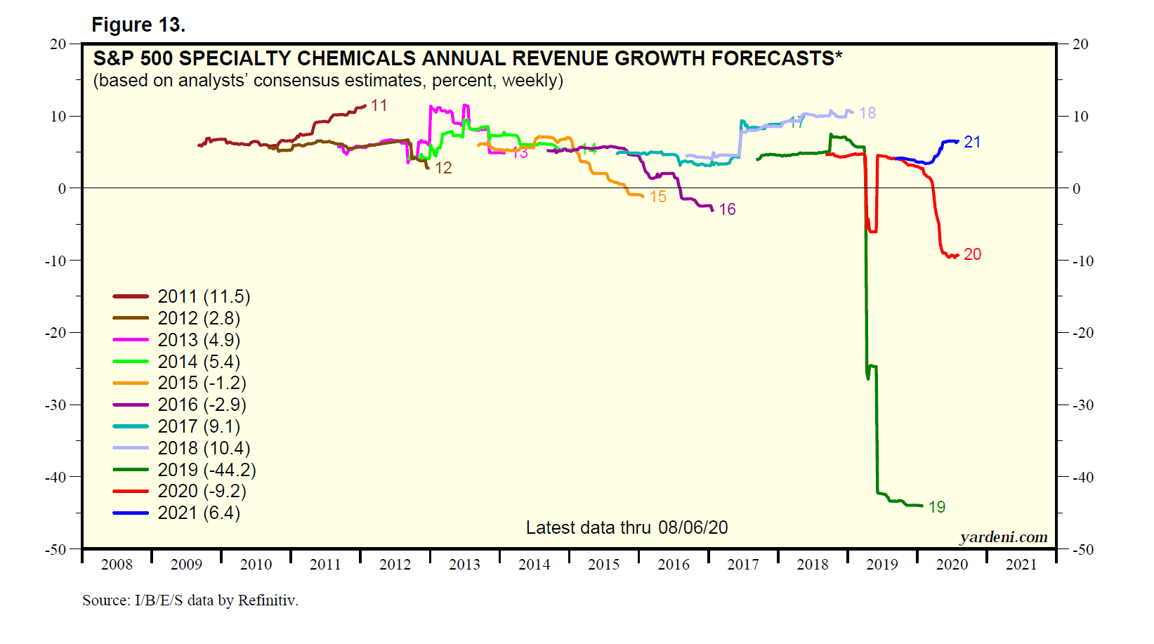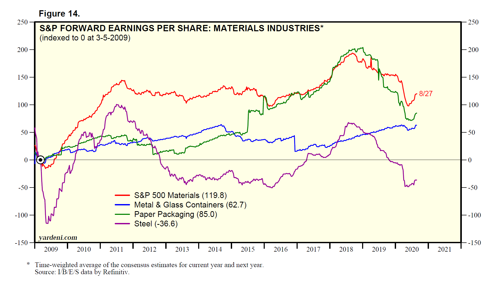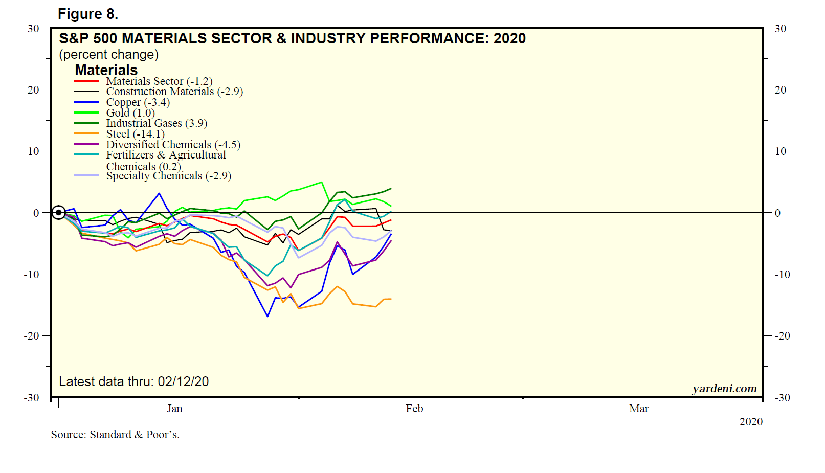(4) High P/E but growing fast. A tougher call is what to do with sectors that are growing quickly and have a lot of good news reflected in their earnings multiple. The Consumer Discretionary sector’s forward P/E of 22.1 is almost twice its 12.5% 2020 earnings growth rate (Fig. 10 and Fig. 11). The same applies to Communications Services, which has a high forward P/E of 18.6 but also expected 2020 earnings growth of 10.8% (Fig. 12 and Fig. 13). The Materials sector is a surprise member of this category, with a 18.2 forward P/E and above-market earnings growth of 13.0% (Fig. 14 and Fig. 15).
