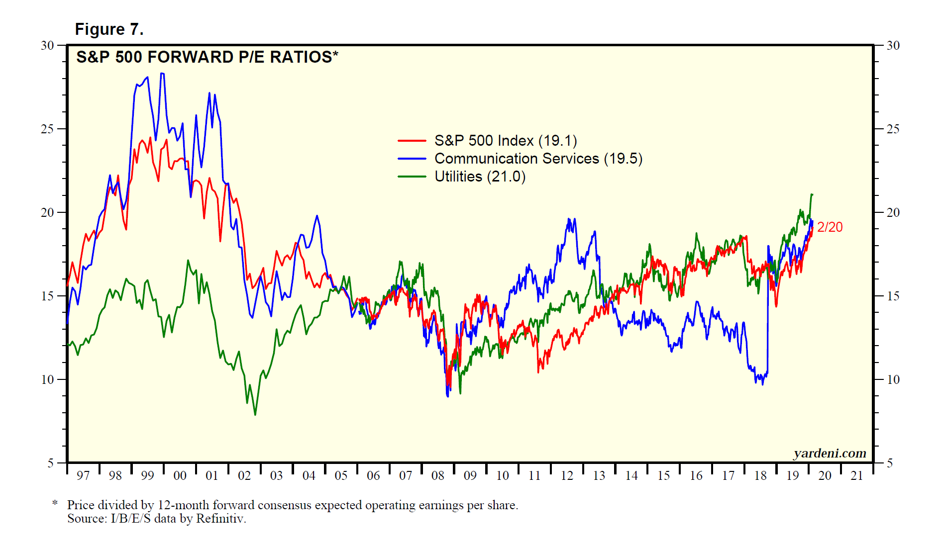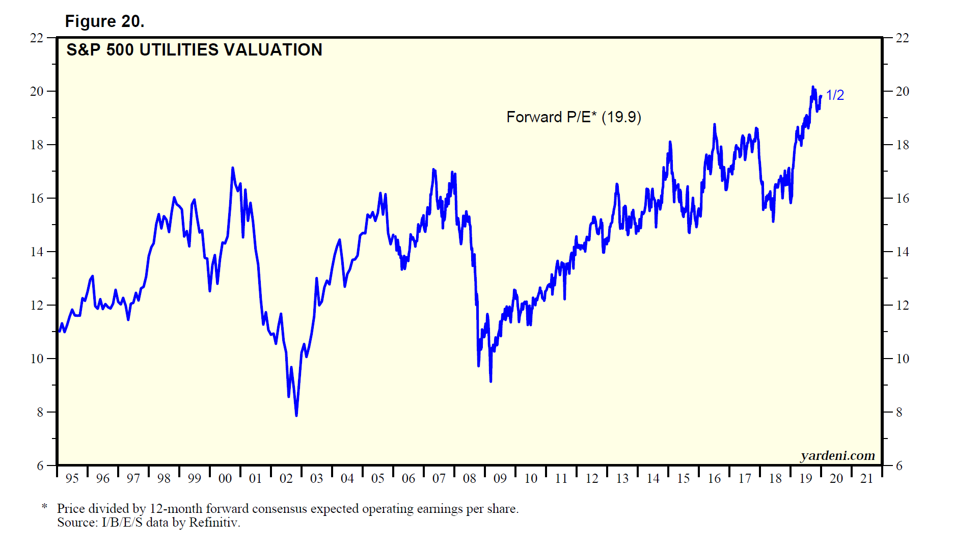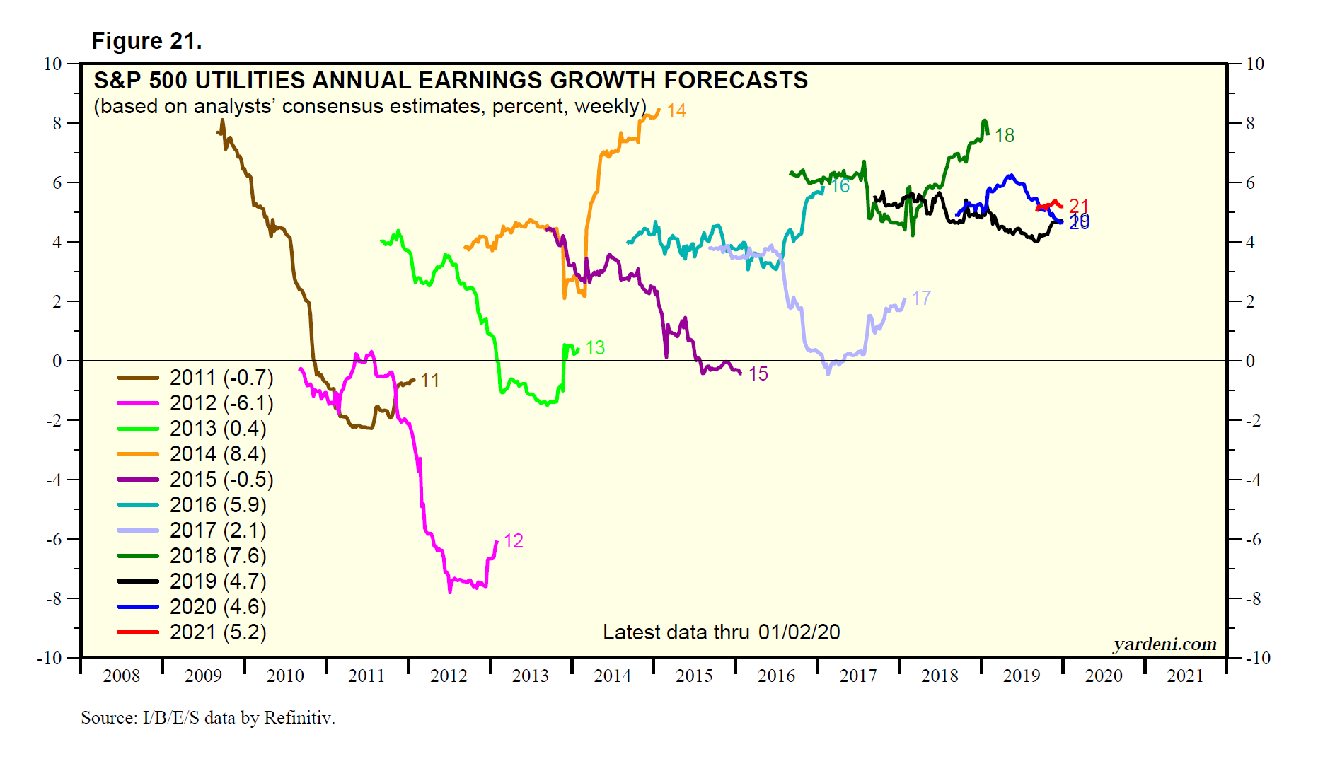 (5) Watch out below. The real head scratchers are Information Technology, Consumer Staples, and Utilities industries. They each have very high P/Es and very low expected earnings growth. The Tech sector, with its 21.5 forward P/E, is the market’s third most expensive sector. Yet it’s only forecast to grow earnings 7.7%, far below the S&P 500’s growth rate of 8.9% (Fig. 16 and Fig. 17). Consumer Staples’ 20.1 forward P/E is multiples of the expected 6.4% 2020 earnings growth (Fig. 18 and Fig. 19). Likewise, Utilities’ 19.9 forward P/E looks lofty relative to a 4.6% earnings growth estimate (Fig. 20 and Fig. 21). That’s an awfully high price to pay for safety.