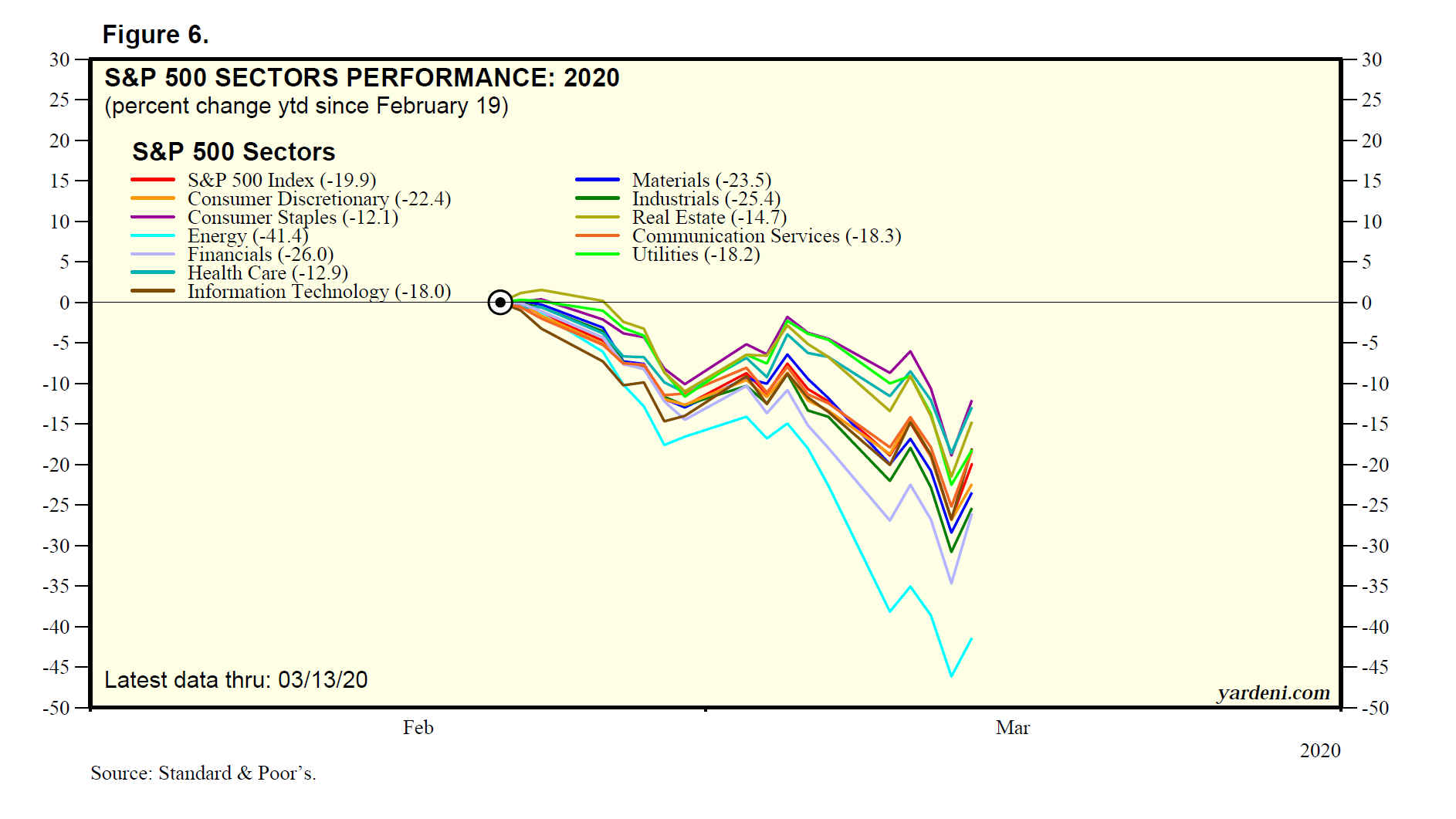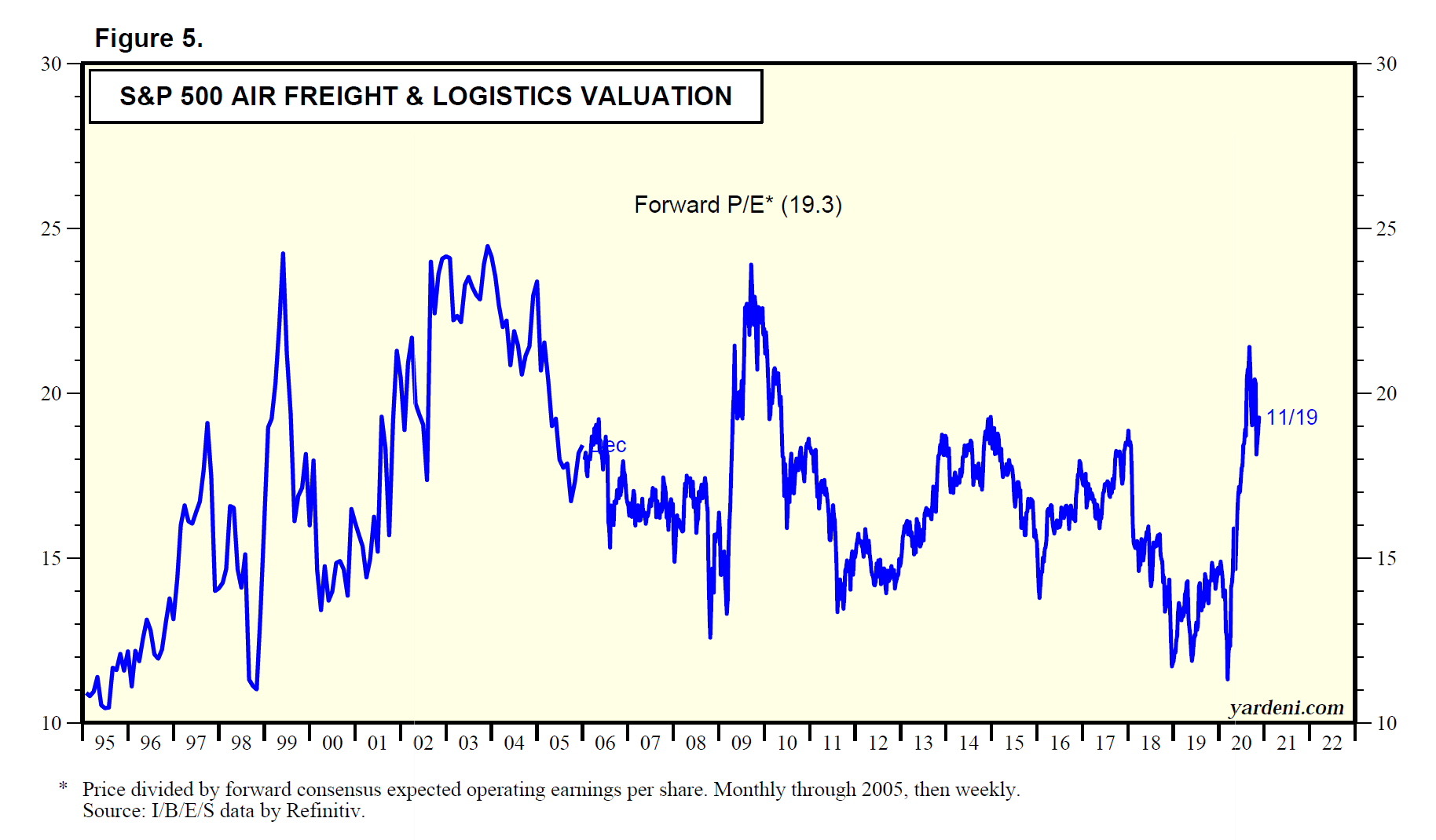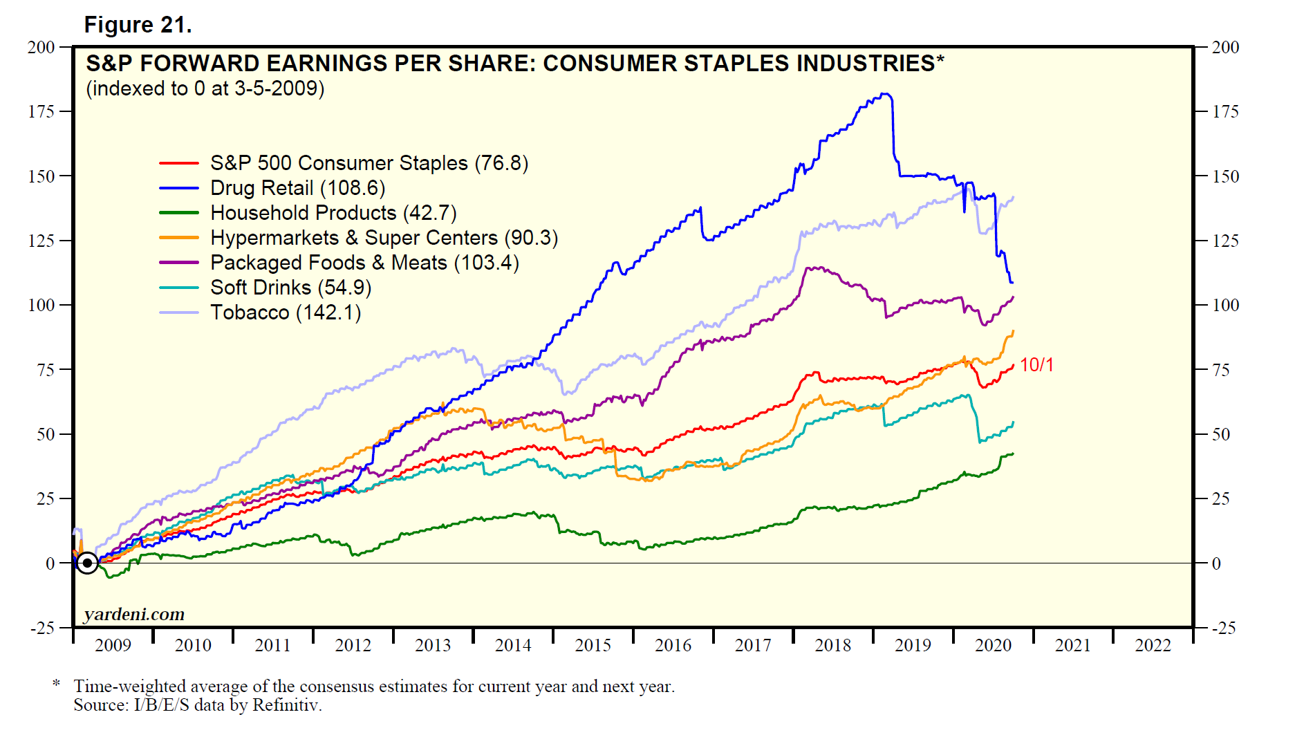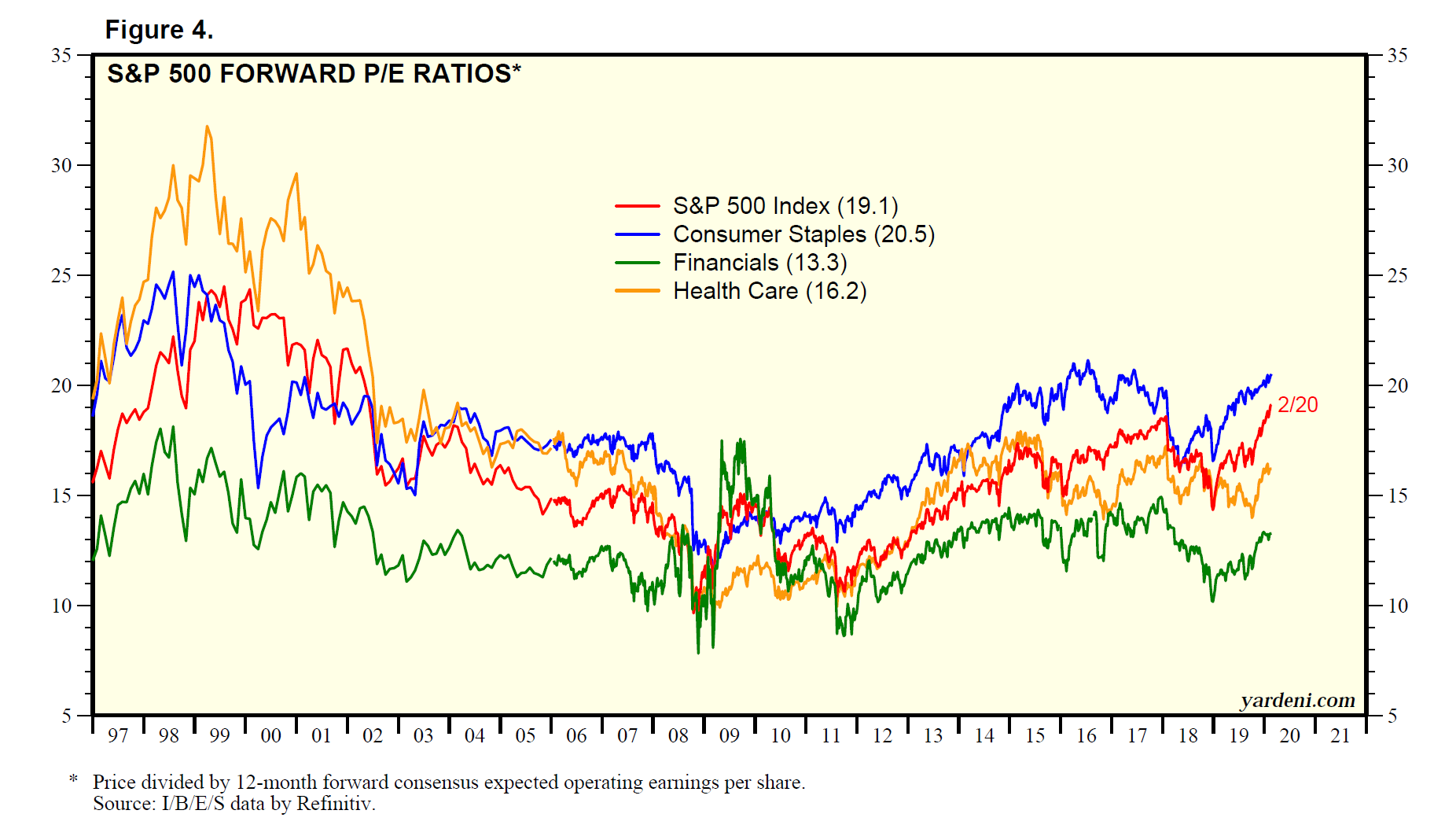 (5) Watch out below. The real head scratchers are Information Technology, Consumer Staples, and Utilities industries. They each have very high P/Es and very low expected earnings growth. The Tech sector, with its 21.5 forward P/E, is the market’s third most expensive sector. Yet it’s only forecast to grow earnings 7.7%, far below the S&P 500’s growth rate of 8.9% (Fig. 16 and Fig. 17). Consumer Staples’ 20.1 forward P/E is multiples of the expected 6.4% 2020 earnings growth (Fig. 18 and Fig. 19). Likewise, Utilities’ 19.9 forward P/E looks lofty relative to a 4.6% earnings growth estimate (Fig. 20 and Fig. 21). That’s an awfully high price to pay for safety.