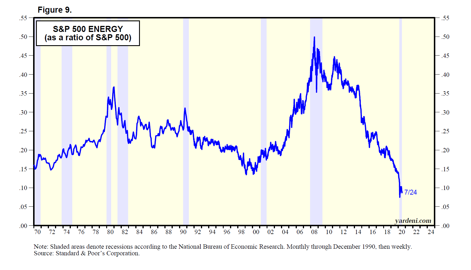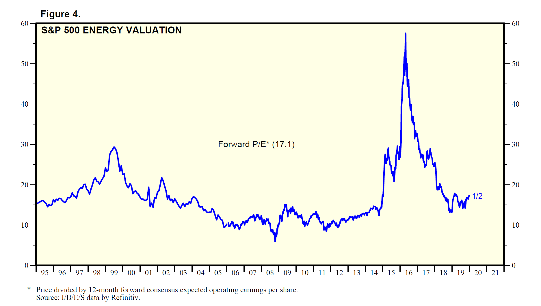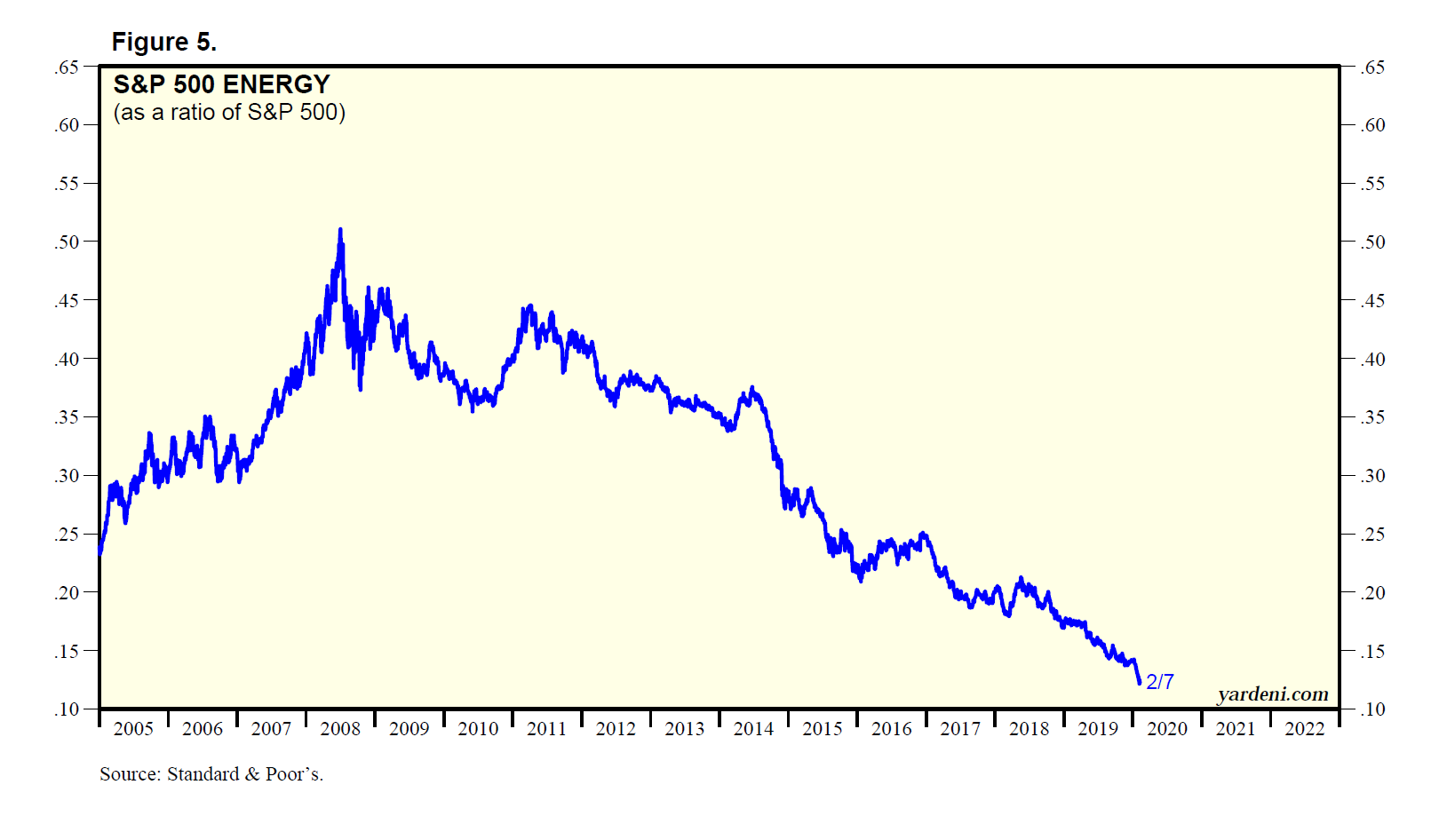 (2) Potential for improvement. It’s notable that some of the sectors with the lowest P/Es are expected to have some of the fastest earnings growth this year. If analysts are correct, those sectors could fare well. For example, the S&P 500 Industrials sector has a 16.8 forward P/E but analysts are forecasting 13.9% earnings growth, making it the second-fastest growing sector in the S&P 500 (Fig. 2 and Fig. 3). Likewise, the Energy sector, with a below-market forward P/E of 17.1, is expected to grow earnings by 22.9% in 2020, rebounding from a 27.7% decline in earnings last year (Fig. 4 and Fig. 5).