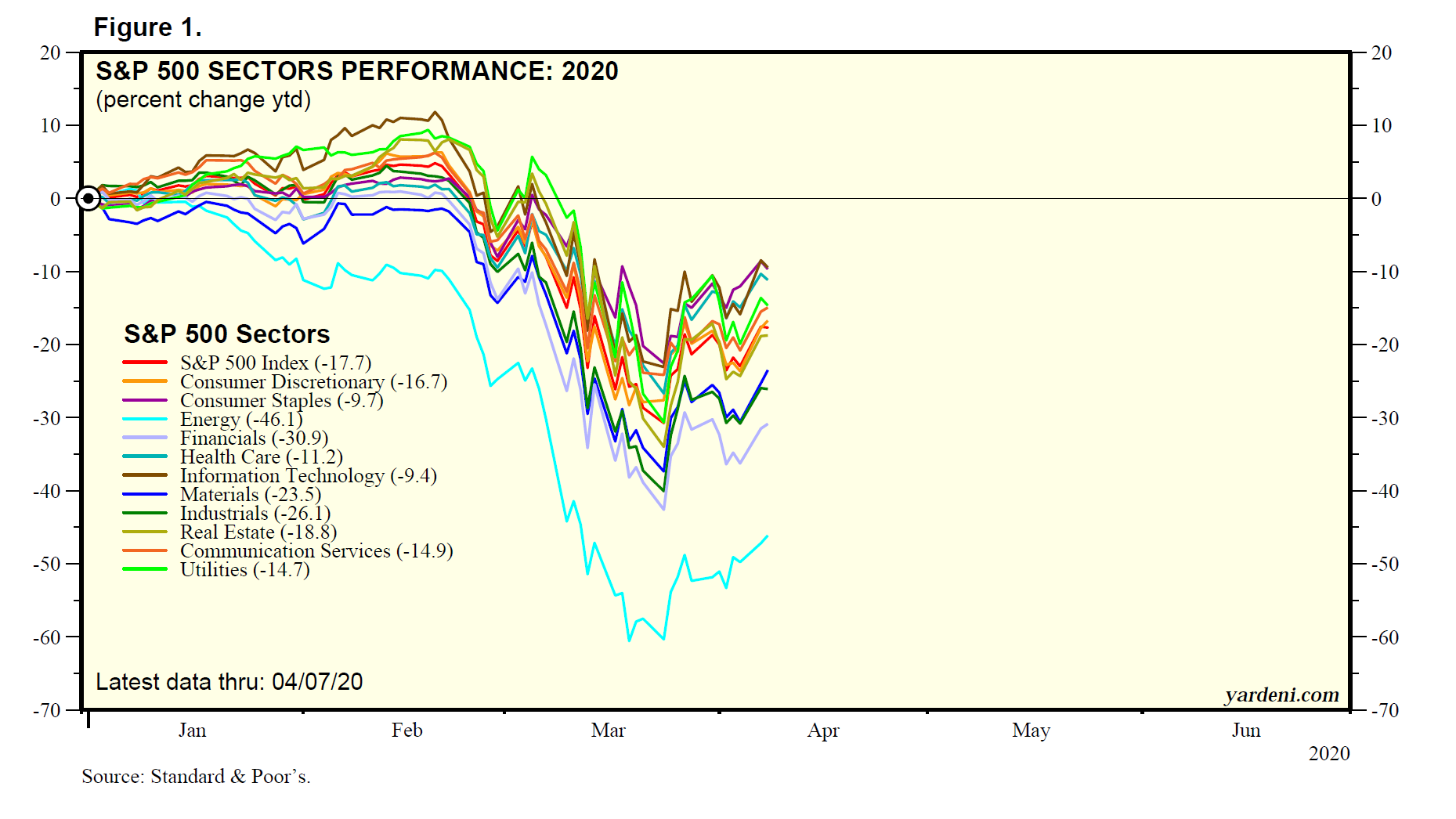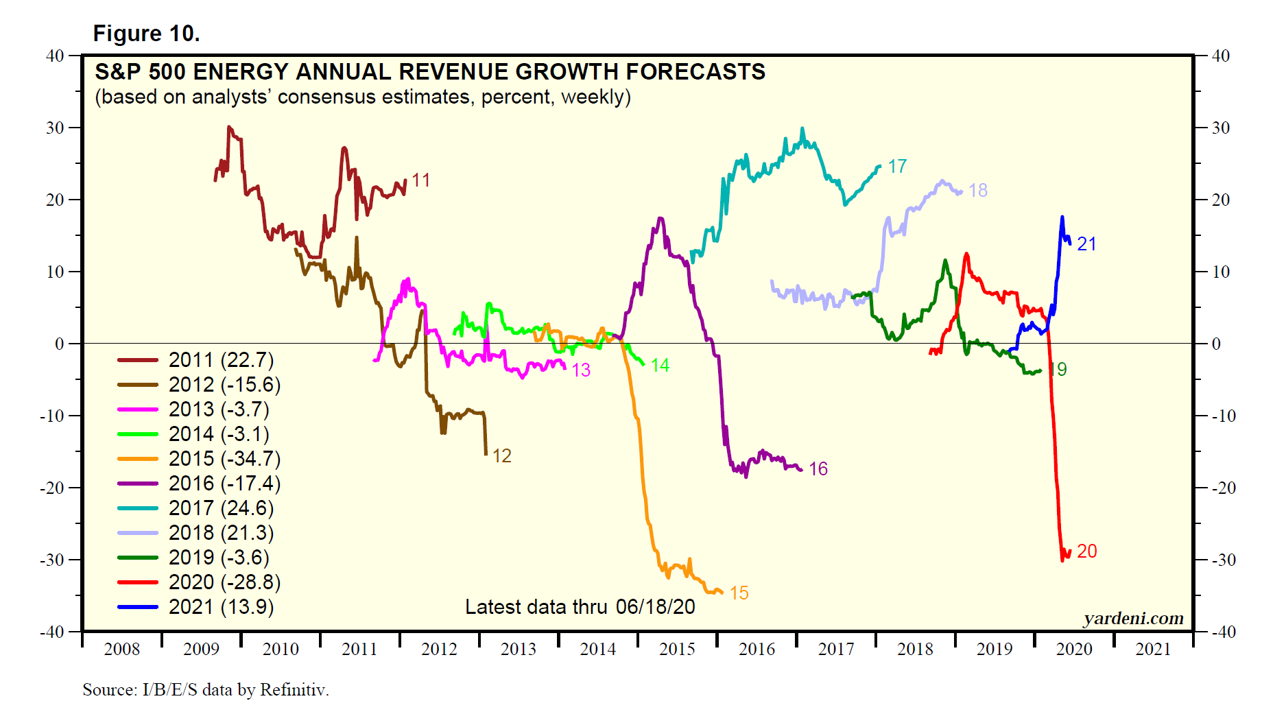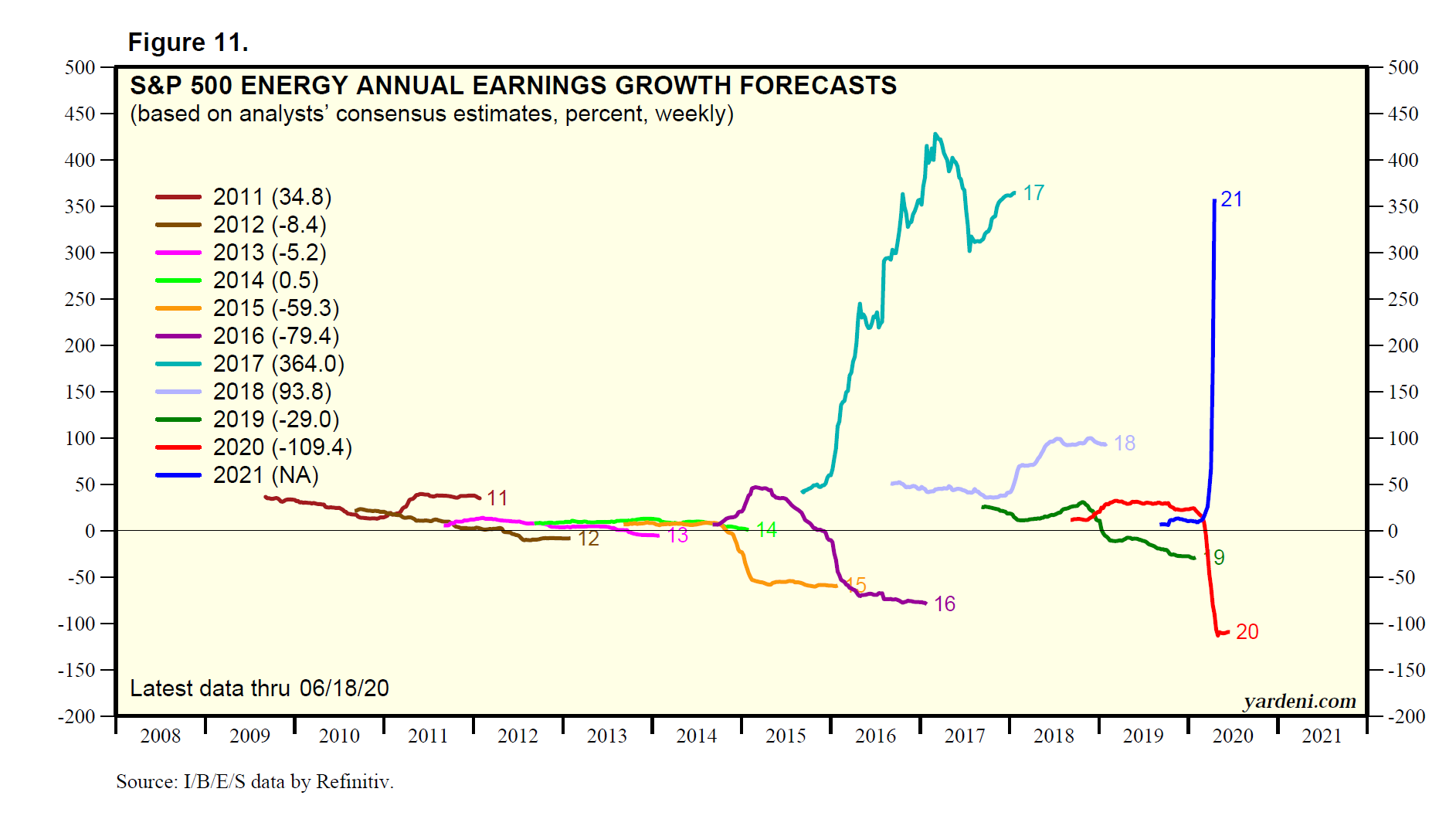(2) Potential for improvement. It’s notable that some of the sectors with the lowest P/Es are expected to have some of the fastest earnings growth this year. If analysts are correct, those sectors could fare well. For example, the S&P 500 Industrials sector has a 16.8 forward P/E but analysts are forecasting 13.9% earnings growth, making it the second-fastest growing sector in the S&P 500 (Fig. 2 and Fig. 3). Likewise, the Energy sector, with a below-market forward P/E of 17.1, is expected to grow earnings by 22.9% in 2020, rebounding from a 27.7% decline in earnings last year (Fig. 4 and Fig. 5).