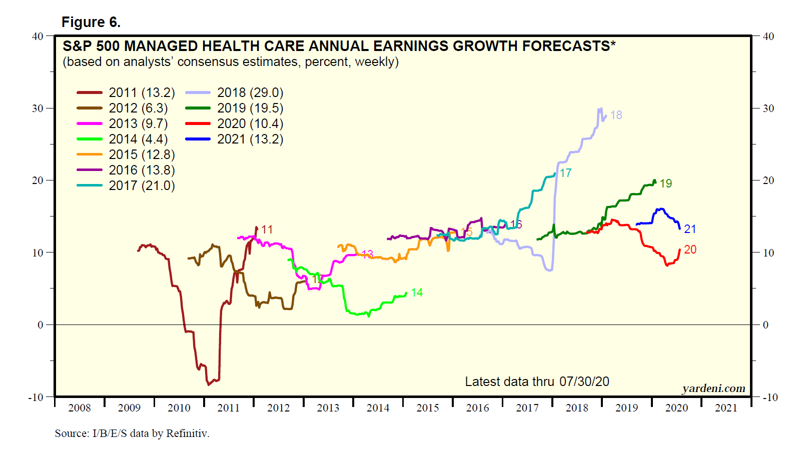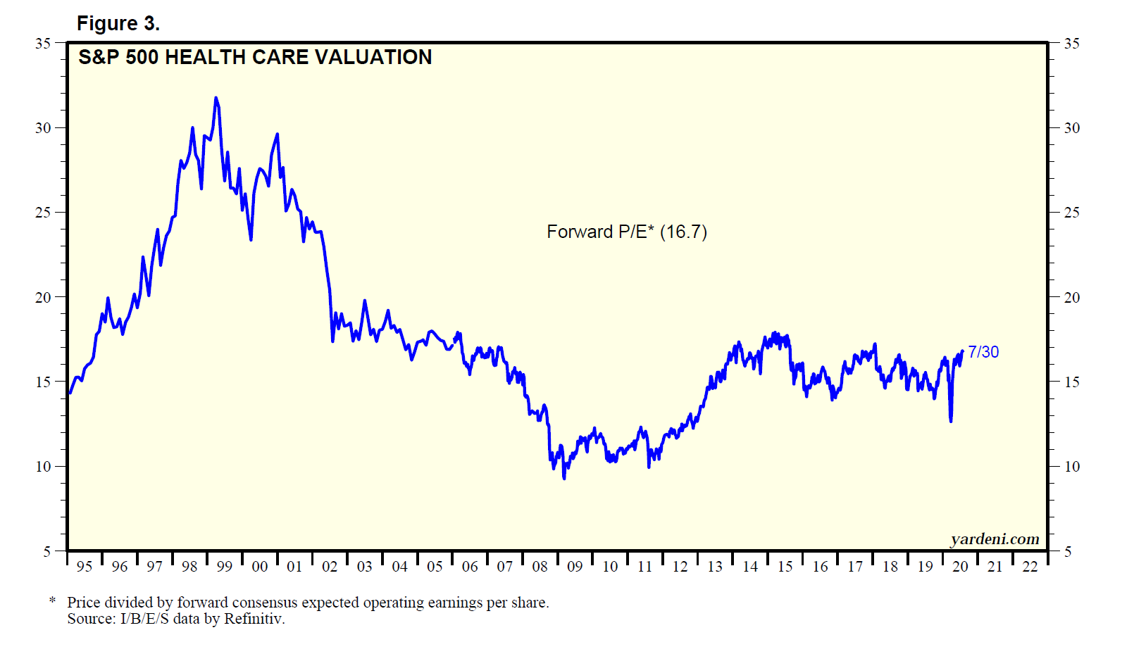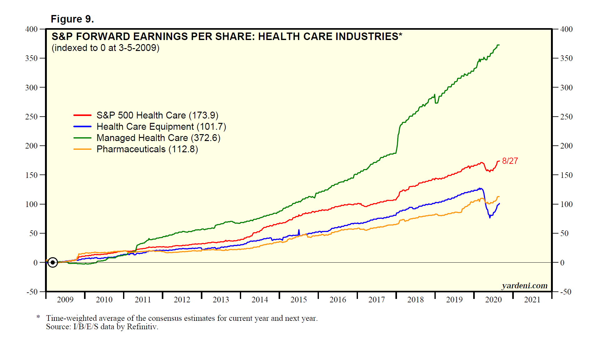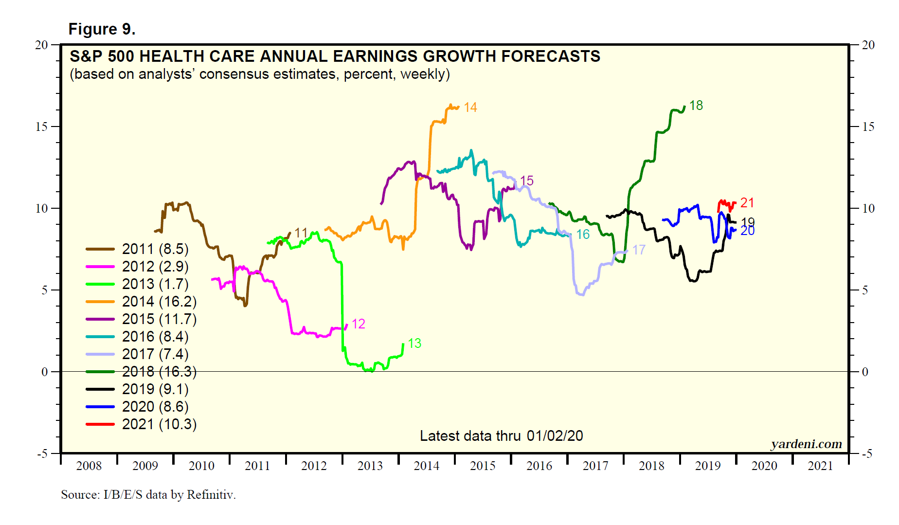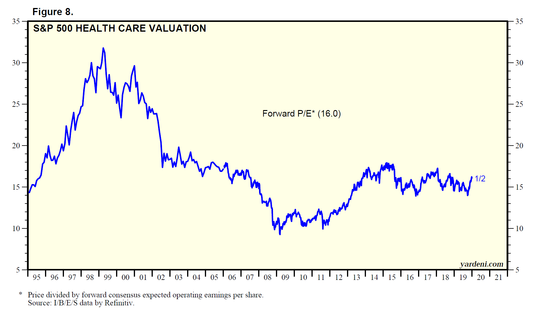 (3) Low for a reason. A number of sectors have low forward P/Es, but deservedly so, apparently, given their lower-than-average expected earnings growth this year. The Financial sector’s forward P/E of 13.3 would look like a bargain were it not for its projected 2020 earnings growth of only 5.4% (Fig. 6 and Fig. 7). Similarly, the Health Care sector’s 16.0 forward P/E is still almost twice its forecast earnings growth of 8.6% in 2020 (Fig. 8 and Fig. 9).