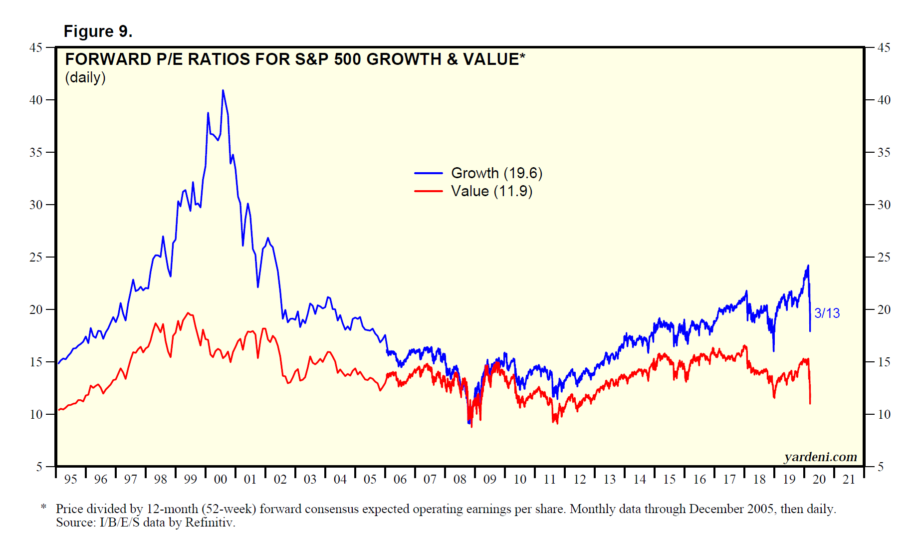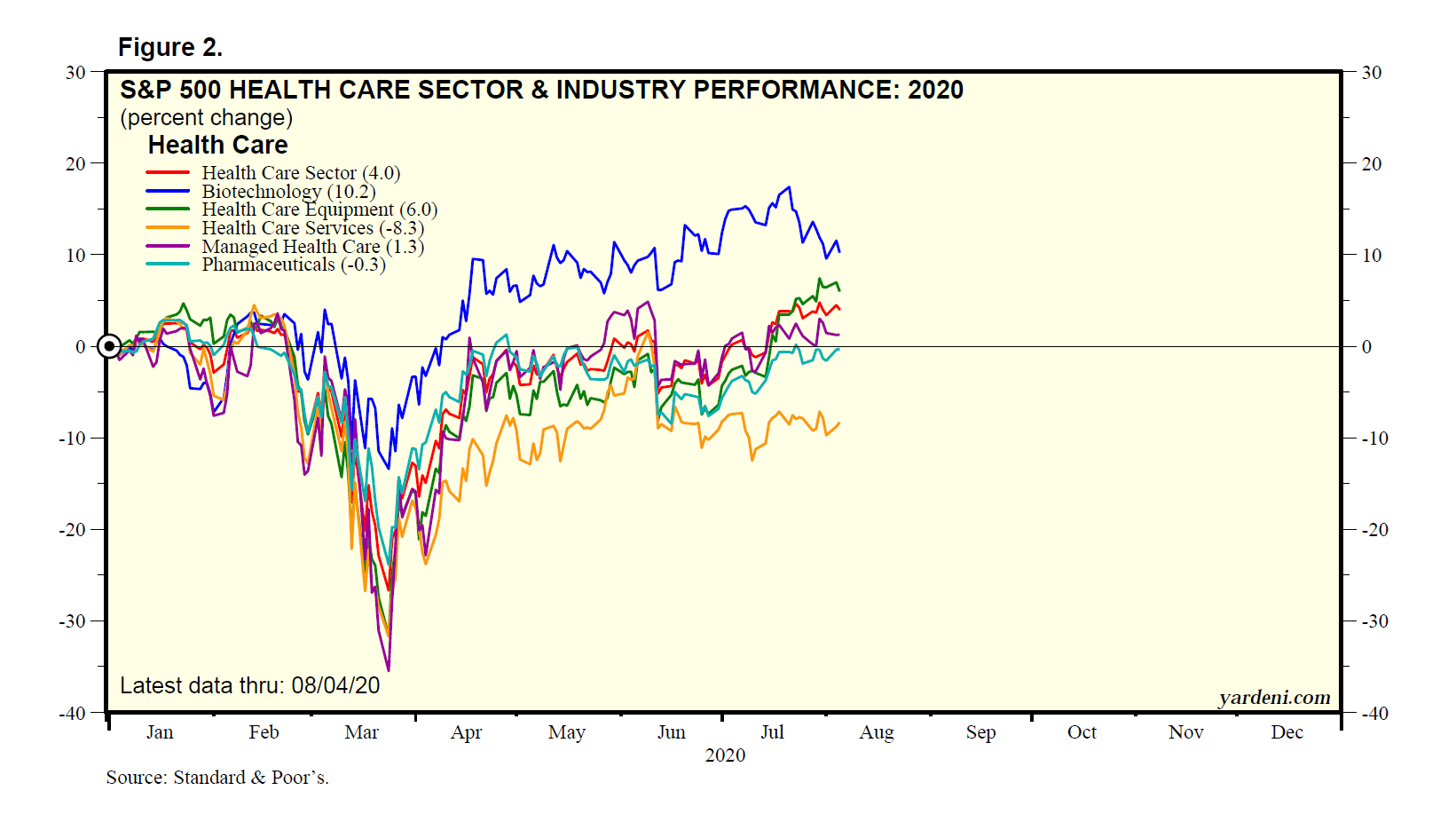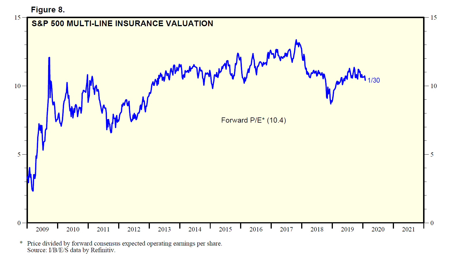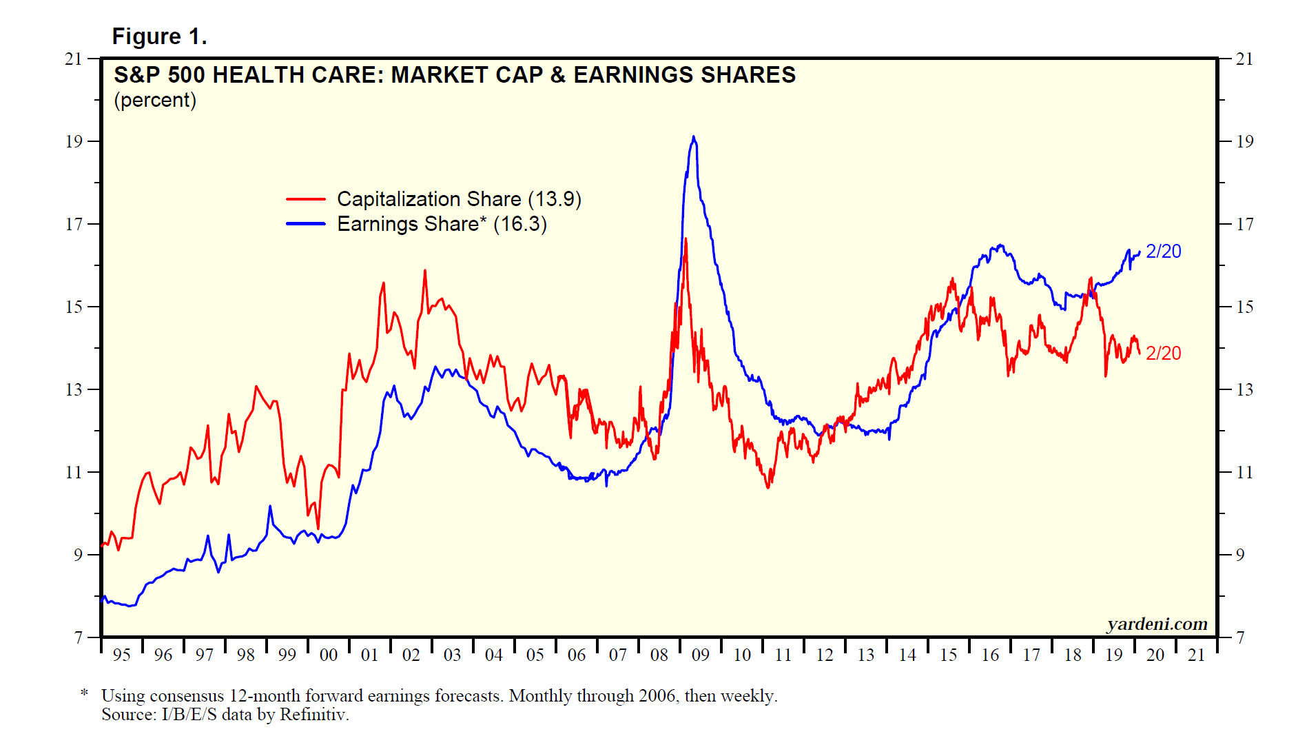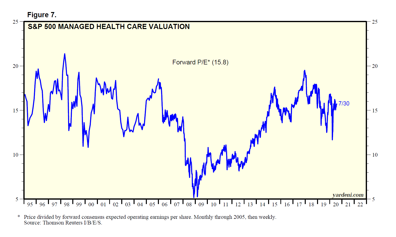 (3) Low for a reason. A number of sectors have low forward P/Es, but deservedly so, apparently, given their lower-than-average expected earnings growth this year. The Financial sector’s forward P/E of 13.3 would look like a bargain were it not for its projected 2020 earnings growth of only 5.4% (Fig. 6 and Fig. 7). Similarly, the Health Care sector’s 16.0 forward P/E is still almost twice its forecast earnings growth of 8.6% in 2020 (Fig. 8 and Fig. 9).
