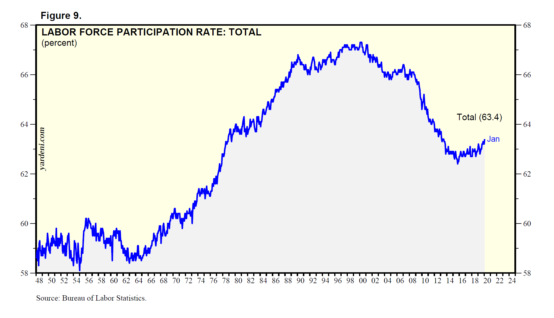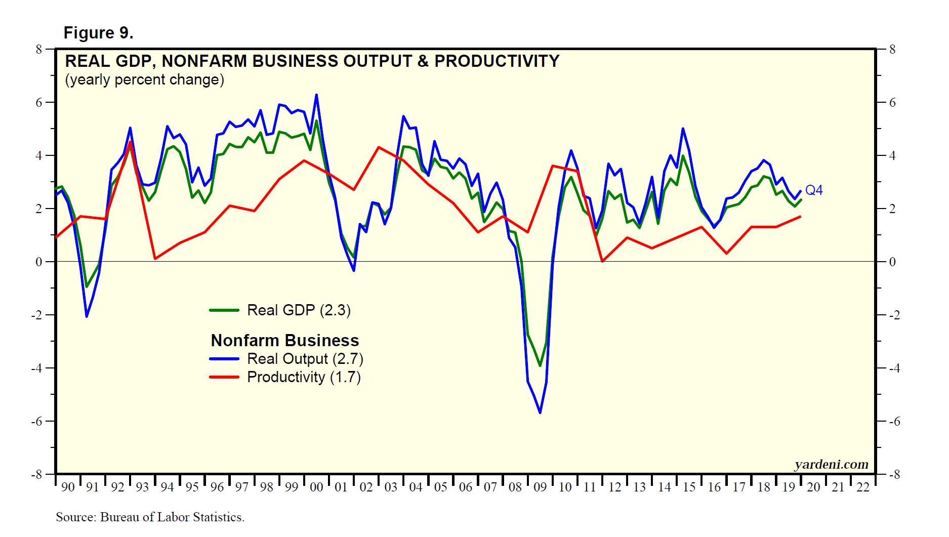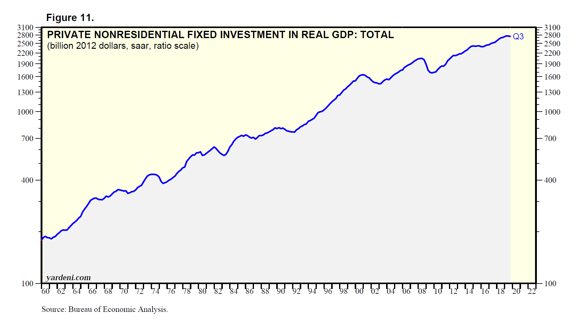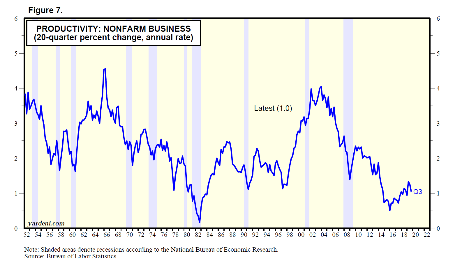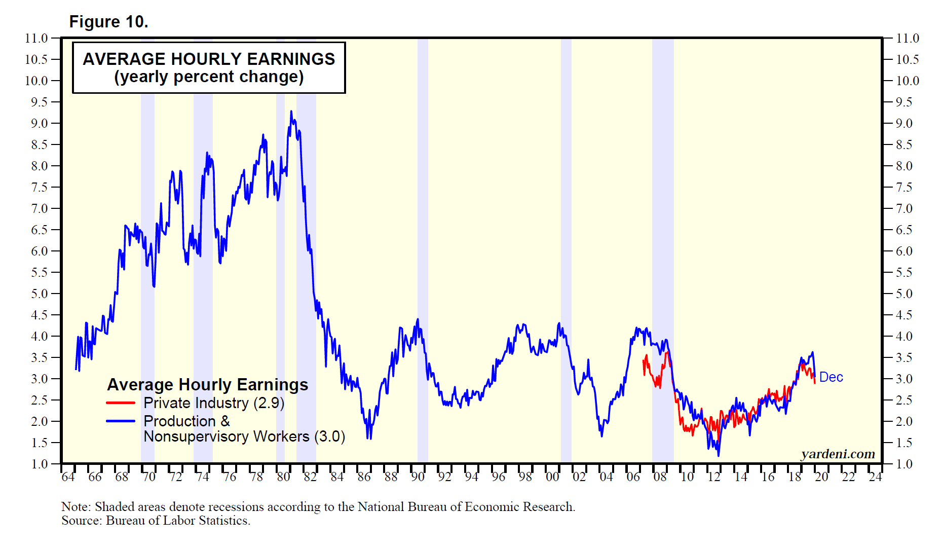 (1) Another 2%+ quarter for real GDP. (2) Good news and not-so-good news in trade. (3) Purchasing managers are upbeat in services, still depressed in manufacturing. (4) No growth in factory orders. (5) Truck and rail traffic are on the weak side. (6) Auto sales are cruising at the same speed. (7) Employment indicators still showing a strong labor market. (8) Big issue in 2020: Will rising wage inflation boost price inflation? (9) More wage inflation in services than in goods industries. (10) Competitive pressures should keep a lid on price inflation and stimulate productivity.