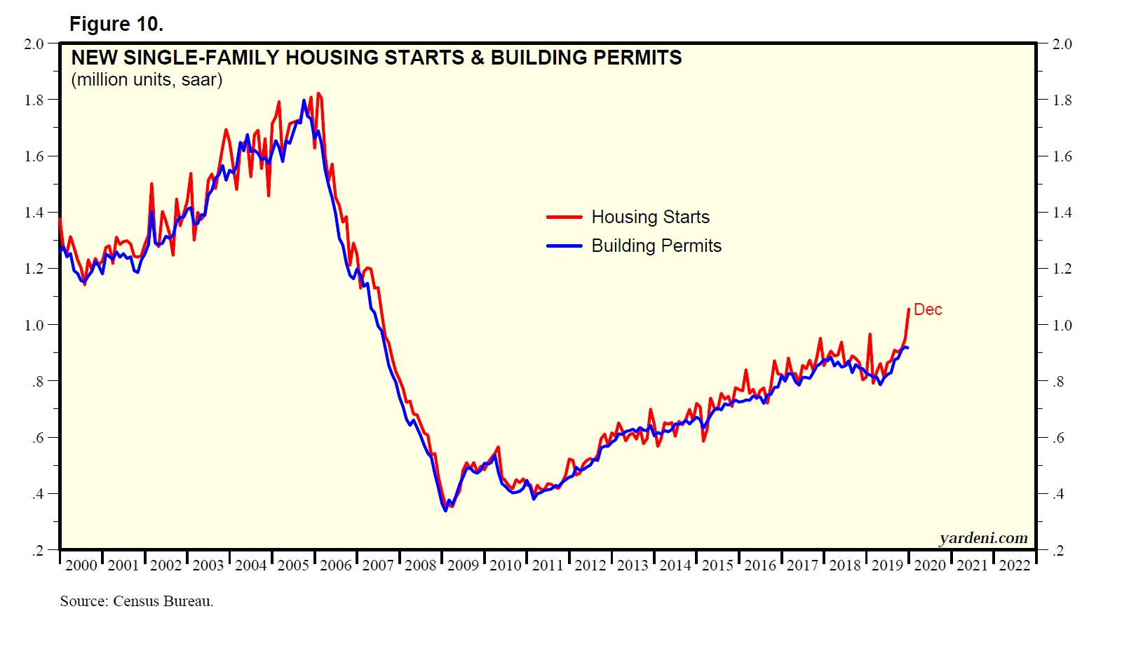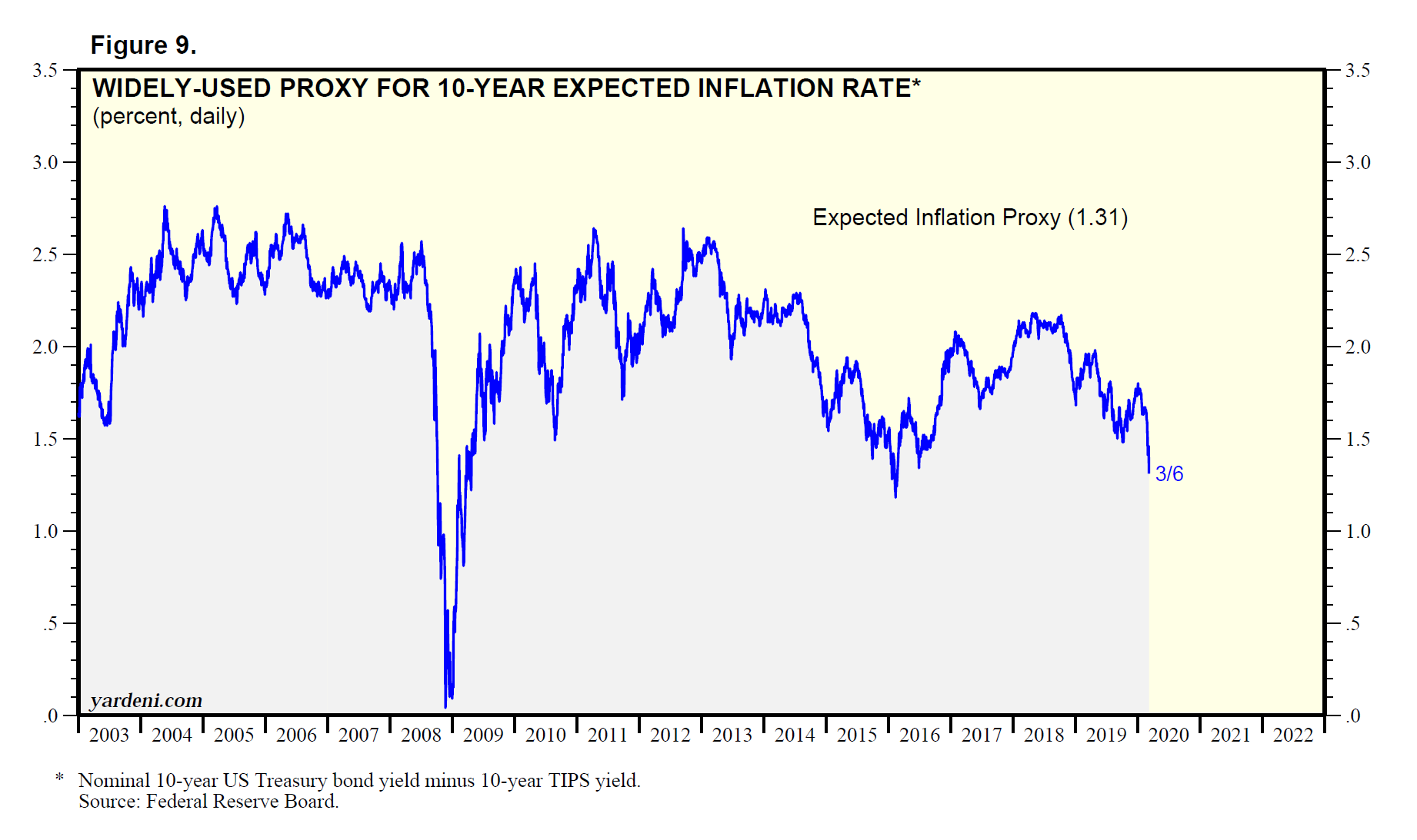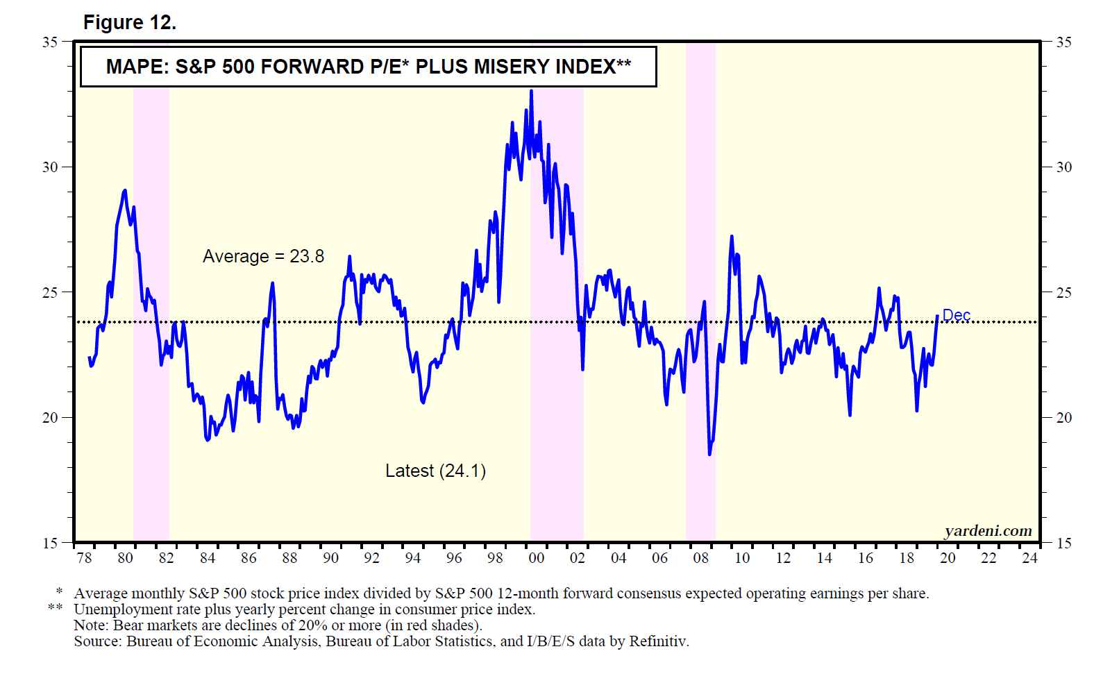 Last year, we projected that the S&P 500 forward P/E would be back a bit over 18.0 by the end of 2020. So that forecast is ahead of schedule too. We don’t have a problem with that given our outlook that both inflation and interest rates will remain low this year. Previously, we noted that the Misery Index, which is the sum of the unemployment rate and the inflation rate, is at historical lows, justifying historically high valuations (Fig. 8).