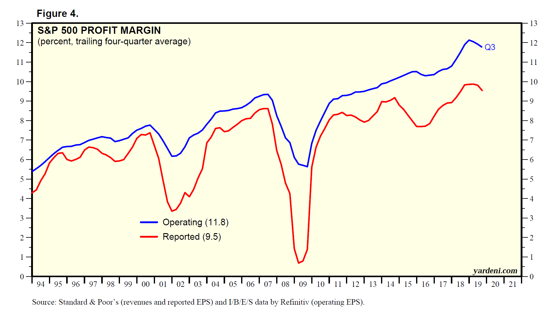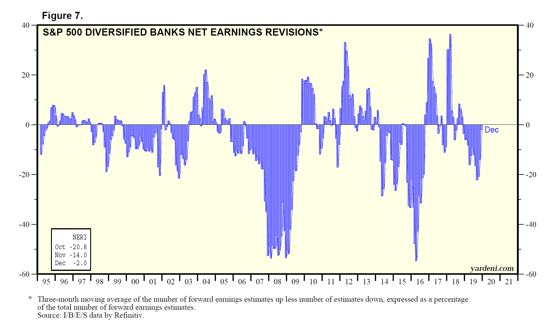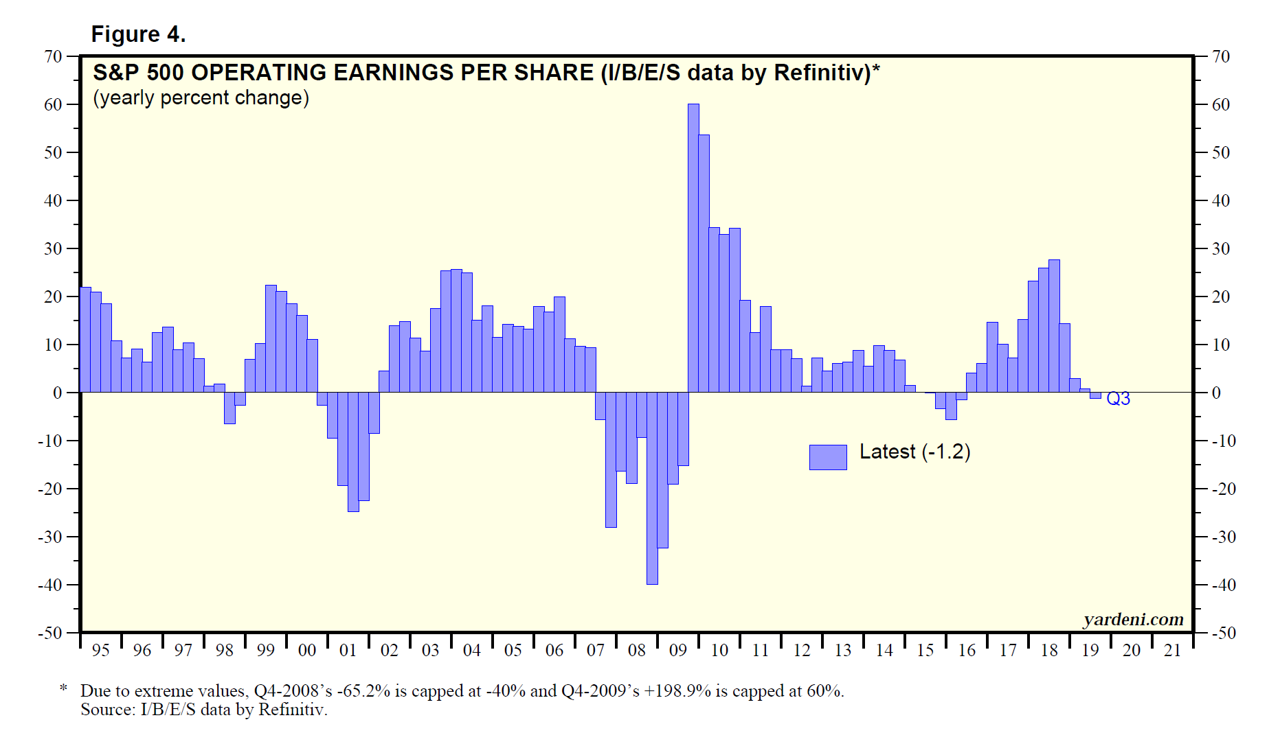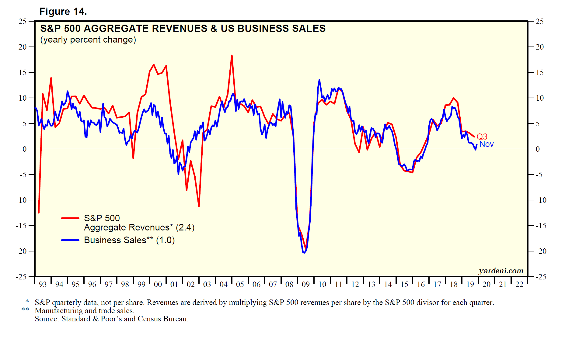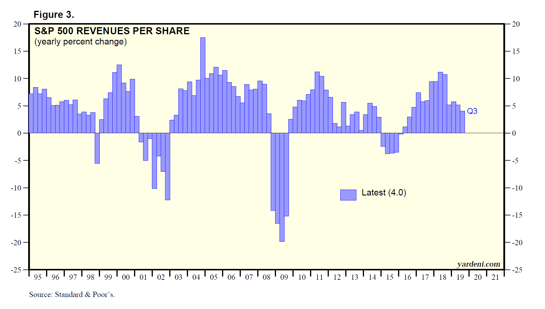 Revenues and earnings remain on uptrends, but their growth rates have slowed recently (Fig. 10). On a y/y basis, through Q3-2019, aggregate revenues was up only 2.4%, while aggregate earnings was down 2.8% (Fig. 11).