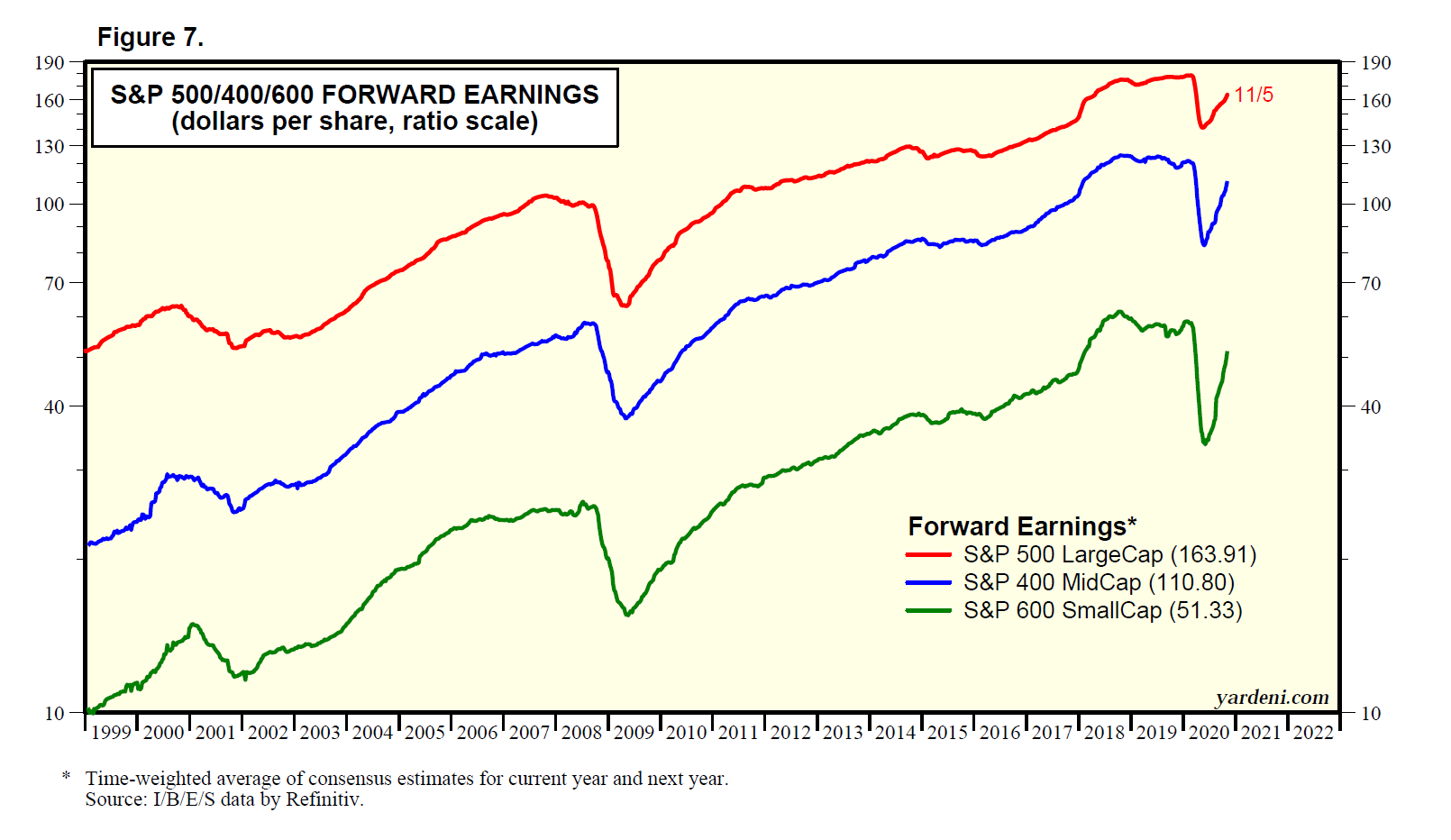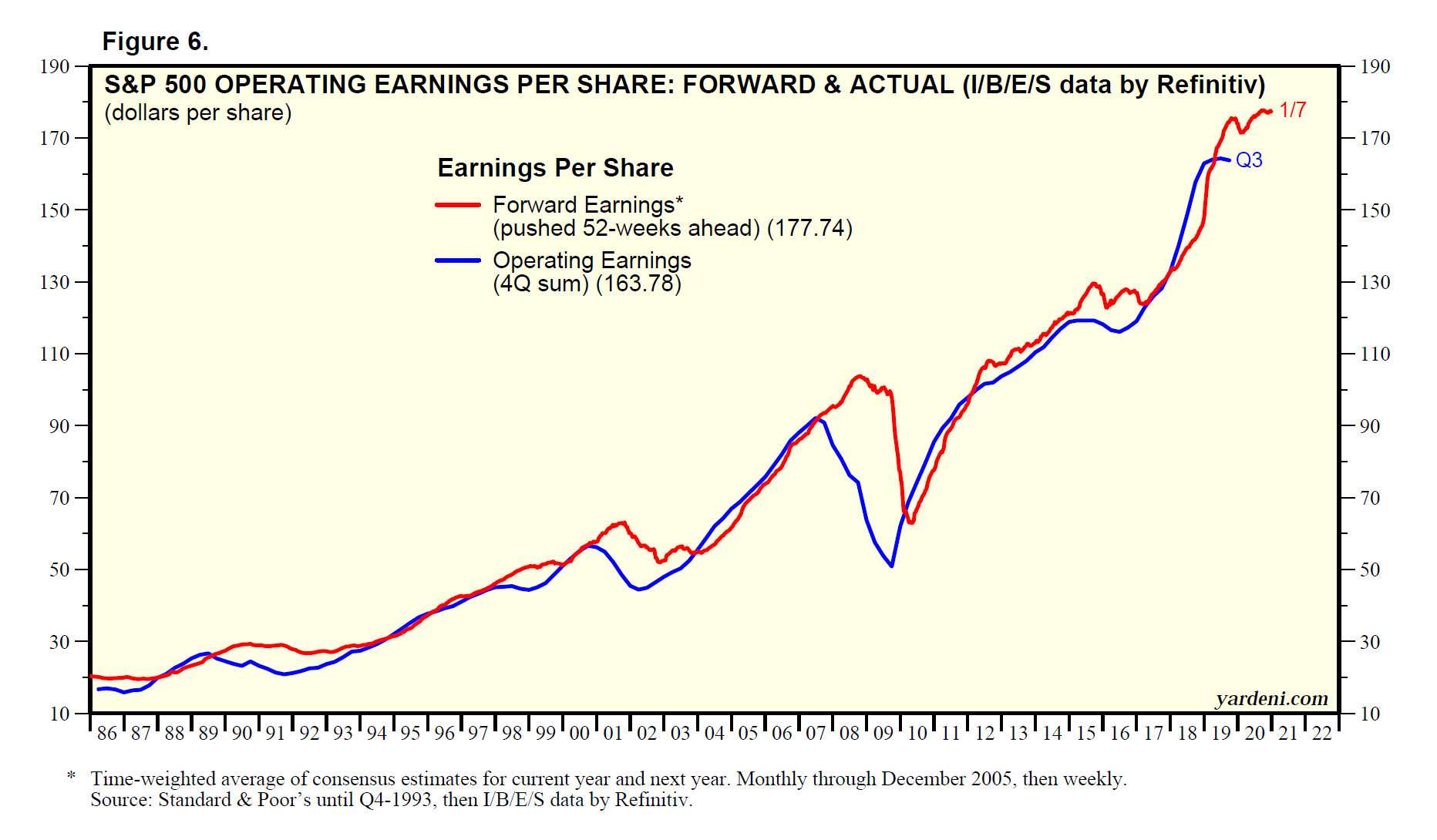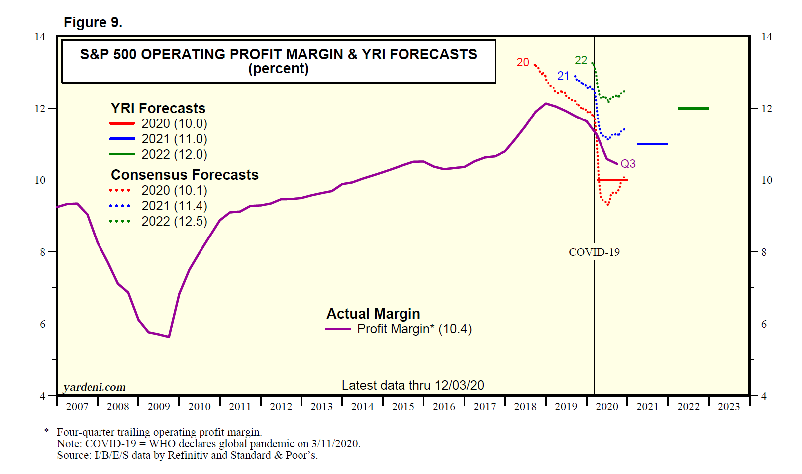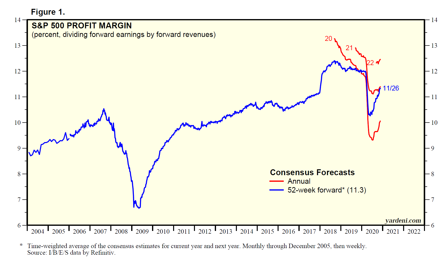 Here’s the bad news: If the Democrats win both Senate seats in Georgia on January 5, giving them majority control of the Senate, they are likely to raise the corporate tax rate from 21% to 28%. In that case, we would have to lower our profit margin estimate for 2022, since any tax hike passed next year probably wouldn’t be retroactive to the start of 2021.