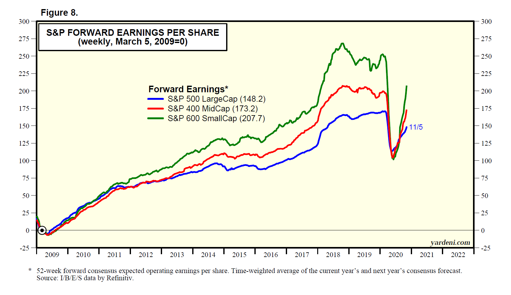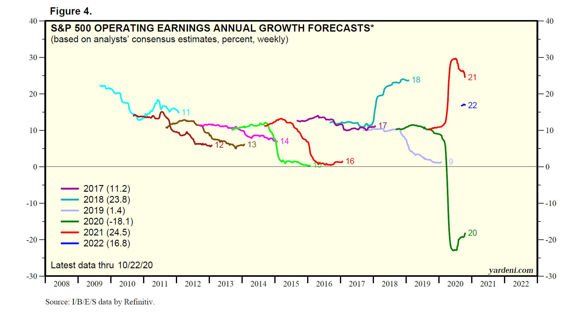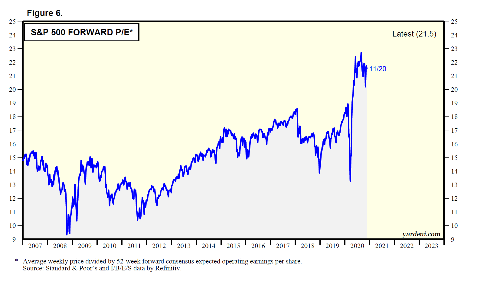 Here’s the bad news: If the Democrats win both Senate seats in Georgia on January 5, giving them majority control of the Senate, they are likely to raise the corporate tax rate from 21% to 28%. In that case, we would have to lower our profit margin estimate for 2022, since any tax hike passed next year probably wouldn’t be retroactive to the start of 2021.