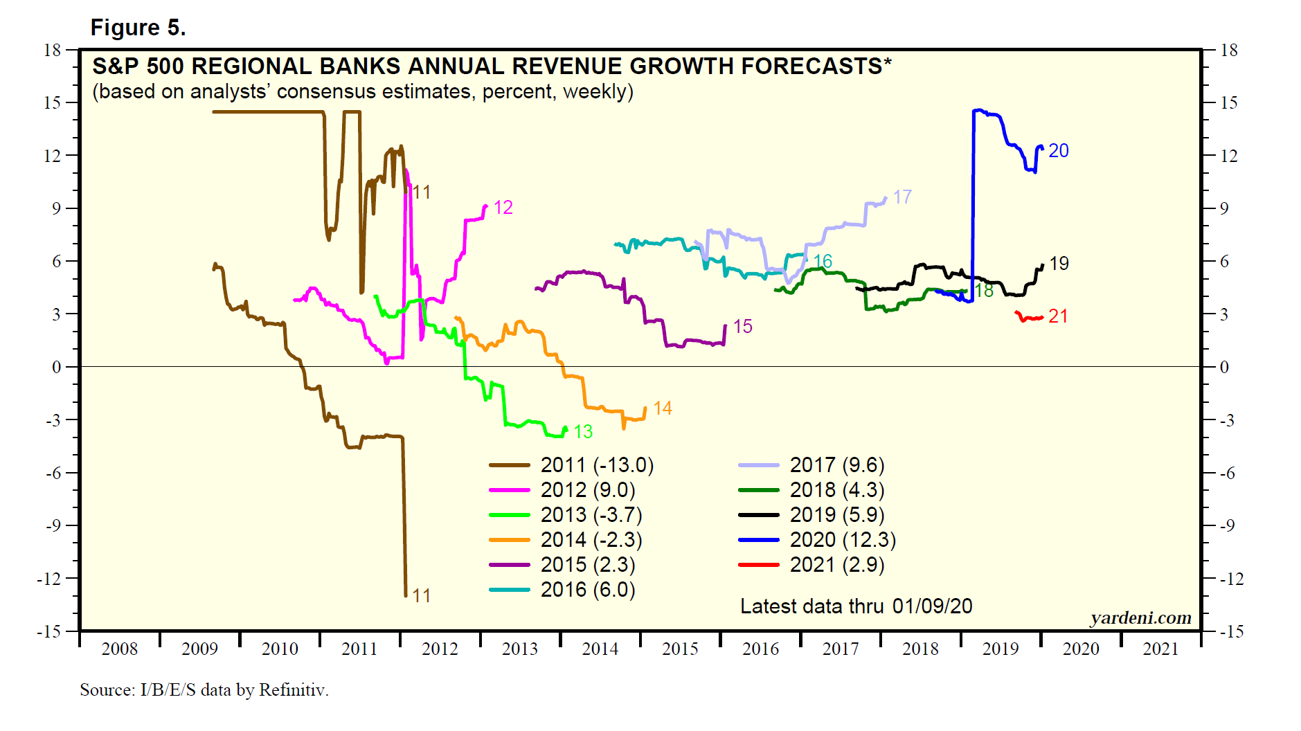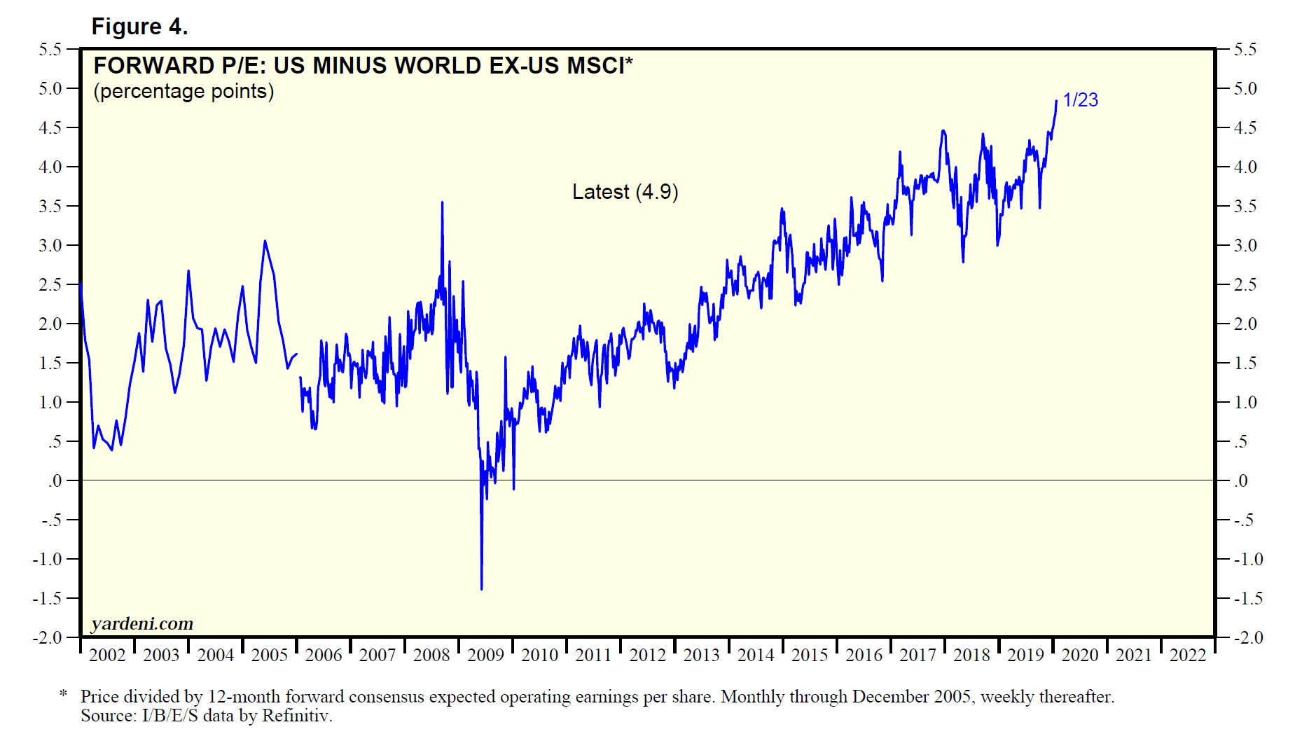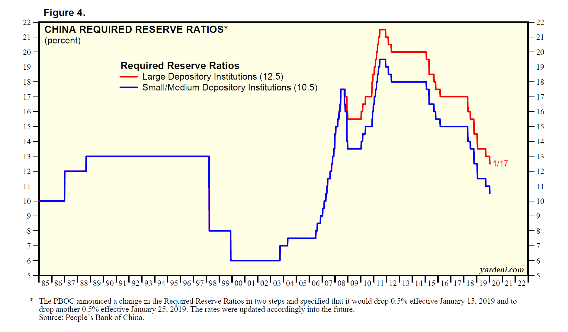 Another problem is that bull markets do best when climbing a wall of worry. Last year started with lots of worries that monetary policy was too tight and that Trump’s trade wars were escalating. What a difference a year makes. Nobody is worrying about those issues now that the Fed lowered the federal funds rate three times last year and now that Trump is about to sign a Phase 1 trade deal with China. Late last year, Fed Chairman Jerome Powell promised that there will be no hikes in the federal funds rate unless and until inflation makes a significant comeback. Trump has indicated that he is ready to negotiate a Phase 2 deal with the Chinese. Meanwhile, the People's Bank of China started the new year by lowering banks’ required reserve ratios to the lowest levels since 2007 (Fig. 4).