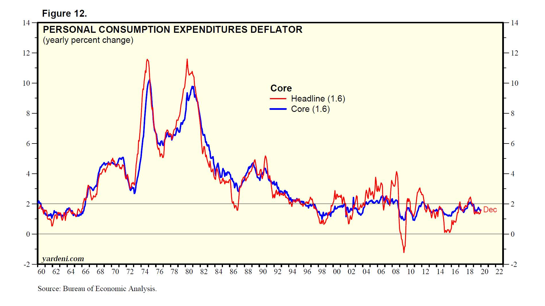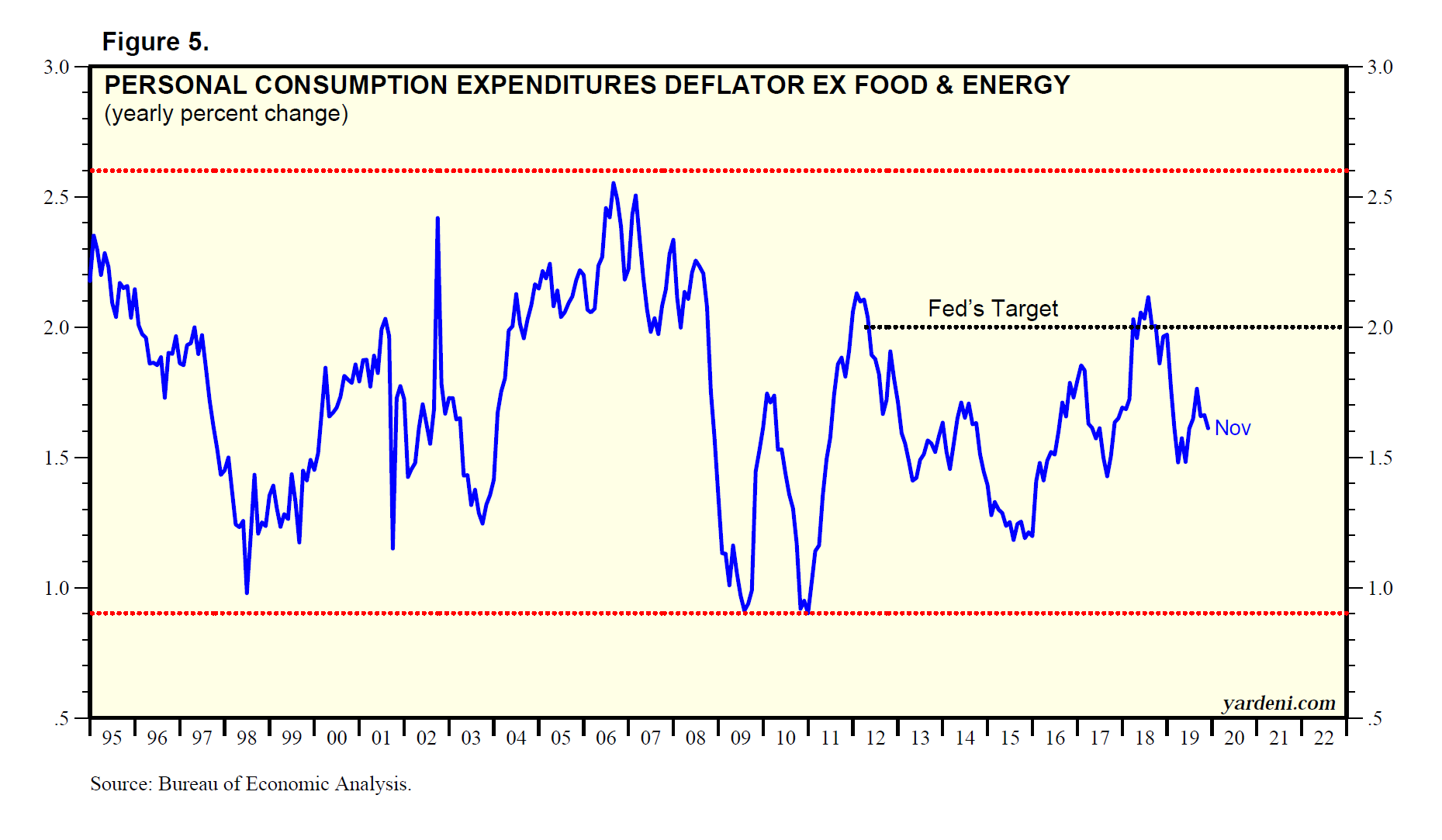 It will be interesting to see how the Fed reacts if wage inflation continues to move higher, as it is likely to do in Friday’s employment report for December. During his 10/30 press conference, Fed Chair Jerome Powell said, “So I think we would need to see a really significant move up in inflation that’s persistent before we would consider raising rates to address inflation concerns.” He was undoubtedly referring to the core PCED inflation rate, which remains subdued. Let’s look at the latest data: