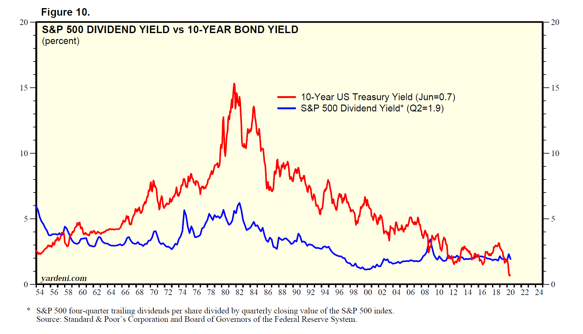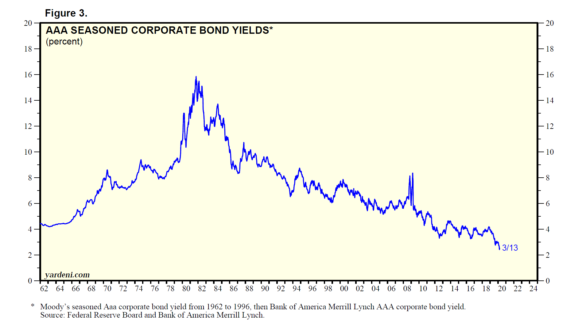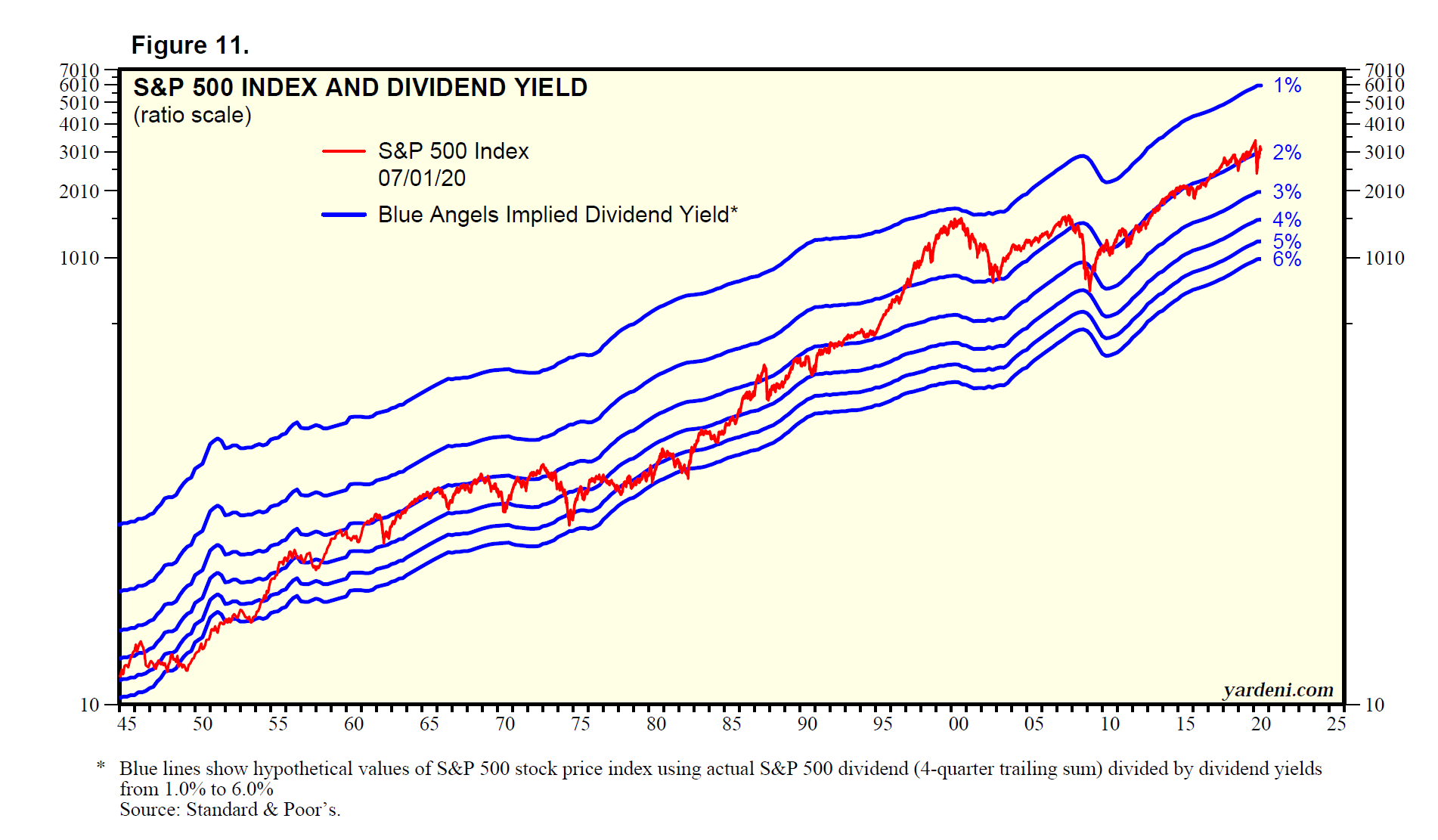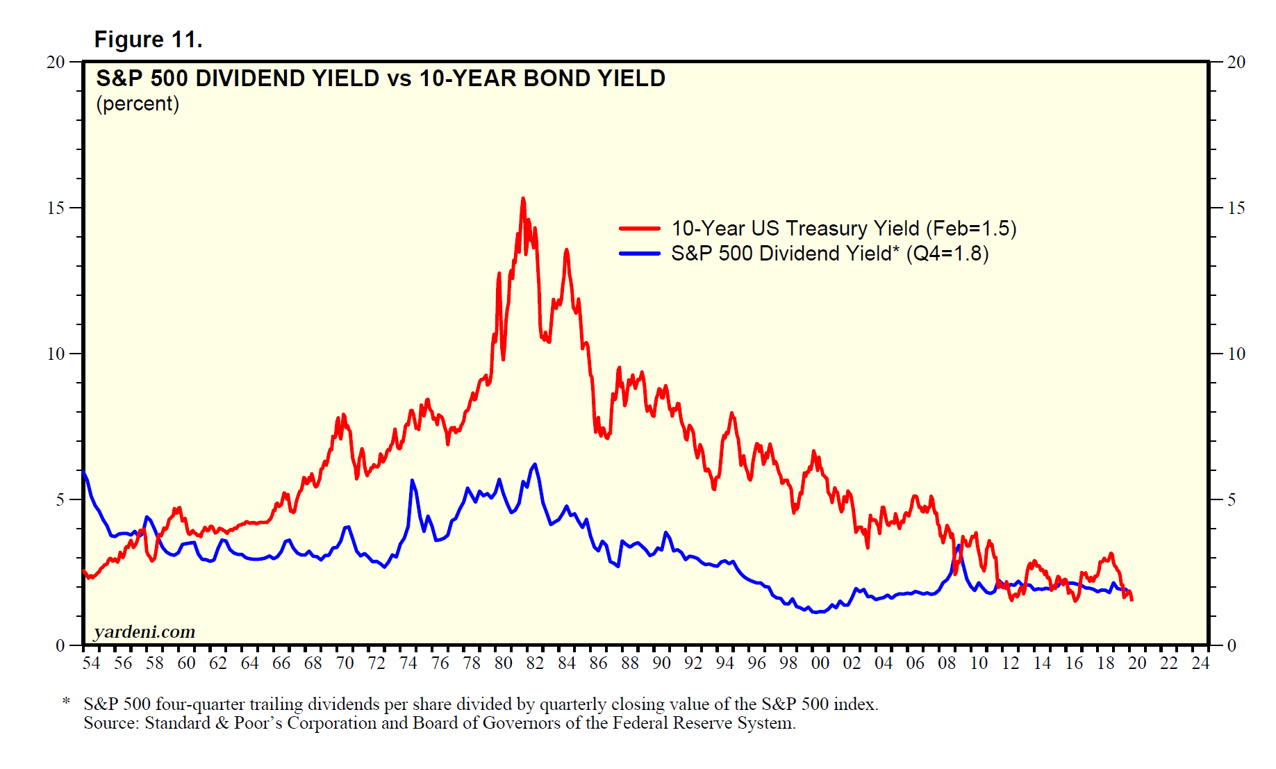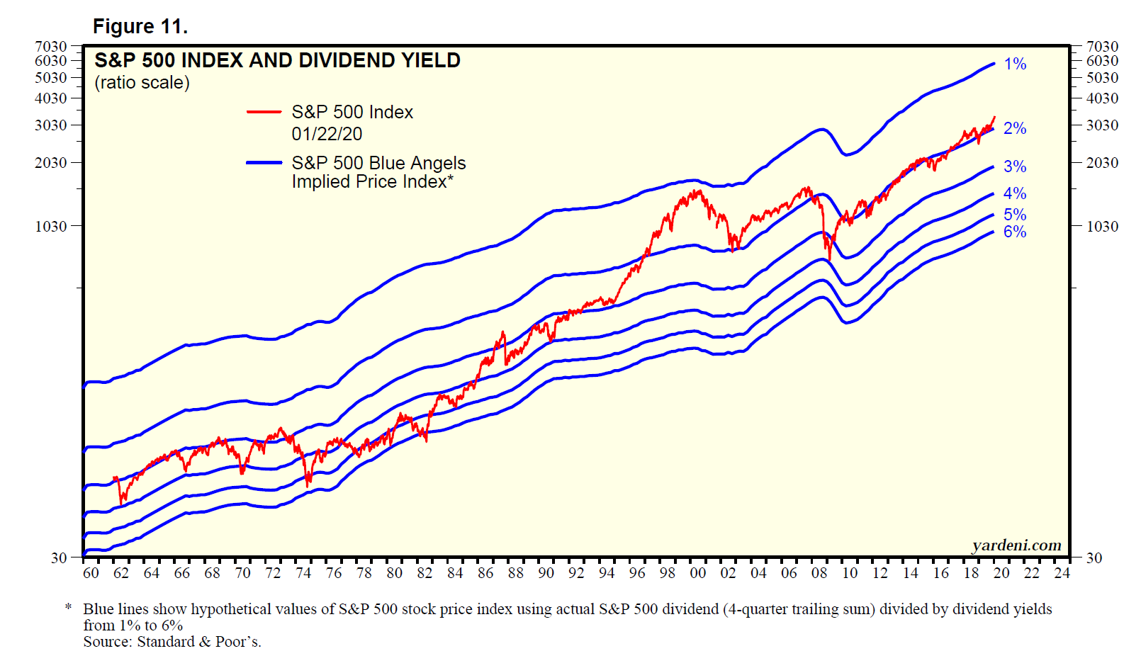 (2) Stocks are fairly valued relative to 2% dividend yield. During Q4-2019, the S&P 500 dividend yield was 1.8%. Our Blue Angels analysis for dividends creates hypothetical values for the S&P 500 stock price index using the actual S&P 500 dividend (on a four-quarter-trailing-sum basis) divided by dividend yields from 1.0% to 6.0% (Fig. 15). Interestingly, during the current bull market, the S&P 500 has been closely hugging its hypothetical value based on actual dividends and a 2.0% dividend yield! The index seems to be continuing that trend, though the recent rally has dropped the dividend yield somewhat.