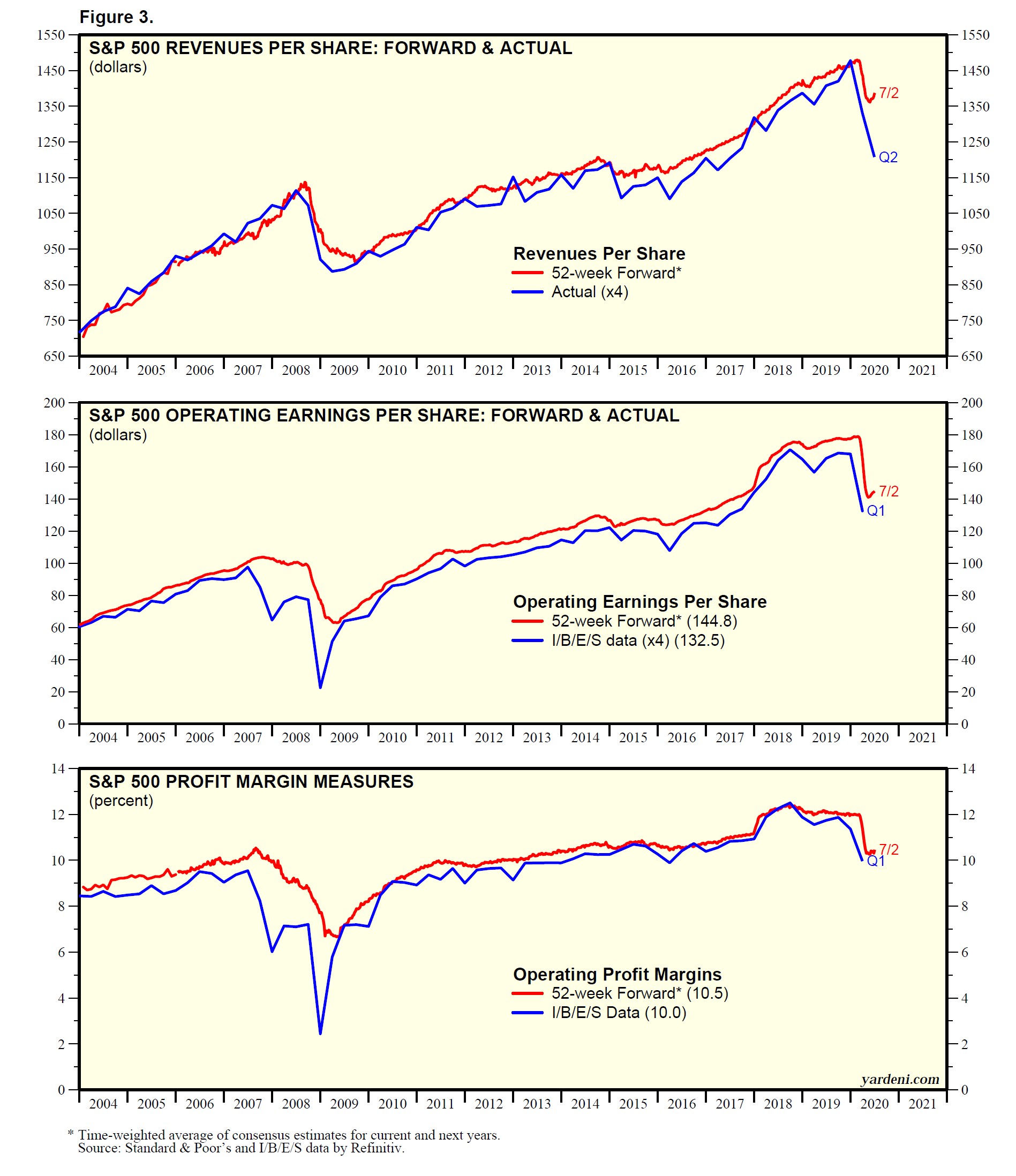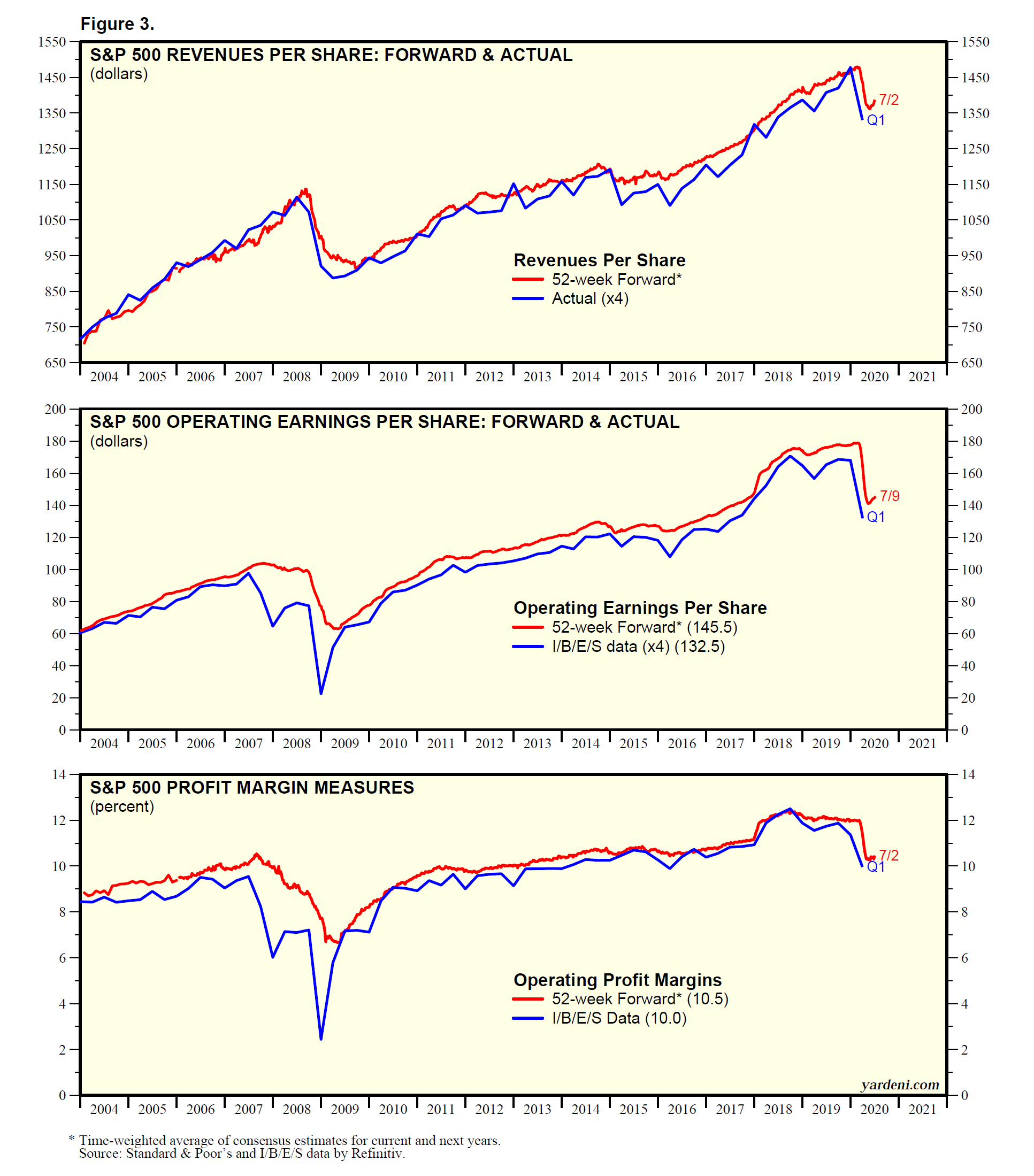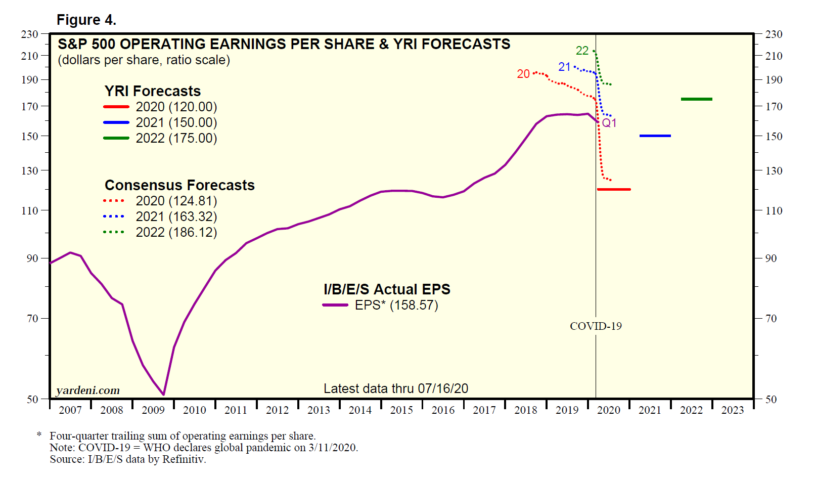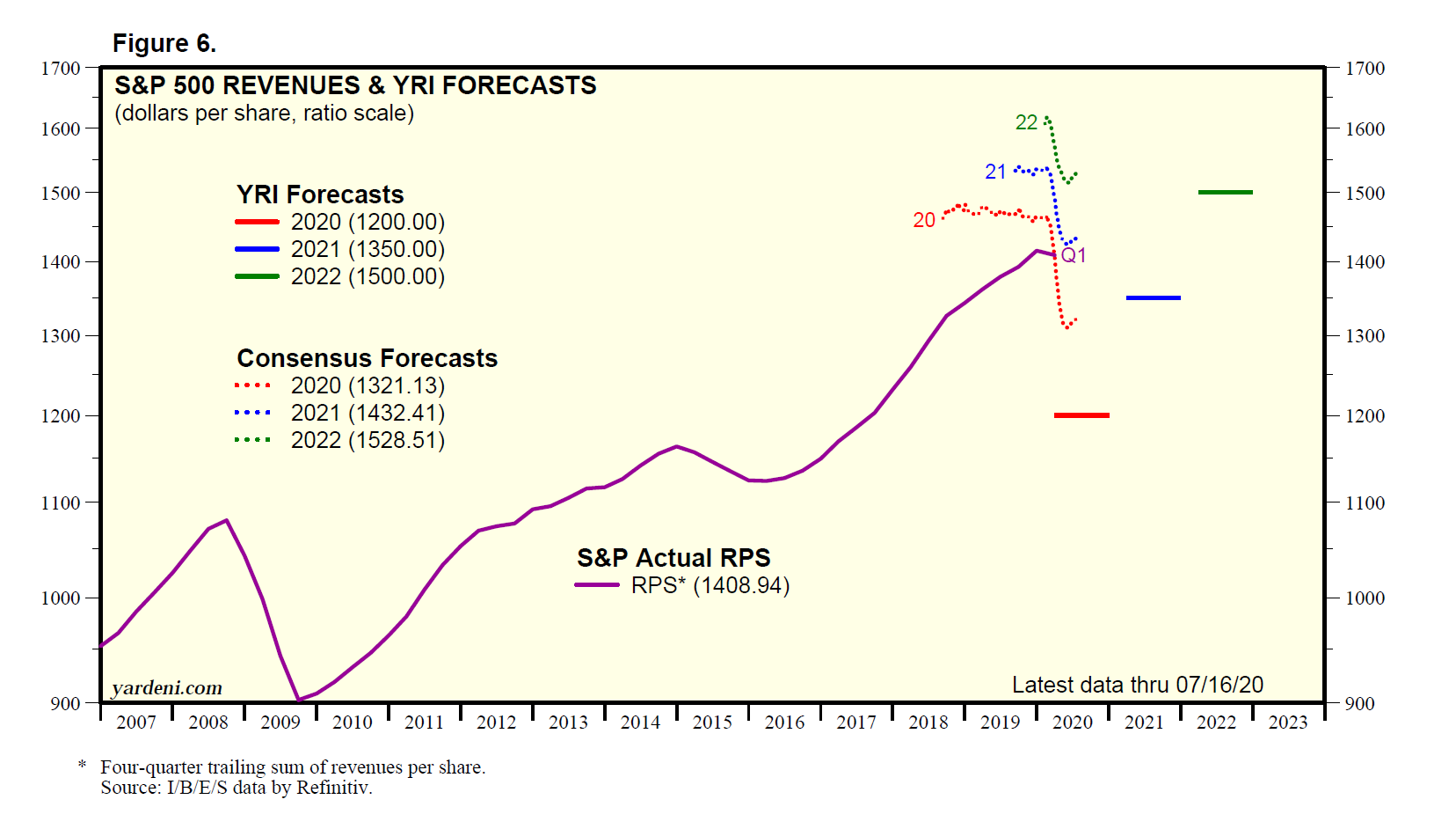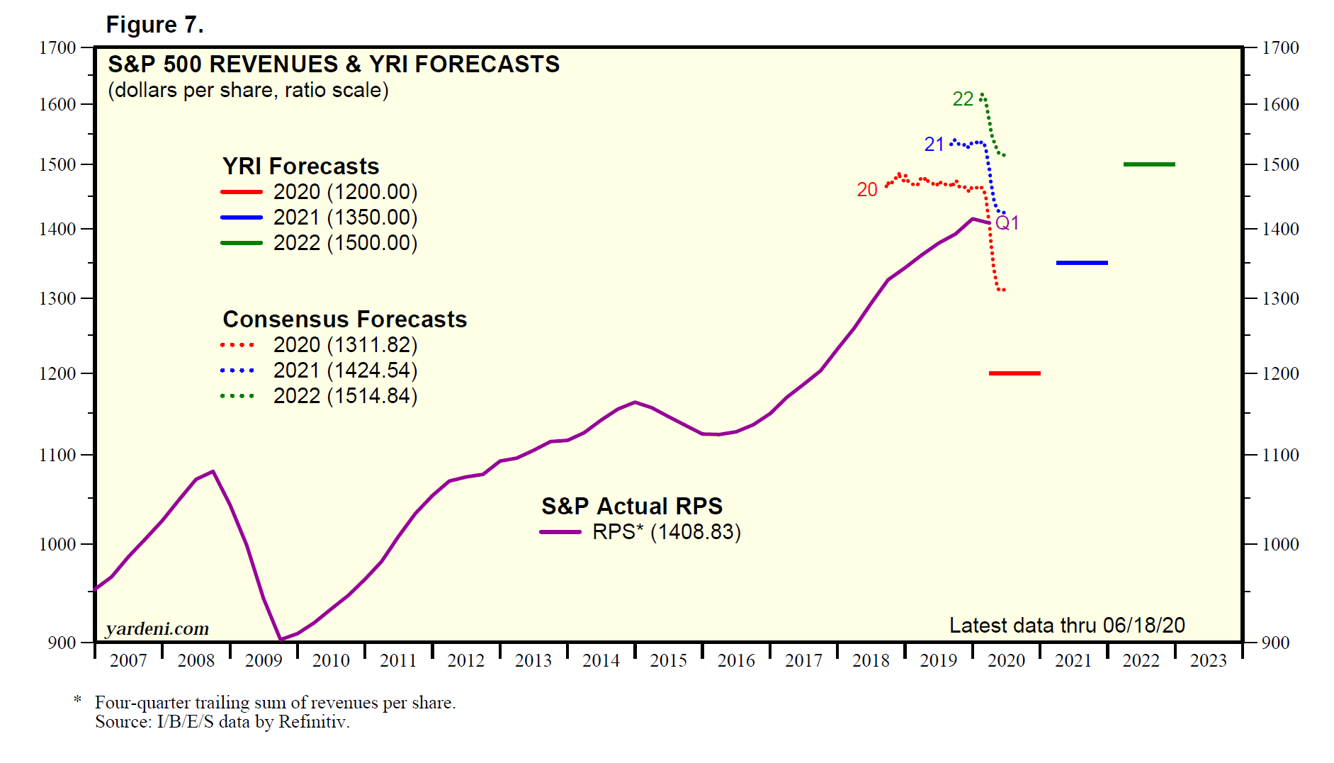 Corporate Finance I: Accounting for Fun & Profits. Yesterday, Joe and I raised our estimates for S&P 500 revenues and earnings per share and profit margins to the following: 2020 ($1,400, $140, 10%), 2021 ($1,545, $170, 11%), and 2022 ($1,625, $195, 12%). As a result, our S&P 500 year-end targets for this year and the next two years are now 3740, 4290, and 4620. (See YRI Earnings Forecasts.)