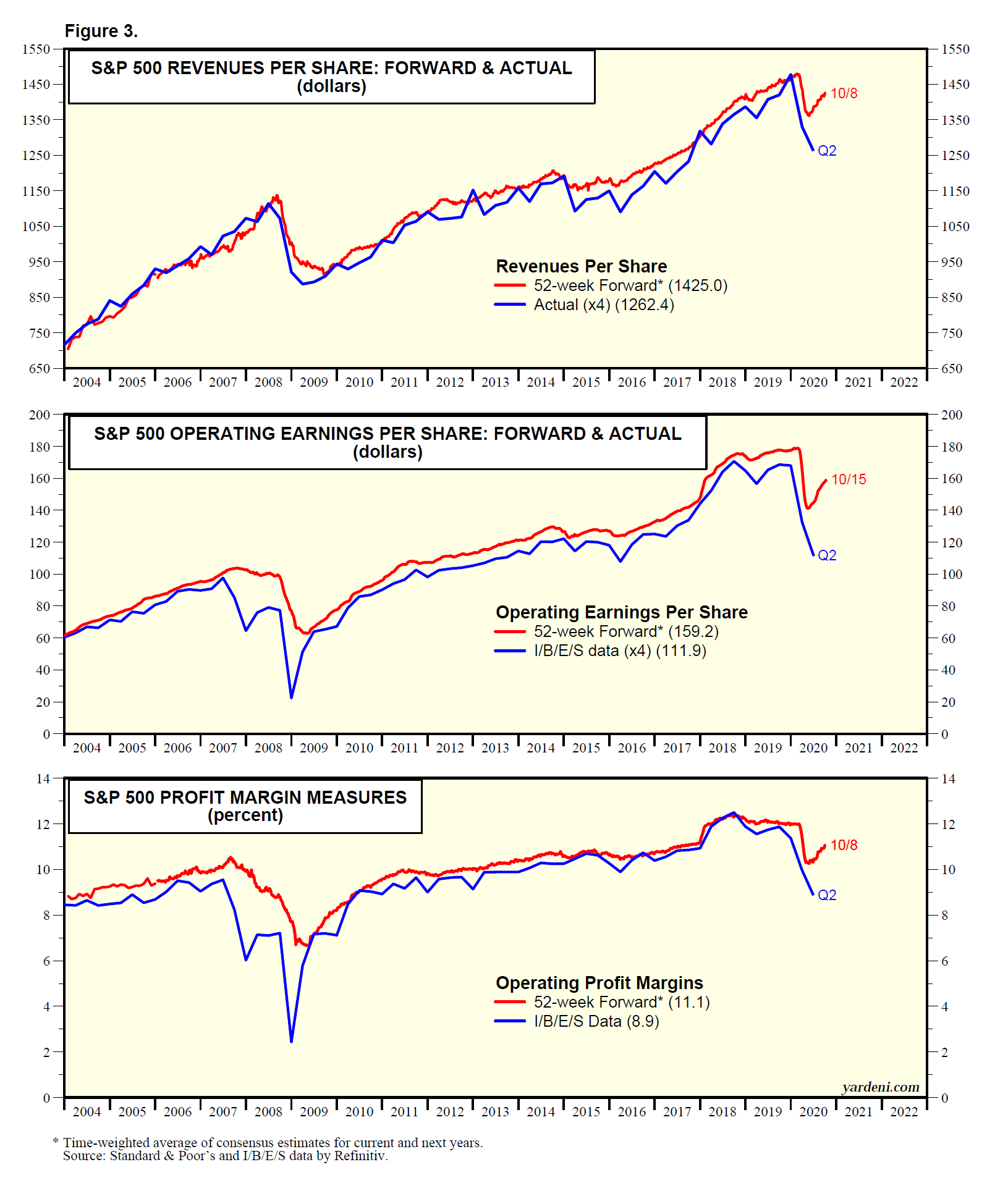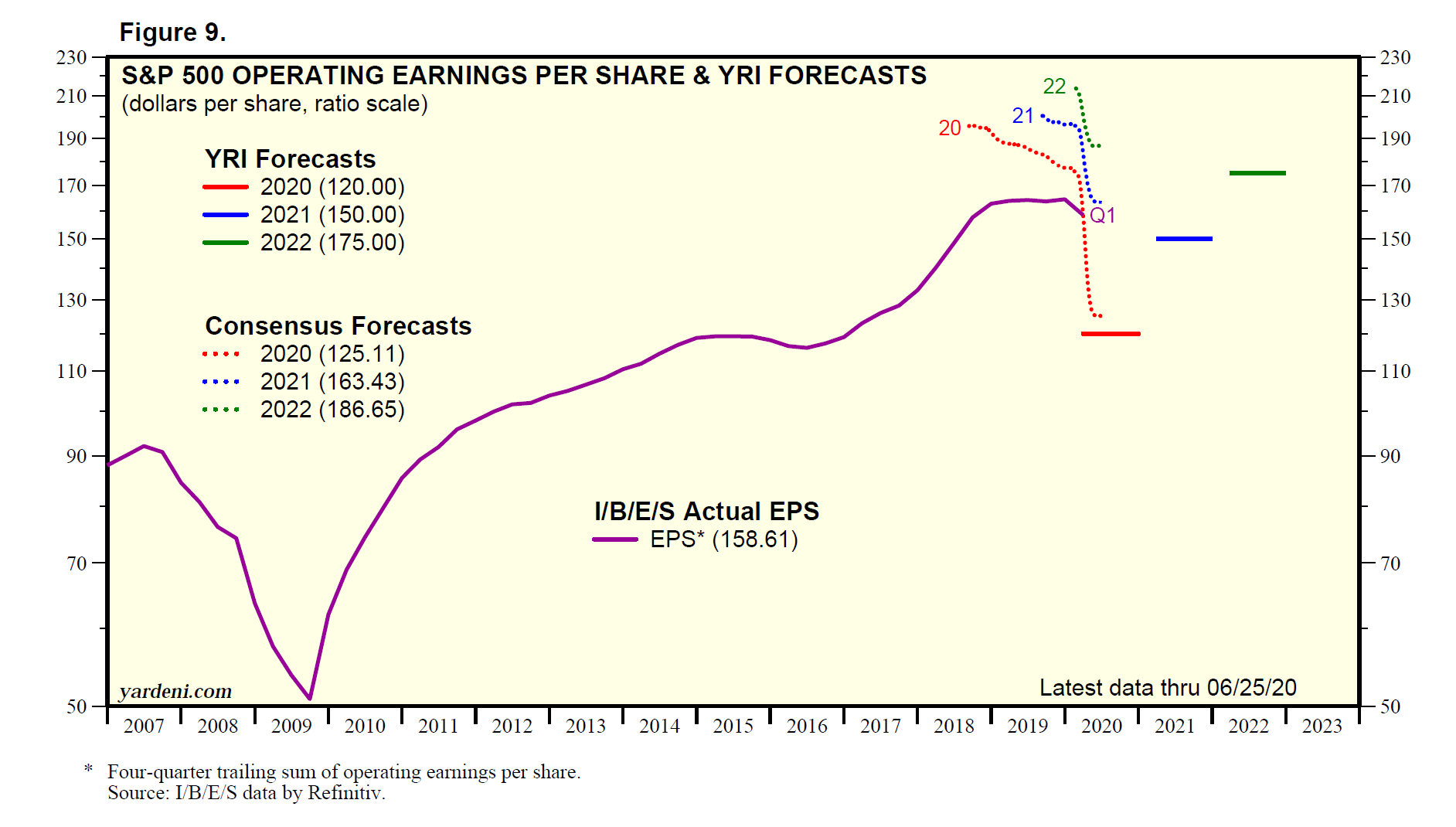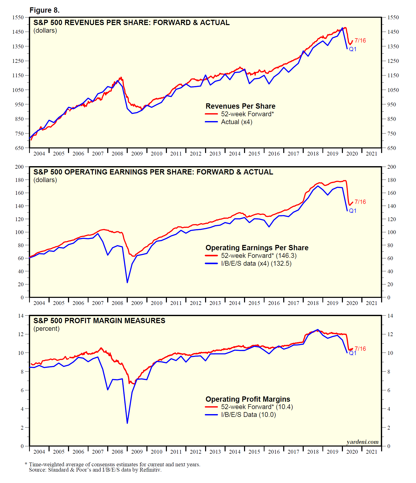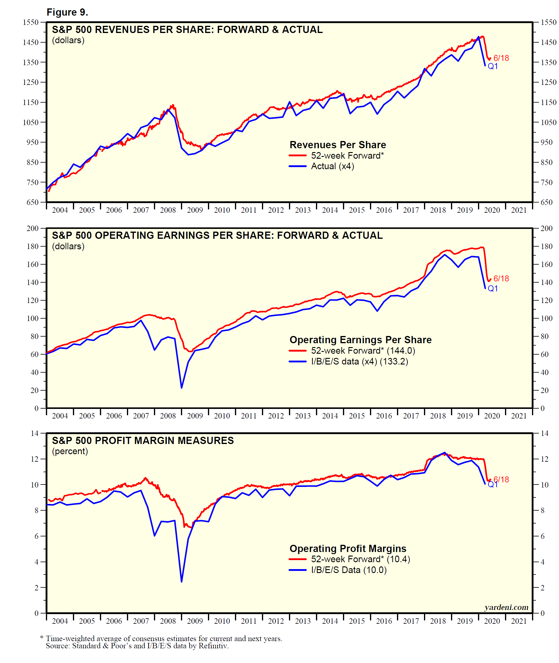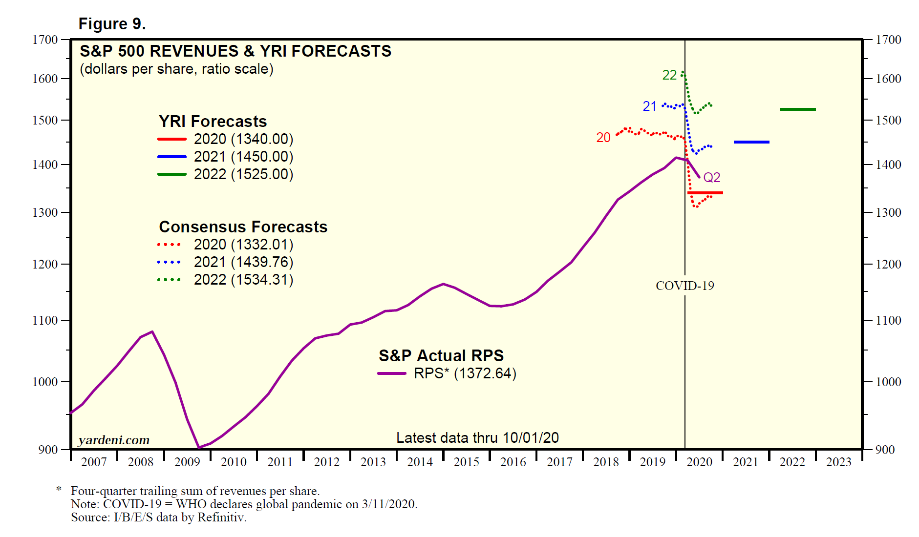 Corporate Finance I: Accounting for Fun & Profits. Yesterday, Joe and I raised our estimates for S&P 500 revenues and earnings per share and profit margins to the following: 2020 ($1,400, $140, 10%), 2021 ($1,545, $170, 11%), and 2022 ($1,625, $195, 12%). As a result, our S&P 500 year-end targets for this year and the next two years are now 3740, 4290, and 4620. (See YRI Earnings Forecasts.)