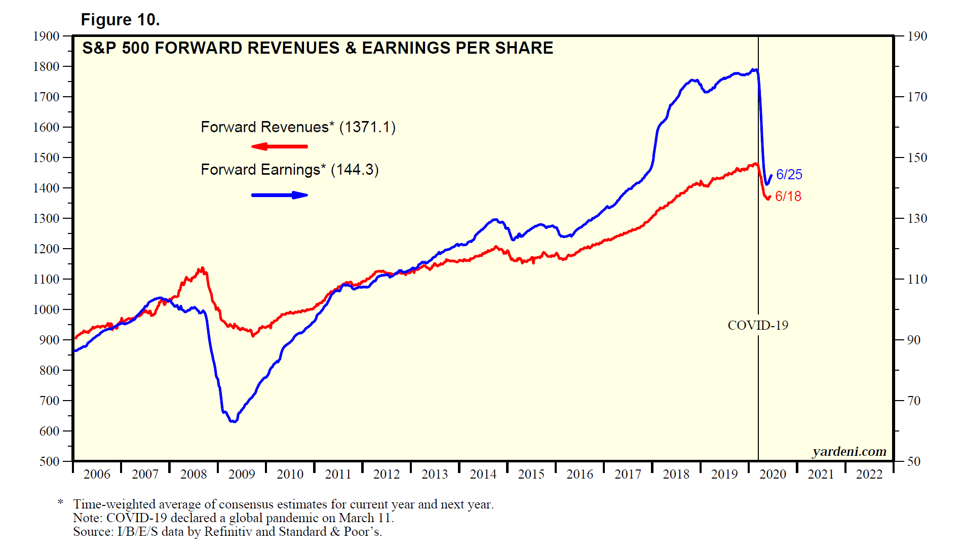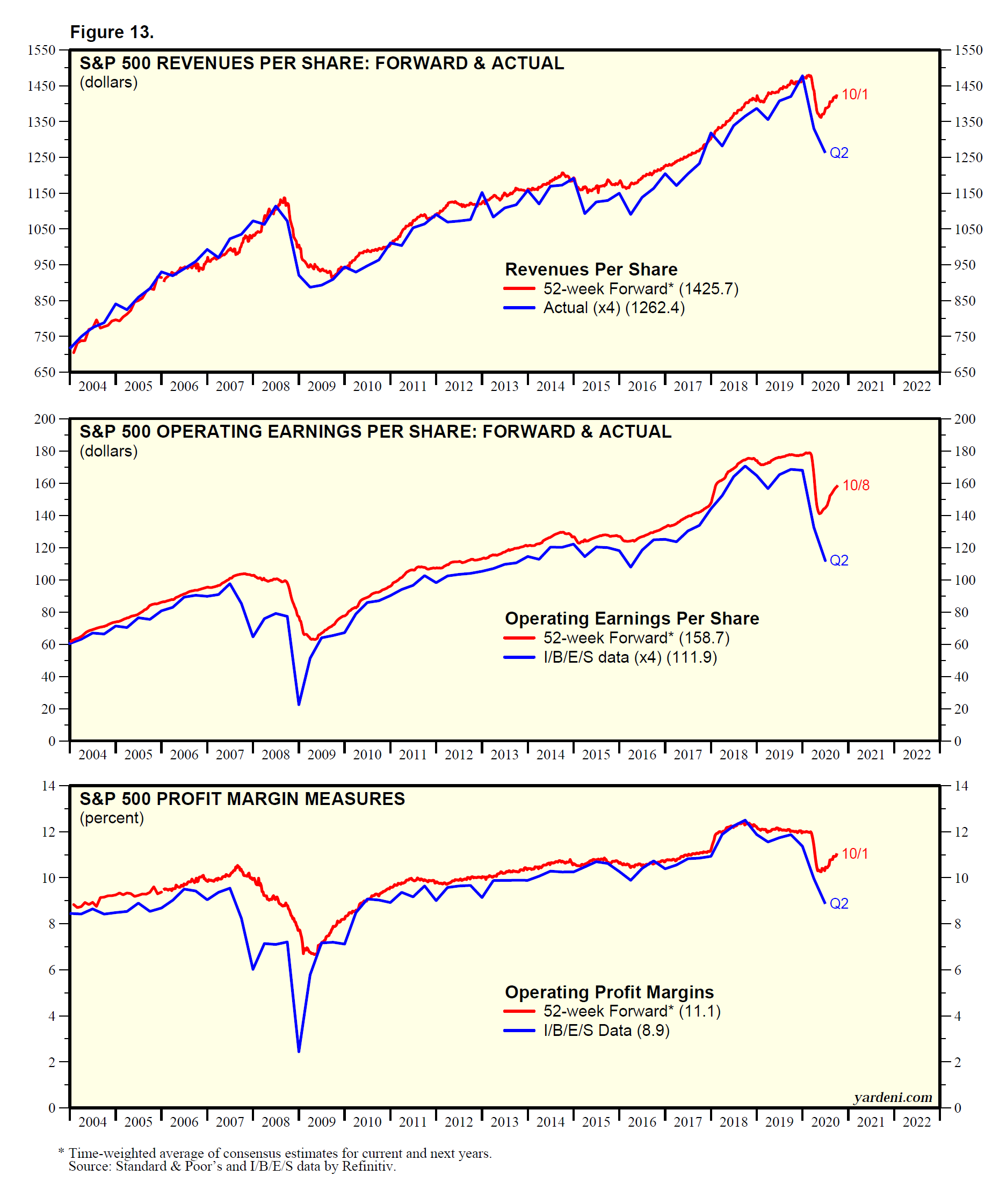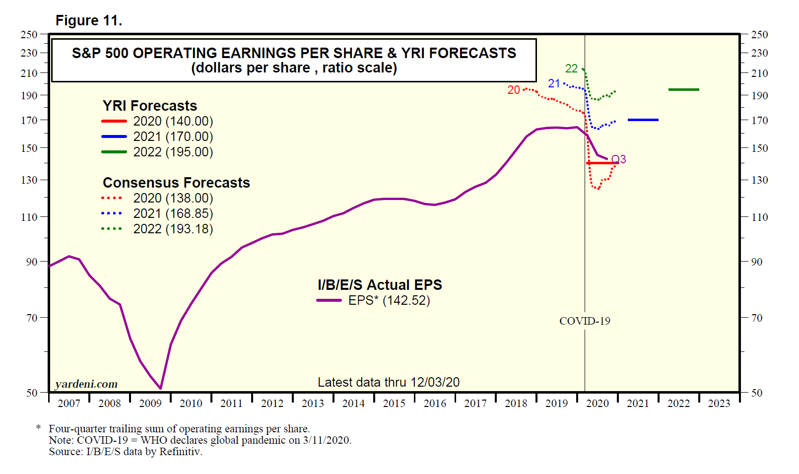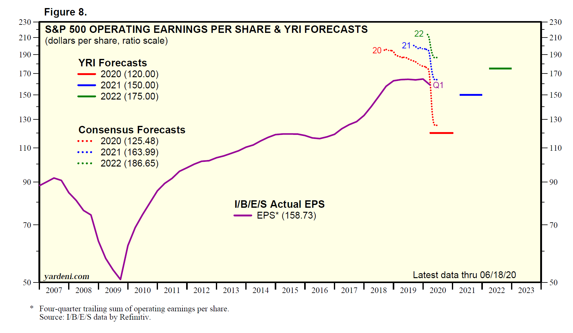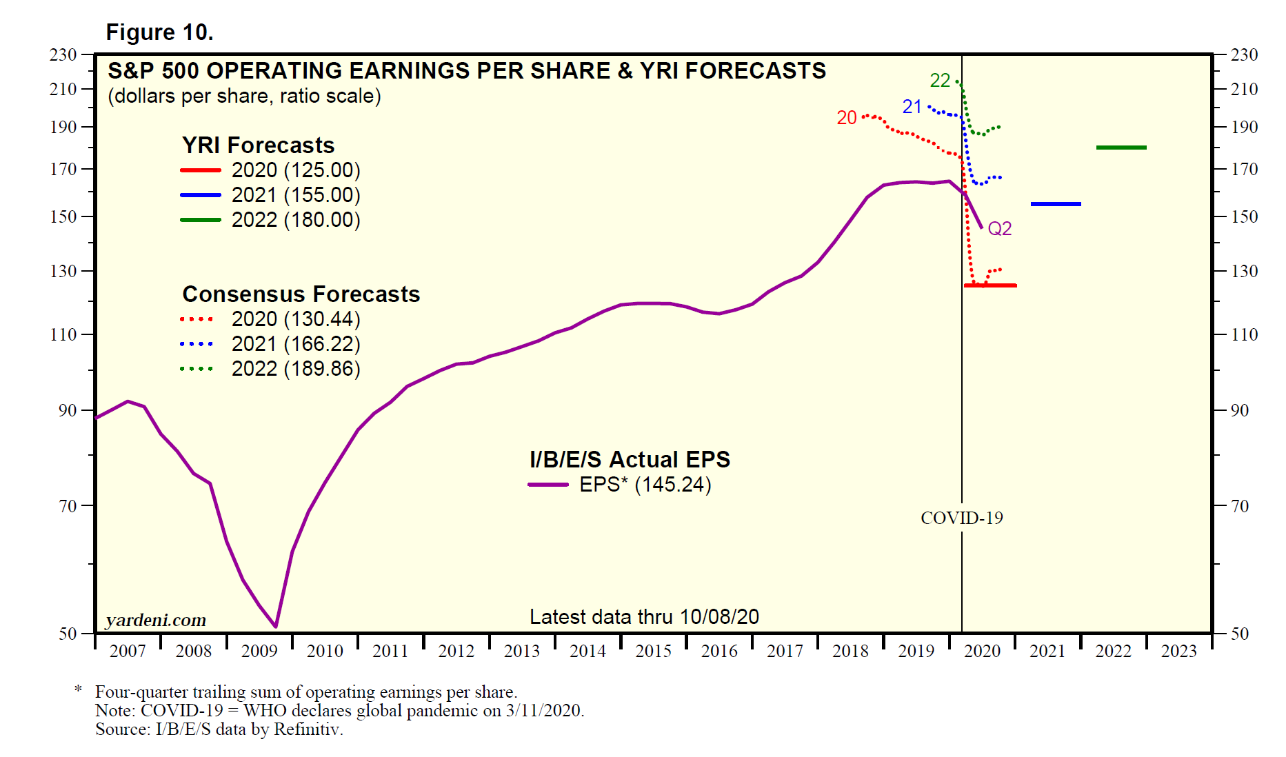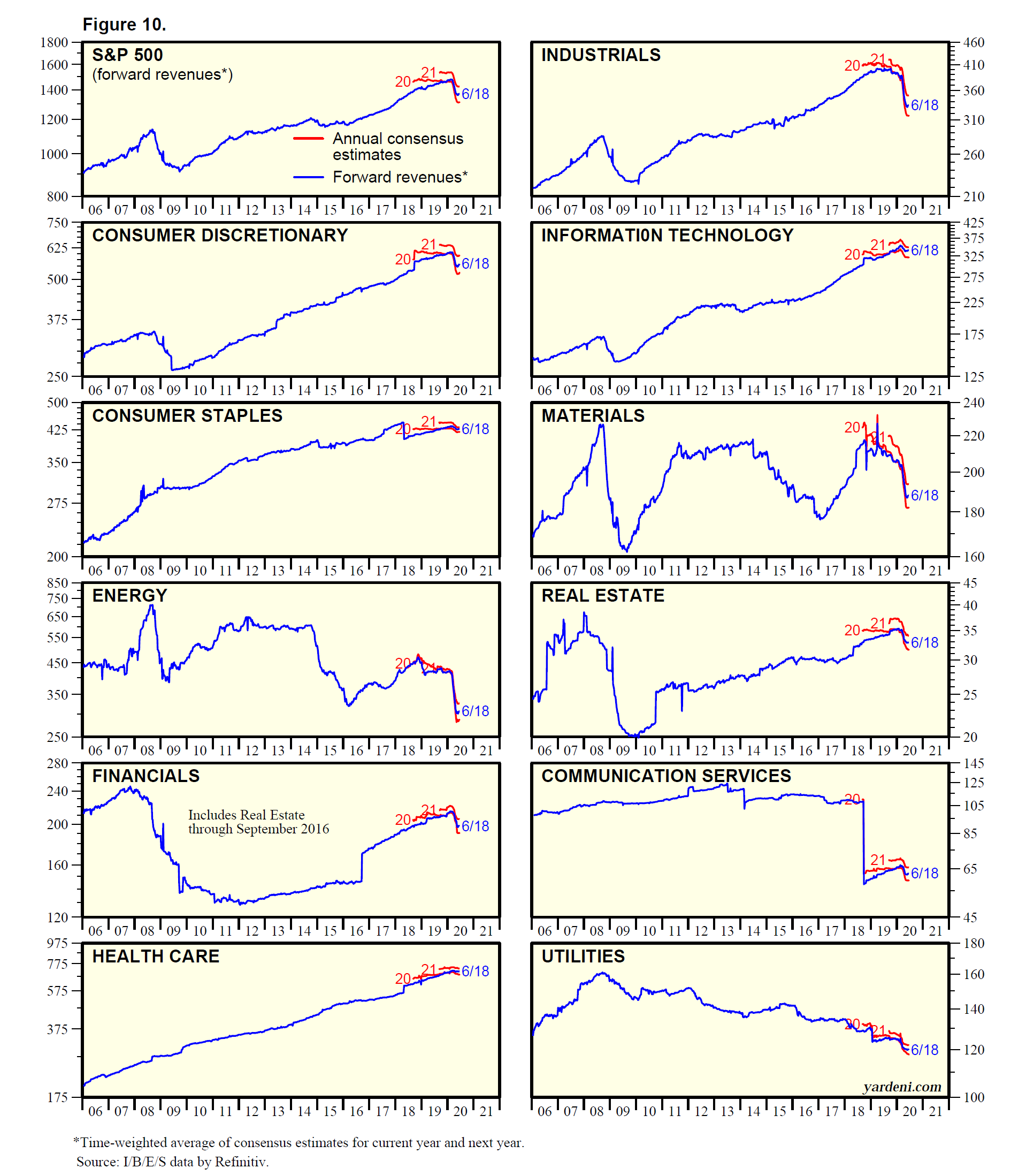 Corporate Finance I: Accounting for Fun & Profits. Yesterday, Joe and I raised our estimates for S&P 500 revenues and earnings per share and profit margins to the following: 2020 ($1,400, $140, 10%), 2021 ($1,545, $170, 11%), and 2022 ($1,625, $195, 12%). As a result, our S&P 500 year-end targets for this year and the next two years are now 3740, 4290, and 4620. (See YRI Earnings Forecasts.)