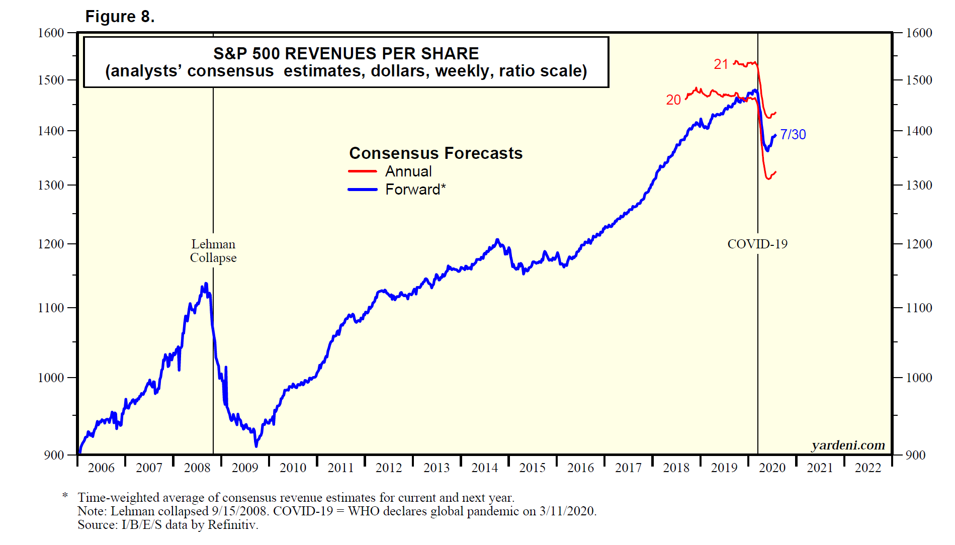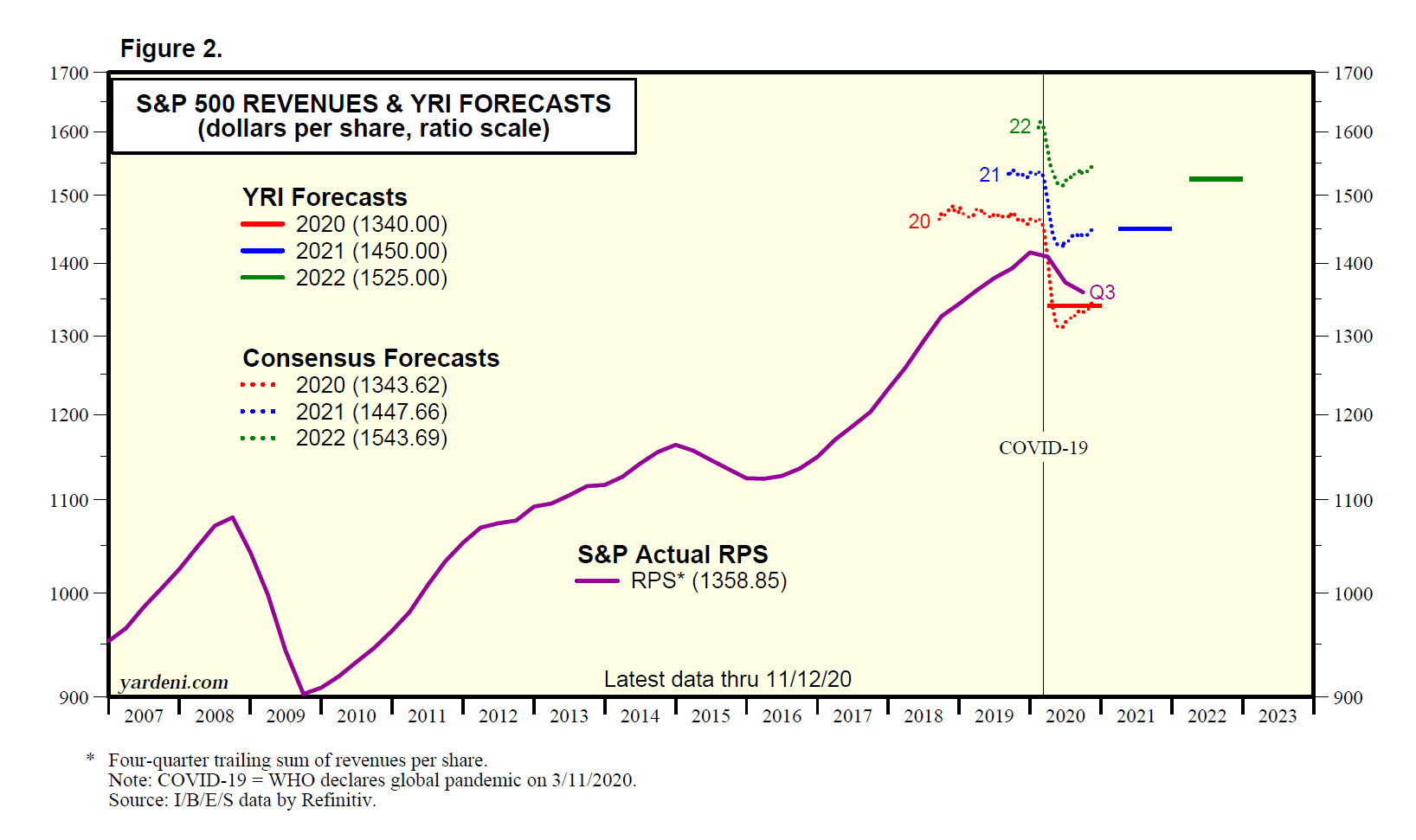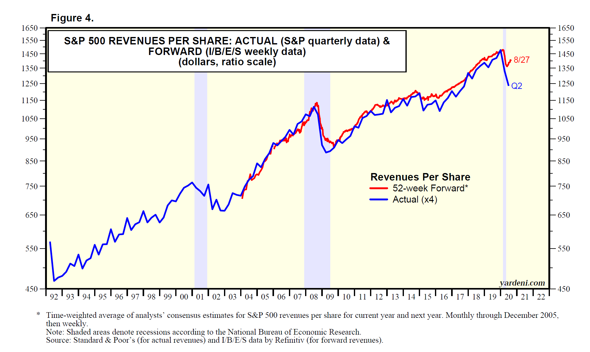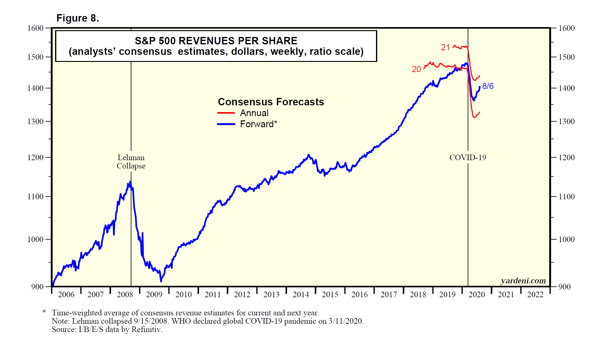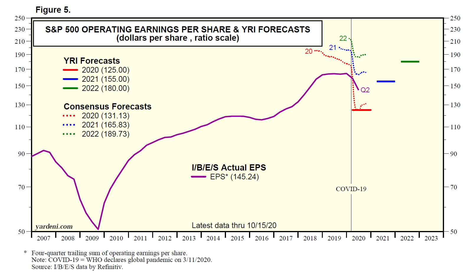 Corporate Finance I: Accounting for Fun & Profits. Yesterday, Joe and I raised our estimates for S&P 500 revenues and earnings per share and profit margins to the following: 2020 ($1,400, $140, 10%), 2021 ($1,545, $170, 11%), and 2022 ($1,625, $195, 12%). As a result, our S&P 500 year-end targets for this year and the next two years are now 3740, 4290, and 4620. (See YRI Earnings Forecasts.)