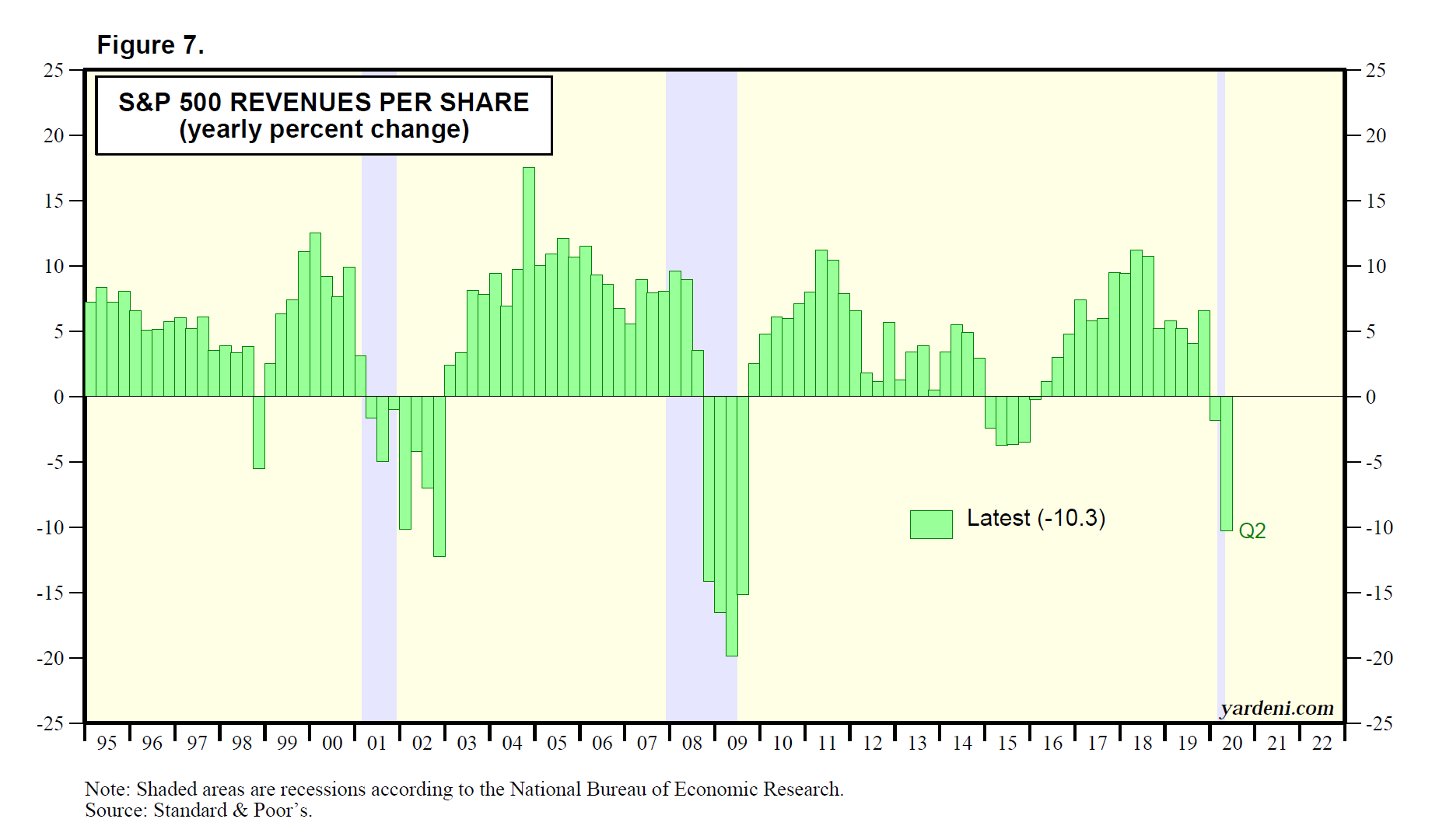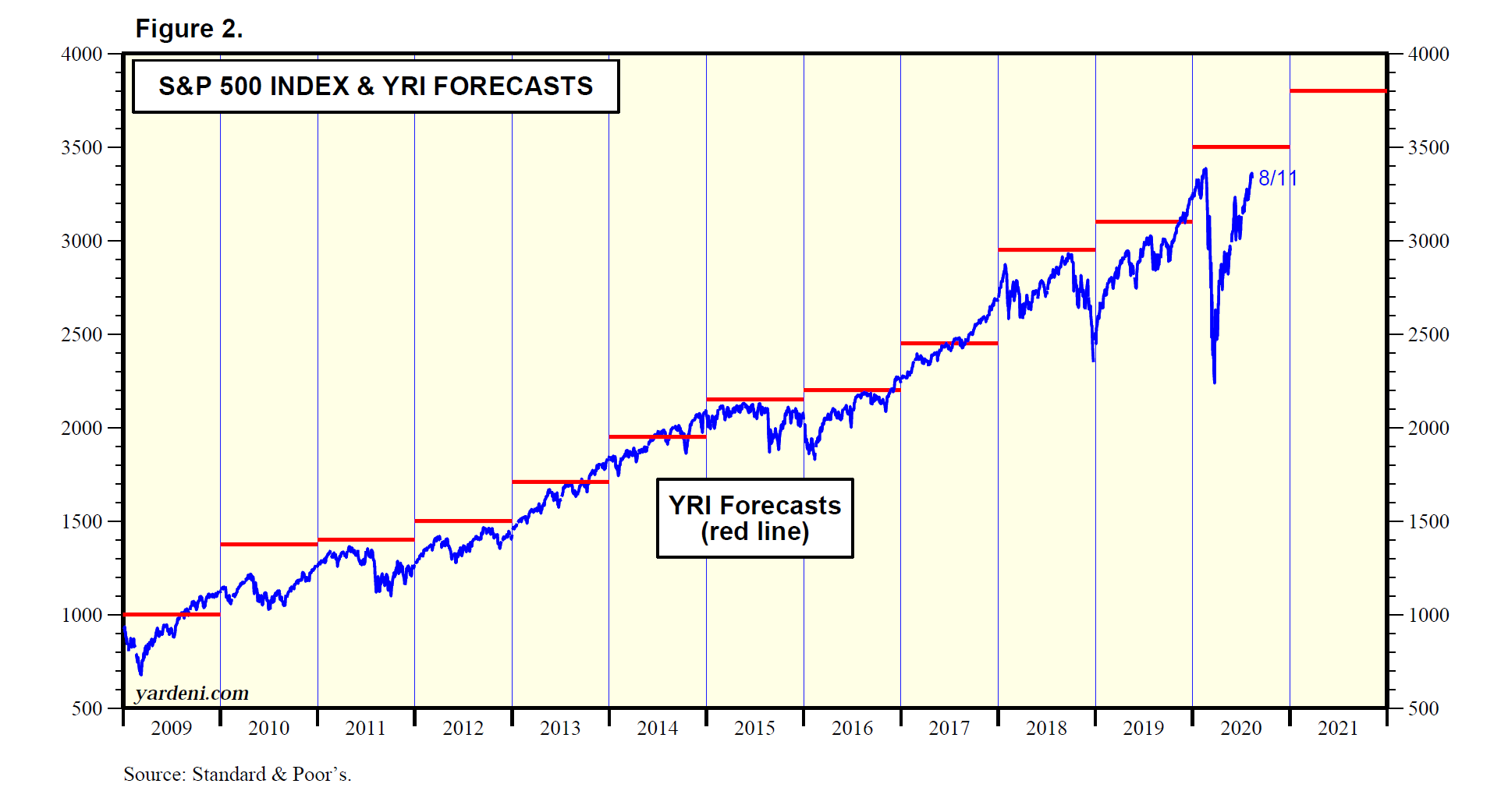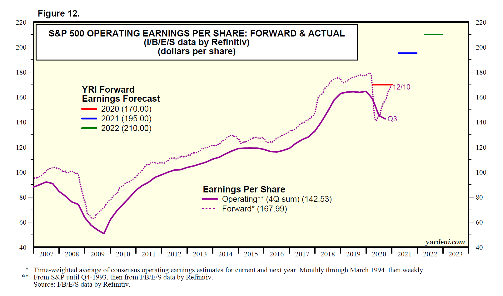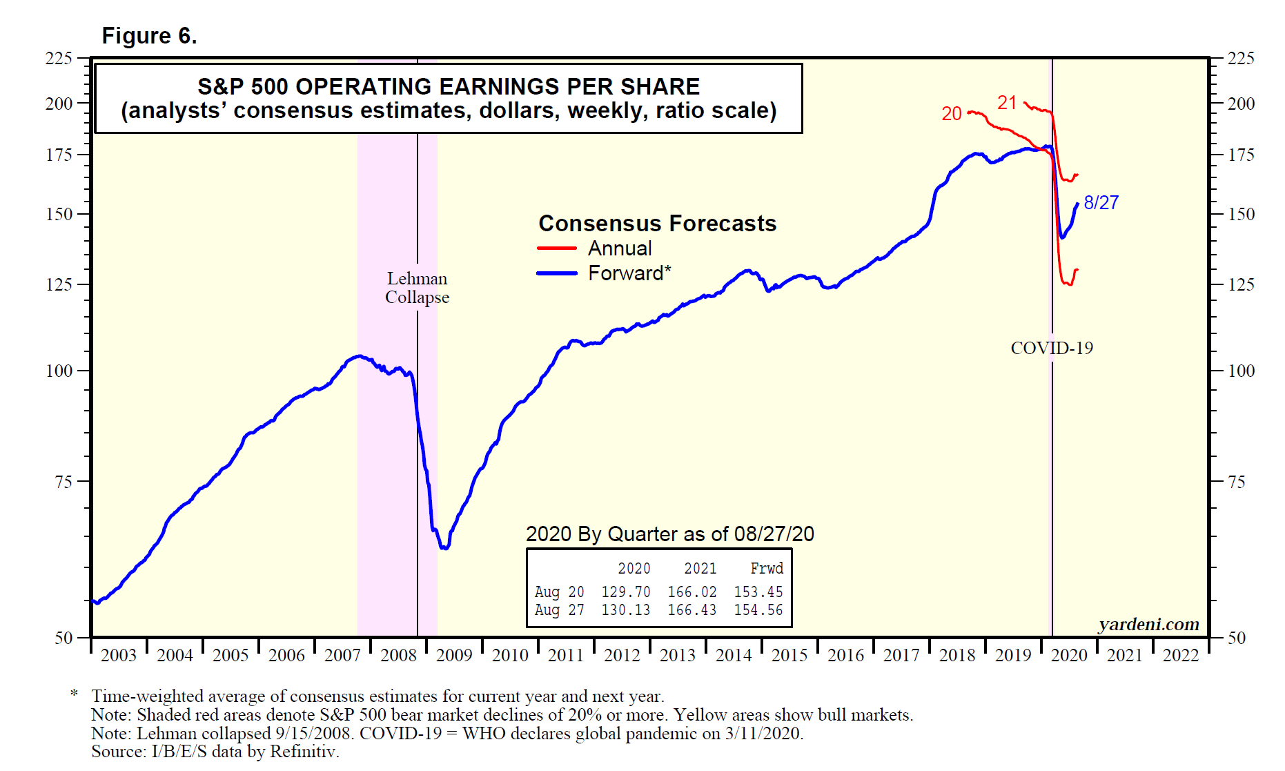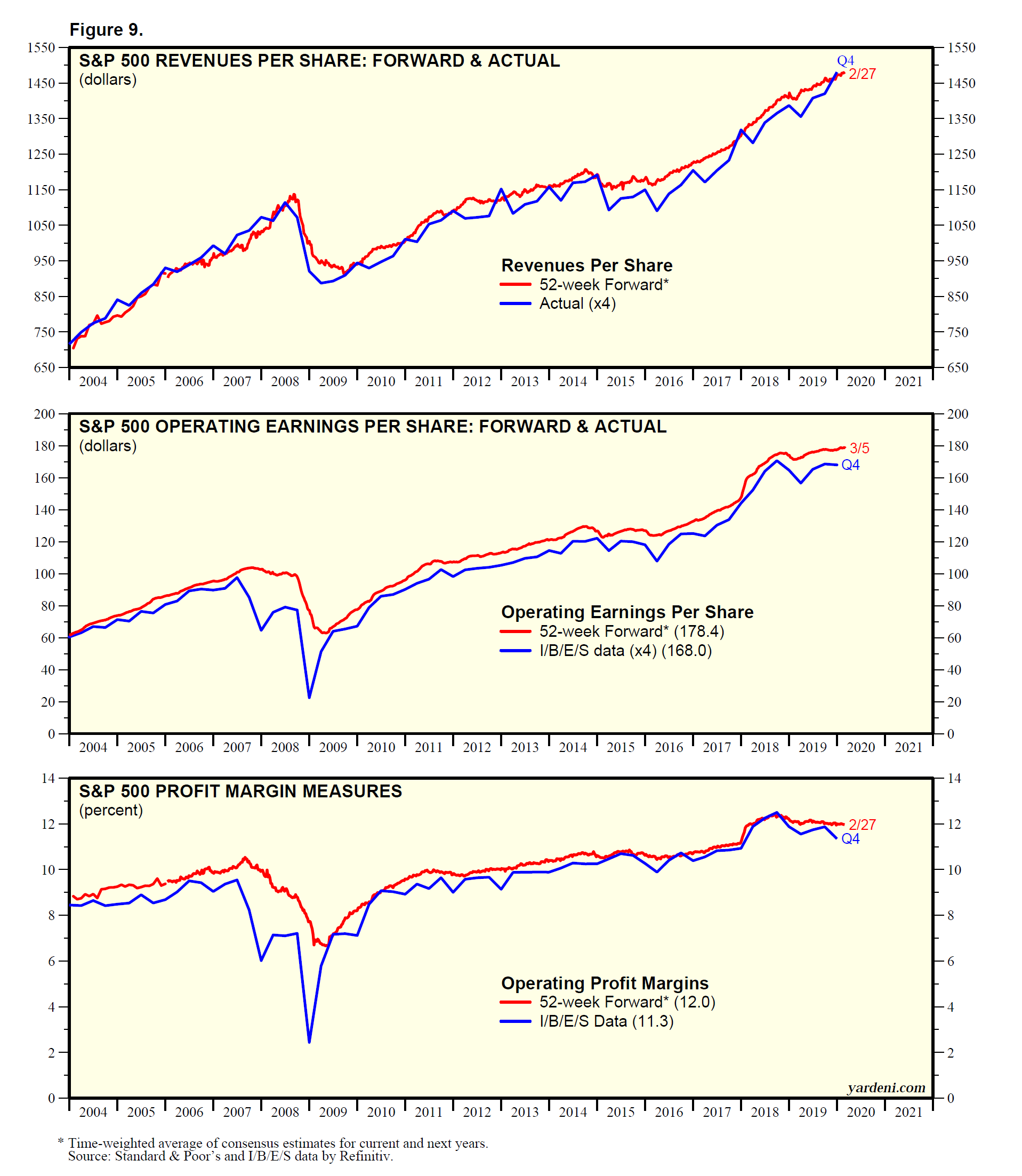 Corporate Finance I: Accounting for Fun & Profits. Yesterday, Joe and I raised our estimates for S&P 500 revenues and earnings per share and profit margins to the following: 2020 ($1,400, $140, 10%), 2021 ($1,545, $170, 11%), and 2022 ($1,625, $195, 12%). As a result, our S&P 500 year-end targets for this year and the next two years are now 3740, 4290, and 4620. (See YRI Earnings Forecasts.)