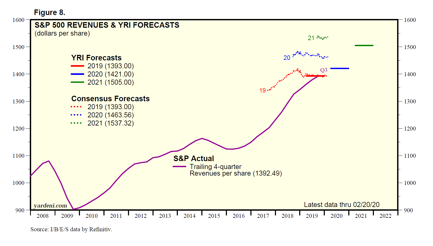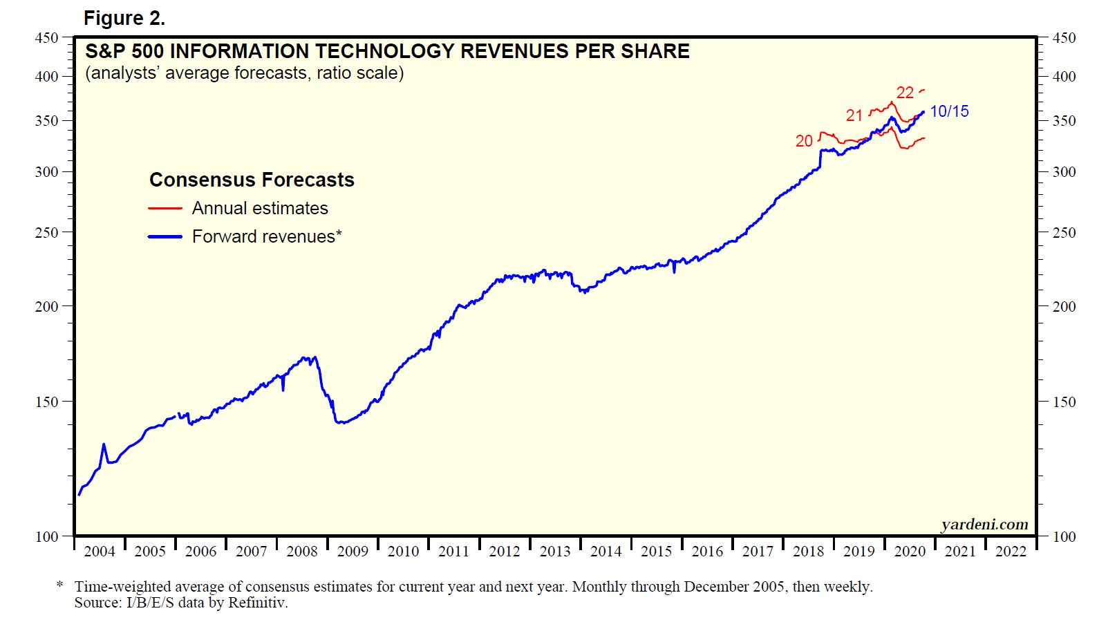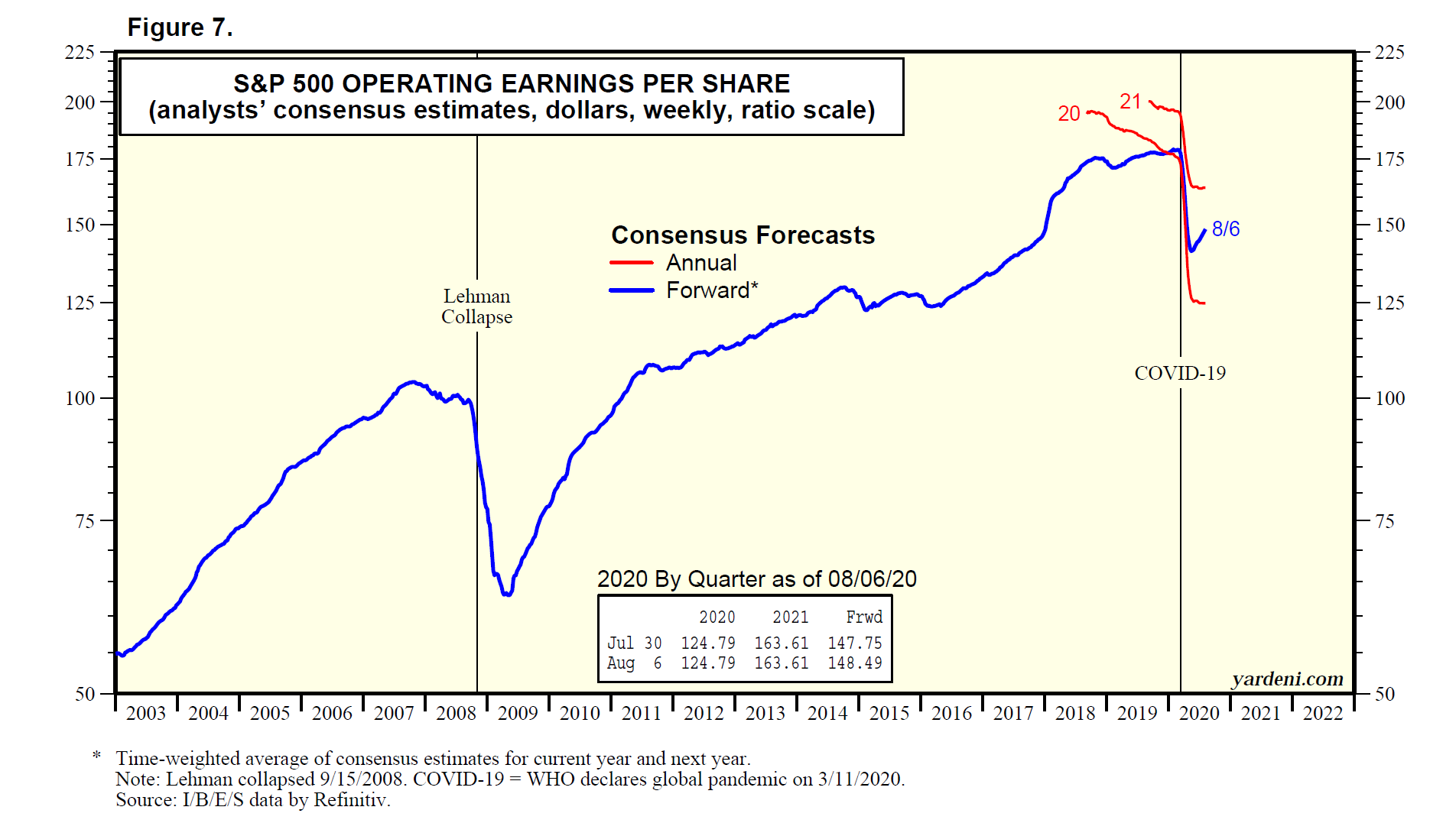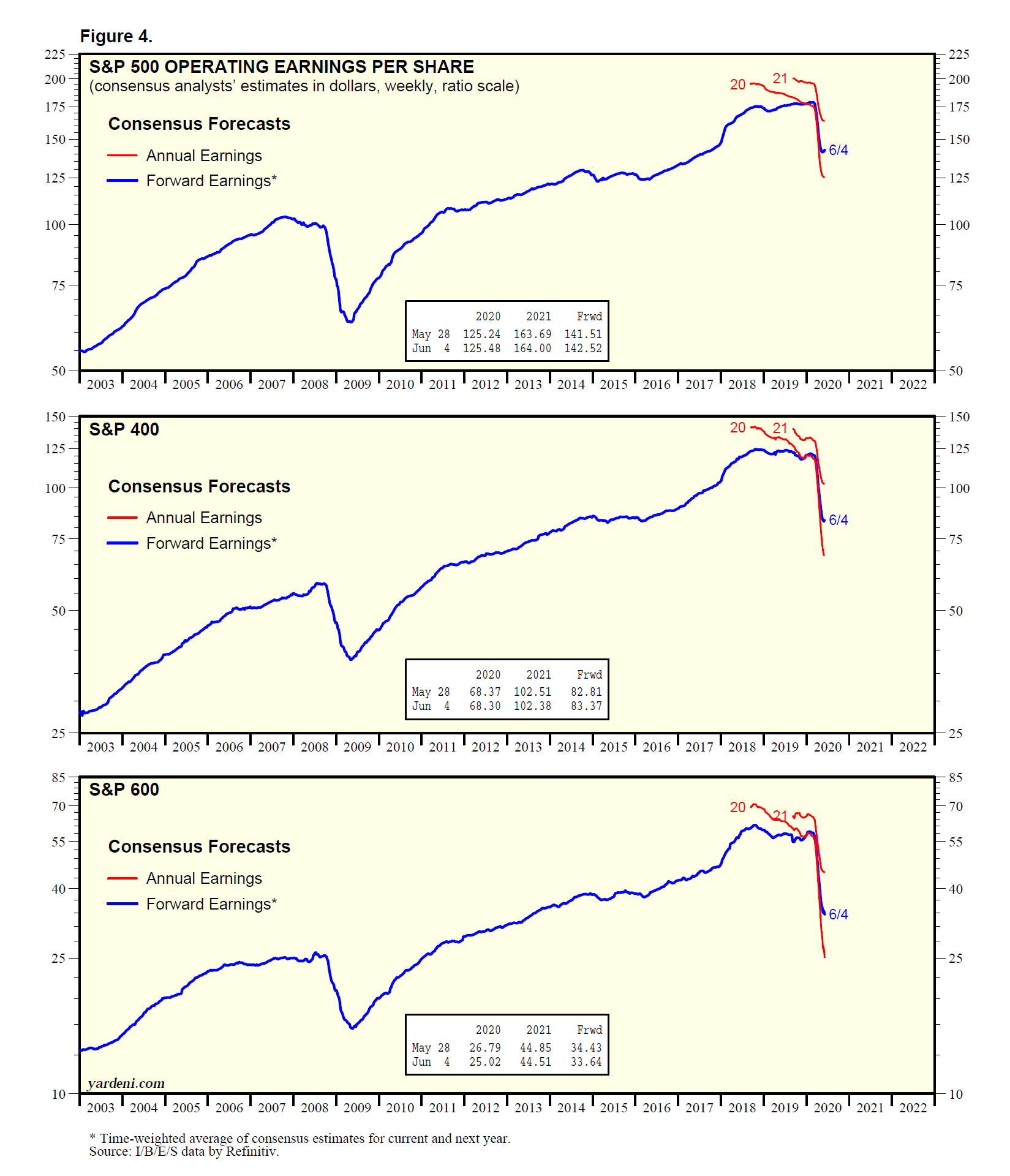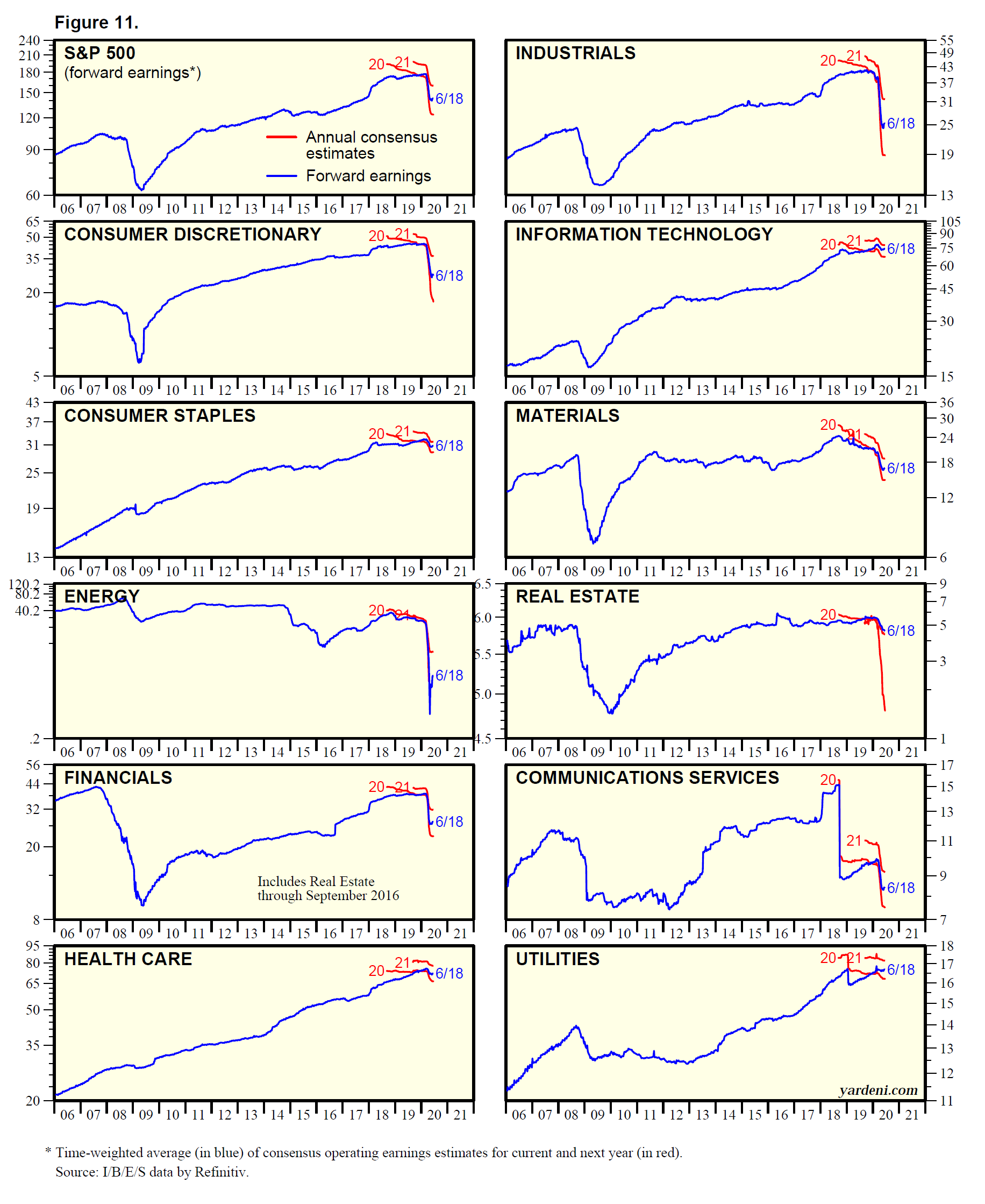 Corporate Finance I: Accounting for Fun & Profits. Yesterday, Joe and I raised our estimates for S&P 500 revenues and earnings per share and profit margins to the following: 2020 ($1,400, $140, 10%), 2021 ($1,545, $170, 11%), and 2022 ($1,625, $195, 12%). As a result, our S&P 500 year-end targets for this year and the next two years are now 3740, 4290, and 4620. (See YRI Earnings Forecasts.)
