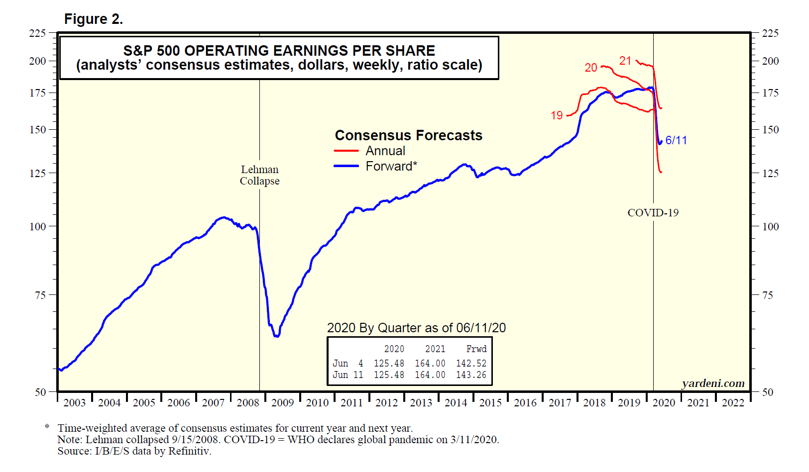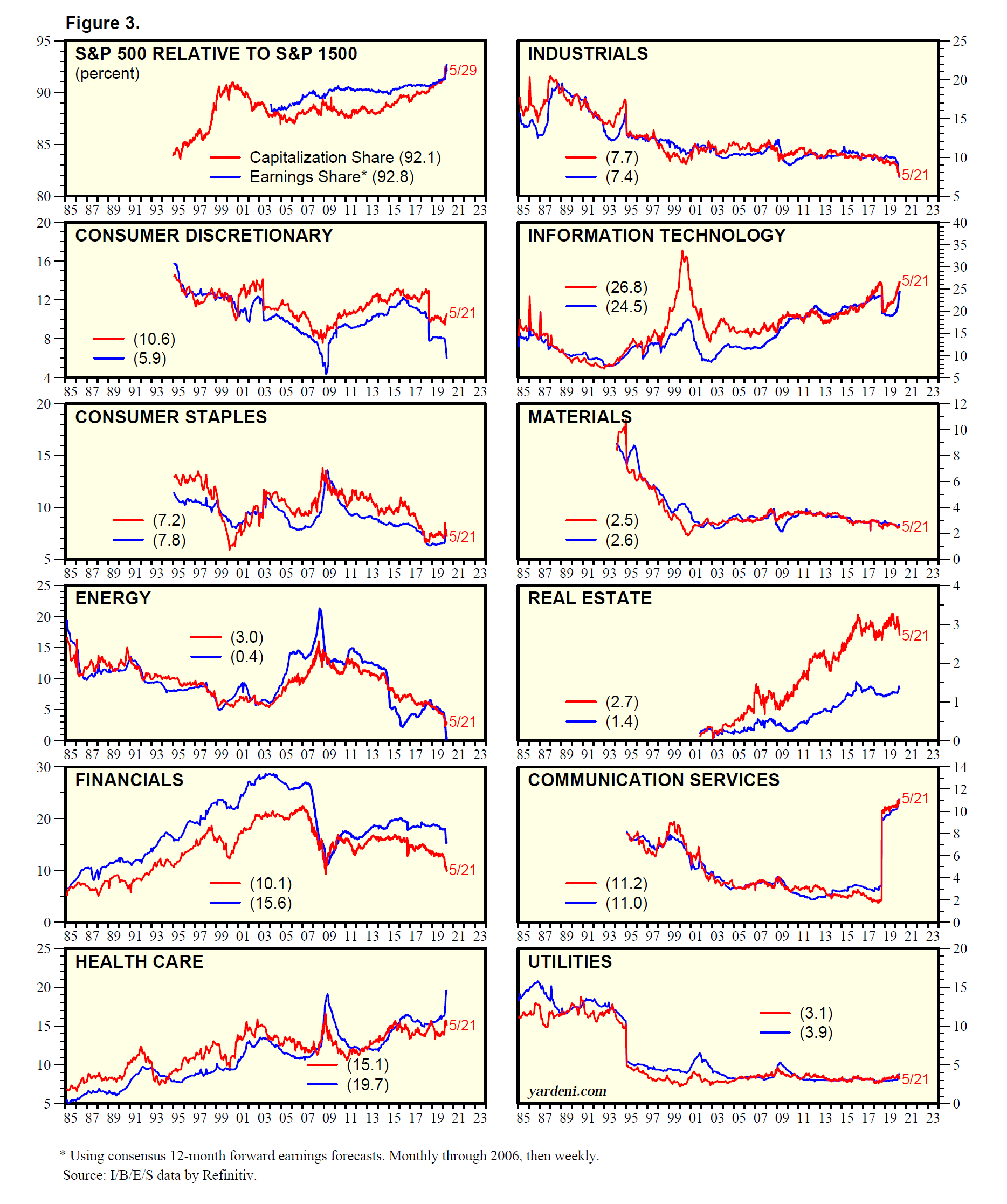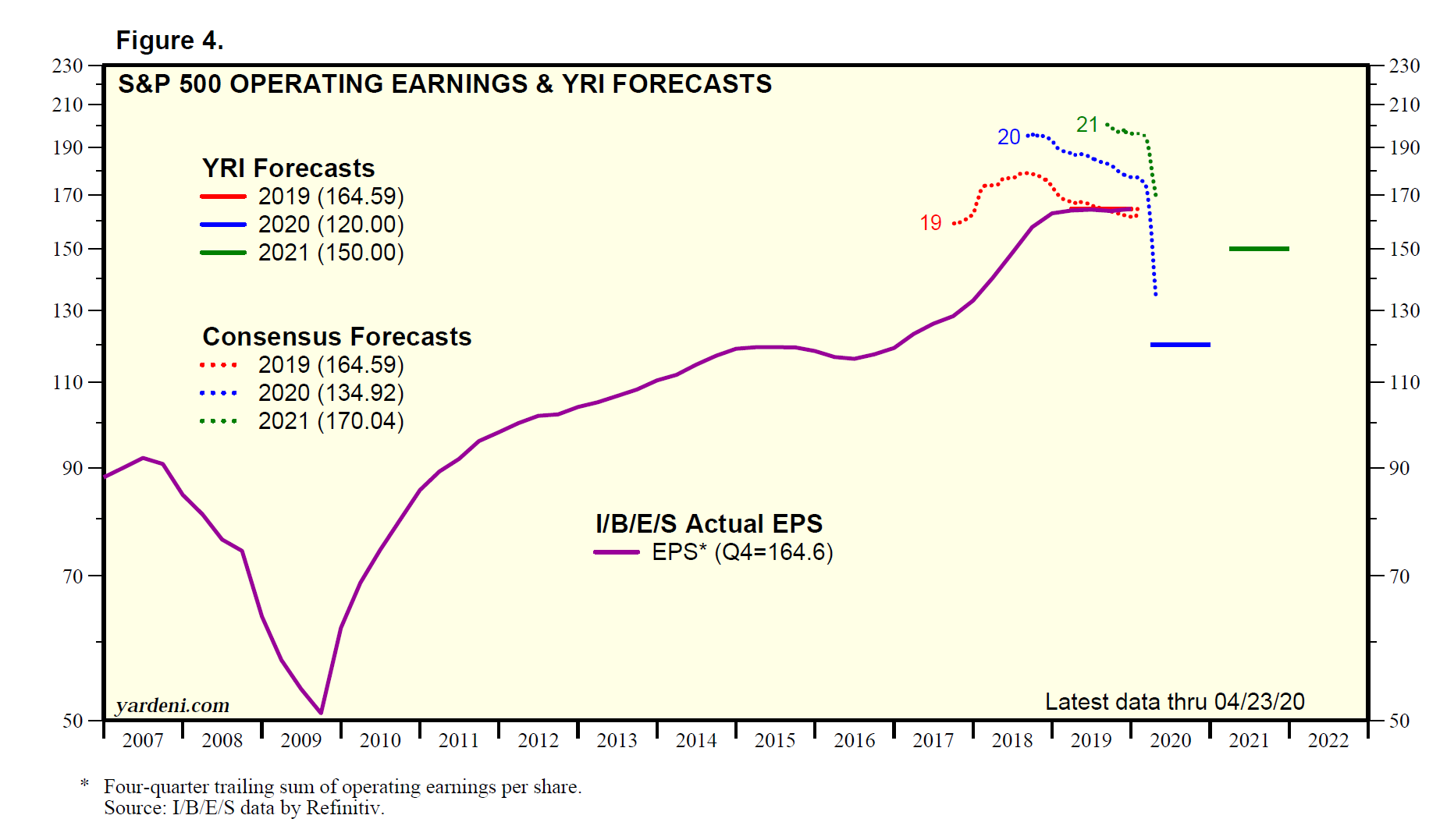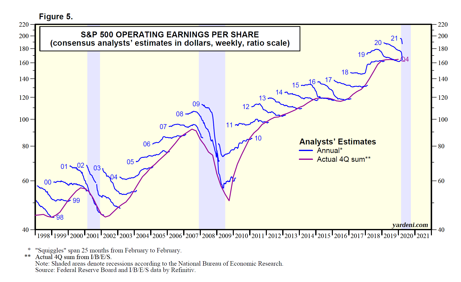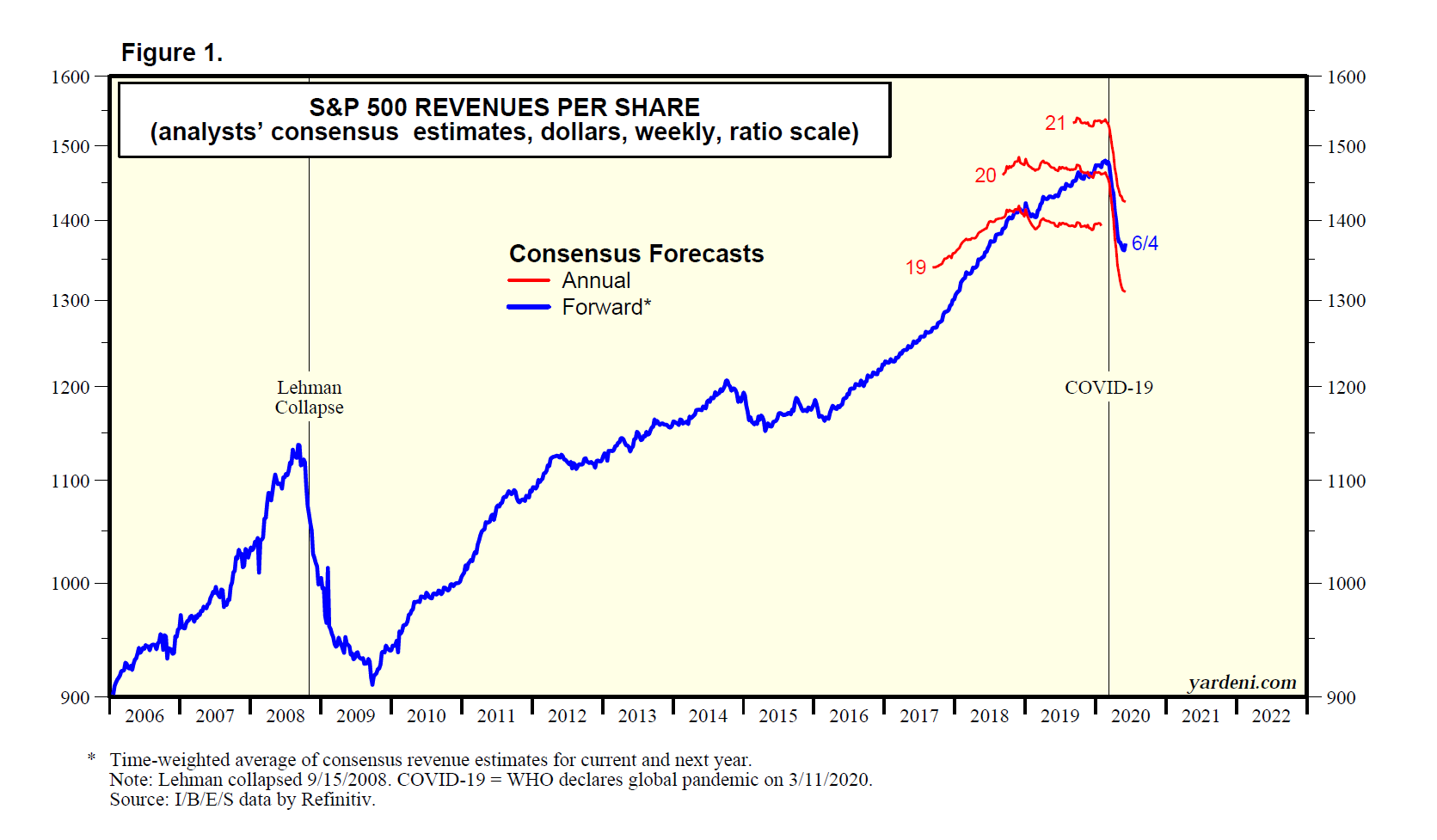 Corporate Finance I: Accounting for Fun & Profits. Yesterday, Joe and I raised our estimates for S&P 500 revenues and earnings per share and profit margins to the following: 2020 ($1,400, $140, 10%), 2021 ($1,545, $170, 11%), and 2022 ($1,625, $195, 12%). As a result, our S&P 500 year-end targets for this year and the next two years are now 3740, 4290, and 4620. (See YRI Earnings Forecasts.)
