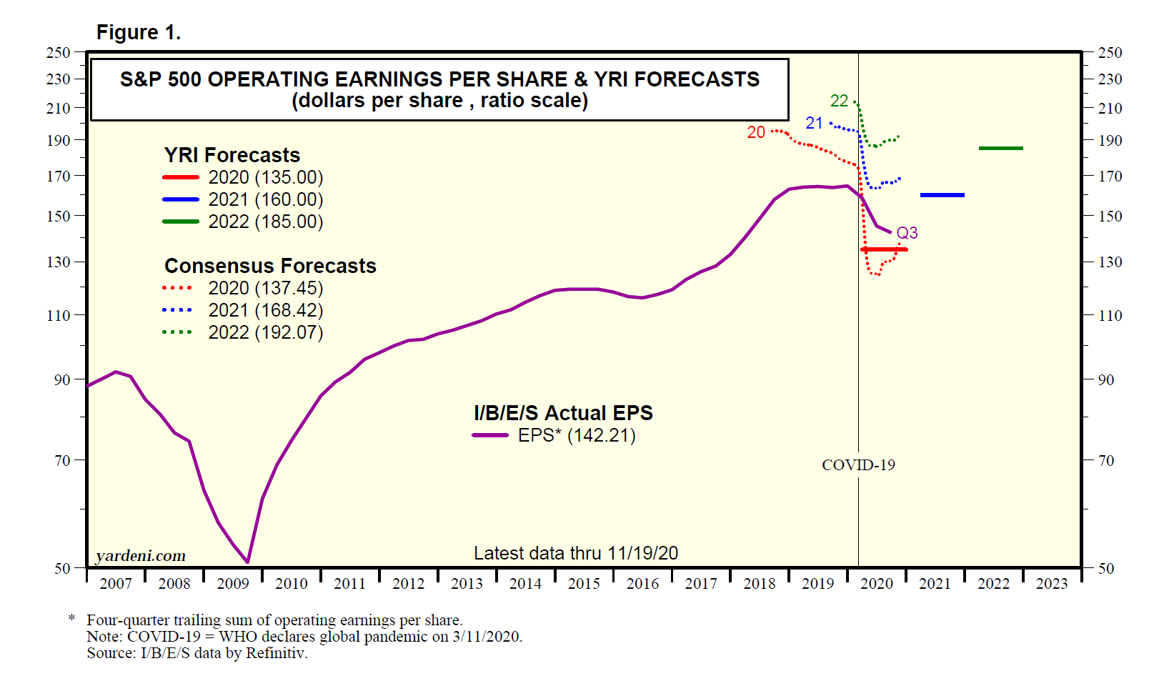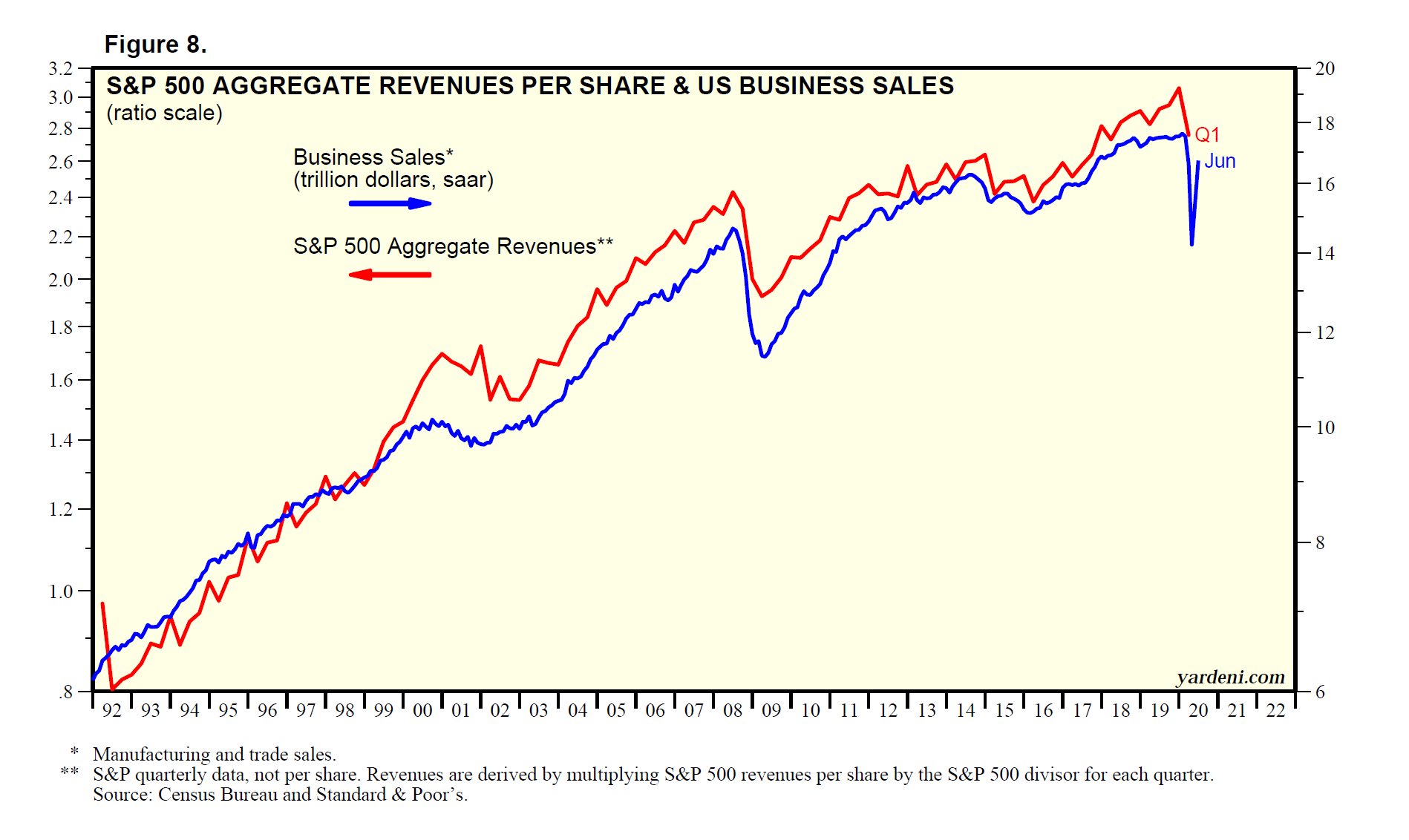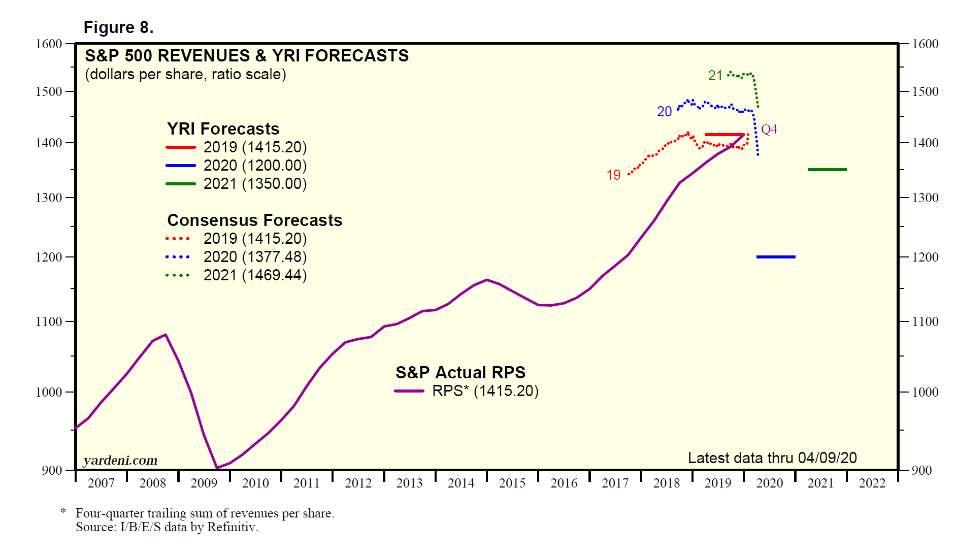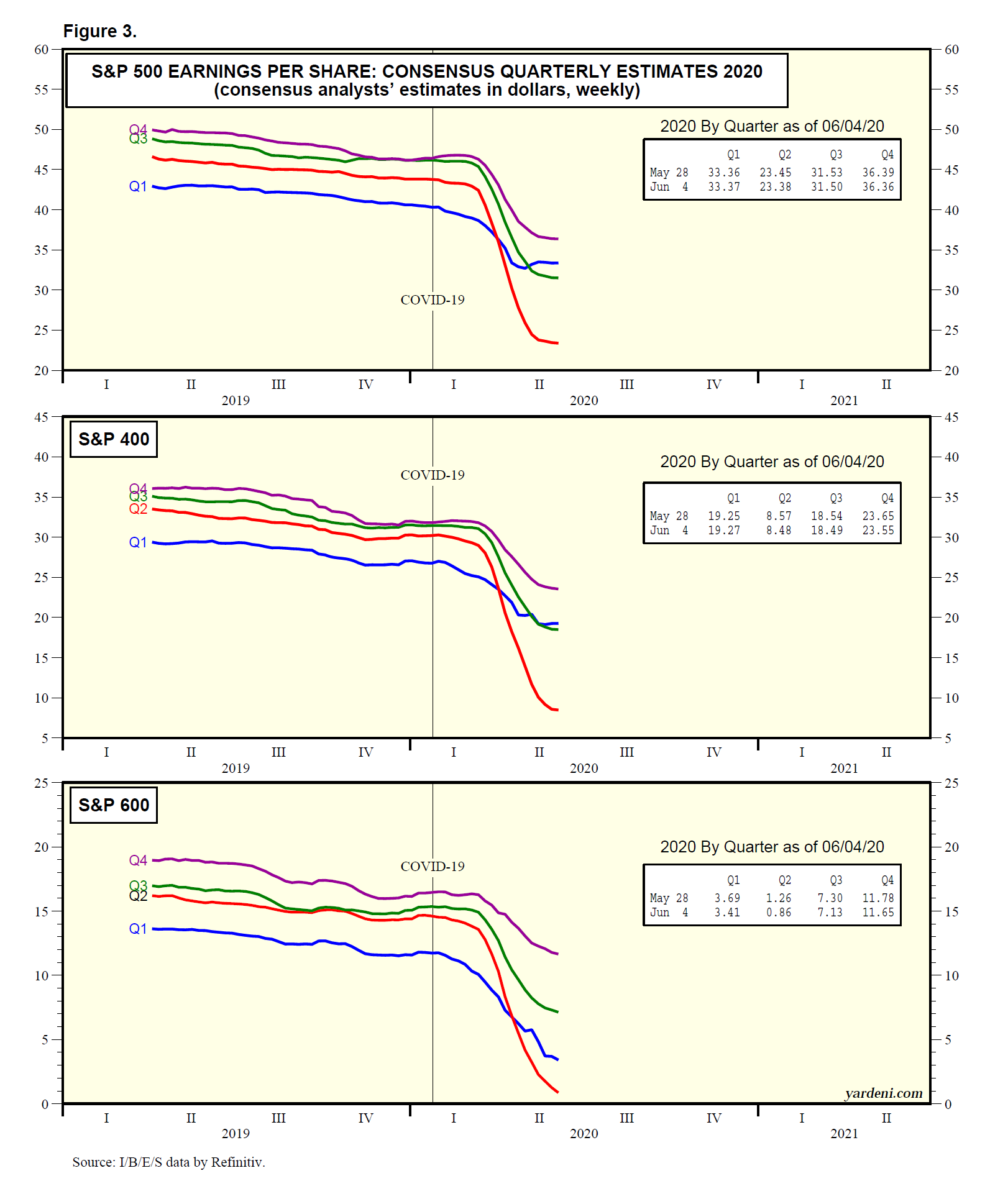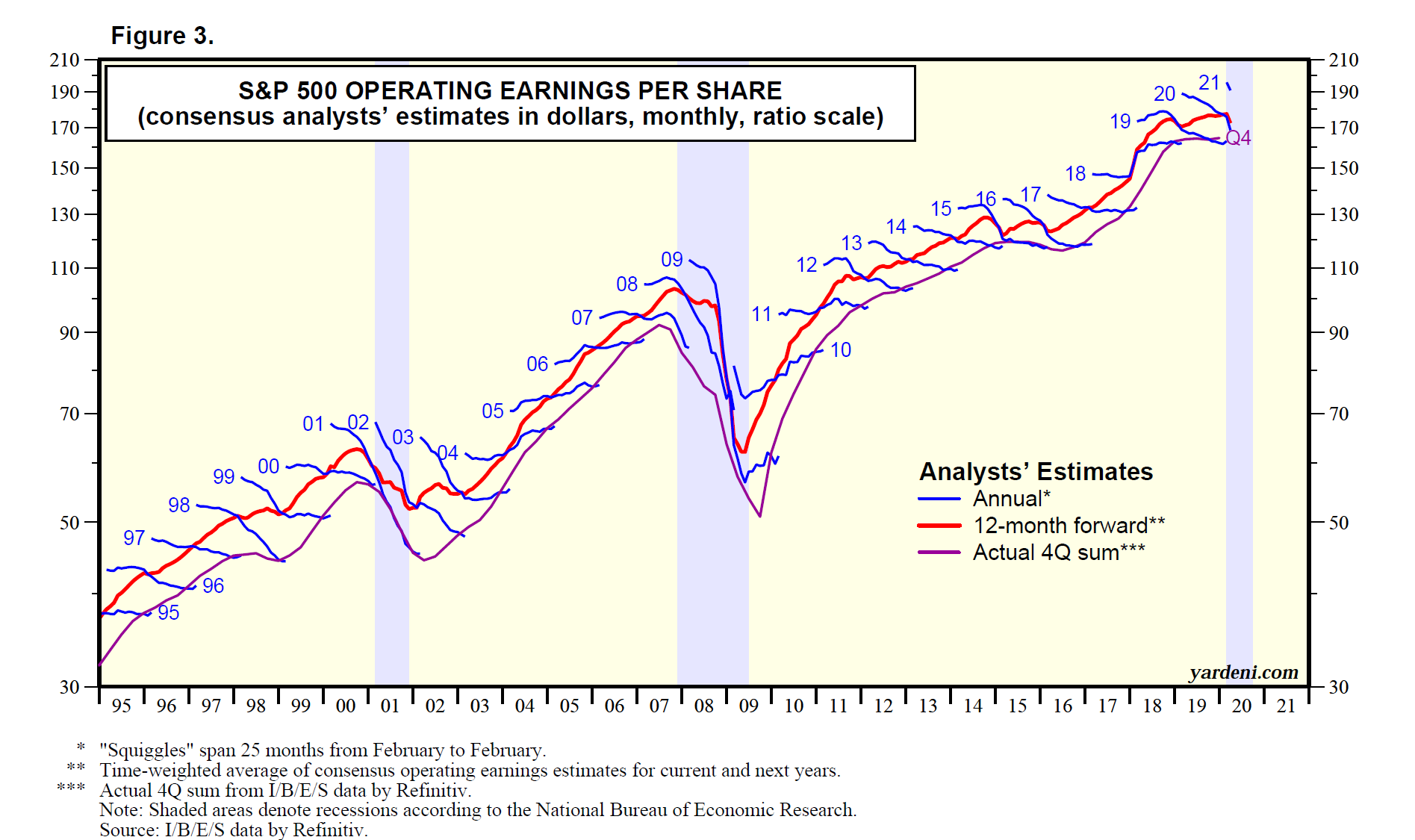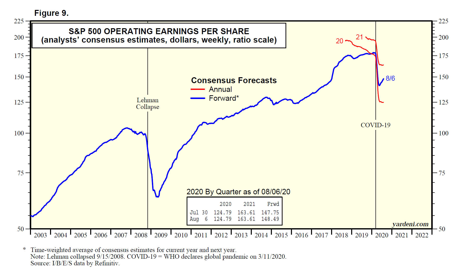 Corporate Finance I: Accounting for Fun & Profits. Yesterday, Joe and I raised our estimates for S&P 500 revenues and earnings per share and profit margins to the following: 2020 ($1,400, $140, 10%), 2021 ($1,545, $170, 11%), and 2022 ($1,625, $195, 12%). As a result, our S&P 500 year-end targets for this year and the next two years are now 3740, 4290, and 4620. (See YRI Earnings Forecasts.)
