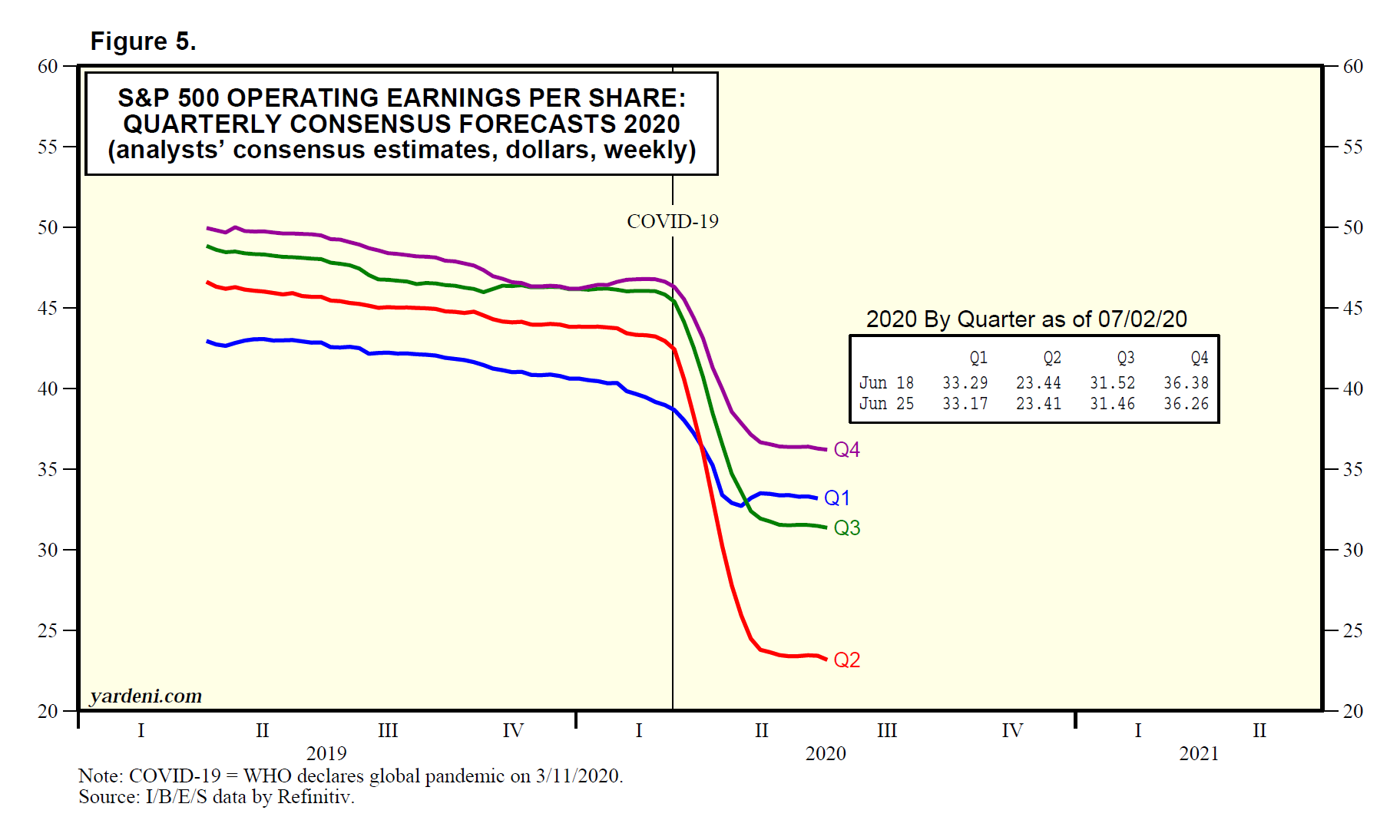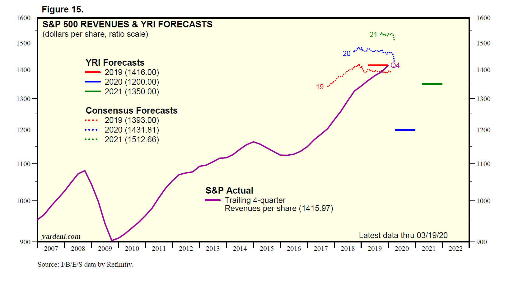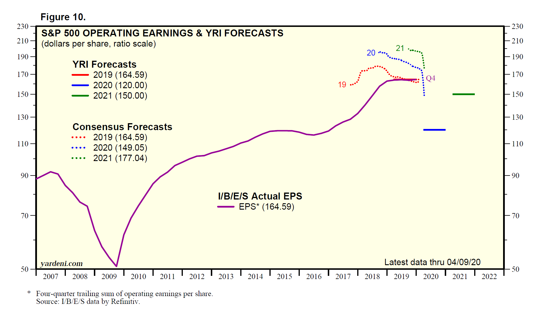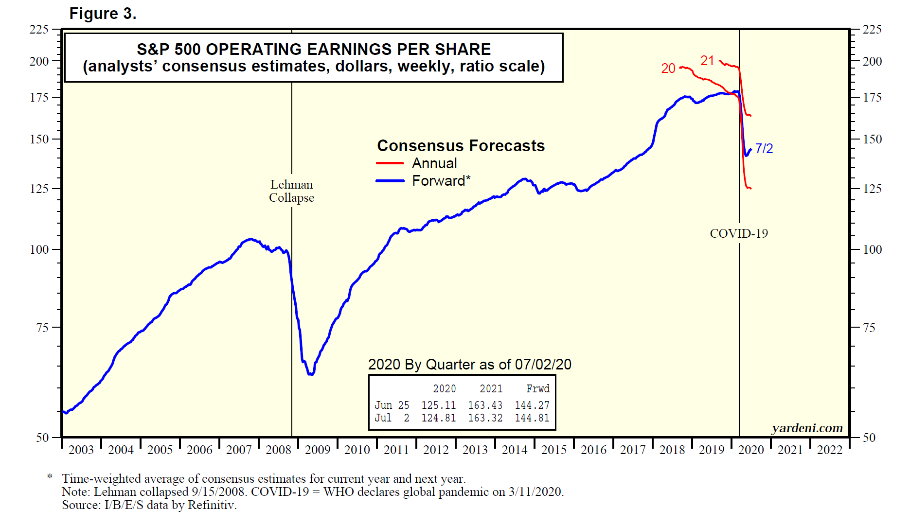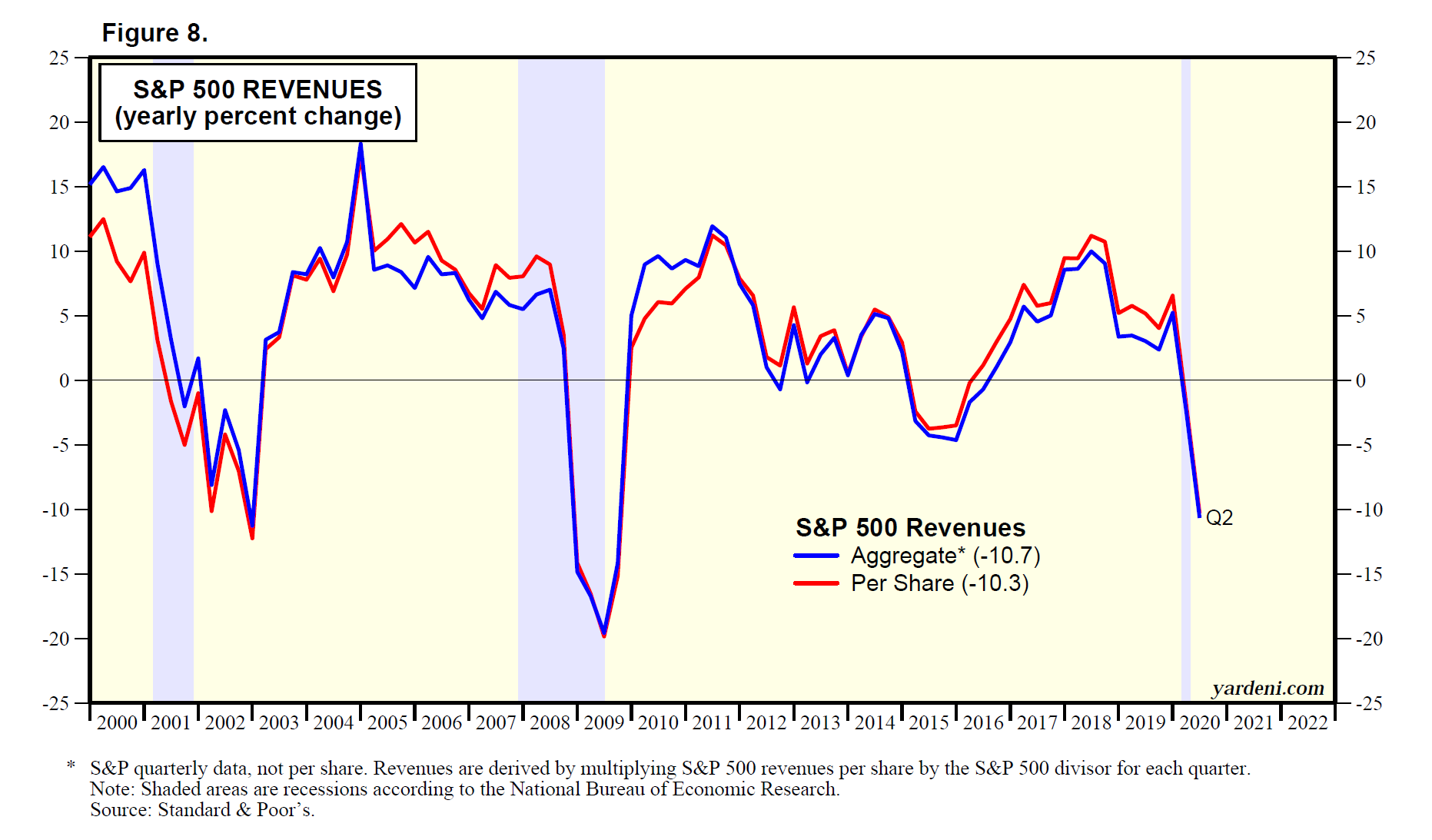 Corporate Finance I: Accounting for Fun & Profits. Yesterday, Joe and I raised our estimates for S&P 500 revenues and earnings per share and profit margins to the following: 2020 ($1,400, $140, 10%), 2021 ($1,545, $170, 11%), and 2022 ($1,625, $195, 12%). As a result, our S&P 500 year-end targets for this year and the next two years are now 3740, 4290, and 4620. (See YRI Earnings Forecasts.)