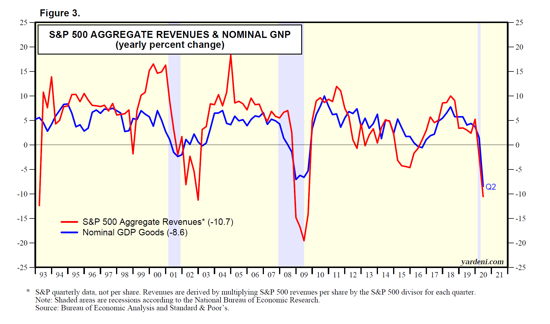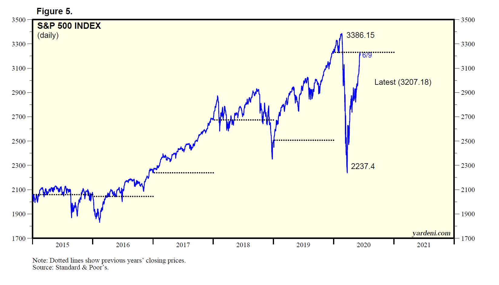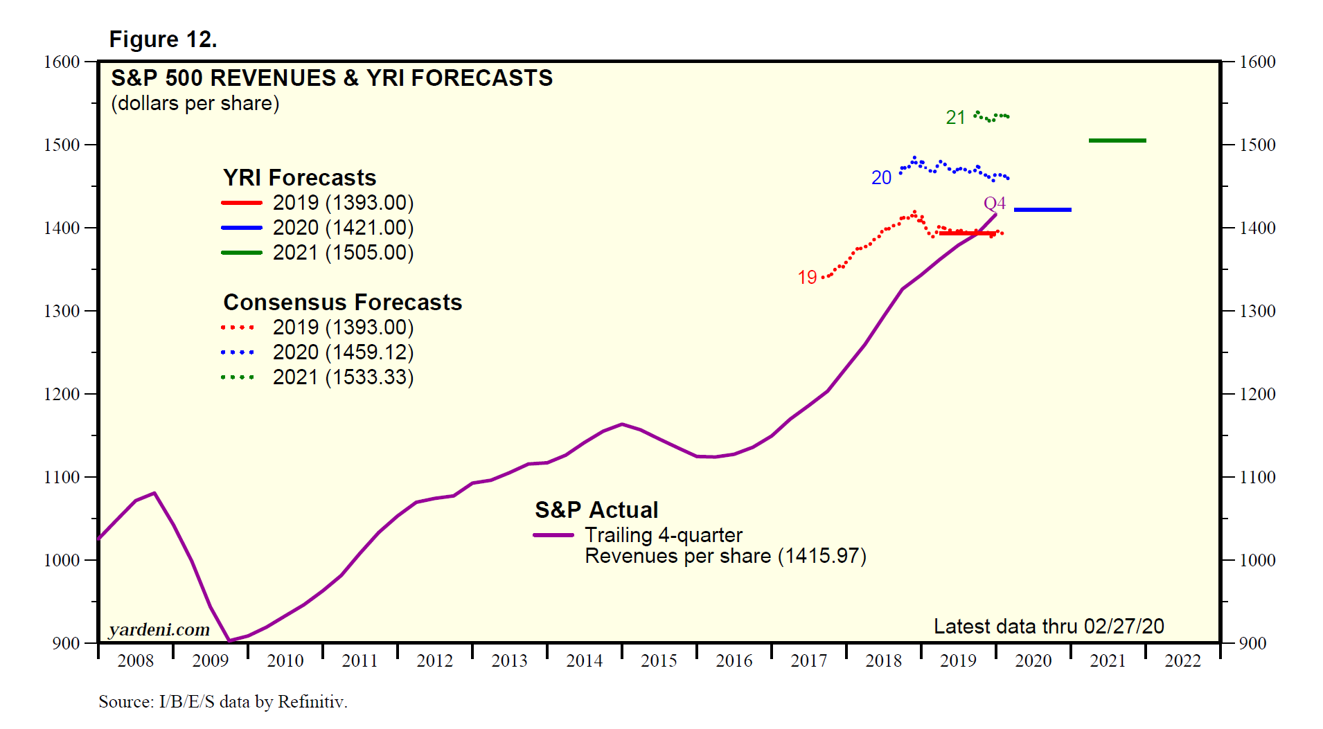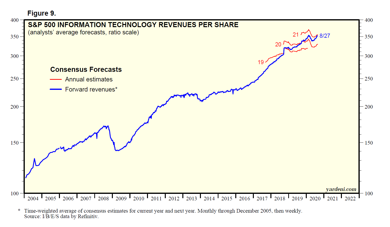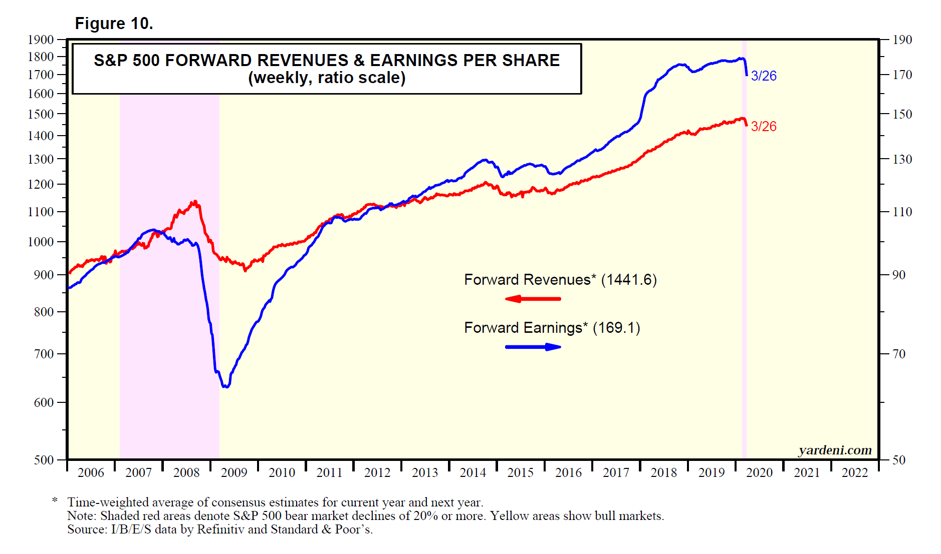 Corporate Finance I: Accounting for Fun & Profits. Yesterday, Joe and I raised our estimates for S&P 500 revenues and earnings per share and profit margins to the following: 2020 ($1,400, $140, 10%), 2021 ($1,545, $170, 11%), and 2022 ($1,625, $195, 12%). As a result, our S&P 500 year-end targets for this year and the next two years are now 3740, 4290, and 4620. (See YRI Earnings Forecasts.)