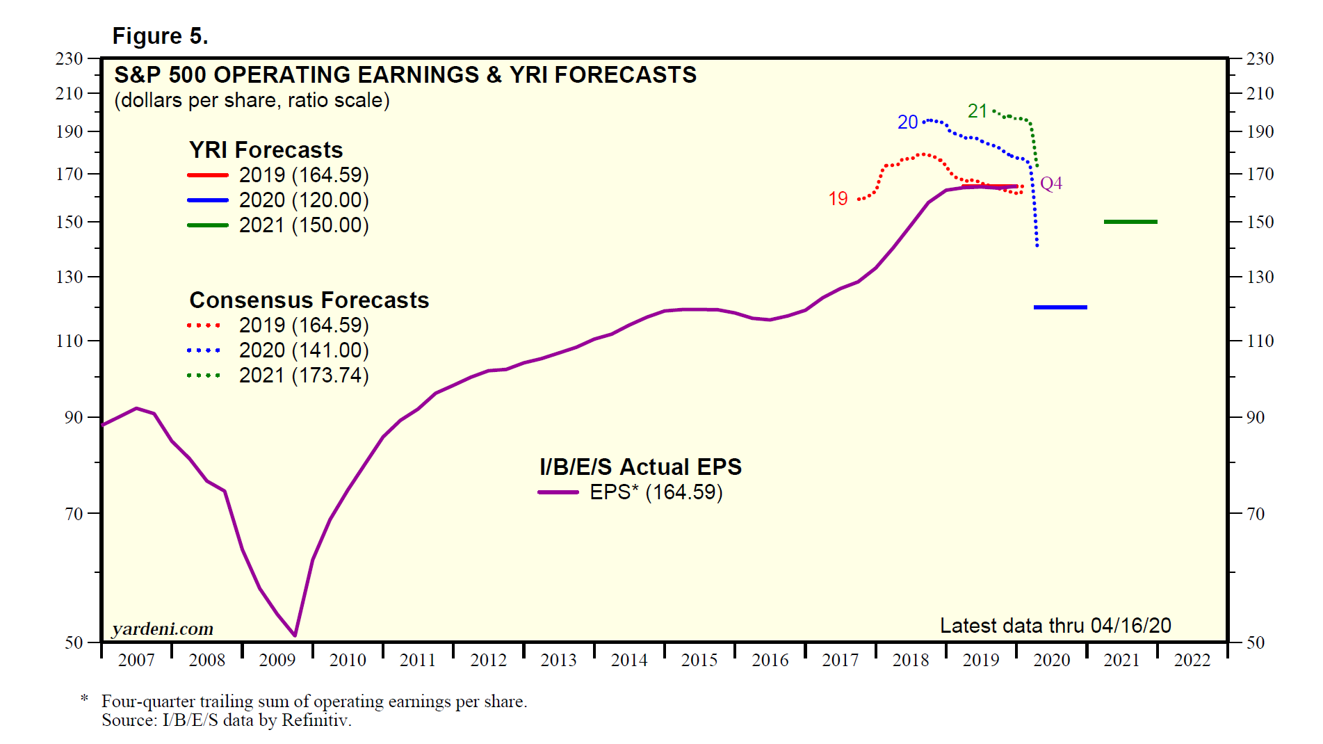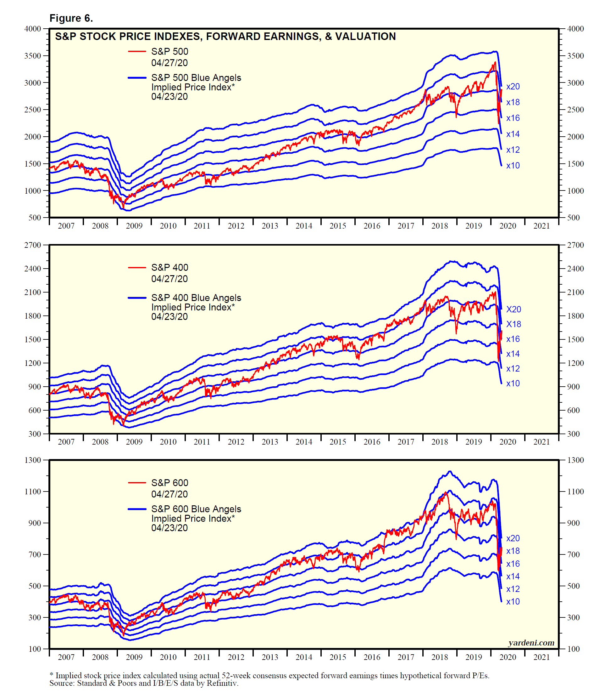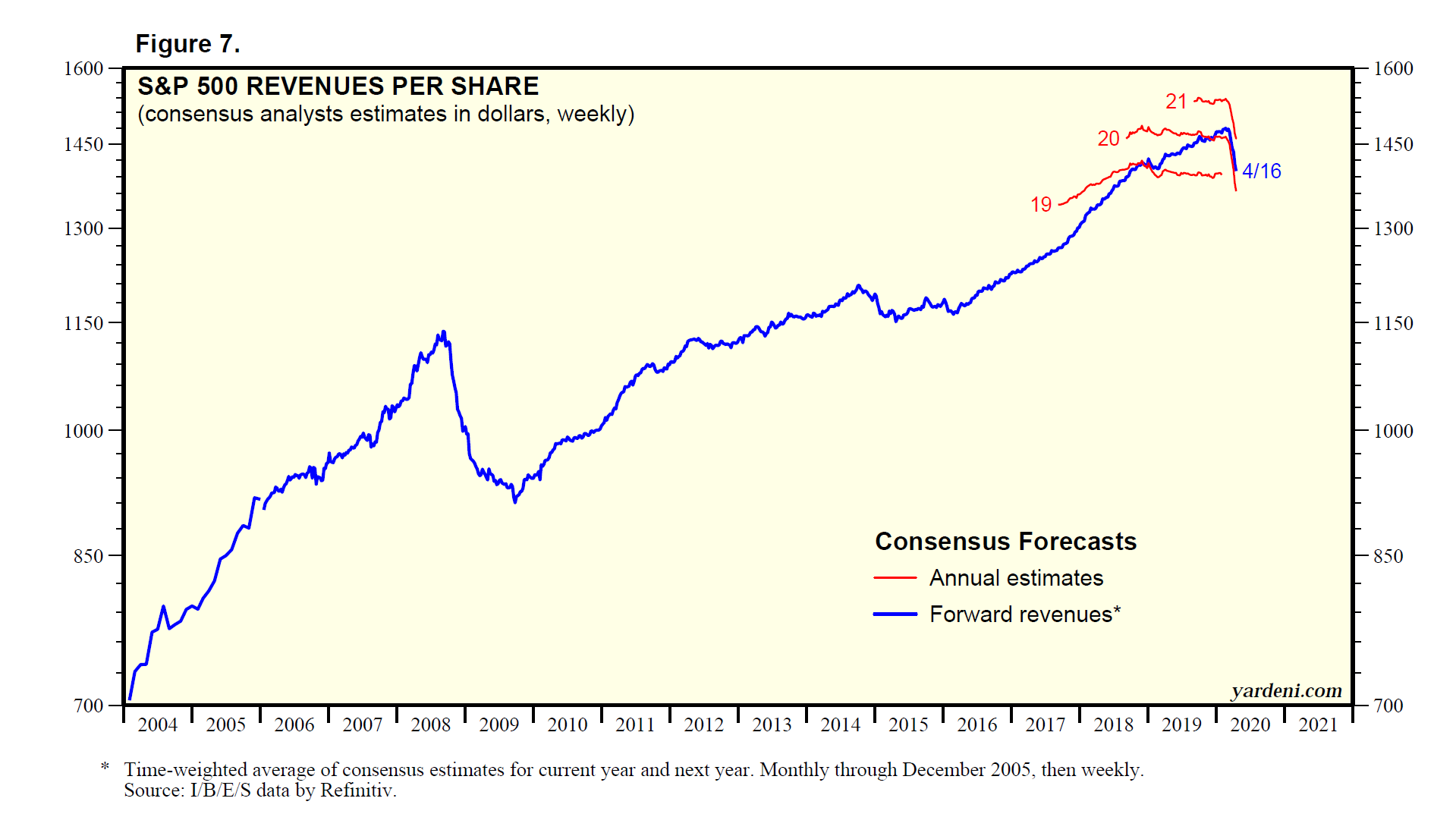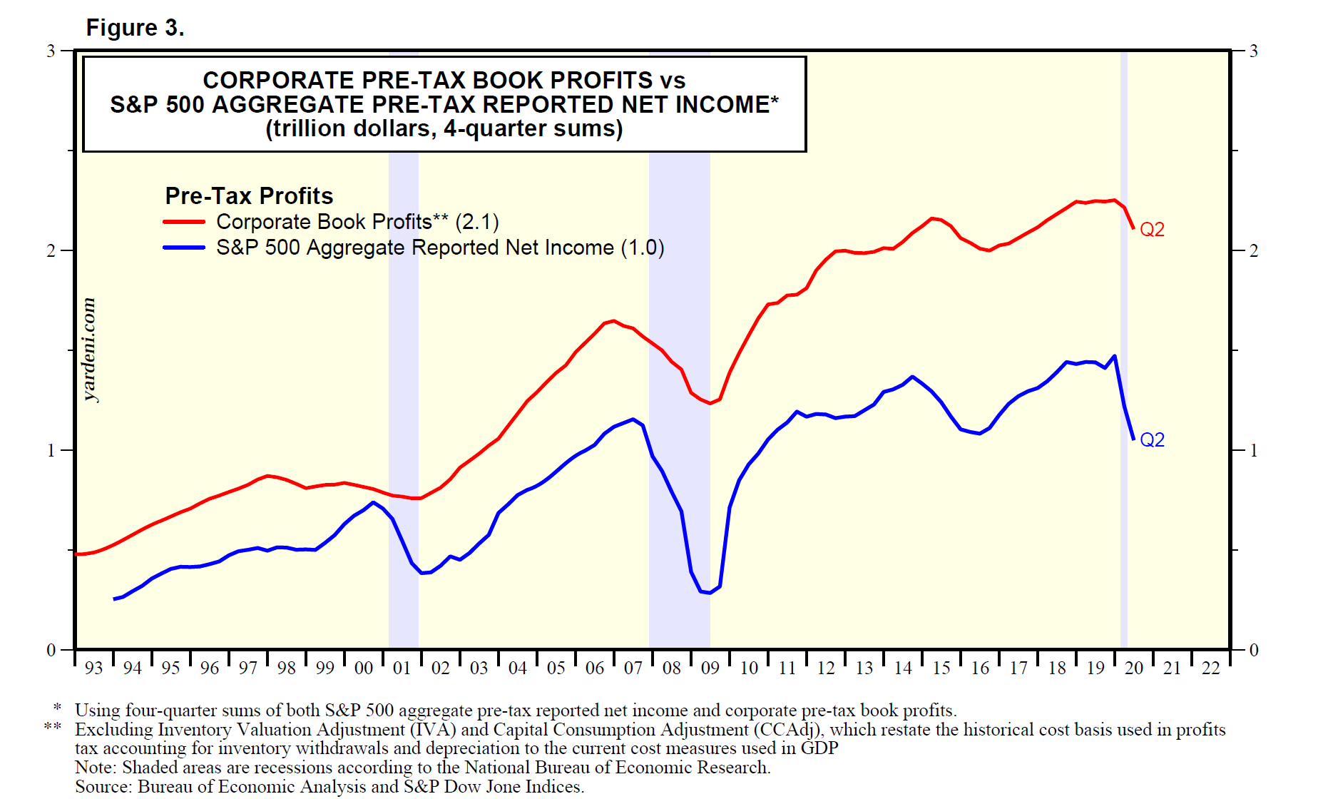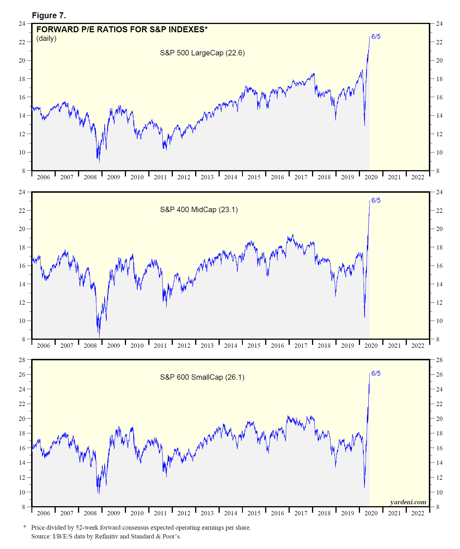 Corporate Finance I: Accounting for Fun & Profits. Yesterday, Joe and I raised our estimates for S&P 500 revenues and earnings per share and profit margins to the following: 2020 ($1,400, $140, 10%), 2021 ($1,545, $170, 11%), and 2022 ($1,625, $195, 12%). As a result, our S&P 500 year-end targets for this year and the next two years are now 3740, 4290, and 4620. (See YRI Earnings Forecasts.)