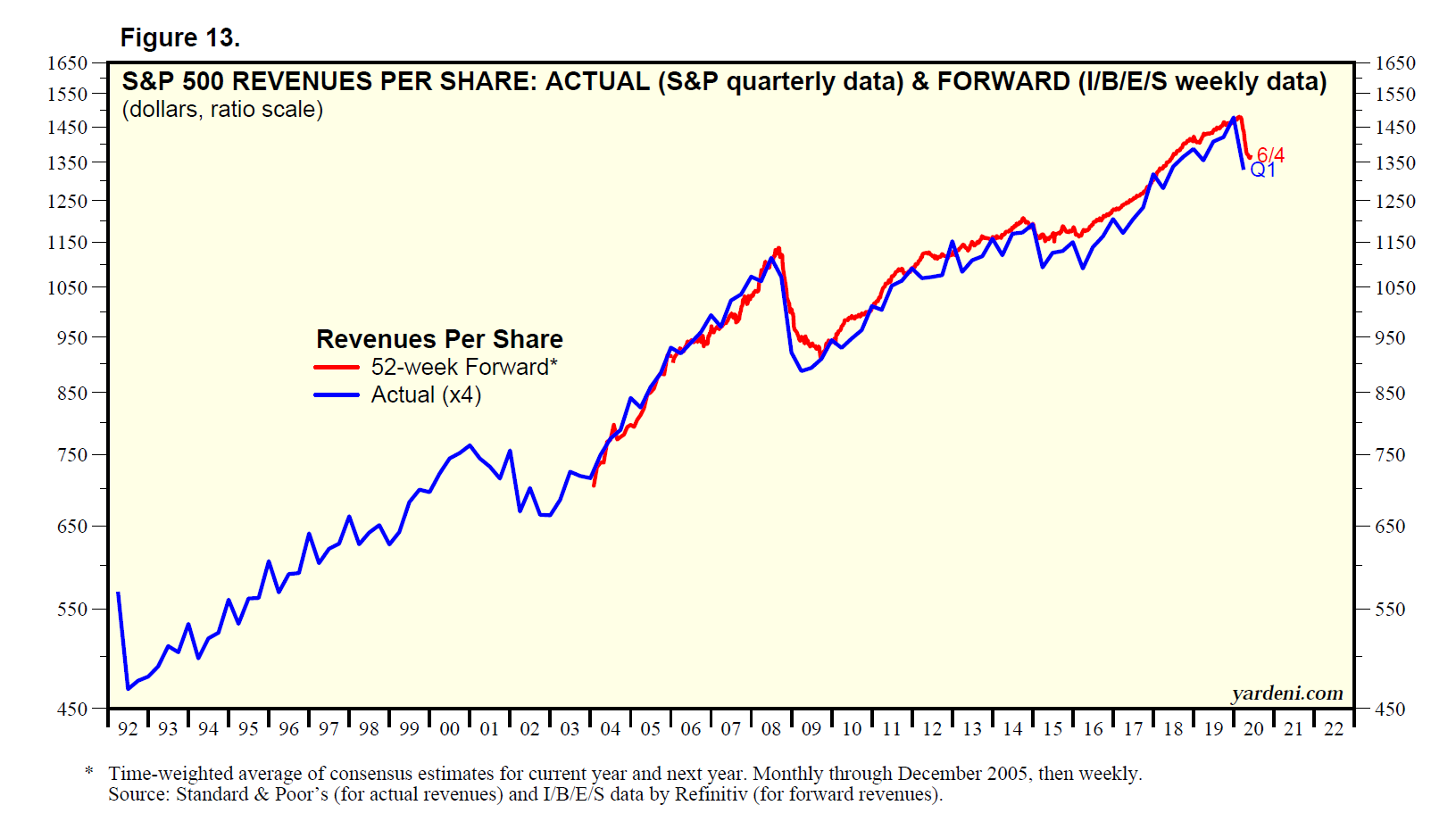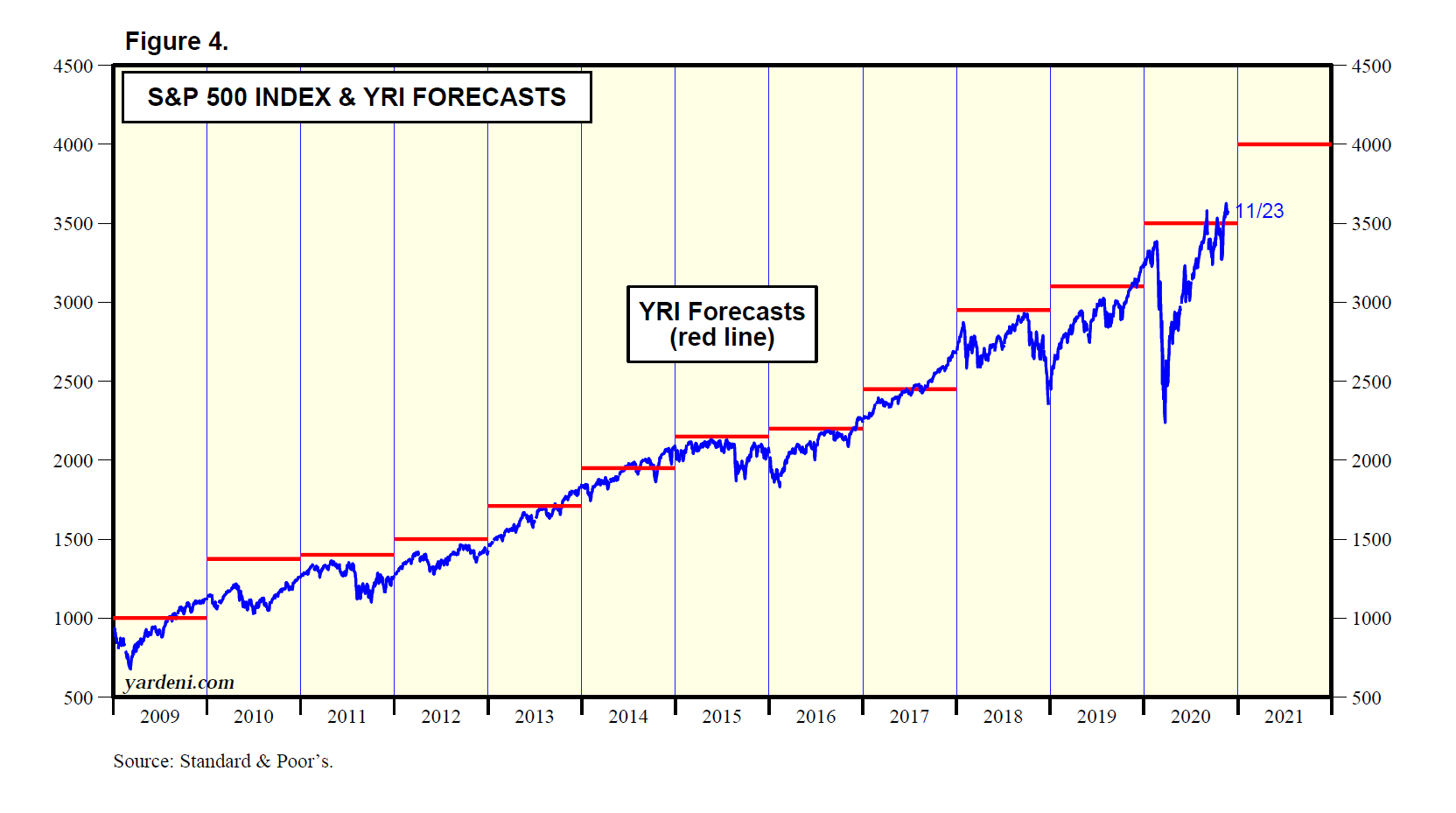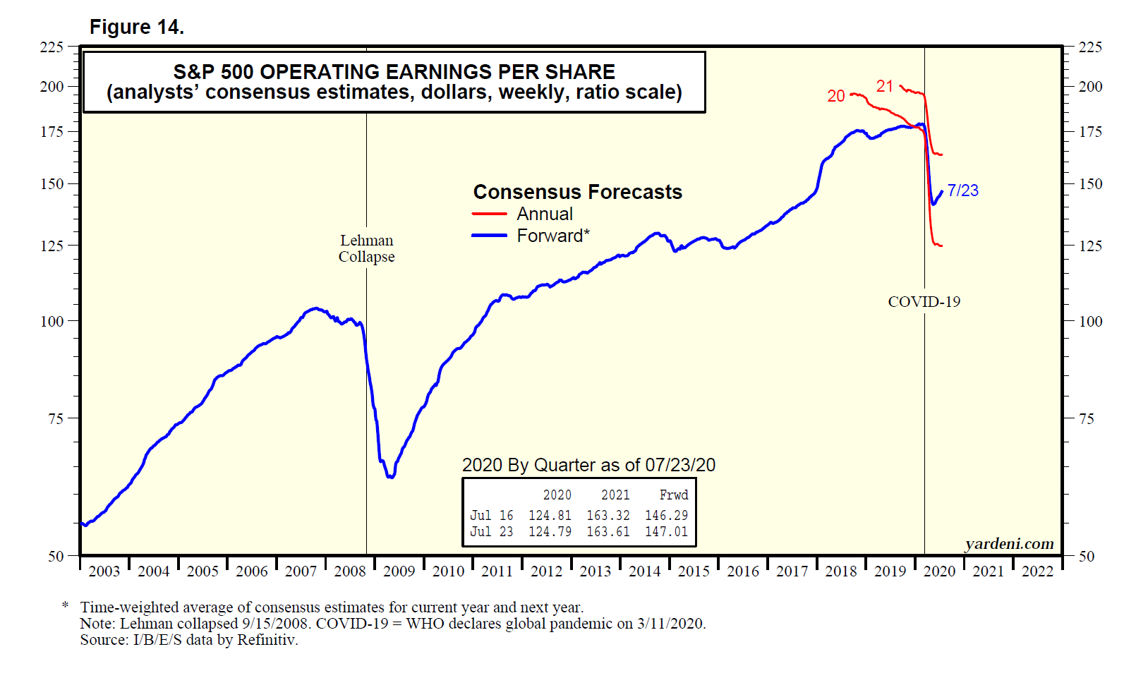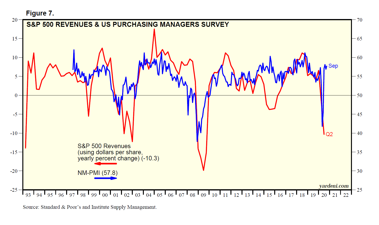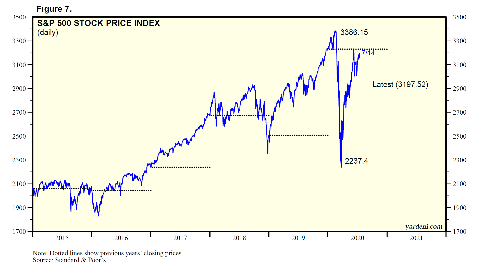 Corporate Finance I: Accounting for Fun & Profits. Yesterday, Joe and I raised our estimates for S&P 500 revenues and earnings per share and profit margins to the following: 2020 ($1,400, $140, 10%), 2021 ($1,545, $170, 11%), and 2022 ($1,625, $195, 12%). As a result, our S&P 500 year-end targets for this year and the next two years are now 3740, 4290, and 4620. (See YRI Earnings Forecasts.)