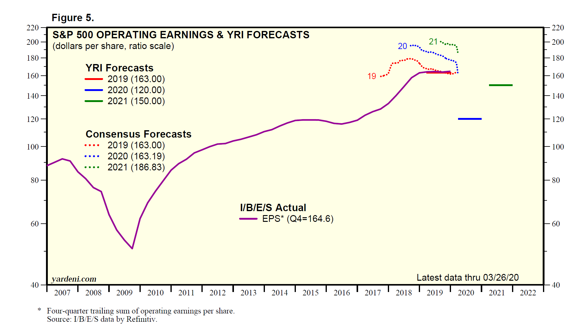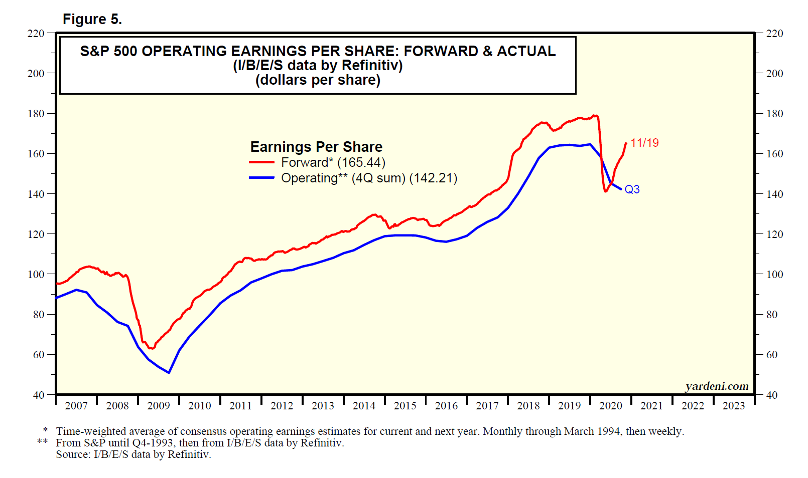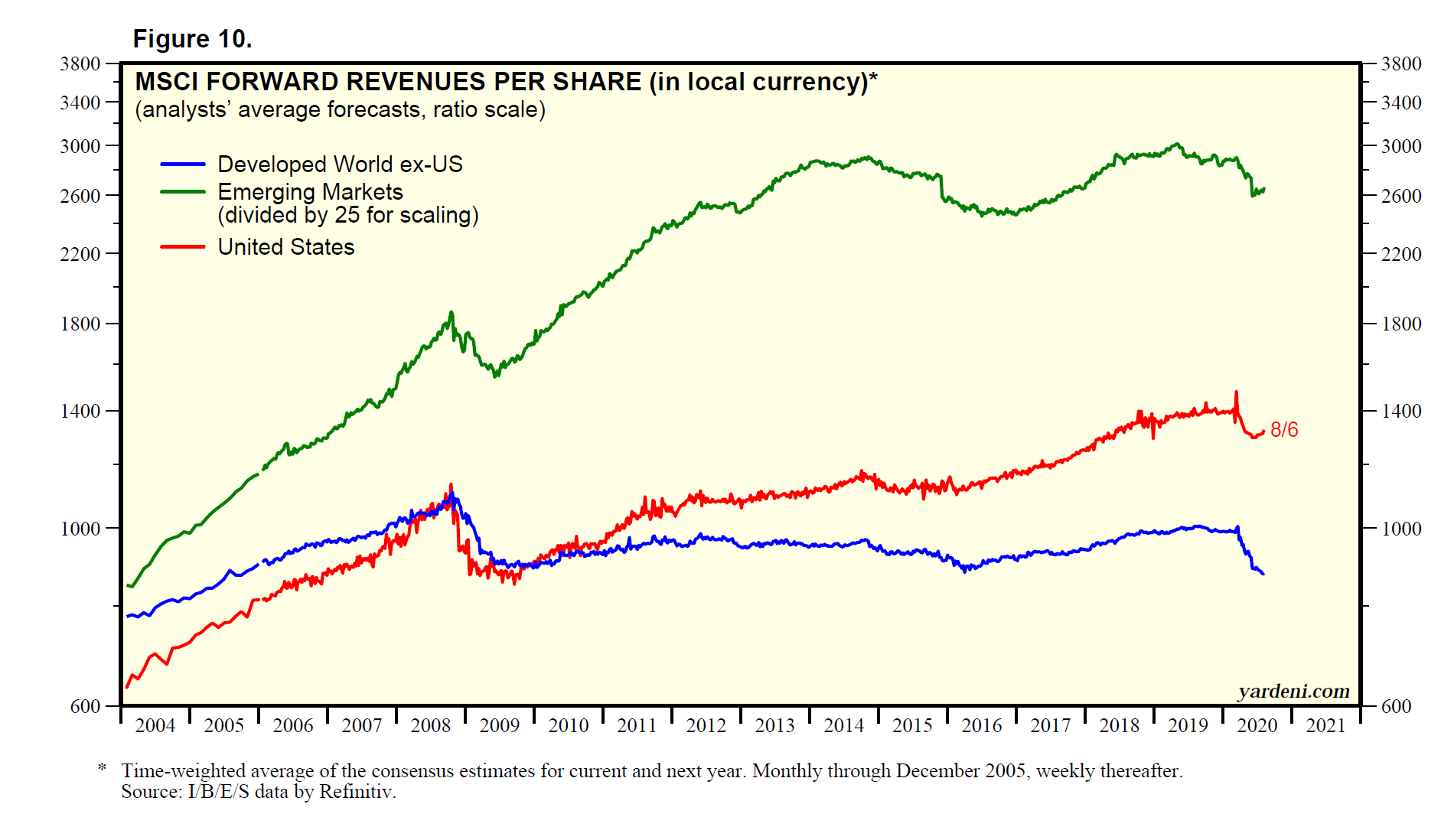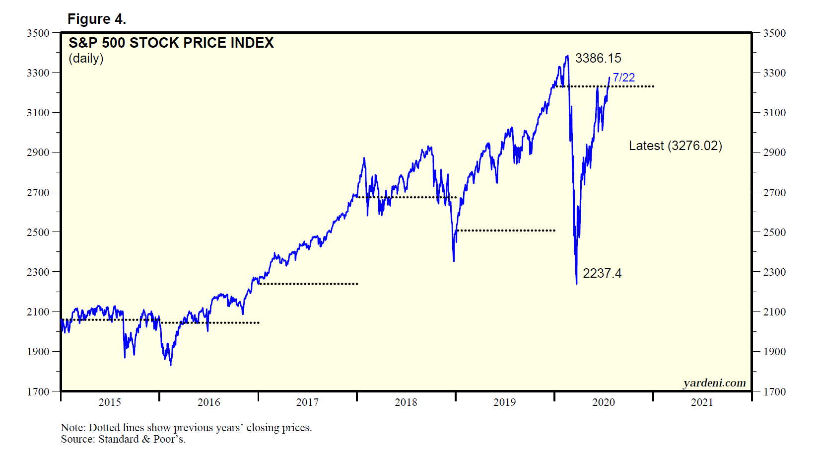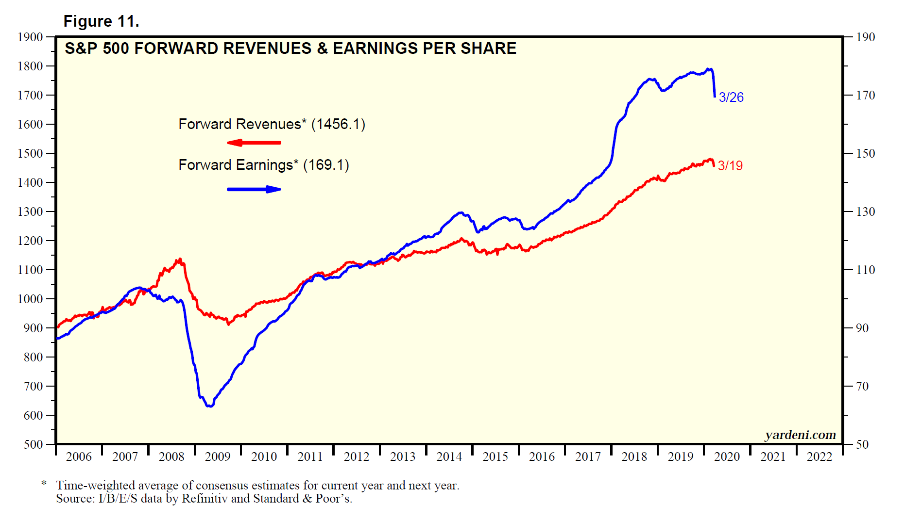 Corporate Finance I: Accounting for Fun & Profits. Yesterday, Joe and I raised our estimates for S&P 500 revenues and earnings per share and profit margins to the following: 2020 ($1,400, $140, 10%), 2021 ($1,545, $170, 11%), and 2022 ($1,625, $195, 12%). As a result, our S&P 500 year-end targets for this year and the next two years are now 3740, 4290, and 4620. (See YRI Earnings Forecasts.)