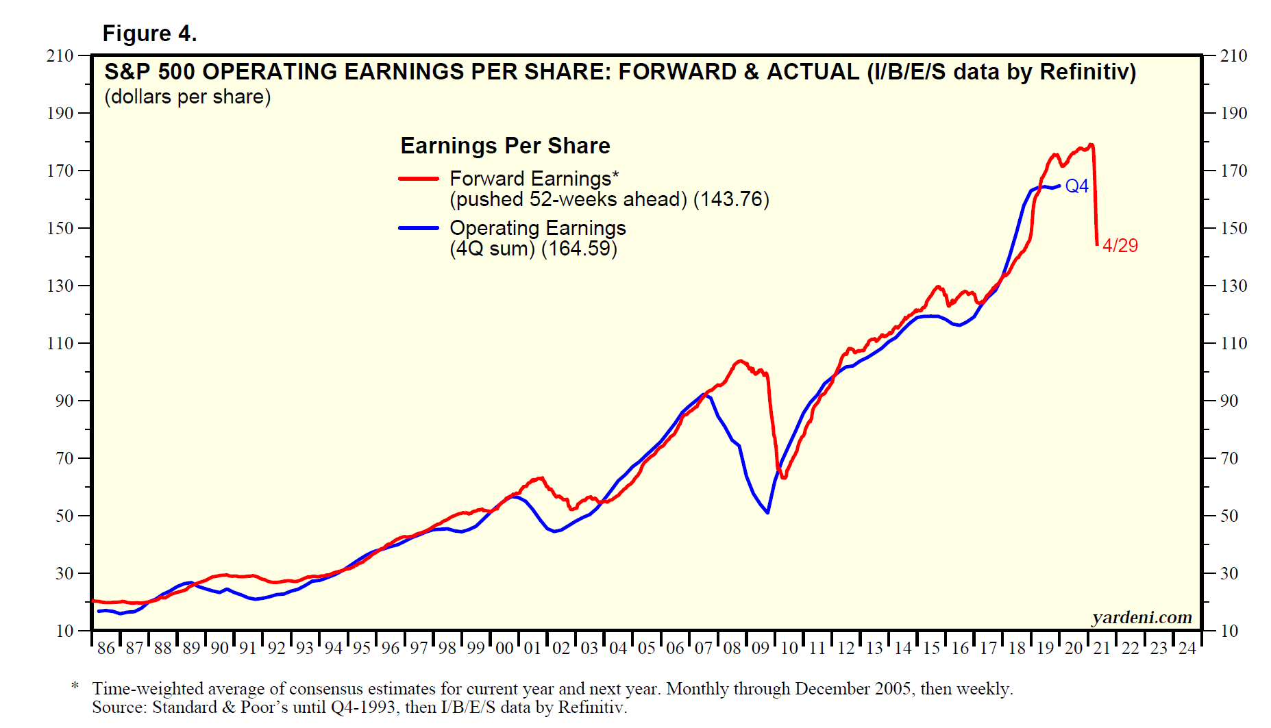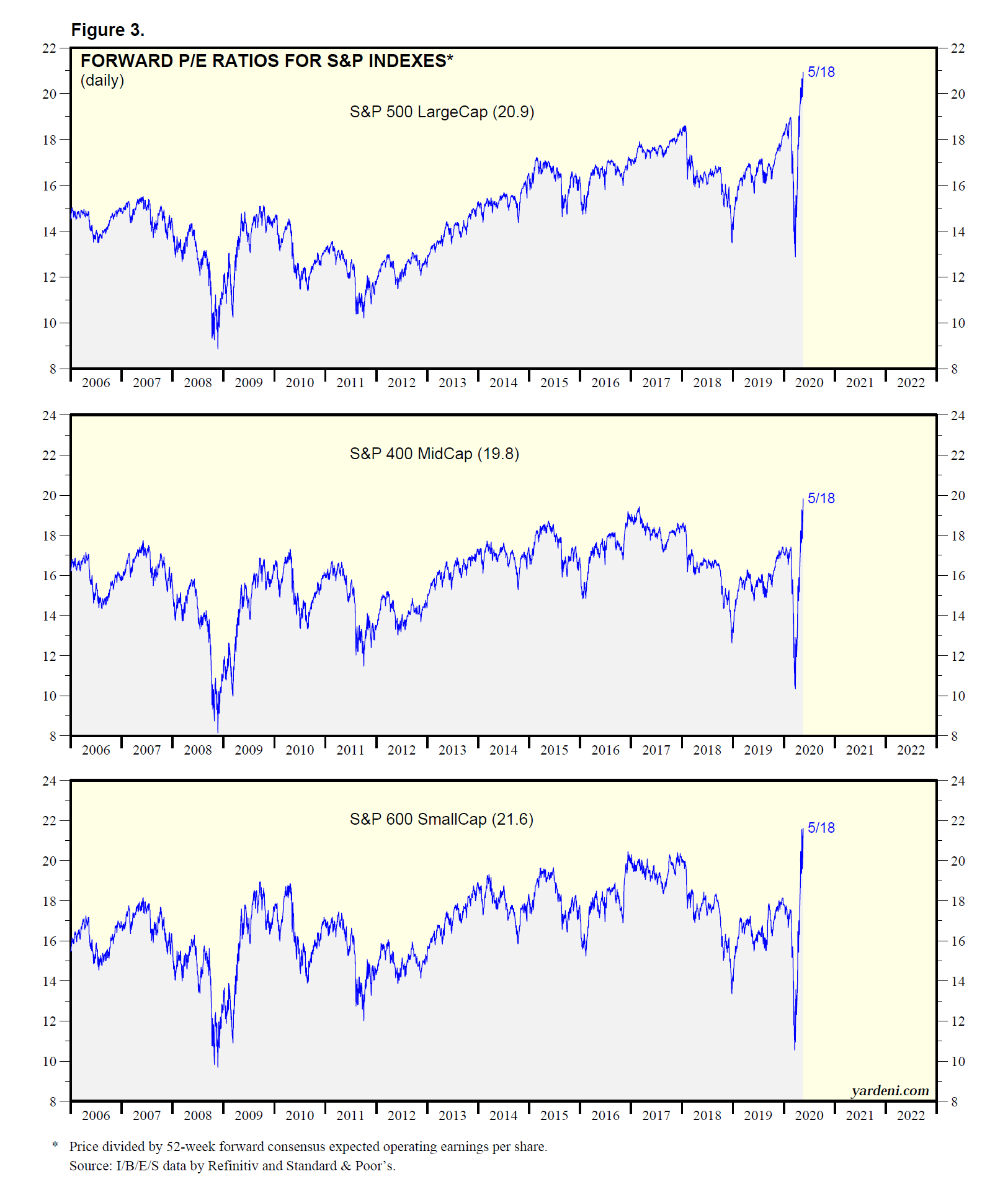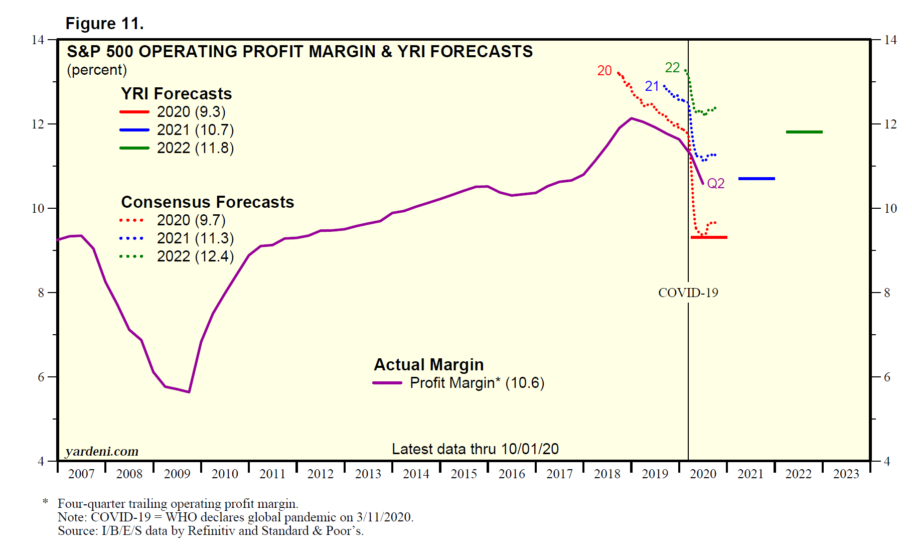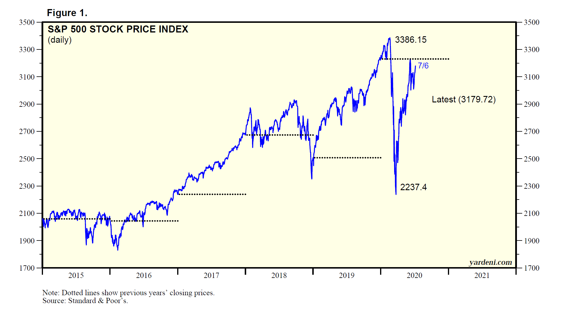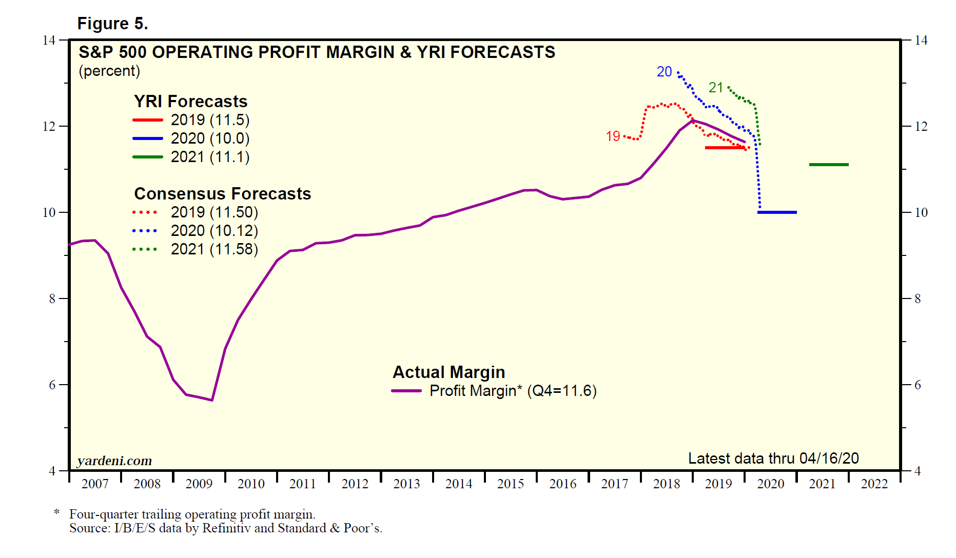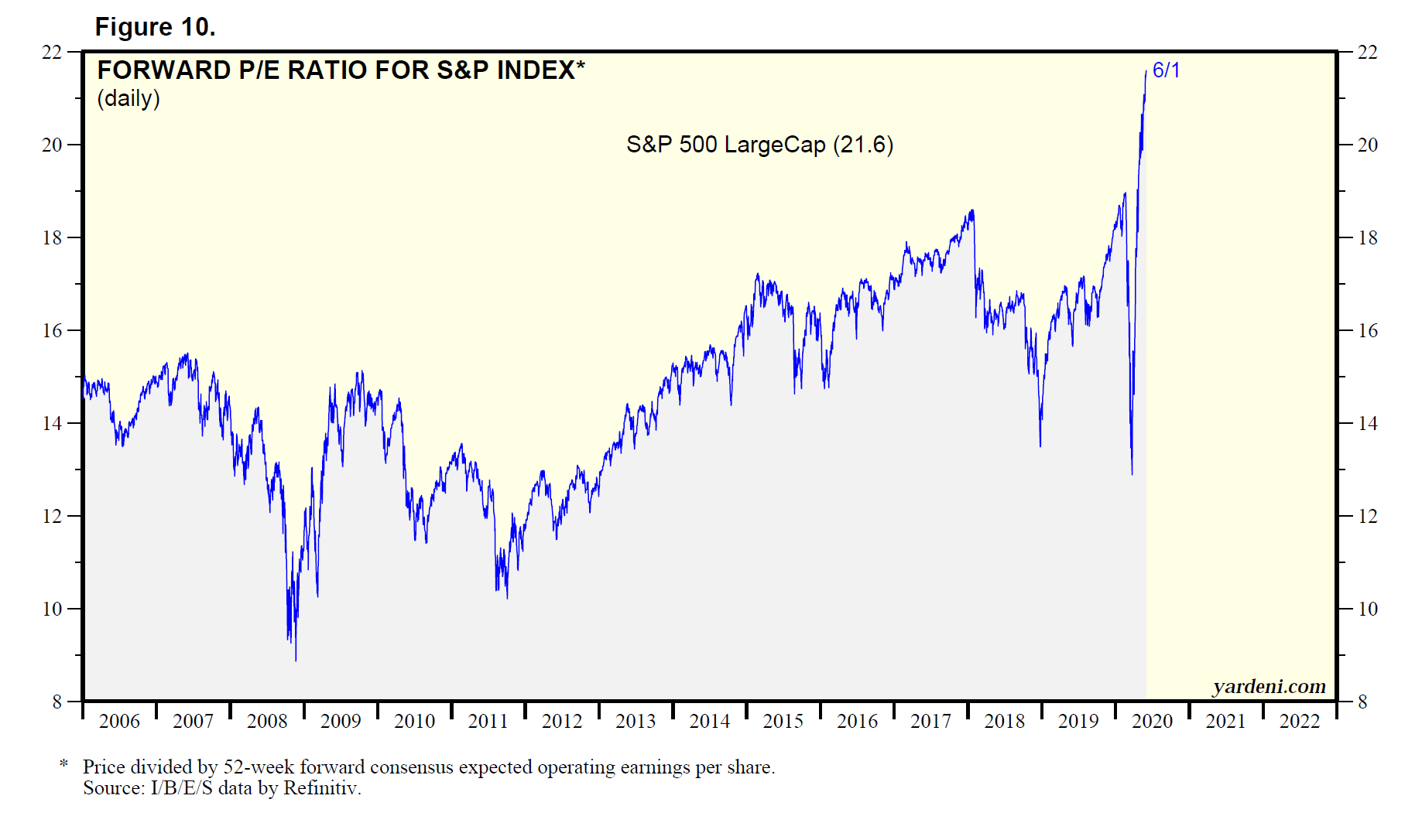 Corporate Finance I: Accounting for Fun & Profits. Yesterday, Joe and I raised our estimates for S&P 500 revenues and earnings per share and profit margins to the following: 2020 ($1,400, $140, 10%), 2021 ($1,545, $170, 11%), and 2022 ($1,625, $195, 12%). As a result, our S&P 500 year-end targets for this year and the next two years are now 3740, 4290, and 4620. (See YRI Earnings Forecasts.)