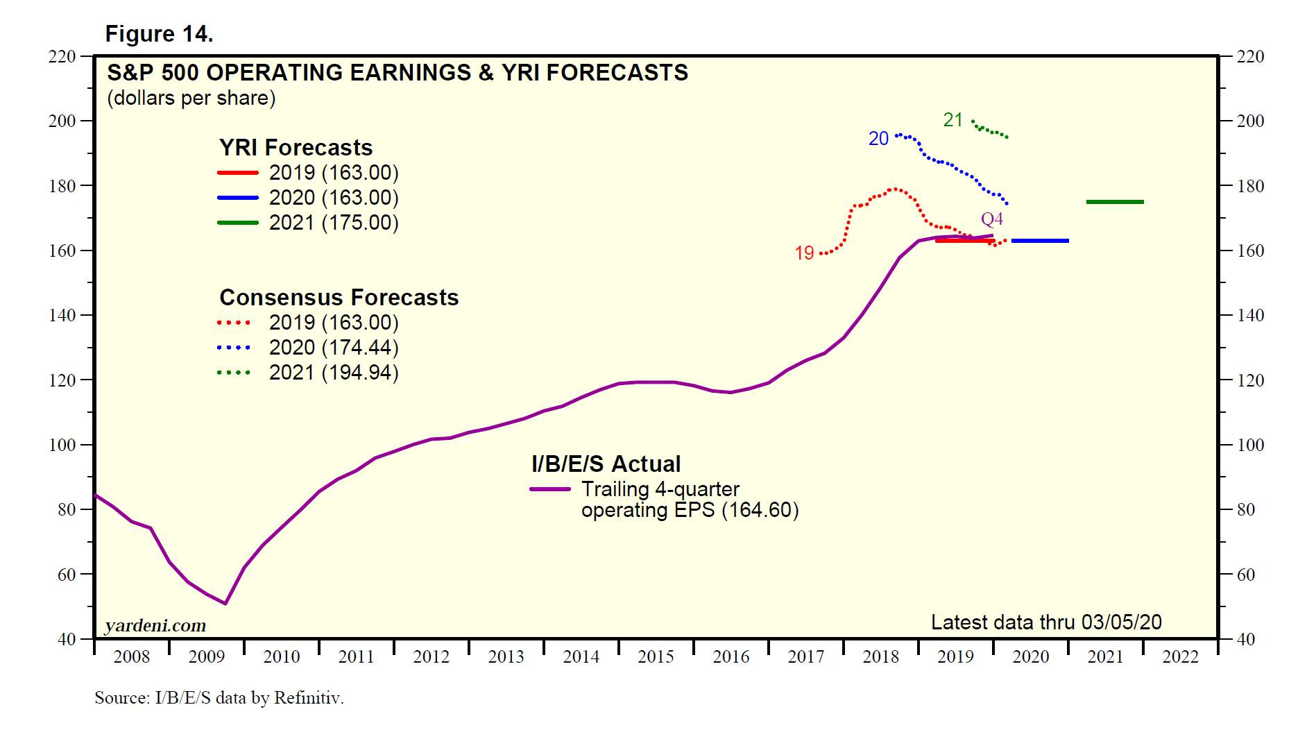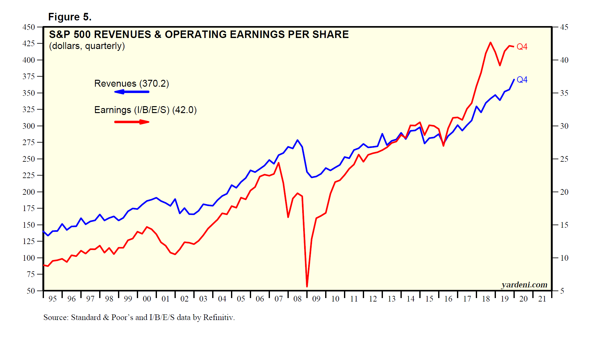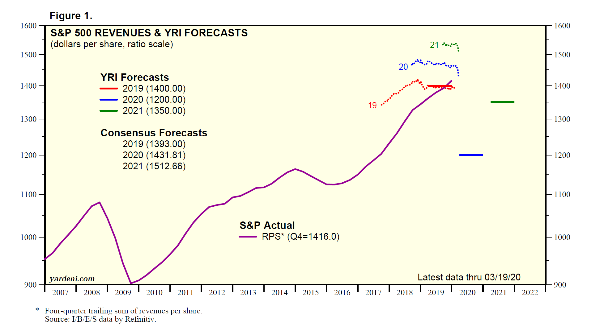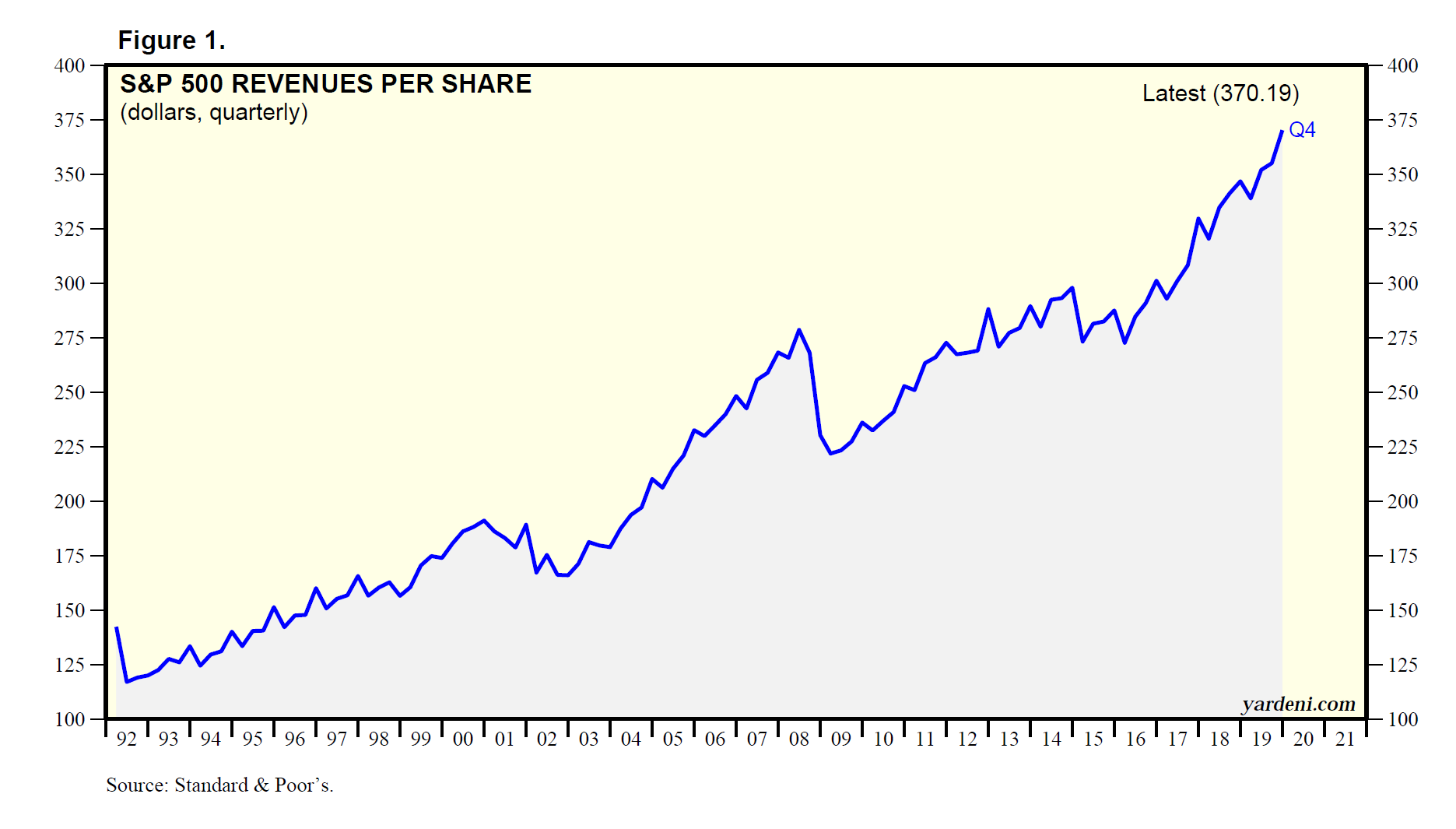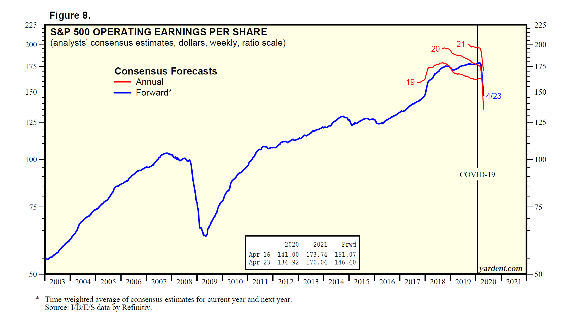 Corporate Finance I: Accounting for Fun & Profits. Yesterday, Joe and I raised our estimates for S&P 500 revenues and earnings per share and profit margins to the following: 2020 ($1,400, $140, 10%), 2021 ($1,545, $170, 11%), and 2022 ($1,625, $195, 12%). As a result, our S&P 500 year-end targets for this year and the next two years are now 3740, 4290, and 4620. (See YRI Earnings Forecasts.)