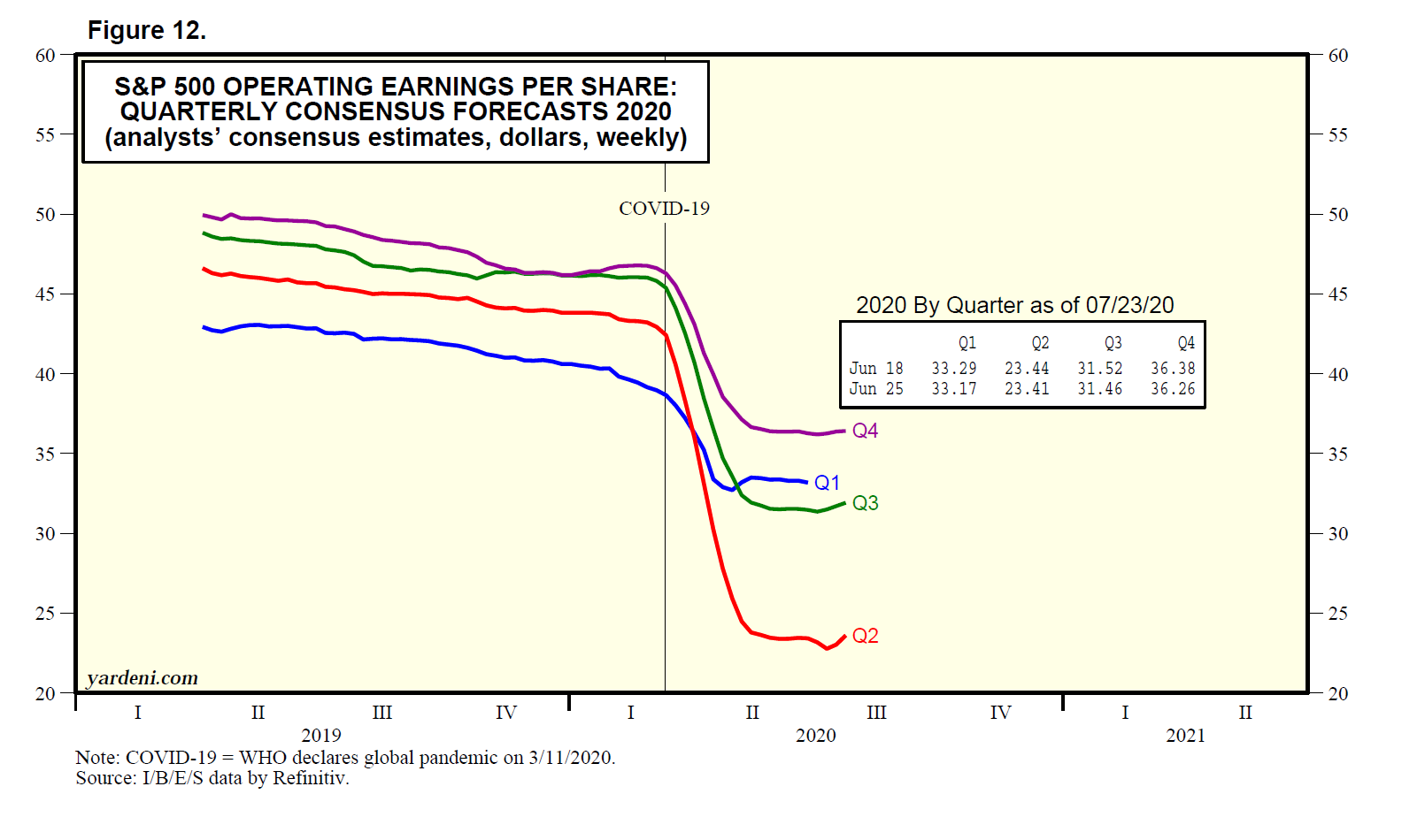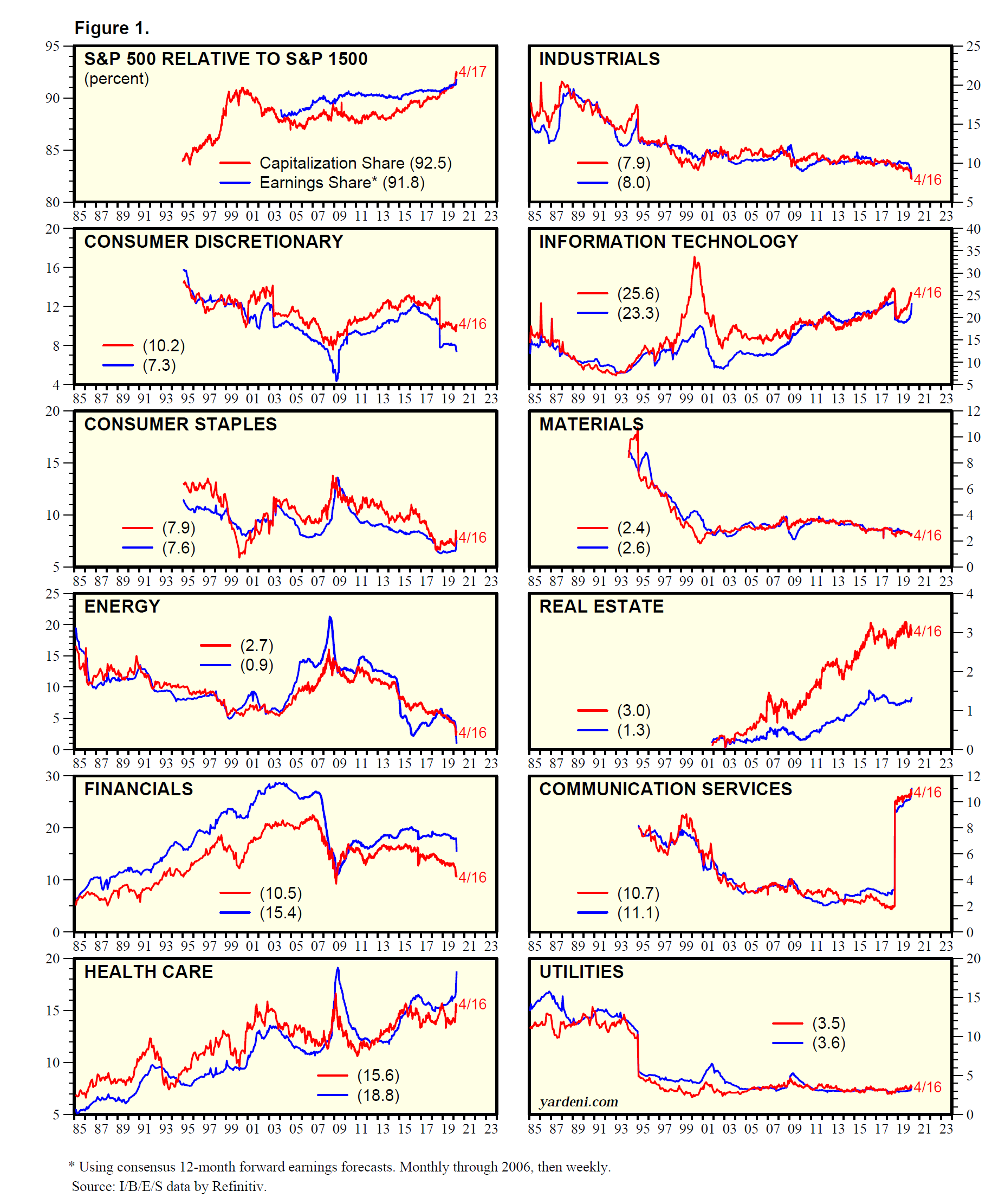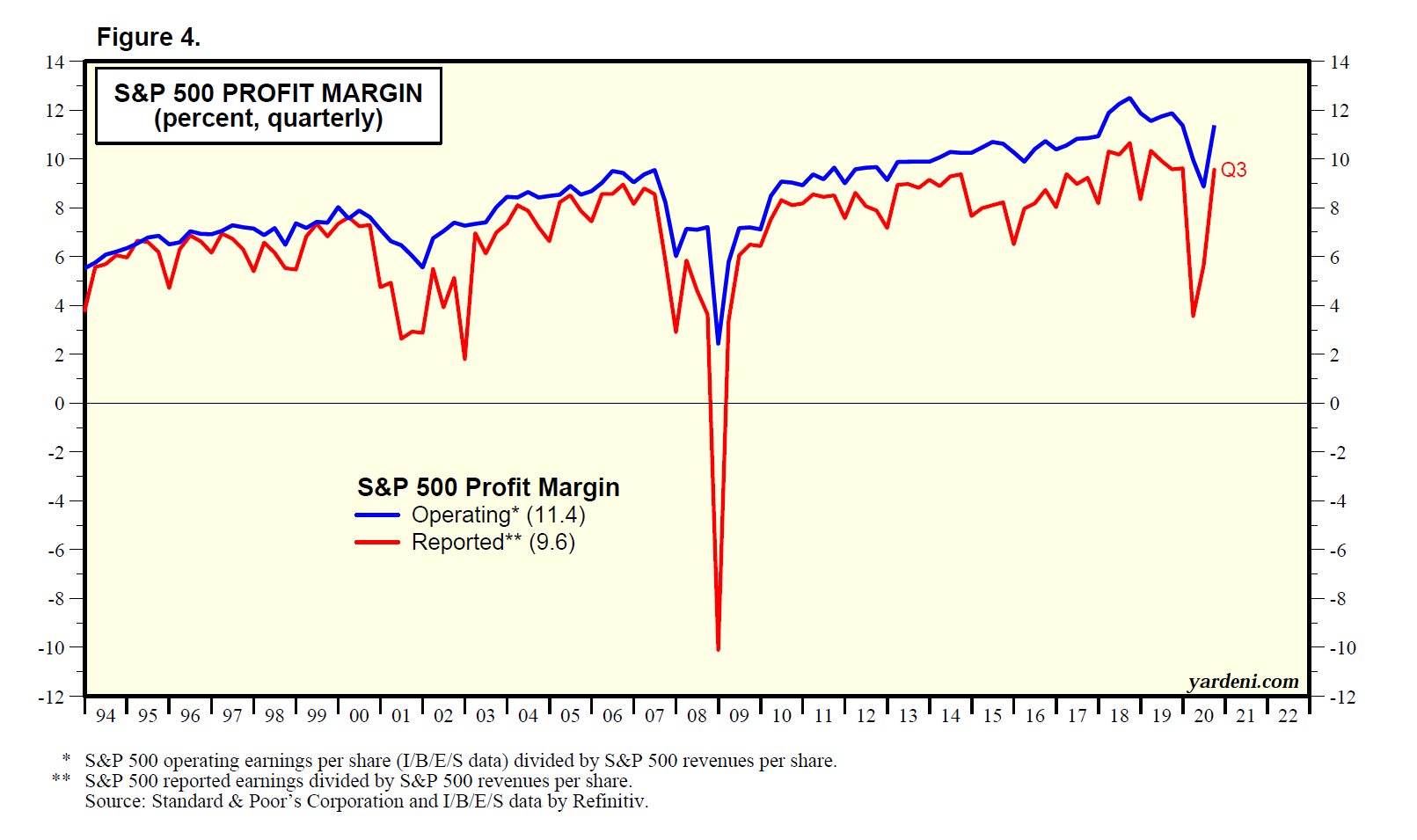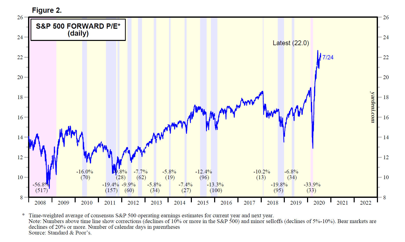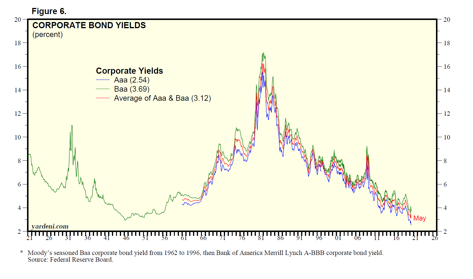 Corporate Finance I: Accounting for Fun & Profits. Yesterday, Joe and I raised our estimates for S&P 500 revenues and earnings per share and profit margins to the following: 2020 ($1,400, $140, 10%), 2021 ($1,545, $170, 11%), and 2022 ($1,625, $195, 12%). As a result, our S&P 500 year-end targets for this year and the next two years are now 3740, 4290, and 4620. (See YRI Earnings Forecasts.)