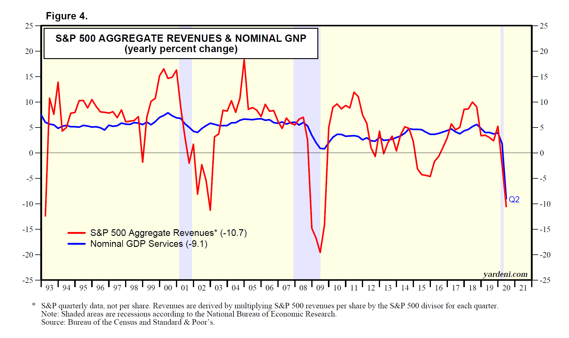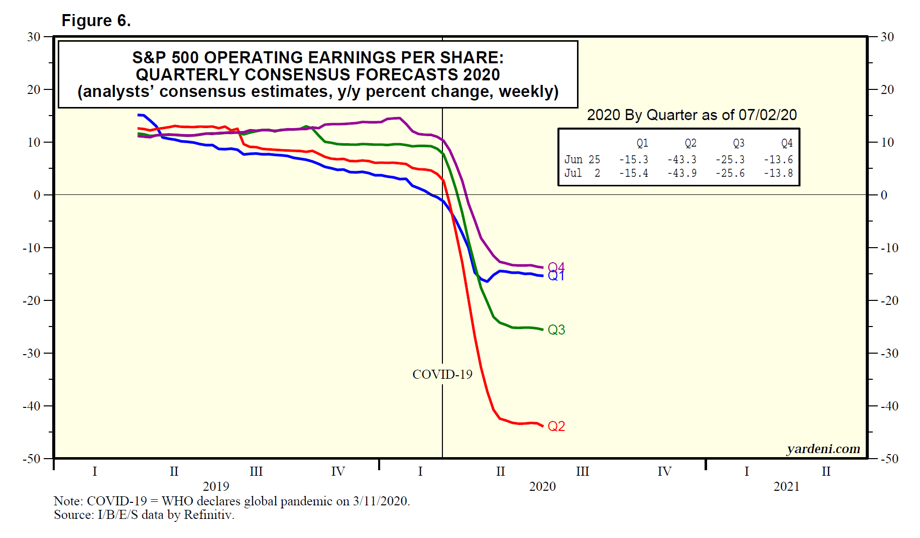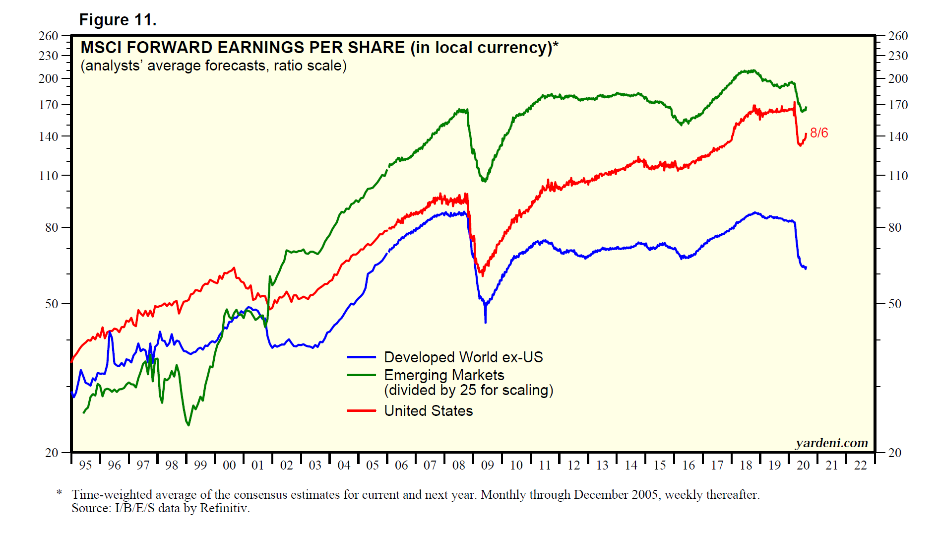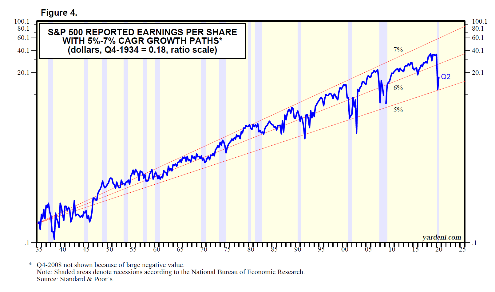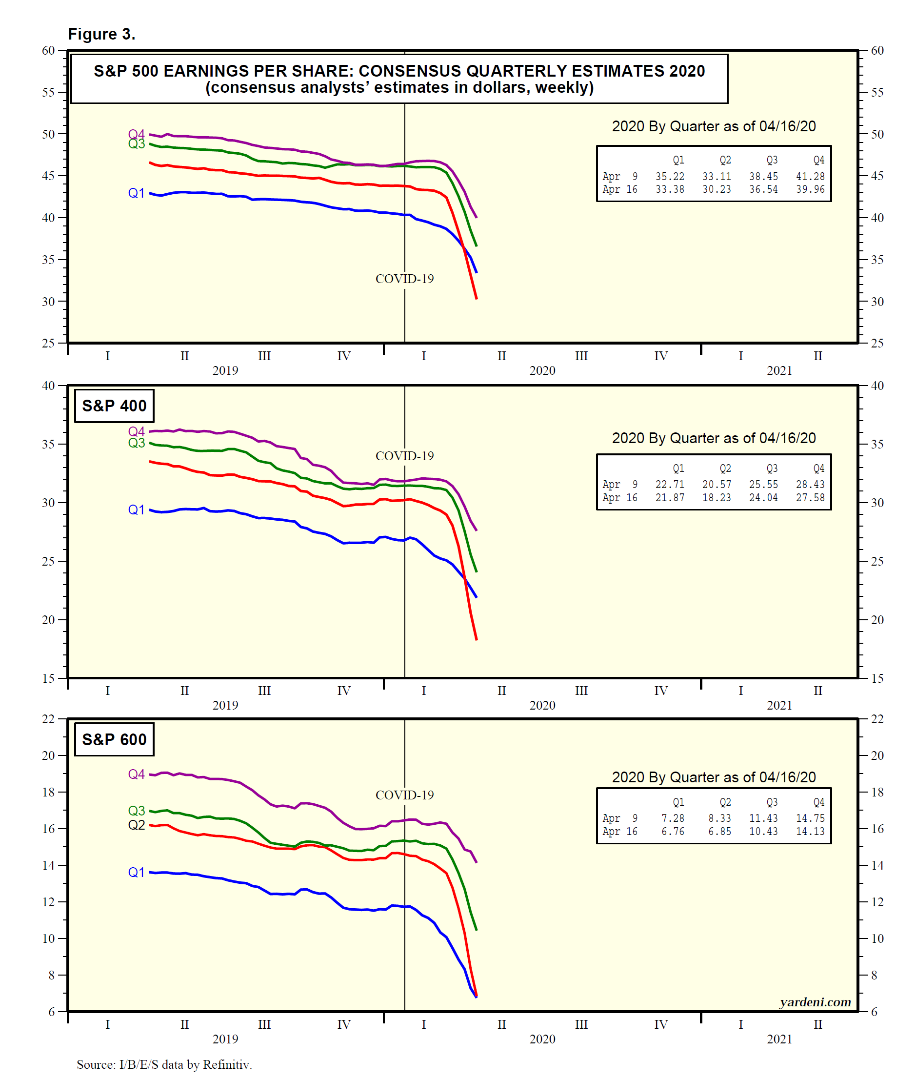 Corporate Finance I: Accounting for Fun & Profits. Yesterday, Joe and I raised our estimates for S&P 500 revenues and earnings per share and profit margins to the following: 2020 ($1,400, $140, 10%), 2021 ($1,545, $170, 11%), and 2022 ($1,625, $195, 12%). As a result, our S&P 500 year-end targets for this year and the next two years are now 3740, 4290, and 4620. (See YRI Earnings Forecasts.)
