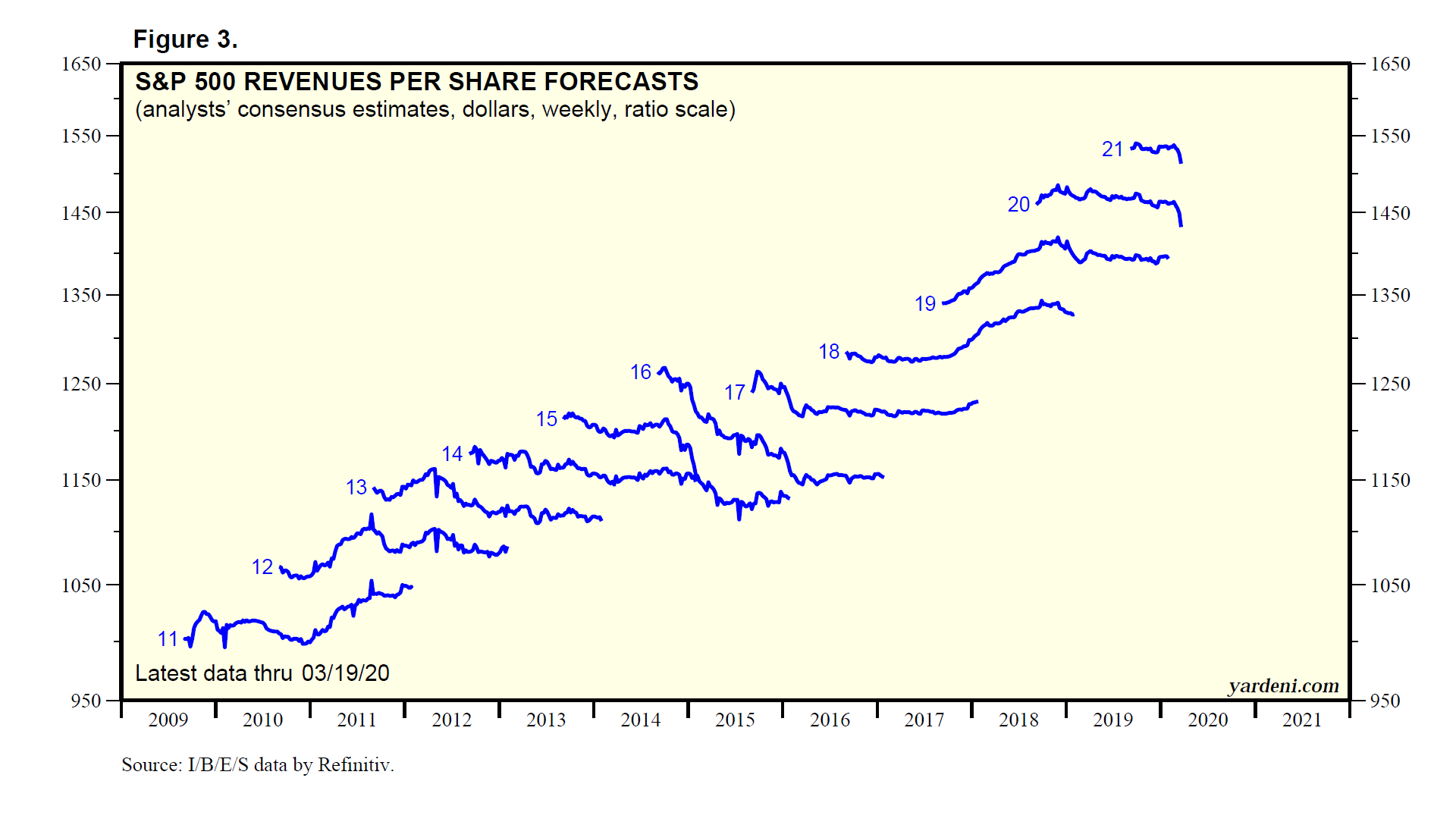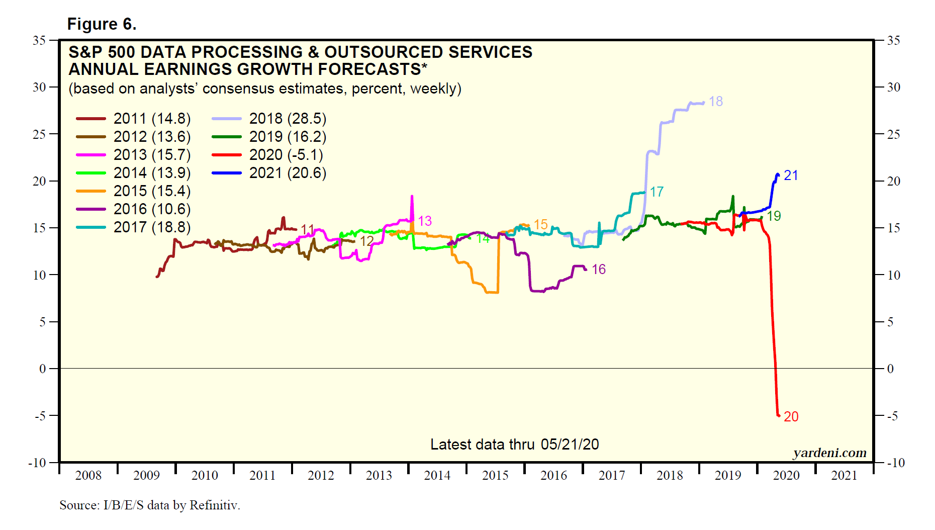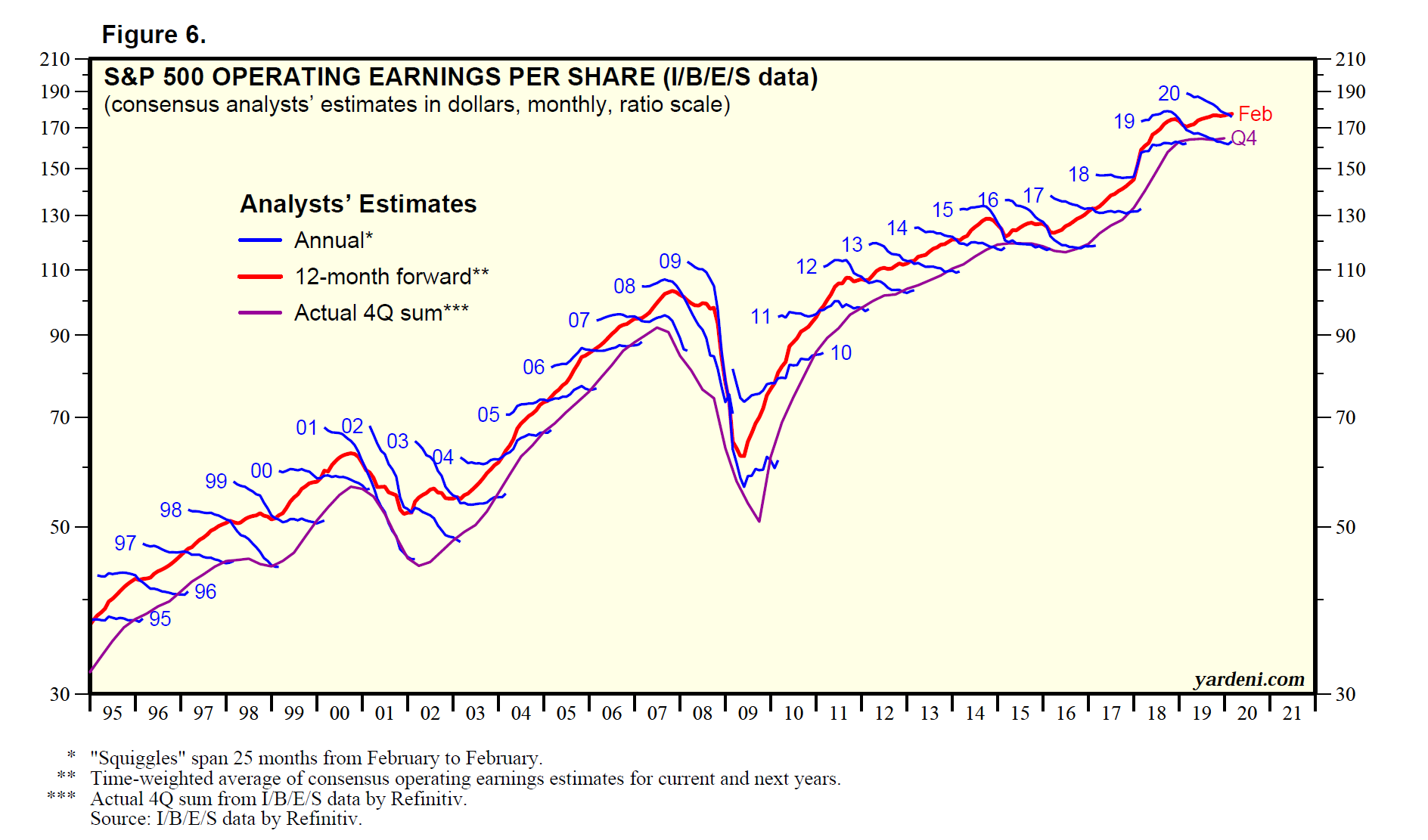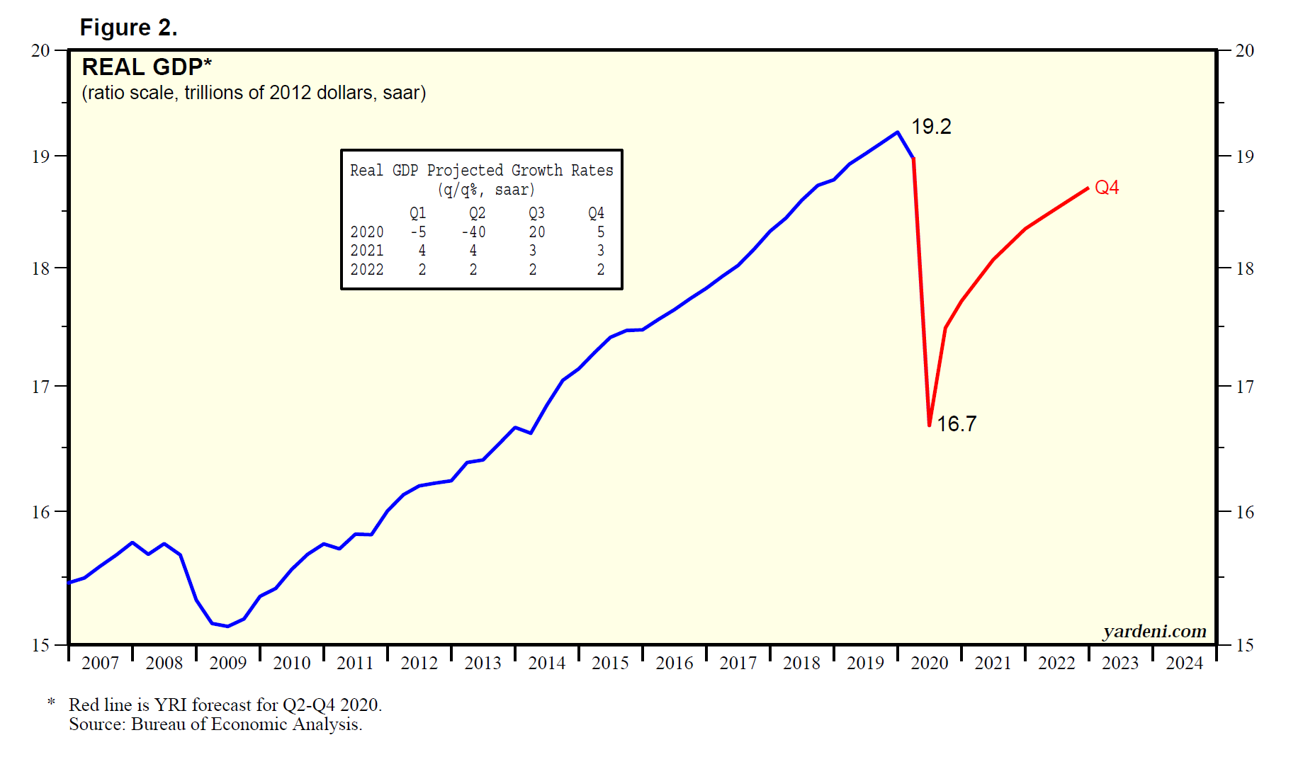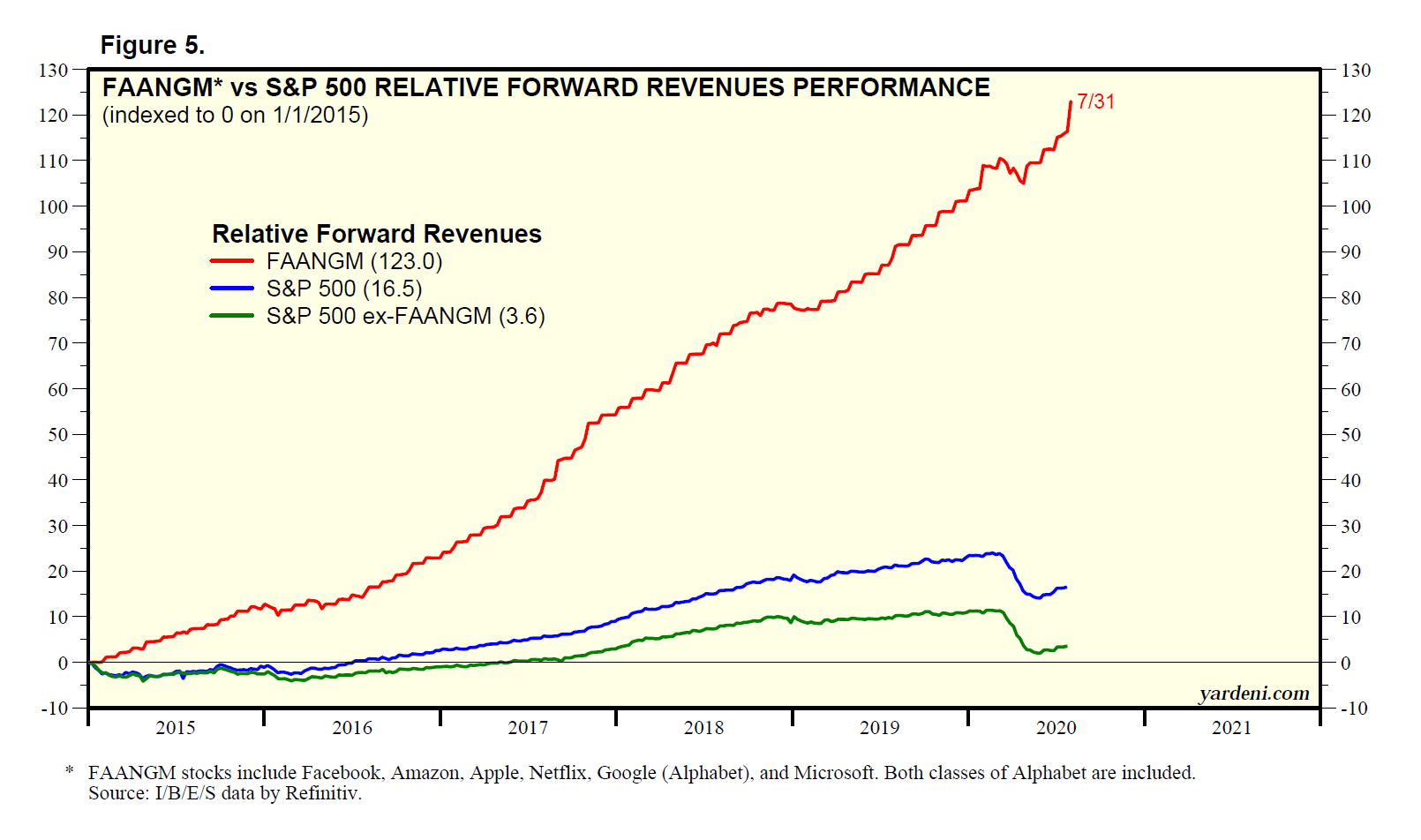 Corporate Finance I: Accounting for Fun & Profits. Yesterday, Joe and I raised our estimates for S&P 500 revenues and earnings per share and profit margins to the following: 2020 ($1,400, $140, 10%), 2021 ($1,545, $170, 11%), and 2022 ($1,625, $195, 12%). As a result, our S&P 500 year-end targets for this year and the next two years are now 3740, 4290, and 4620. (See YRI Earnings Forecasts.)