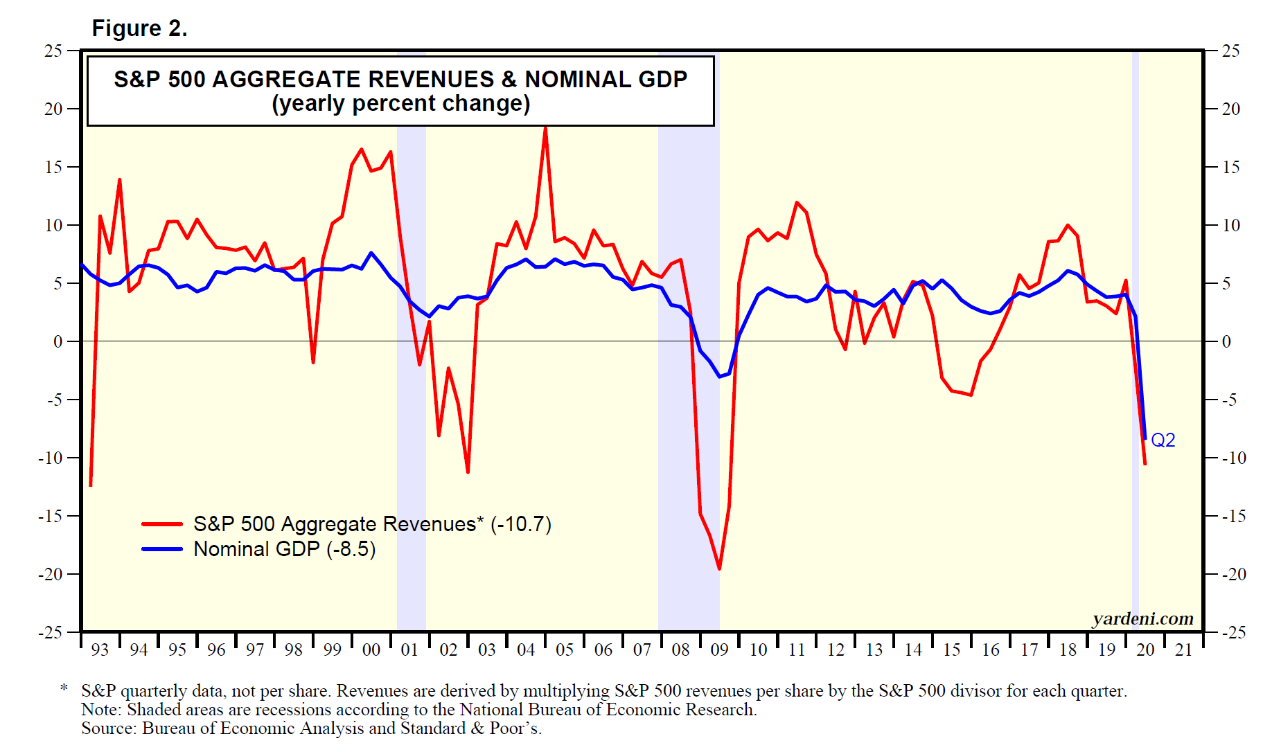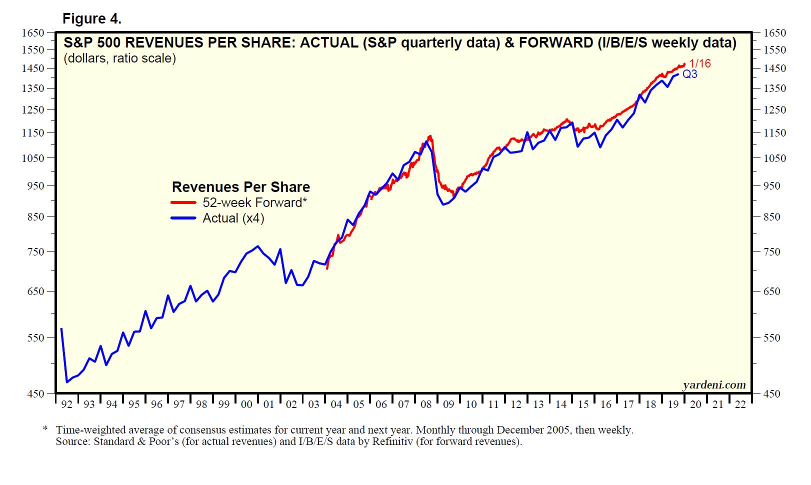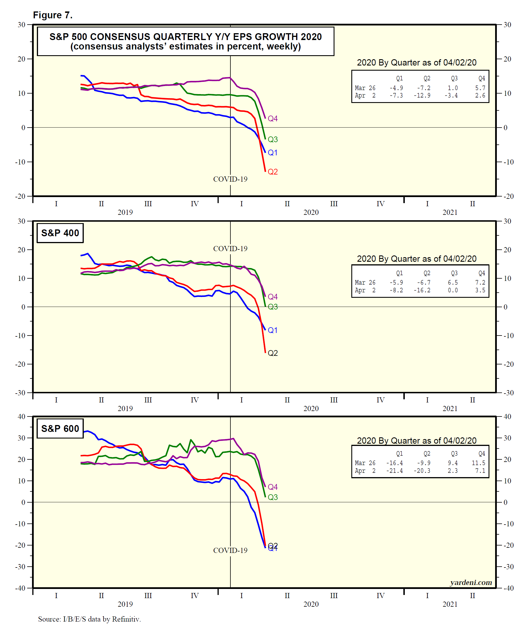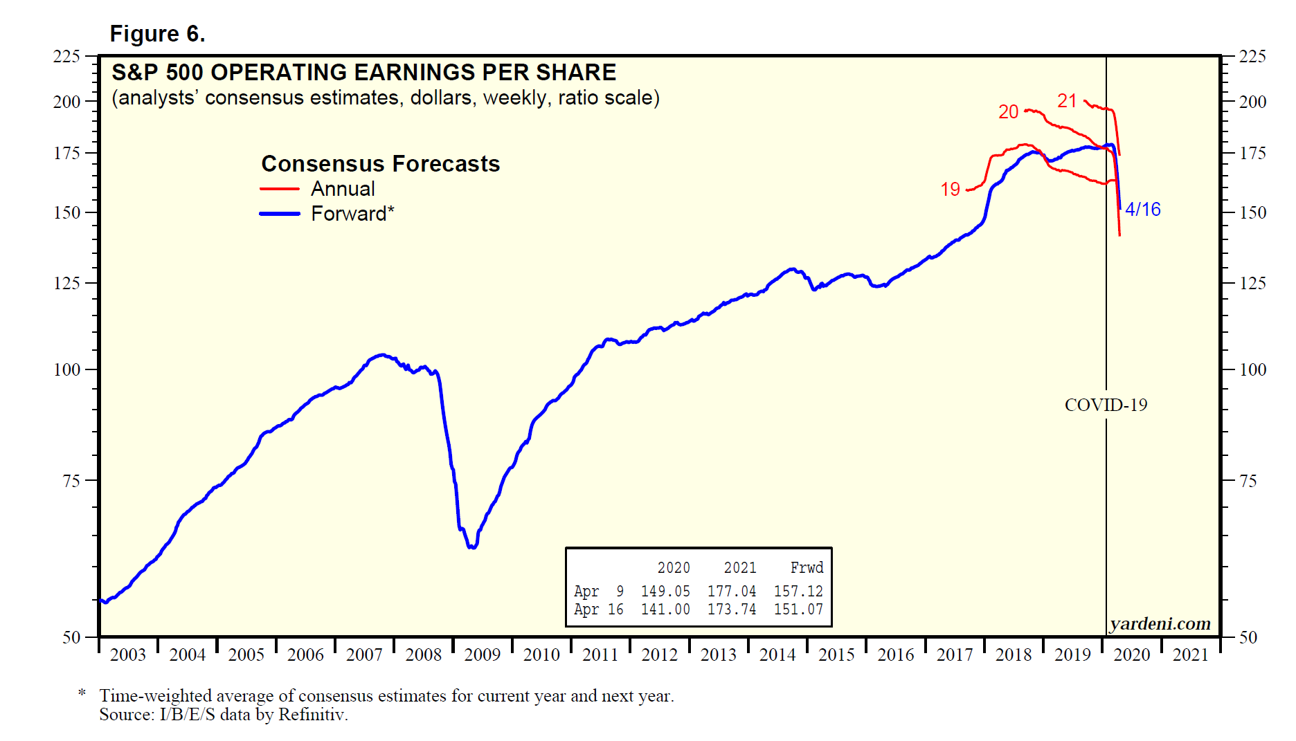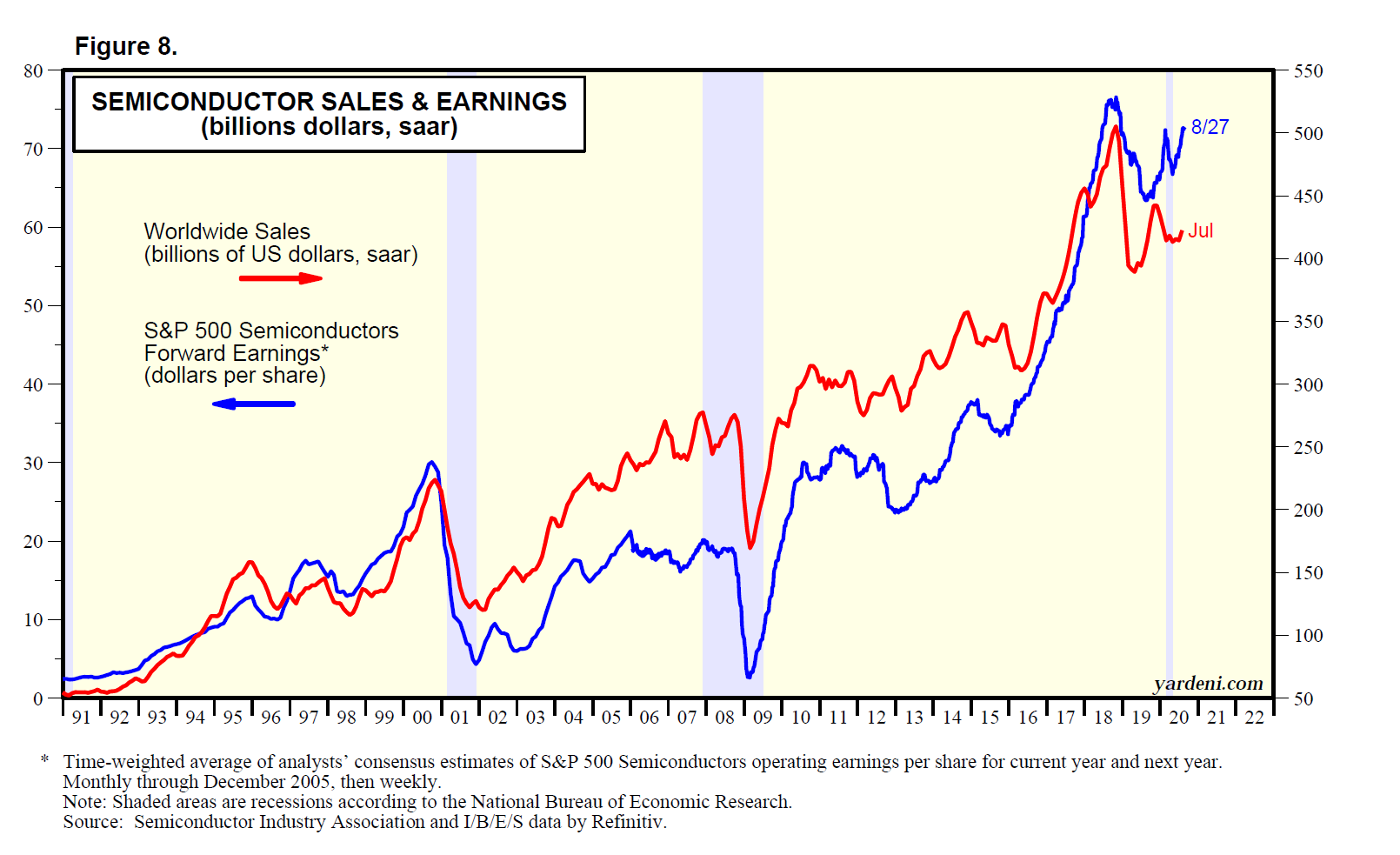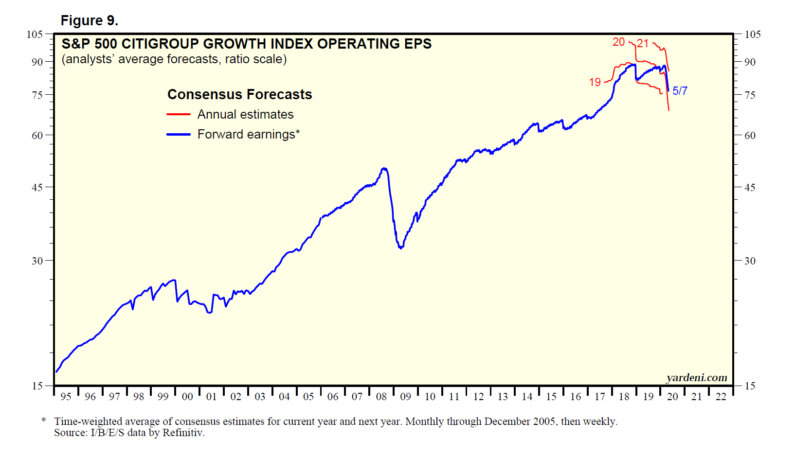 Corporate Finance I: Accounting for Fun & Profits. Yesterday, Joe and I raised our estimates for S&P 500 revenues and earnings per share and profit margins to the following: 2020 ($1,400, $140, 10%), 2021 ($1,545, $170, 11%), and 2022 ($1,625, $195, 12%). As a result, our S&P 500 year-end targets for this year and the next two years are now 3740, 4290, and 4620. (See YRI Earnings Forecasts.)