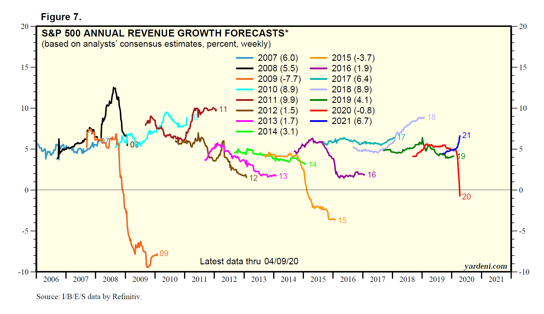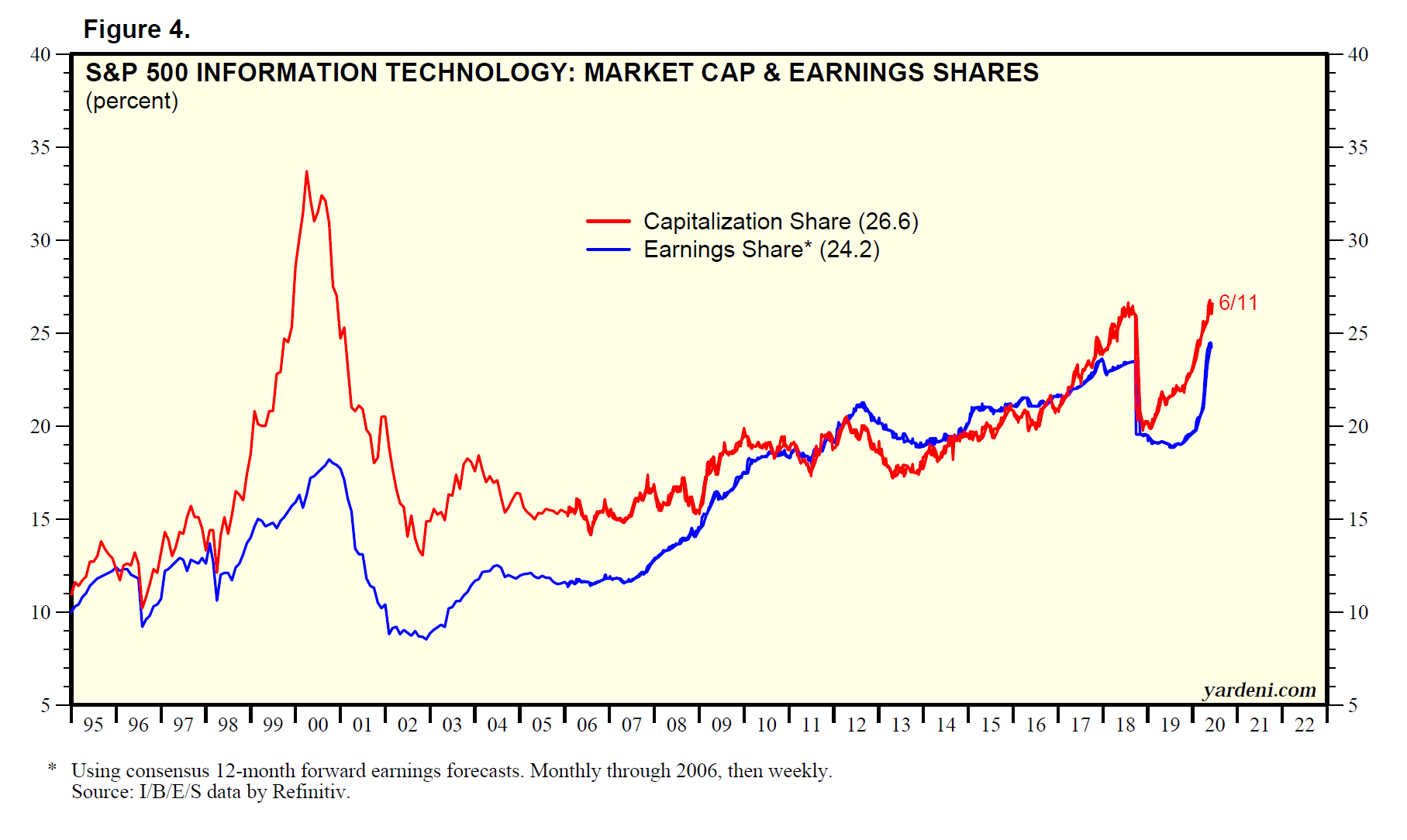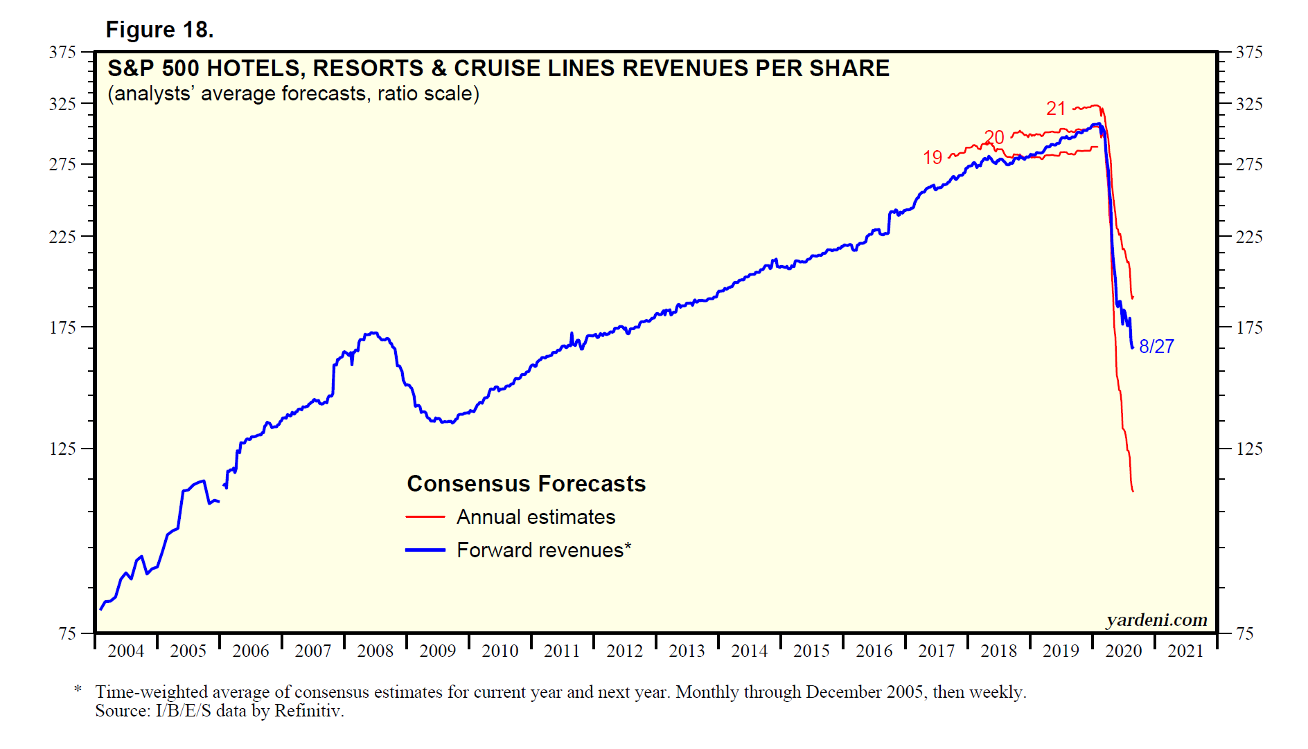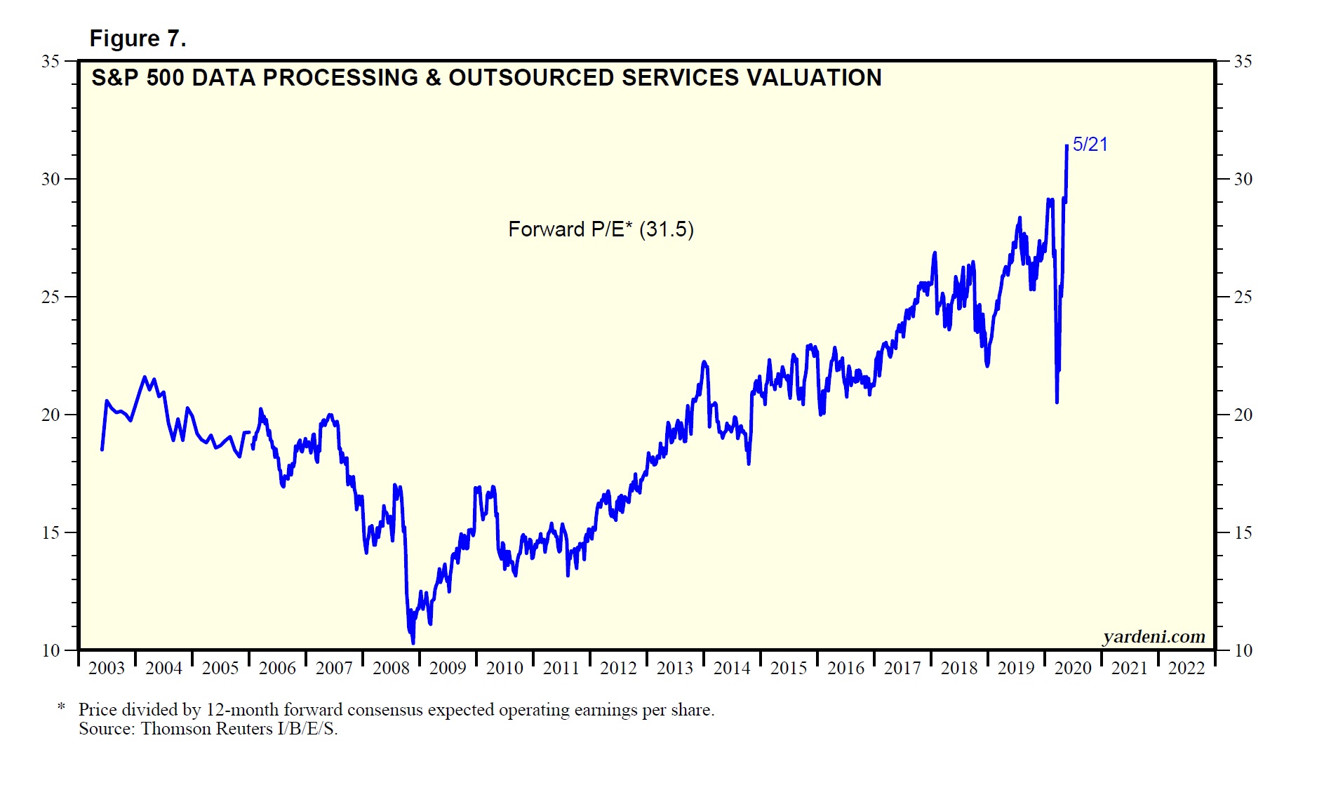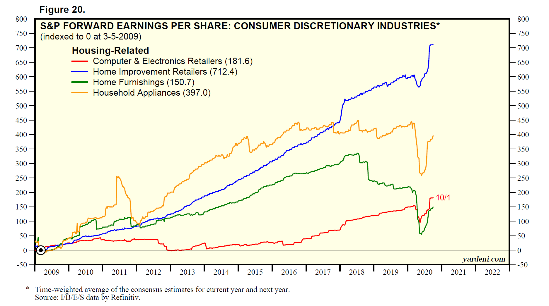Corporate Finance I: Accounting for Fun & Profits. Yesterday, Joe and I raised our estimates for S&P 500 revenues and earnings per share and profit margins to the following: 2020 ($1,400, $140, 10%), 2021 ($1,545, $170, 11%), and 2022 ($1,625, $195, 12%). As a result, our S&P 500 year-end targets for this year and the next two years are now 3740, 4290, and 4620. (See YRI Earnings Forecasts.)