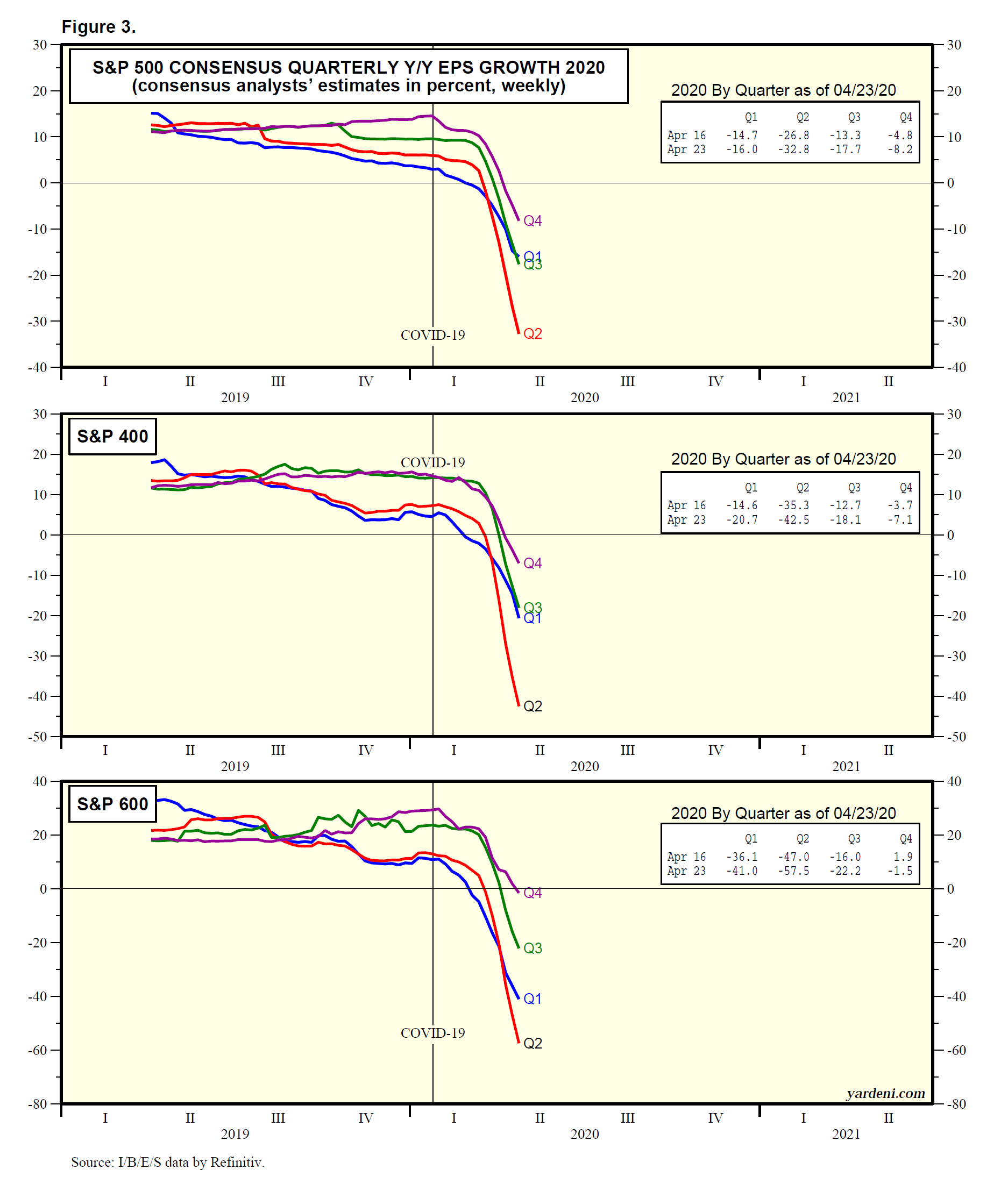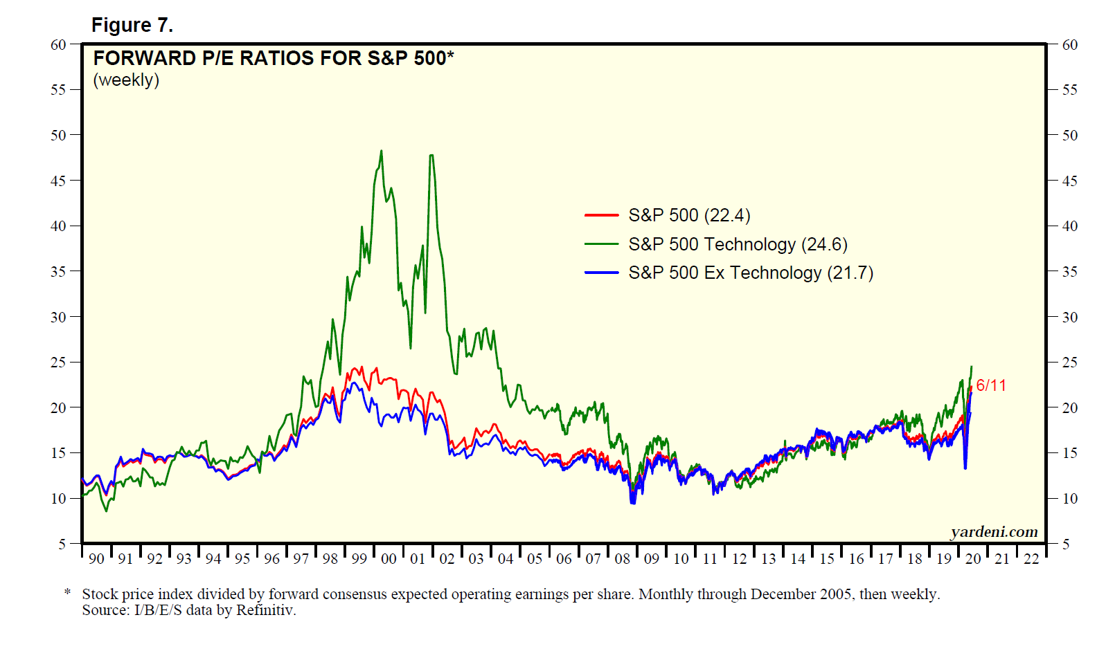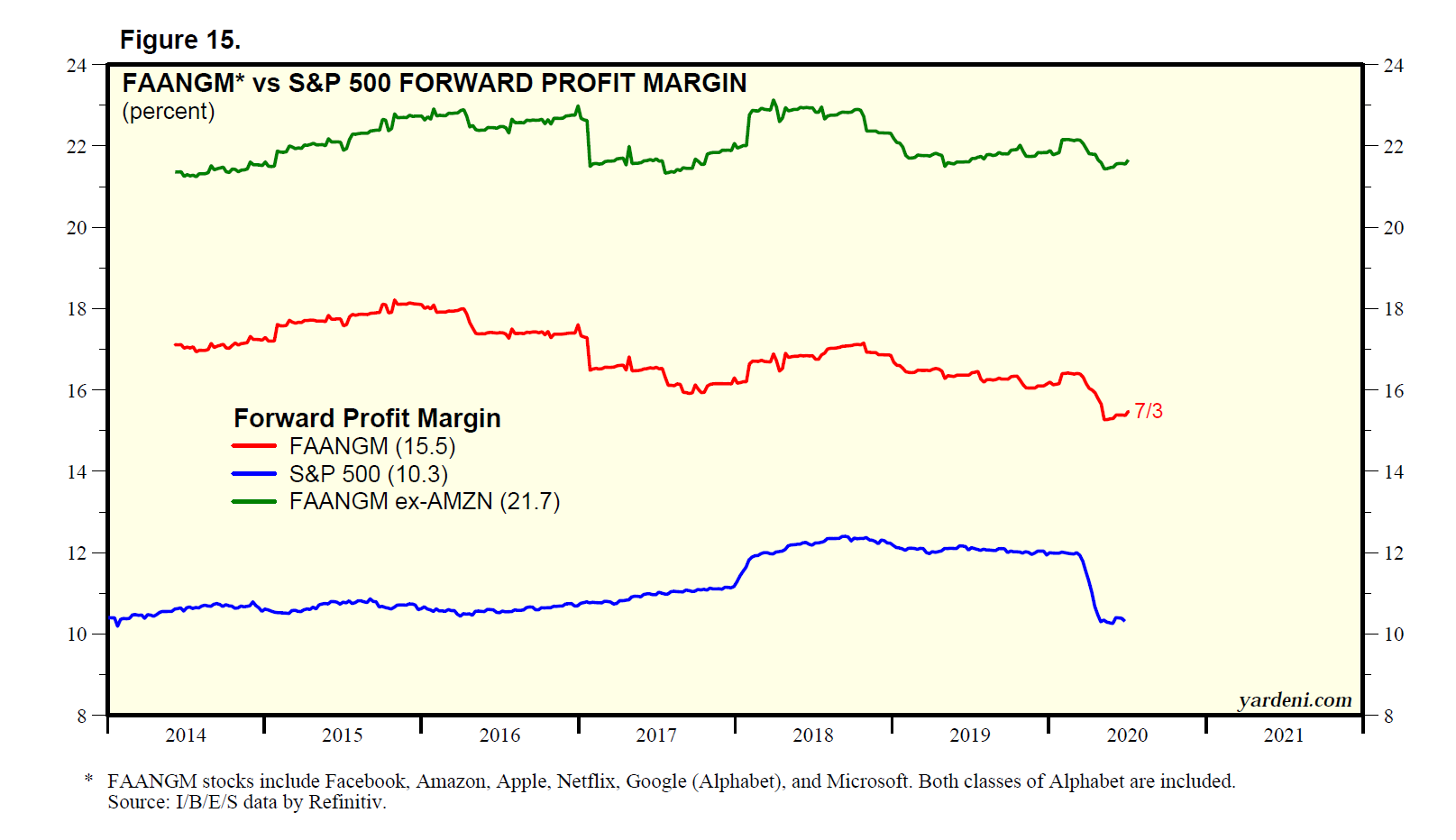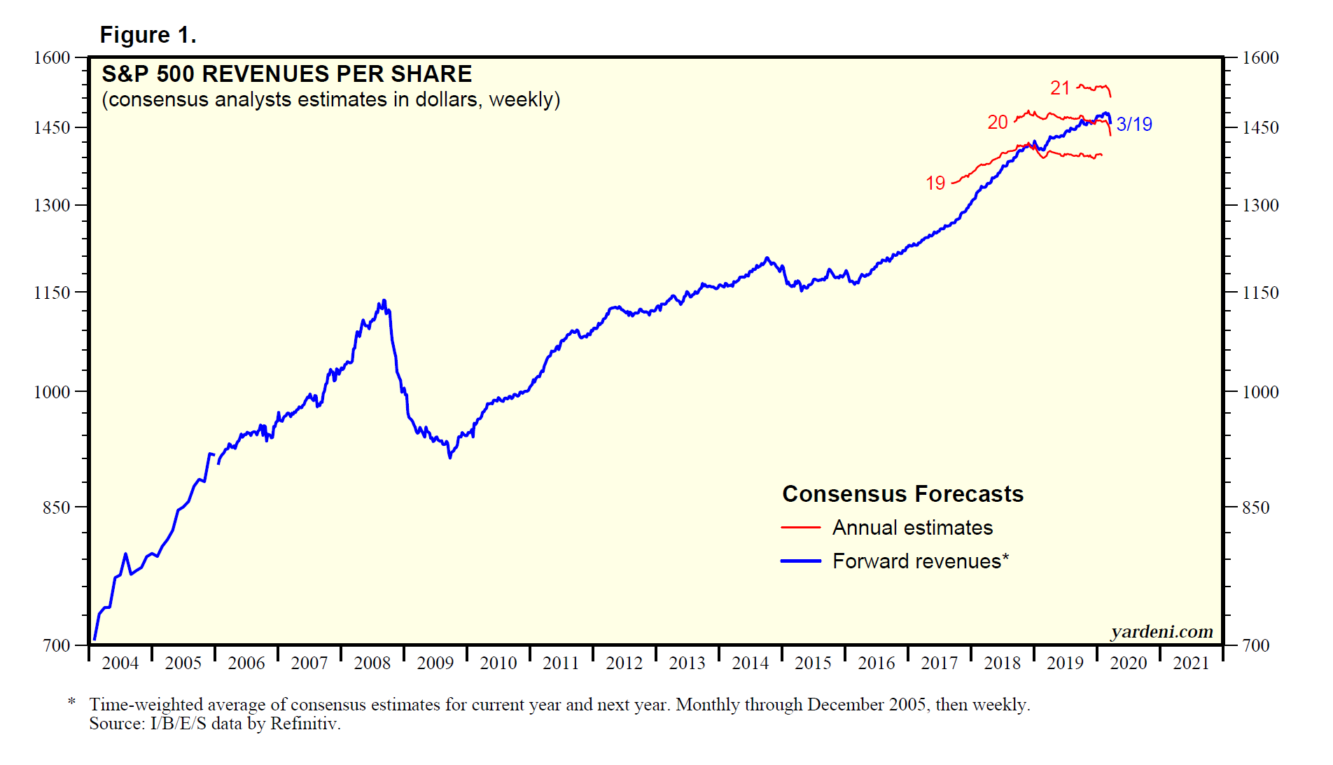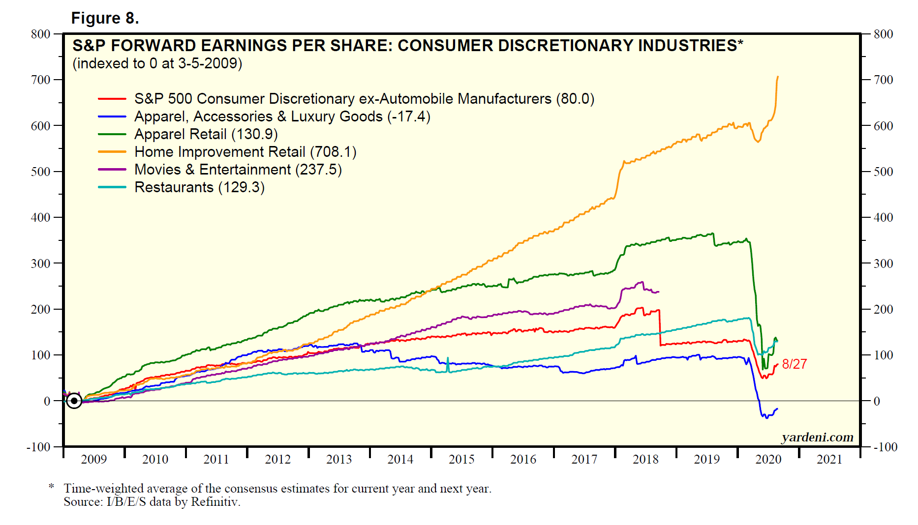 Corporate Finance I: Accounting for Fun & Profits. Yesterday, Joe and I raised our estimates for S&P 500 revenues and earnings per share and profit margins to the following: 2020 ($1,400, $140, 10%), 2021 ($1,545, $170, 11%), and 2022 ($1,625, $195, 12%). As a result, our S&P 500 year-end targets for this year and the next two years are now 3740, 4290, and 4620. (See YRI Earnings Forecasts.)