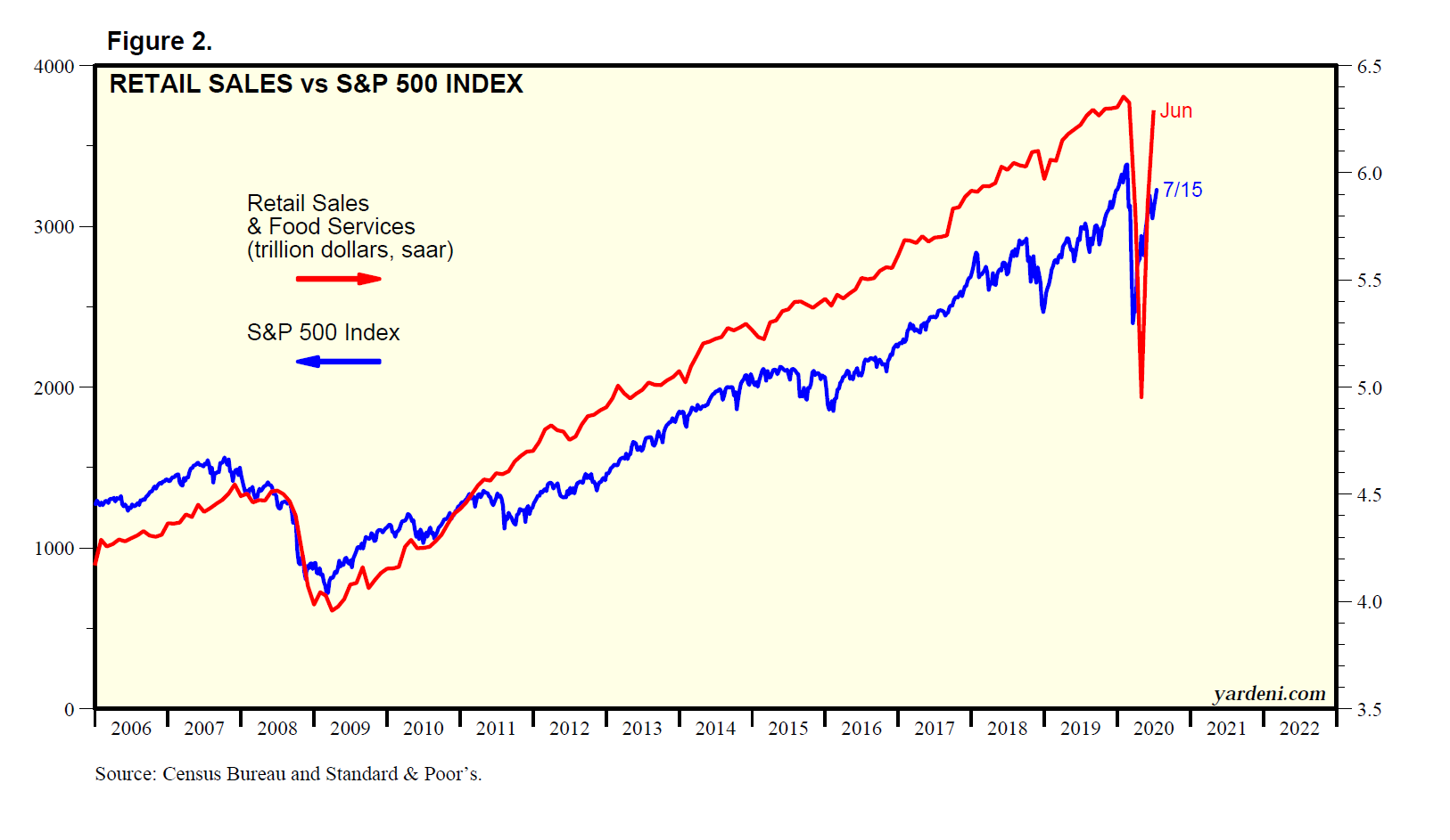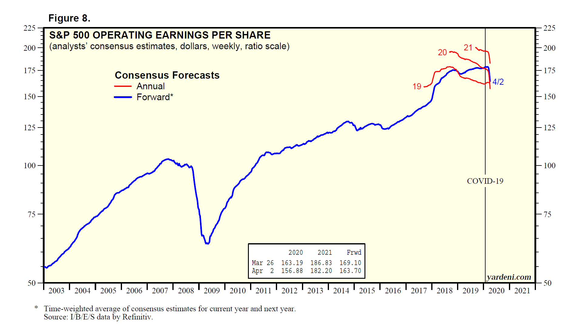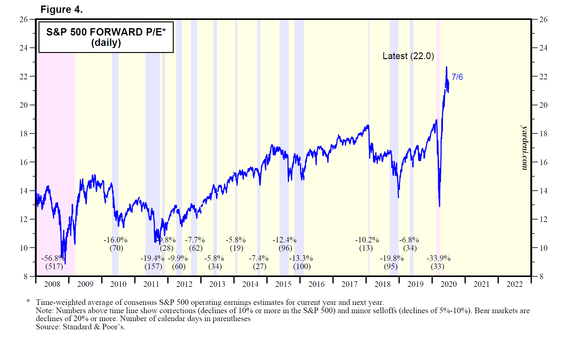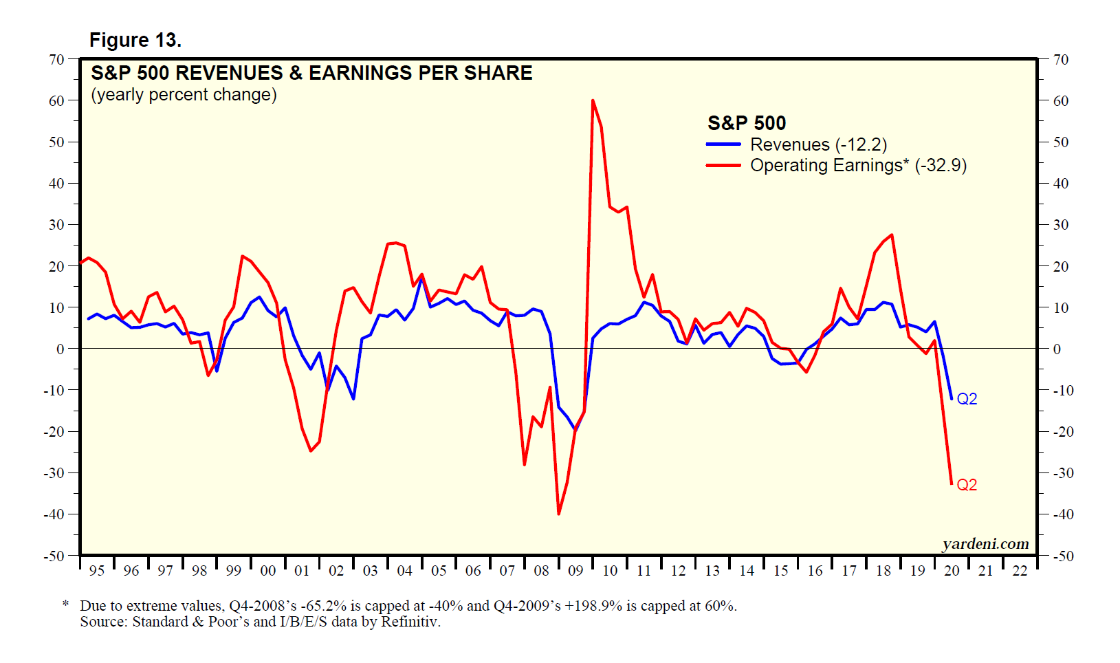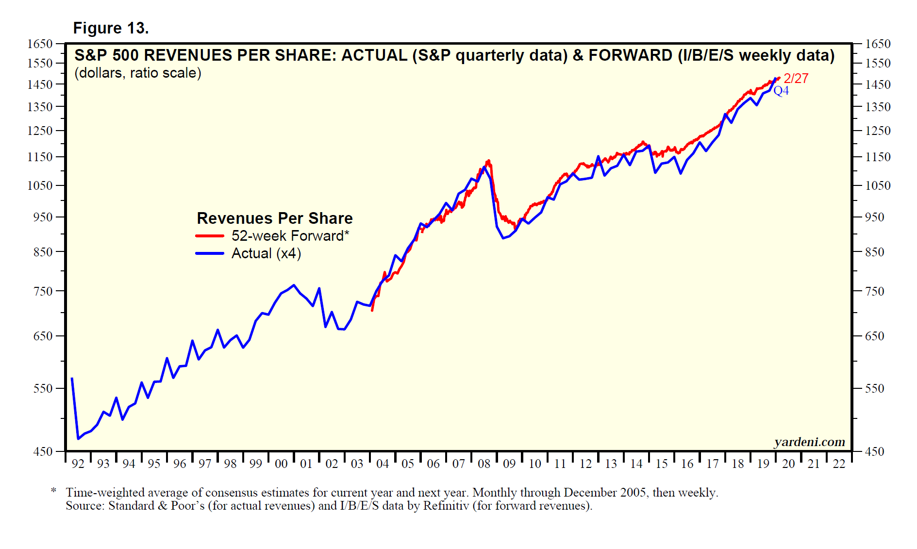 Corporate Finance I: Accounting for Fun & Profits. Yesterday, Joe and I raised our estimates for S&P 500 revenues and earnings per share and profit margins to the following: 2020 ($1,400, $140, 10%), 2021 ($1,545, $170, 11%), and 2022 ($1,625, $195, 12%). As a result, our S&P 500 year-end targets for this year and the next two years are now 3740, 4290, and 4620. (See YRI Earnings Forecasts.)
