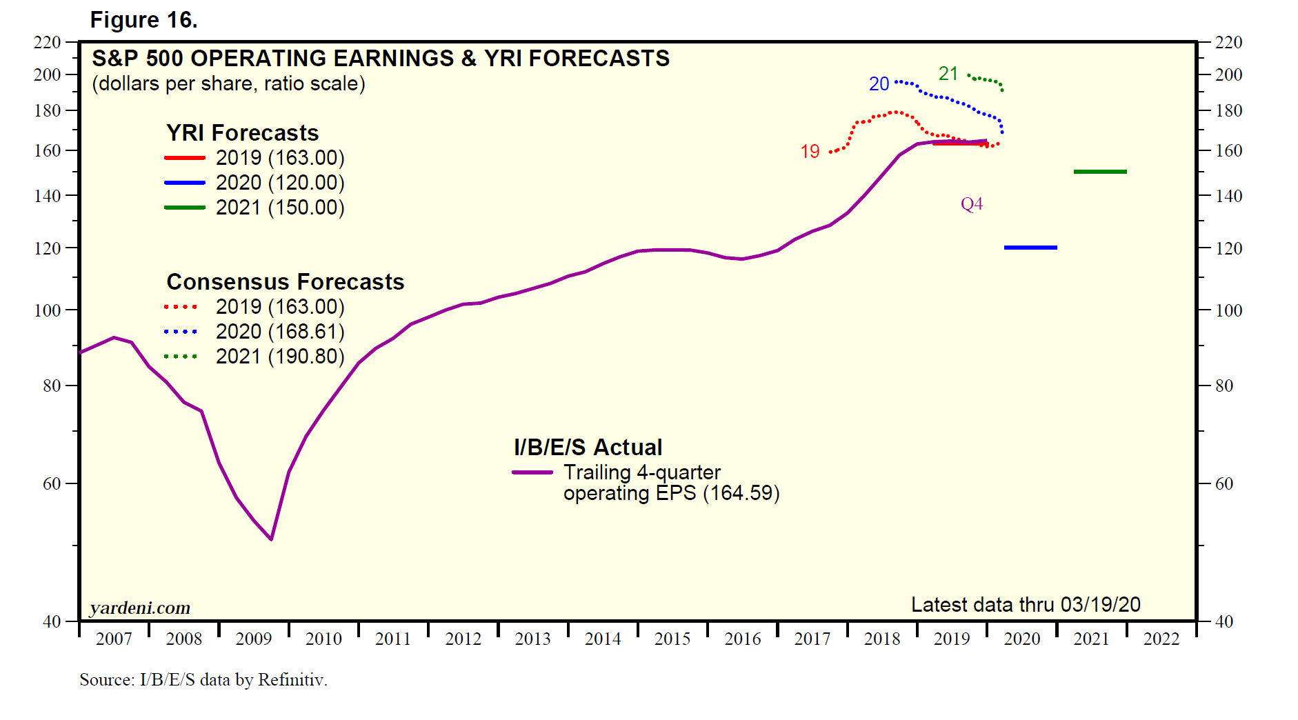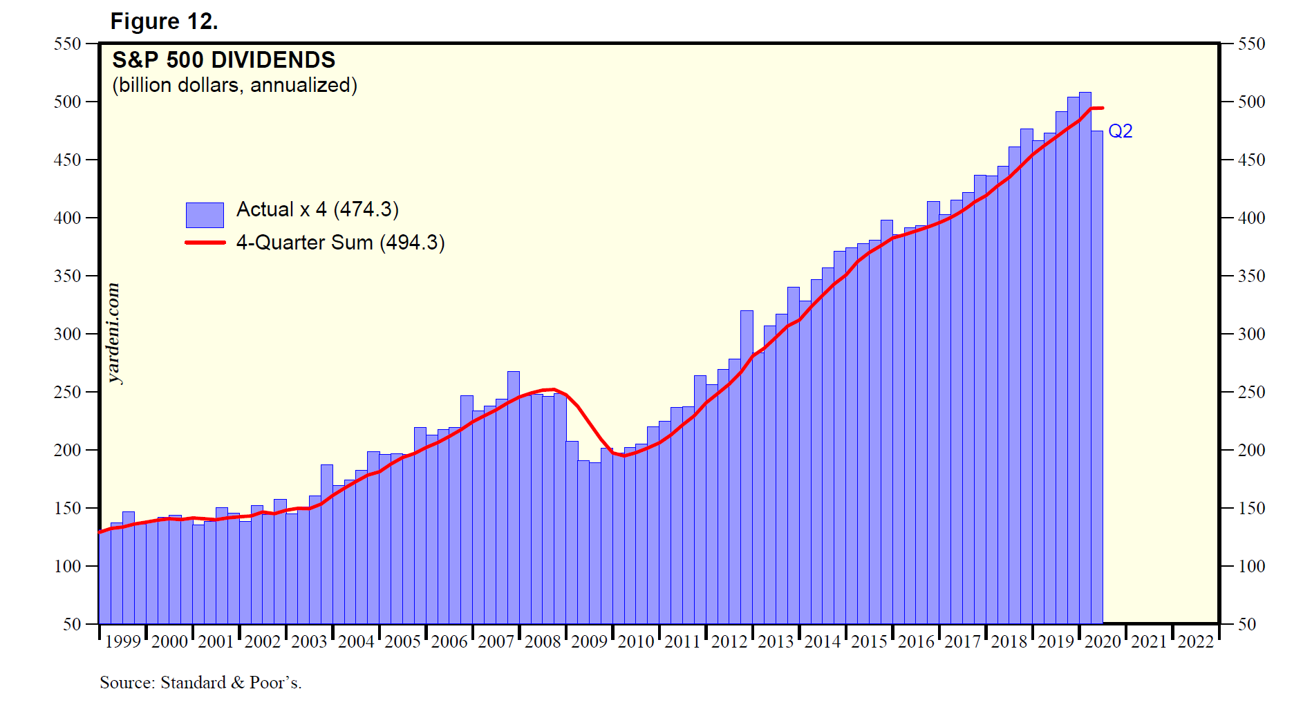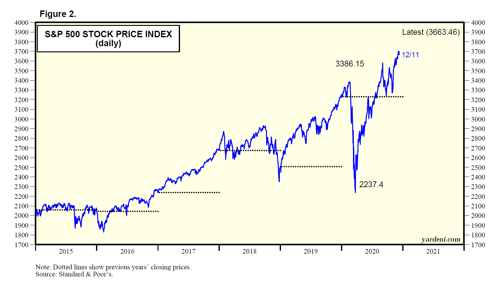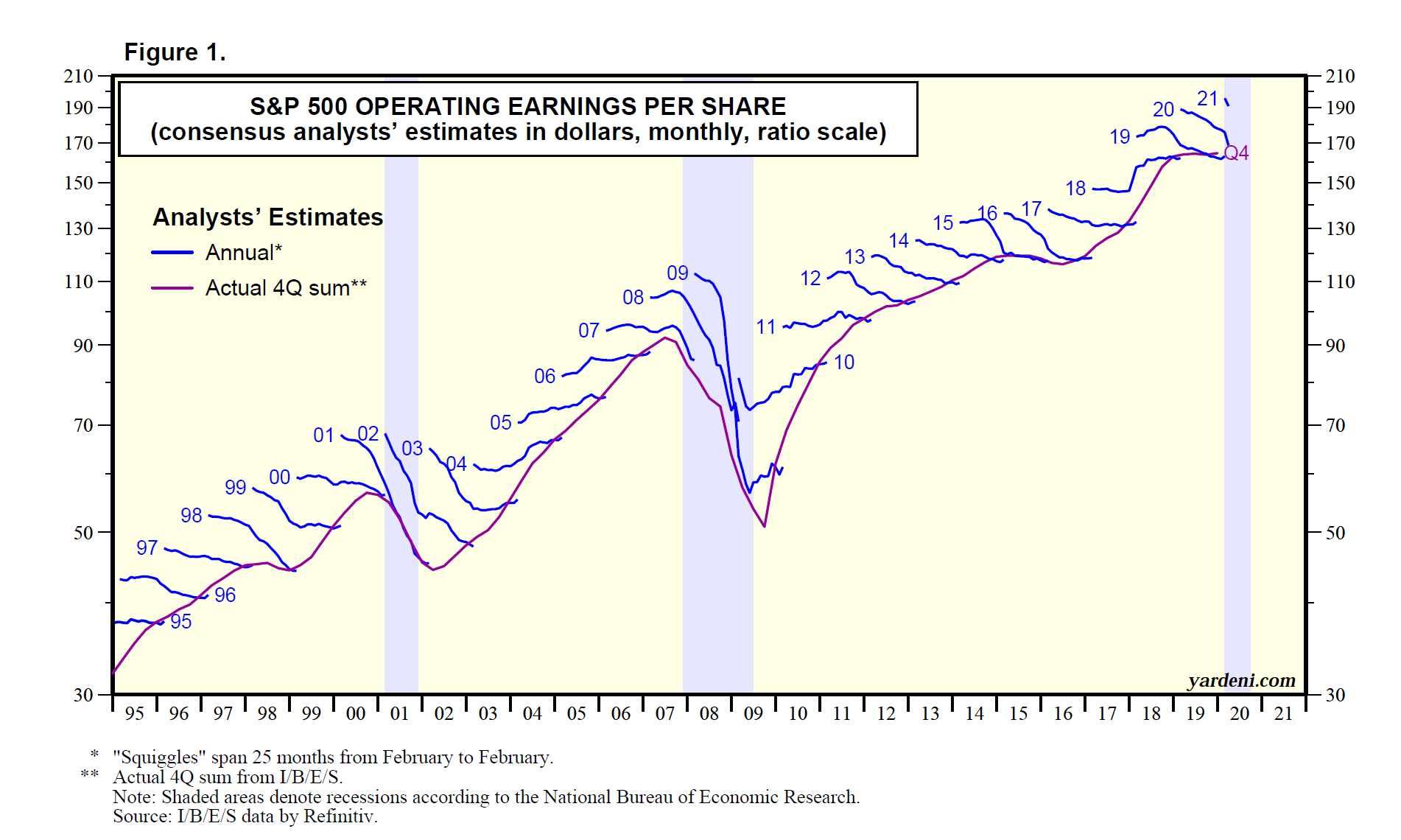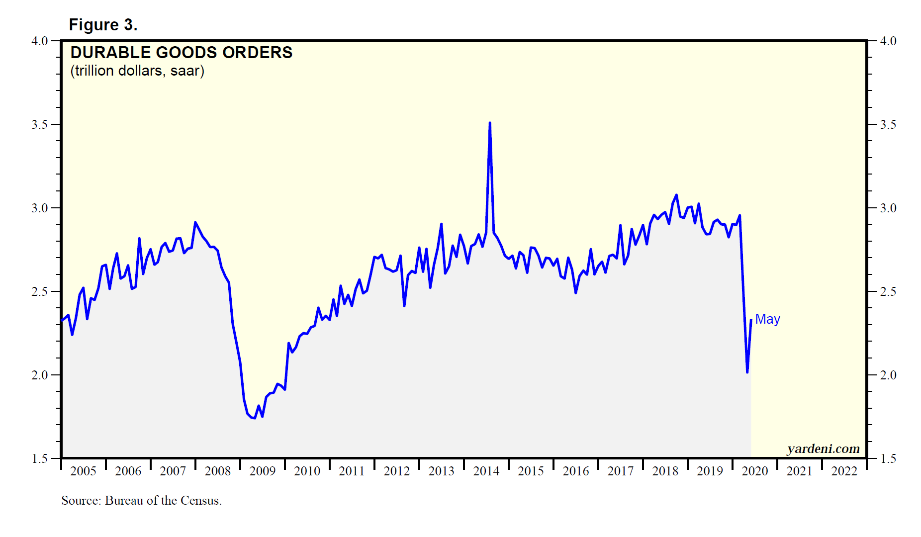 Corporate Finance I: Accounting for Fun & Profits. Yesterday, Joe and I raised our estimates for S&P 500 revenues and earnings per share and profit margins to the following: 2020 ($1,400, $140, 10%), 2021 ($1,545, $170, 11%), and 2022 ($1,625, $195, 12%). As a result, our S&P 500 year-end targets for this year and the next two years are now 3740, 4290, and 4620. (See YRI Earnings Forecasts.)