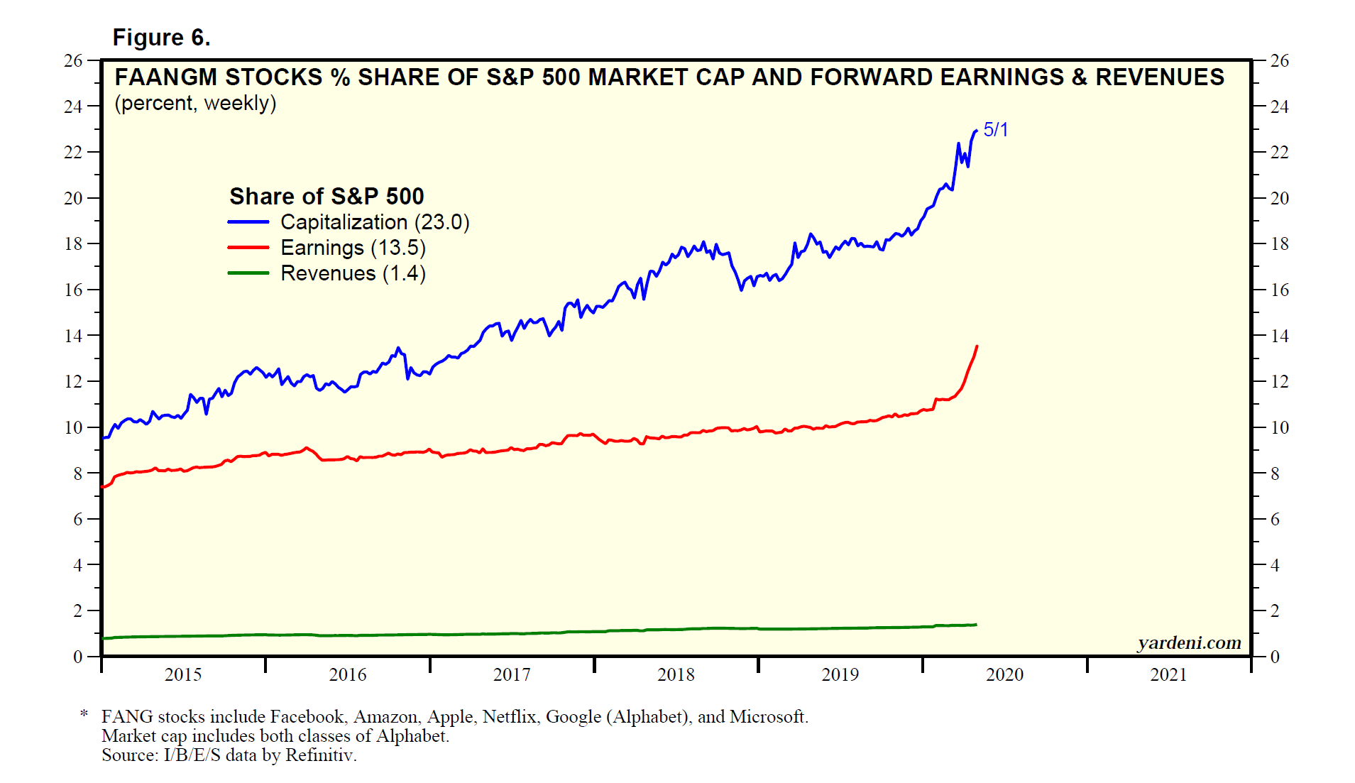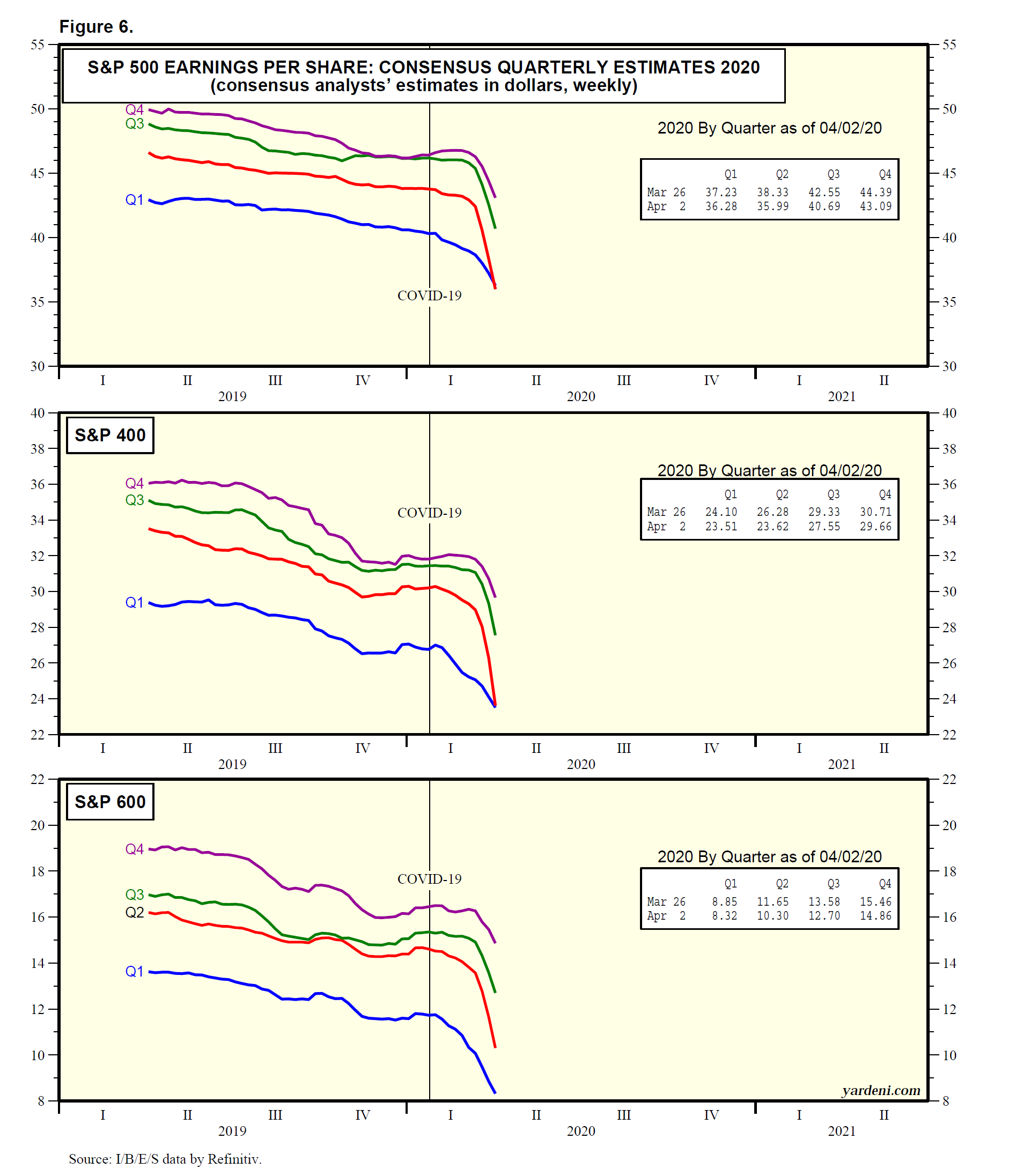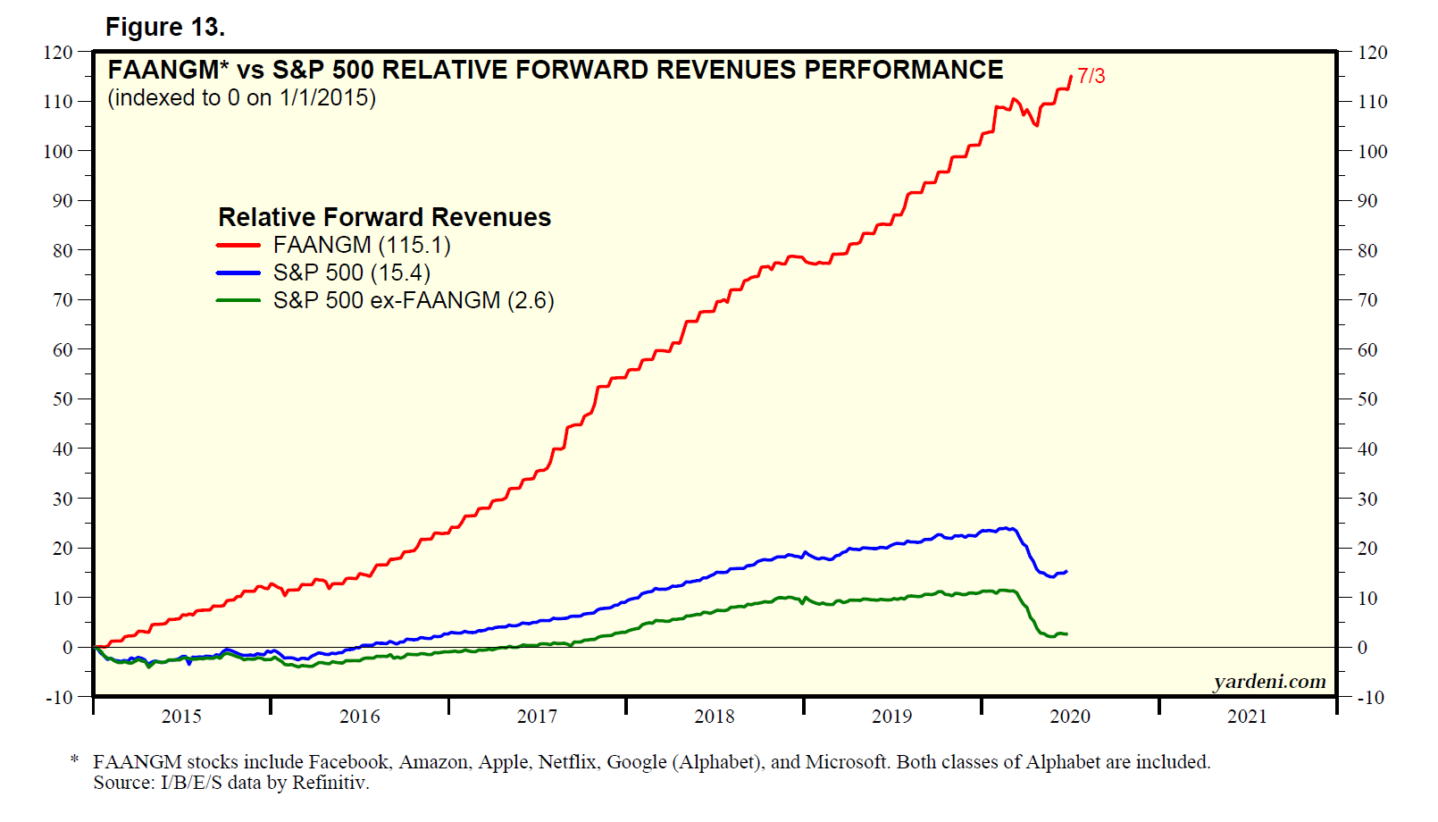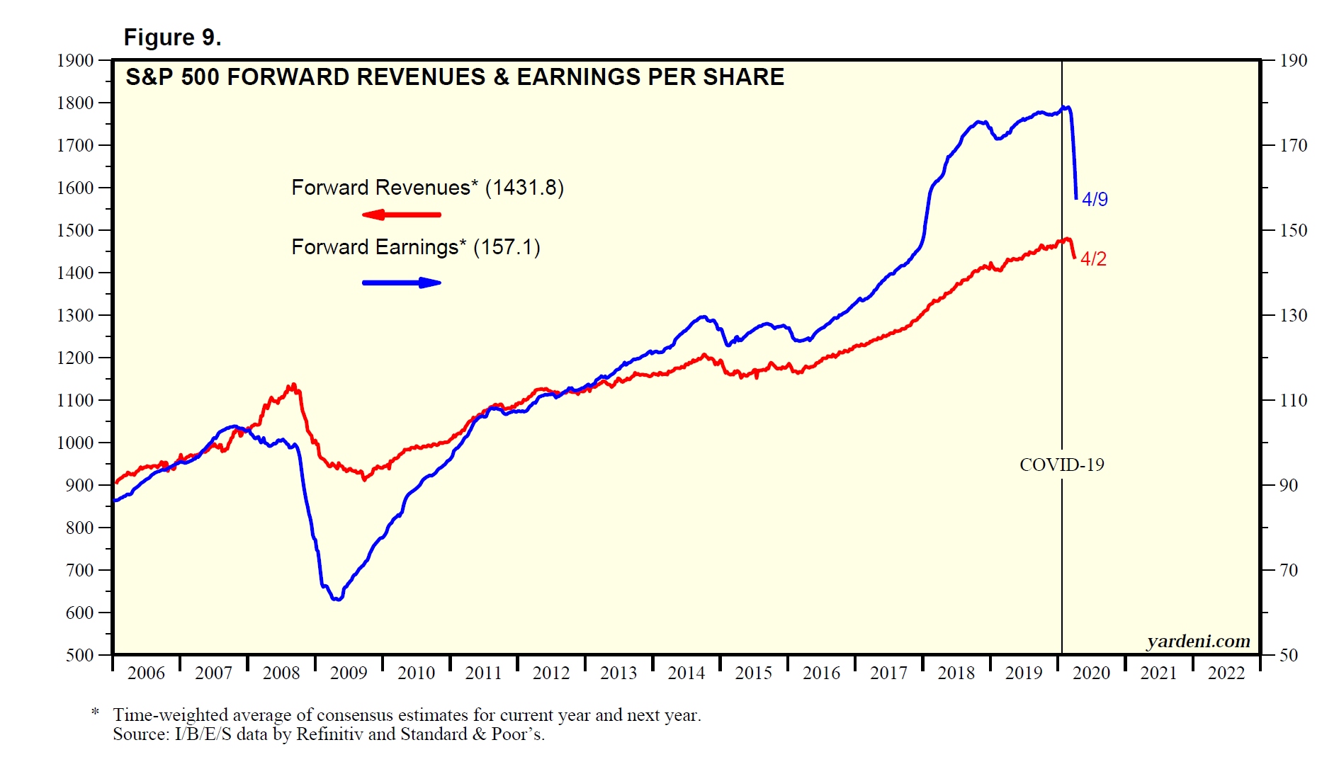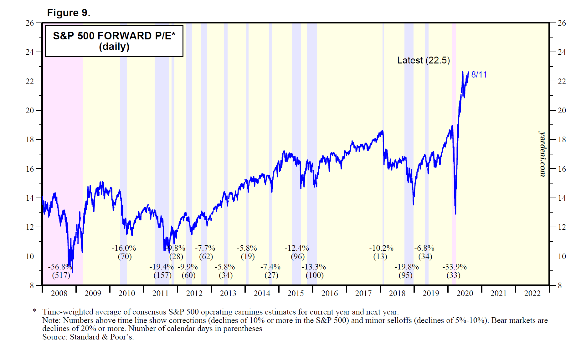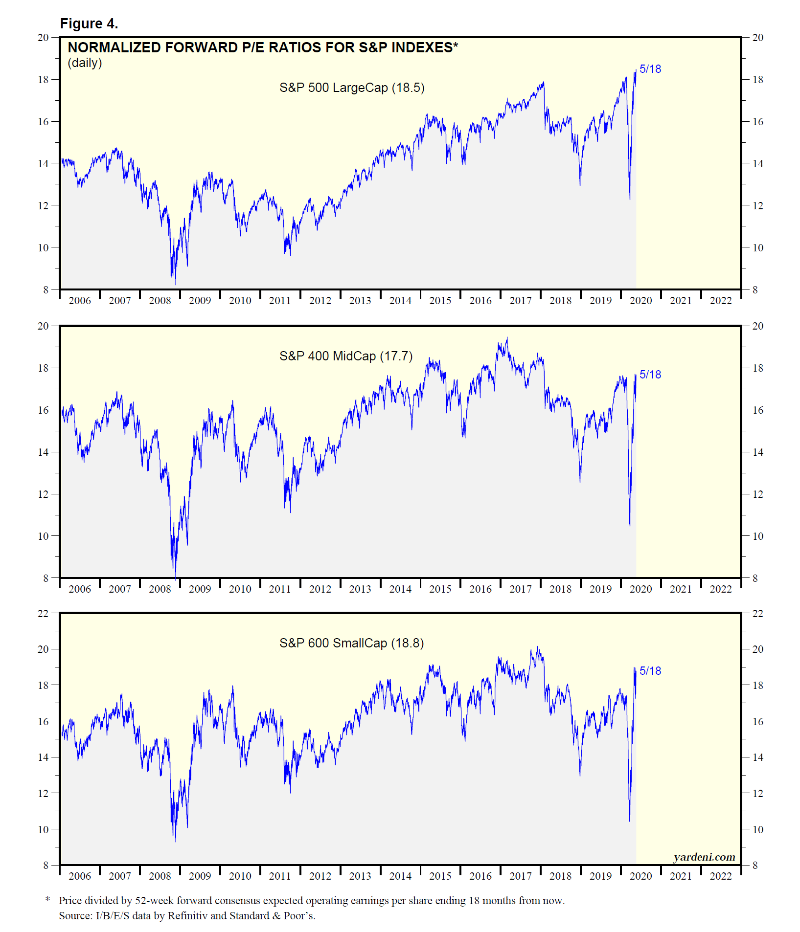 Corporate Finance I: Accounting for Fun & Profits. Yesterday, Joe and I raised our estimates for S&P 500 revenues and earnings per share and profit margins to the following: 2020 ($1,400, $140, 10%), 2021 ($1,545, $170, 11%), and 2022 ($1,625, $195, 12%). As a result, our S&P 500 year-end targets for this year and the next two years are now 3740, 4290, and 4620. (See YRI Earnings Forecasts.)