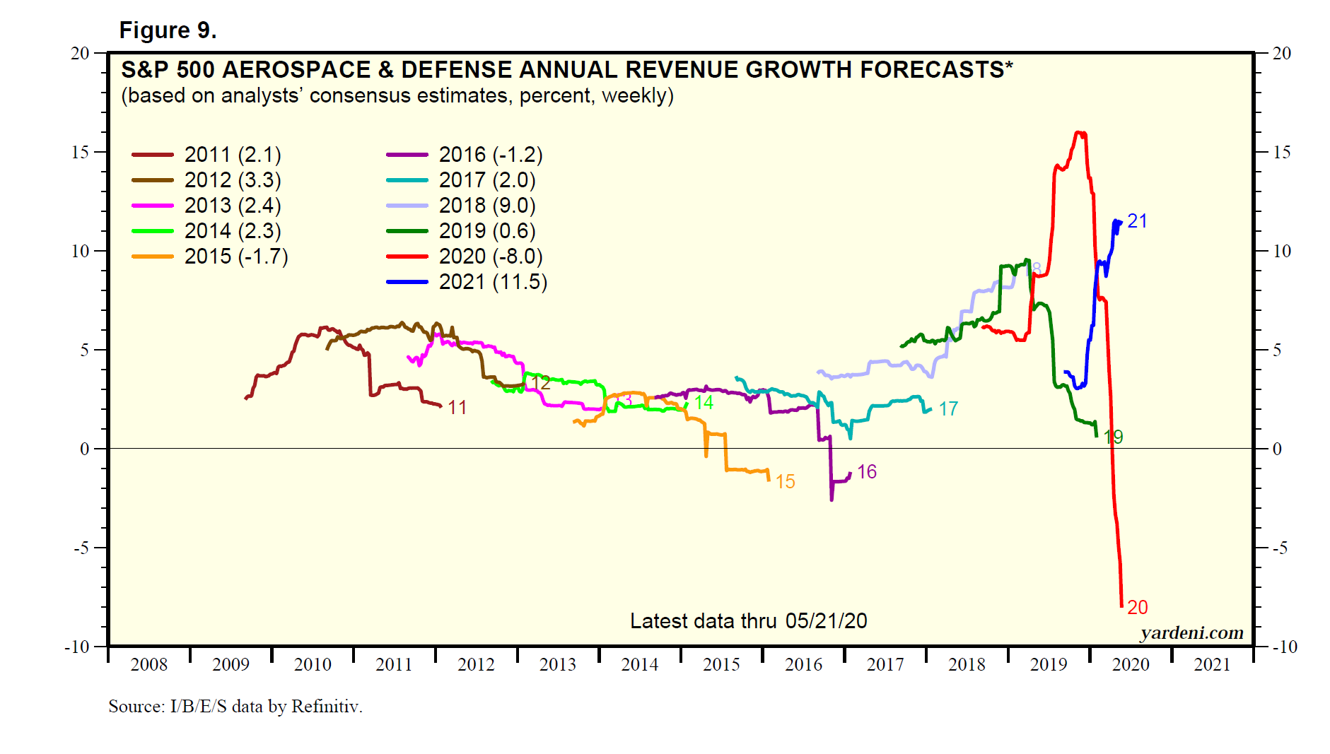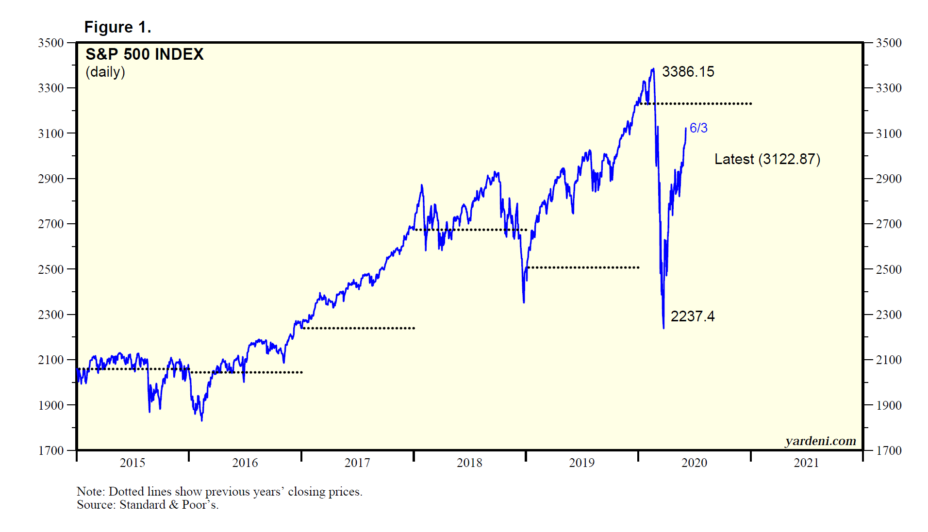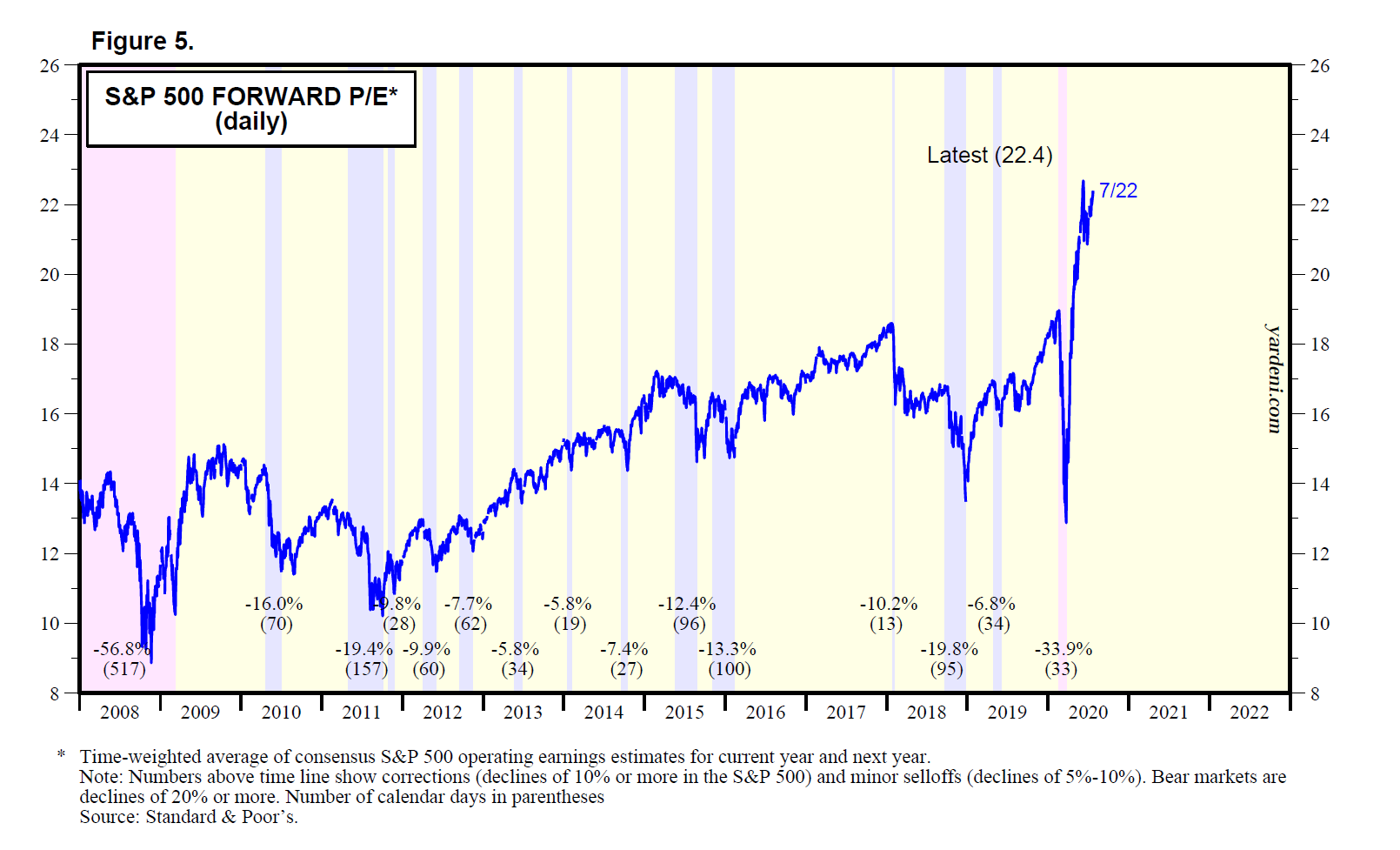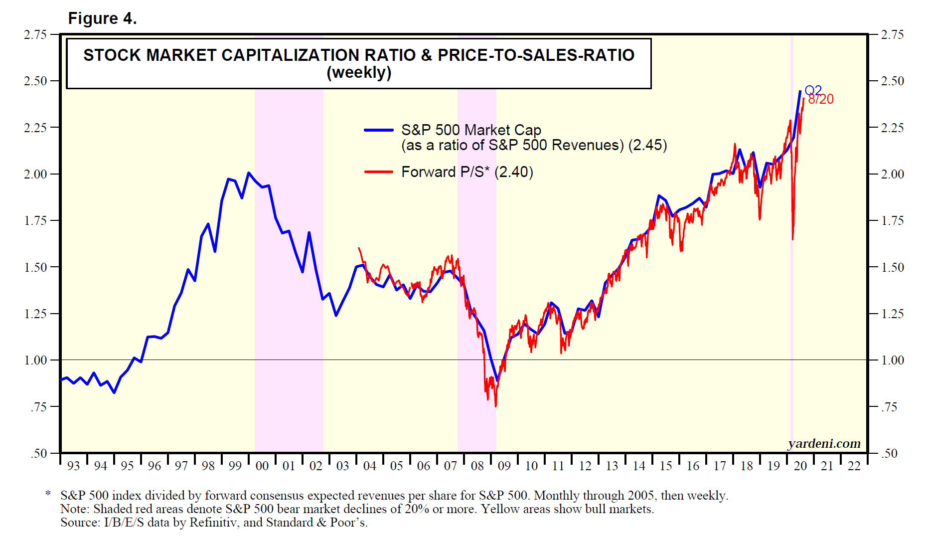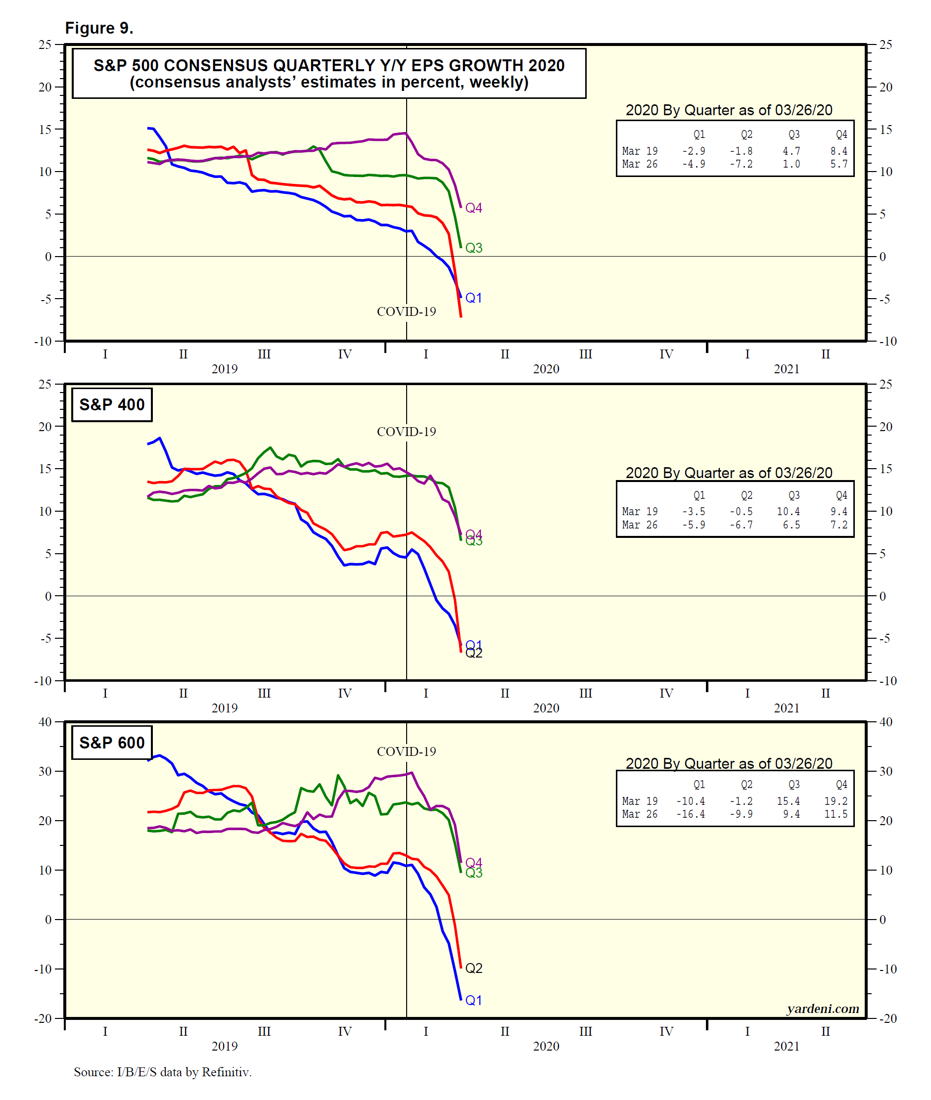Corporate Finance I: Accounting for Fun & Profits. Yesterday, Joe and I raised our estimates for S&P 500 revenues and earnings per share and profit margins to the following: 2020 ($1,400, $140, 10%), 2021 ($1,545, $170, 11%), and 2022 ($1,625, $195, 12%). As a result, our S&P 500 year-end targets for this year and the next two years are now 3740, 4290, and 4620. (See YRI Earnings Forecasts.)