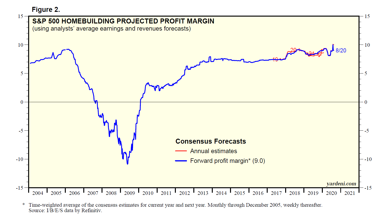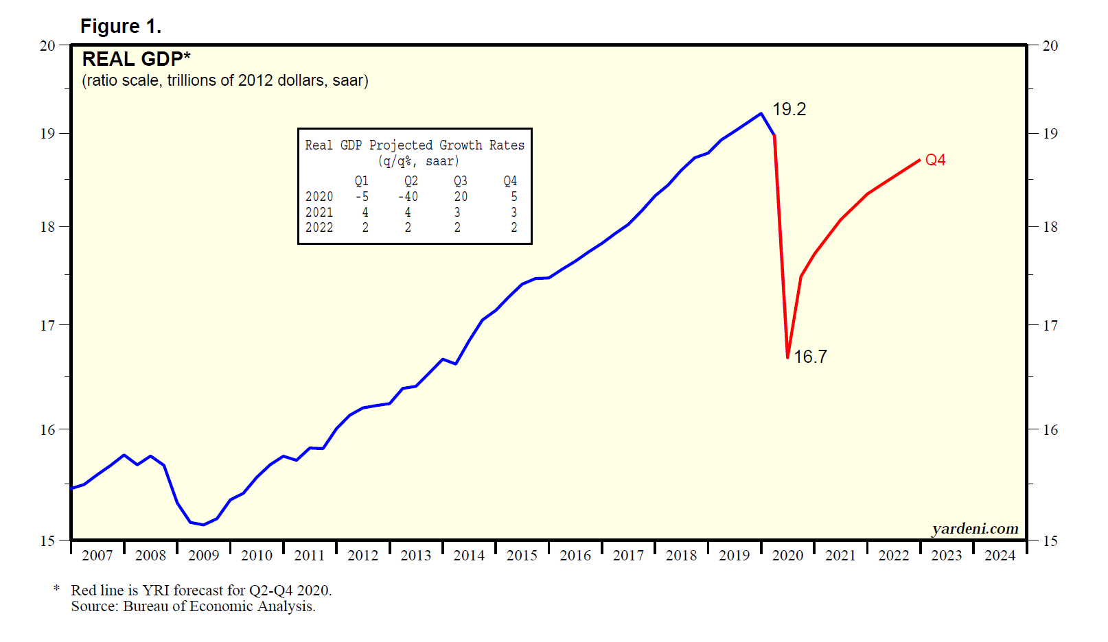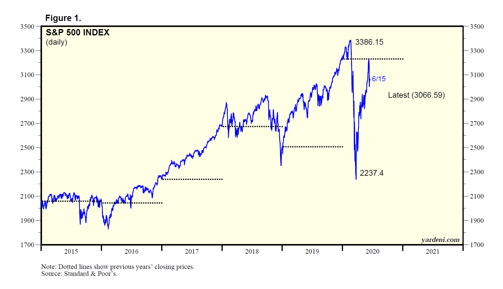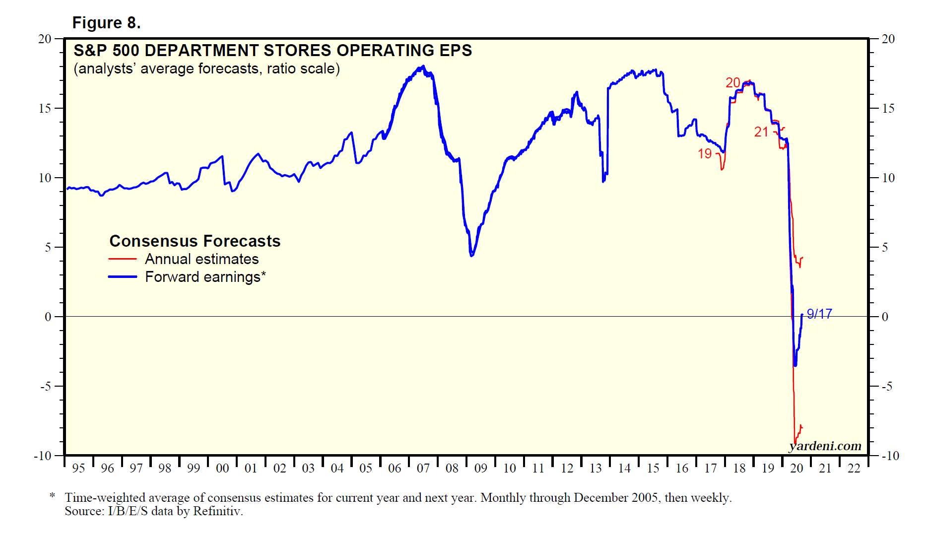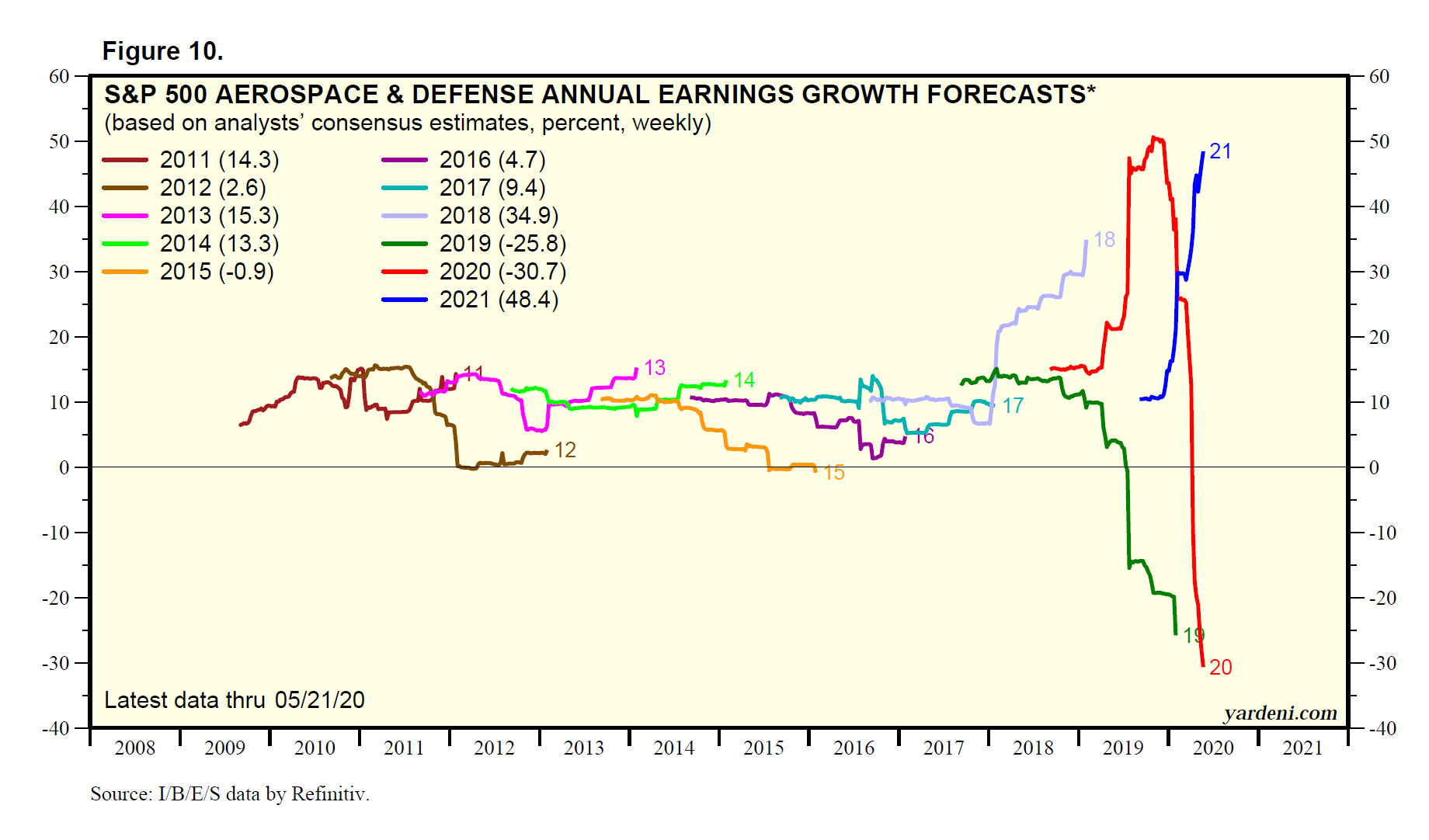 Corporate Finance I: Accounting for Fun & Profits. Yesterday, Joe and I raised our estimates for S&P 500 revenues and earnings per share and profit margins to the following: 2020 ($1,400, $140, 10%), 2021 ($1,545, $170, 11%), and 2022 ($1,625, $195, 12%). As a result, our S&P 500 year-end targets for this year and the next two years are now 3740, 4290, and 4620. (See YRI Earnings Forecasts.)