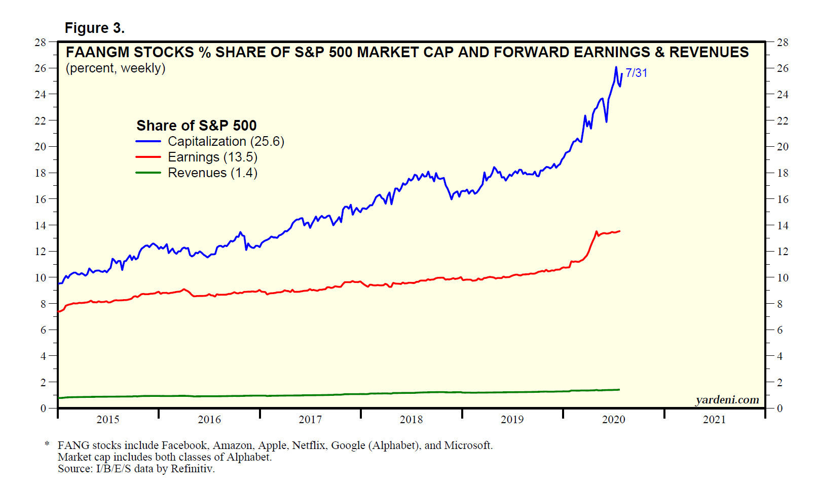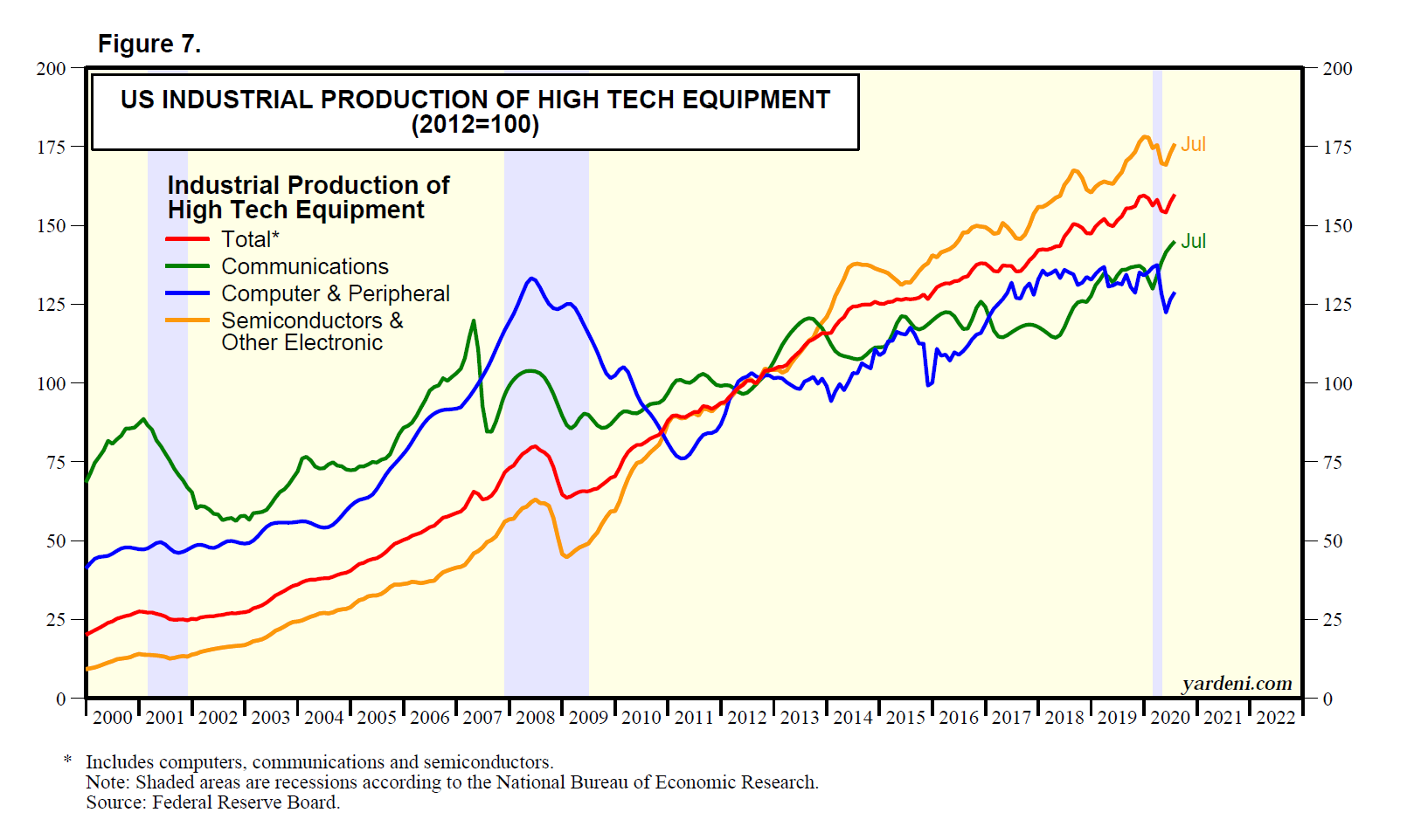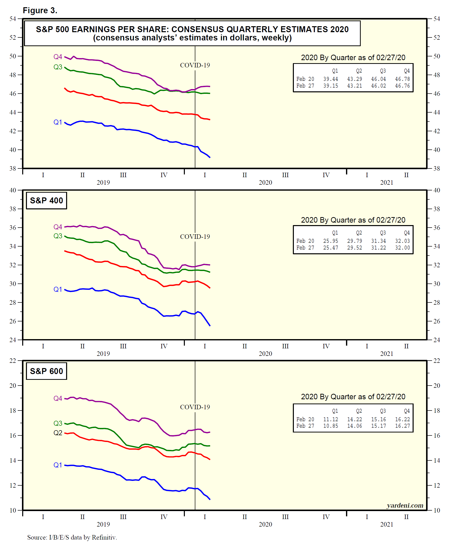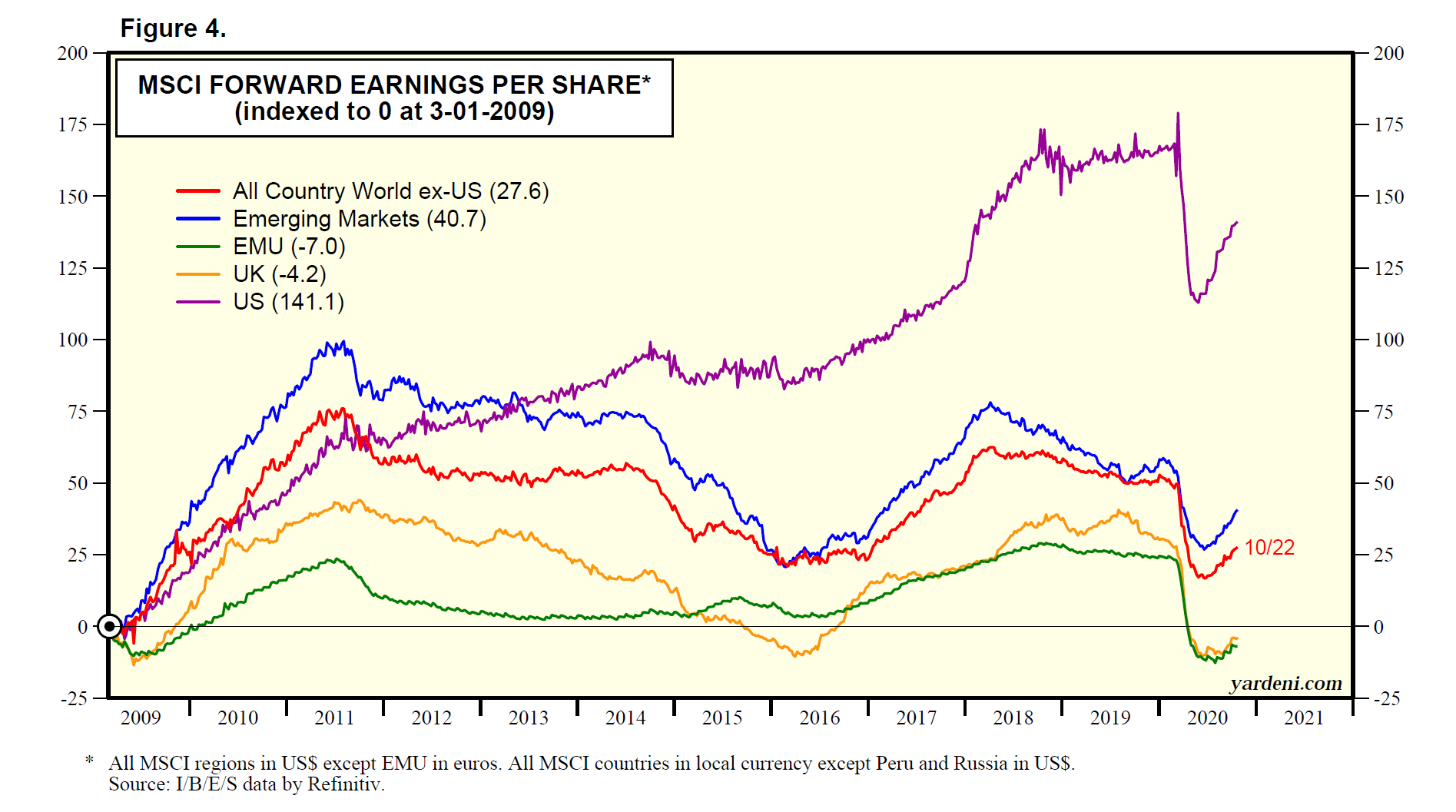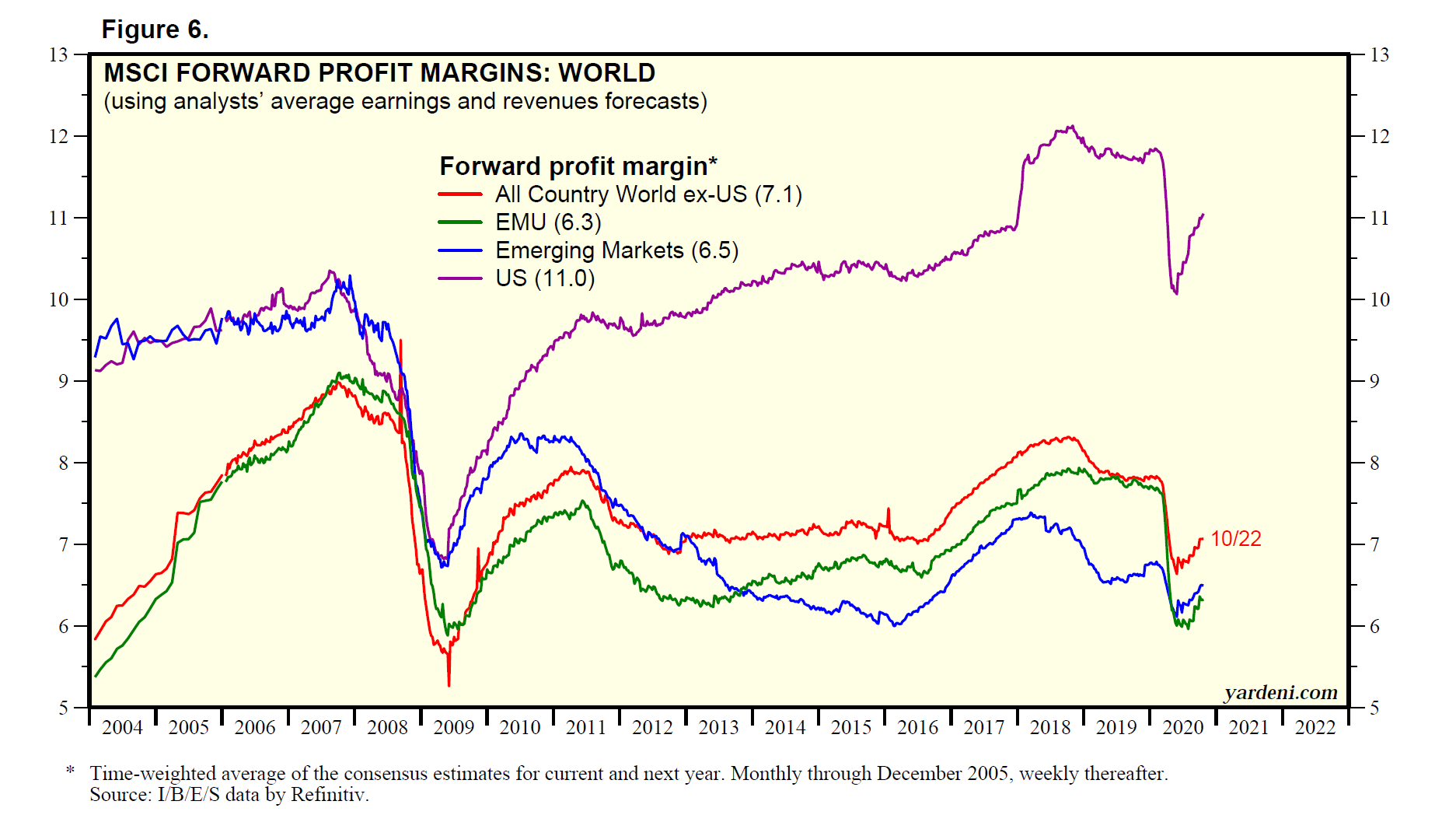 Corporate Finance I: Accounting for Fun & Profits. Yesterday, Joe and I raised our estimates for S&P 500 revenues and earnings per share and profit margins to the following: 2020 ($1,400, $140, 10%), 2021 ($1,545, $170, 11%), and 2022 ($1,625, $195, 12%). As a result, our S&P 500 year-end targets for this year and the next two years are now 3740, 4290, and 4620. (See YRI Earnings Forecasts.)