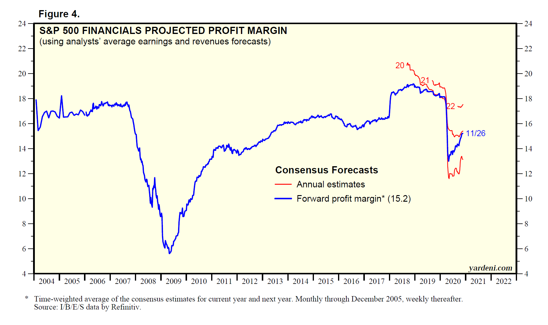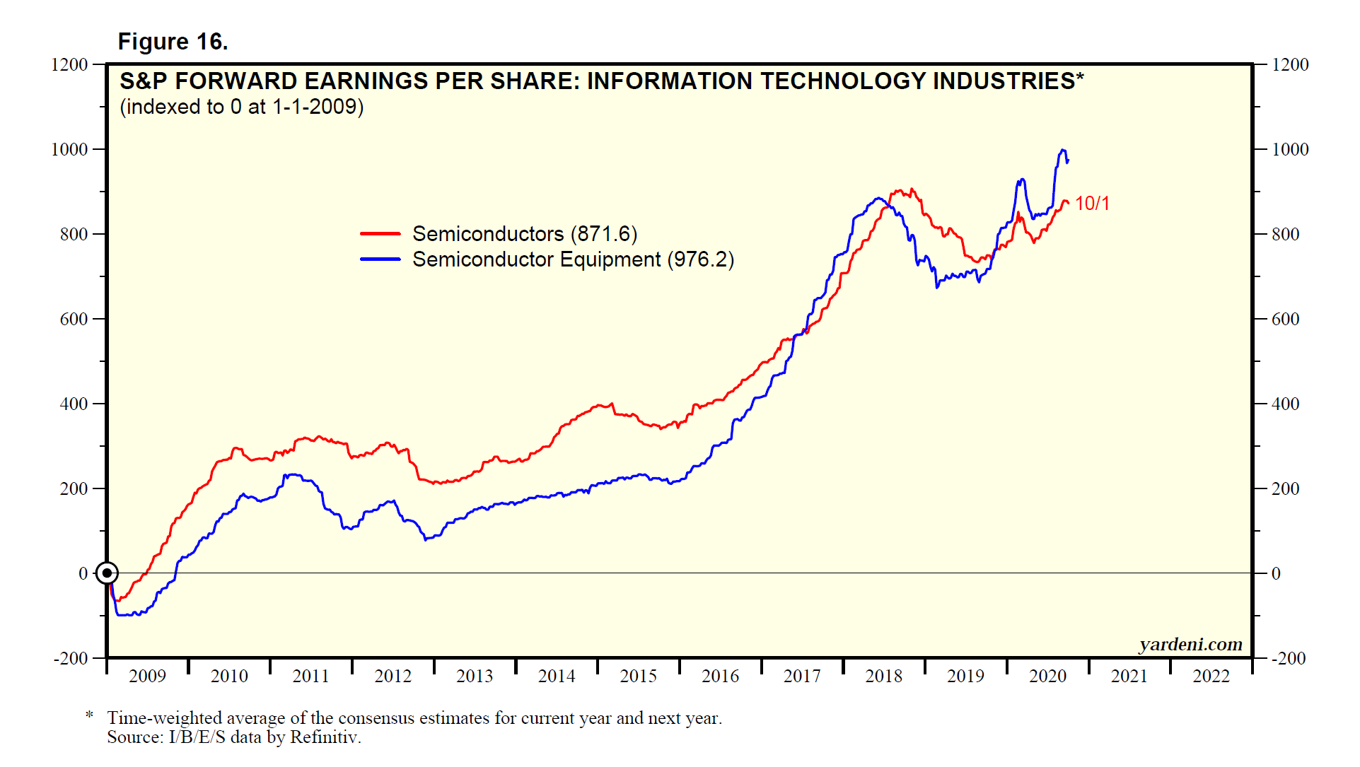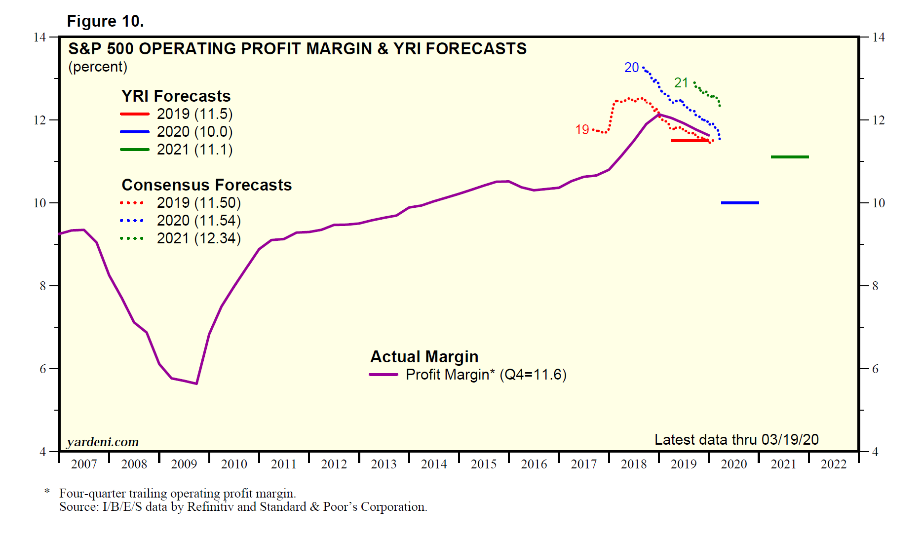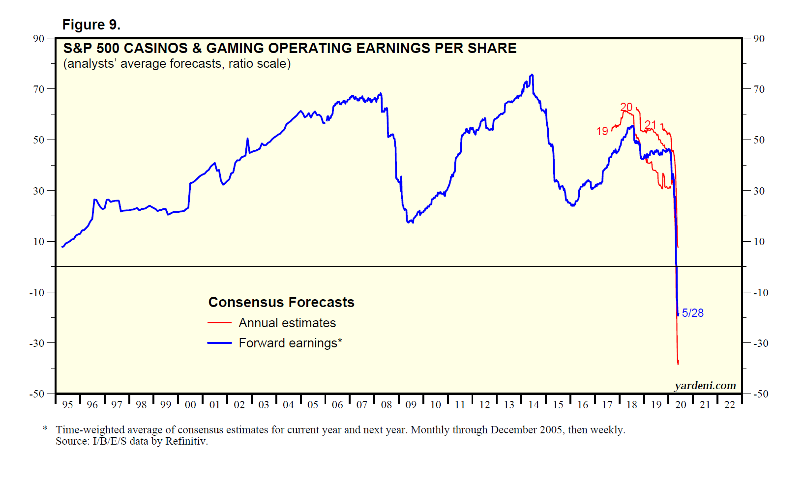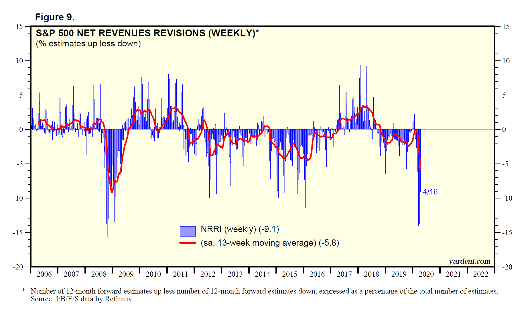 Corporate Finance I: Accounting for Fun & Profits. Yesterday, Joe and I raised our estimates for S&P 500 revenues and earnings per share and profit margins to the following: 2020 ($1,400, $140, 10%), 2021 ($1,545, $170, 11%), and 2022 ($1,625, $195, 12%). As a result, our S&P 500 year-end targets for this year and the next two years are now 3740, 4290, and 4620. (See YRI Earnings Forecasts.)