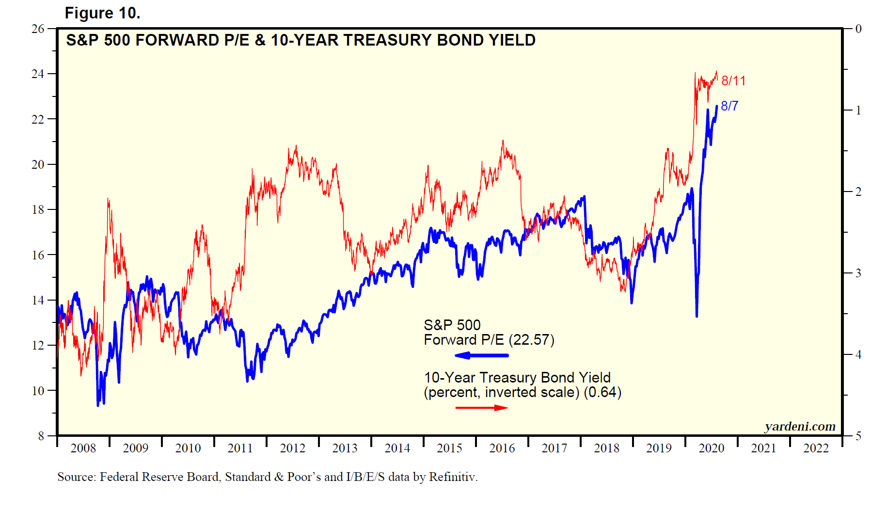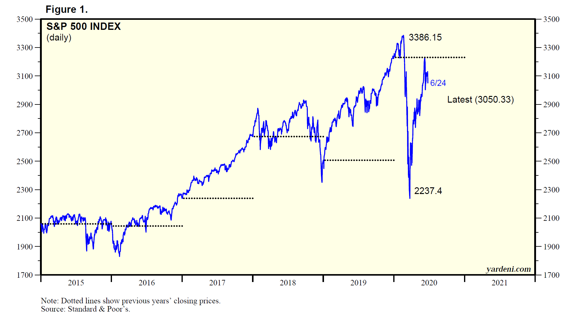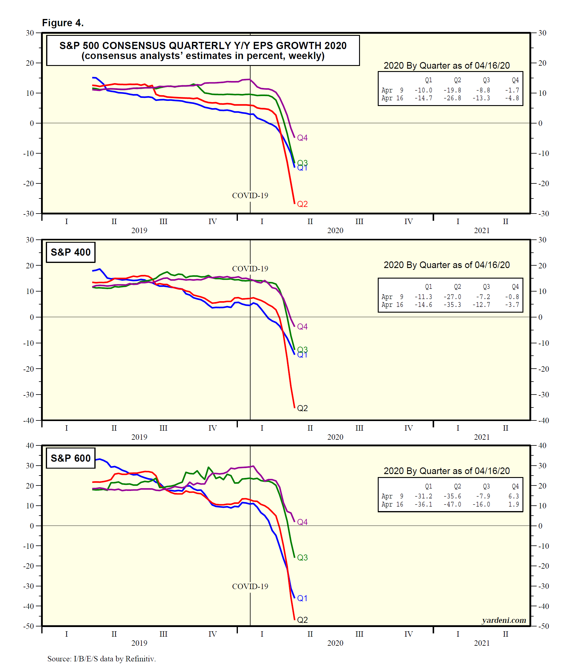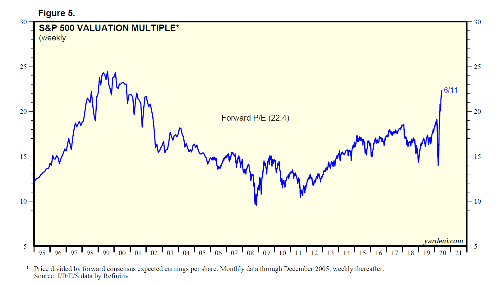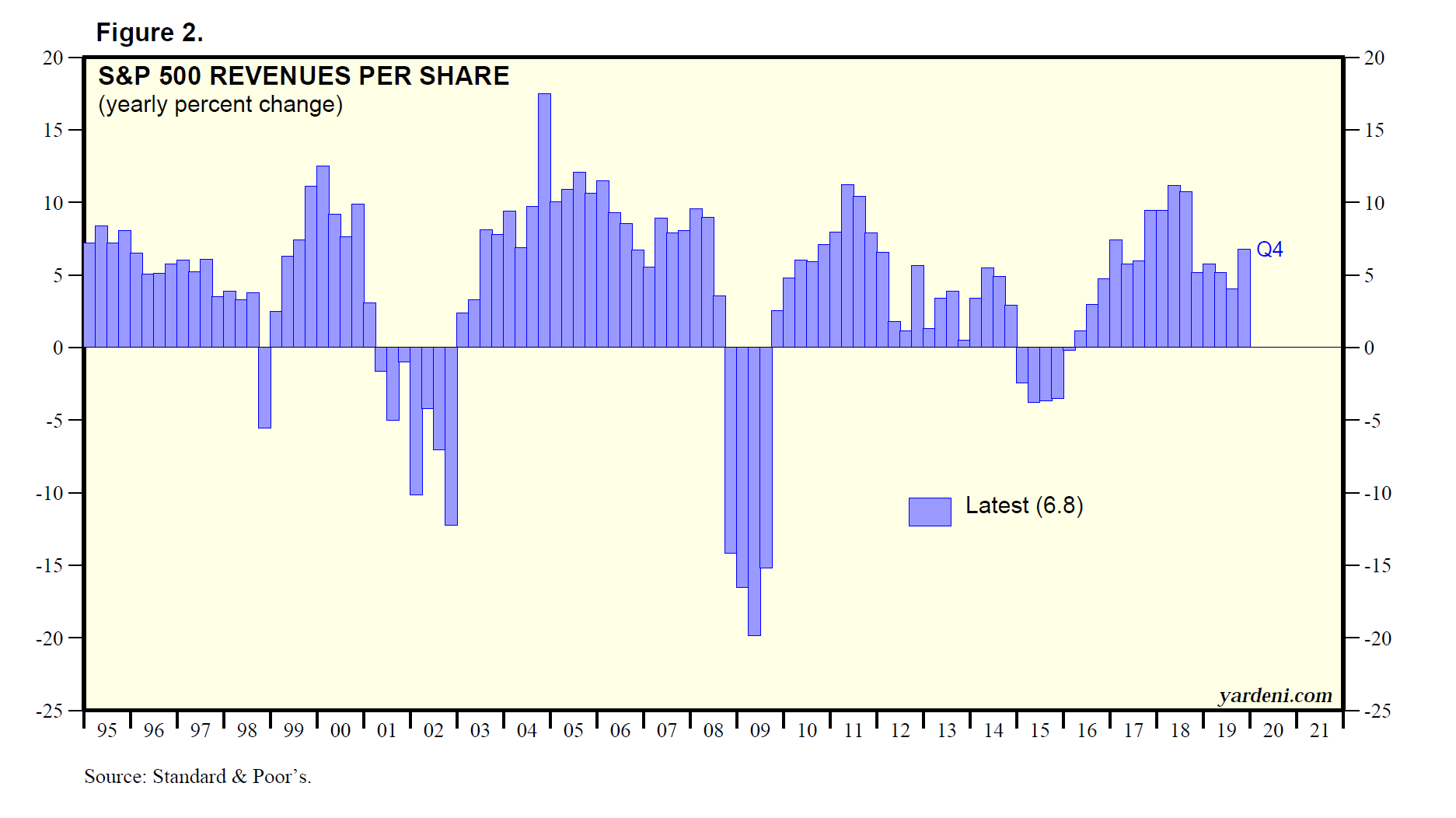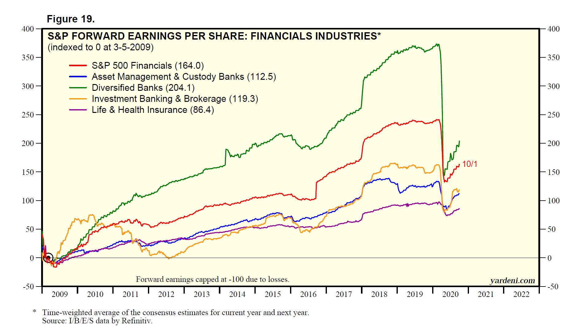 Corporate Finance I: Accounting for Fun & Profits. Yesterday, Joe and I raised our estimates for S&P 500 revenues and earnings per share and profit margins to the following: 2020 ($1,400, $140, 10%), 2021 ($1,545, $170, 11%), and 2022 ($1,625, $195, 12%). As a result, our S&P 500 year-end targets for this year and the next two years are now 3740, 4290, and 4620. (See YRI Earnings Forecasts.)