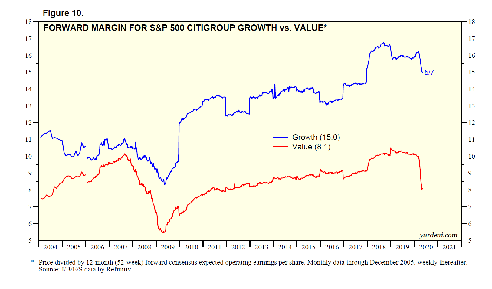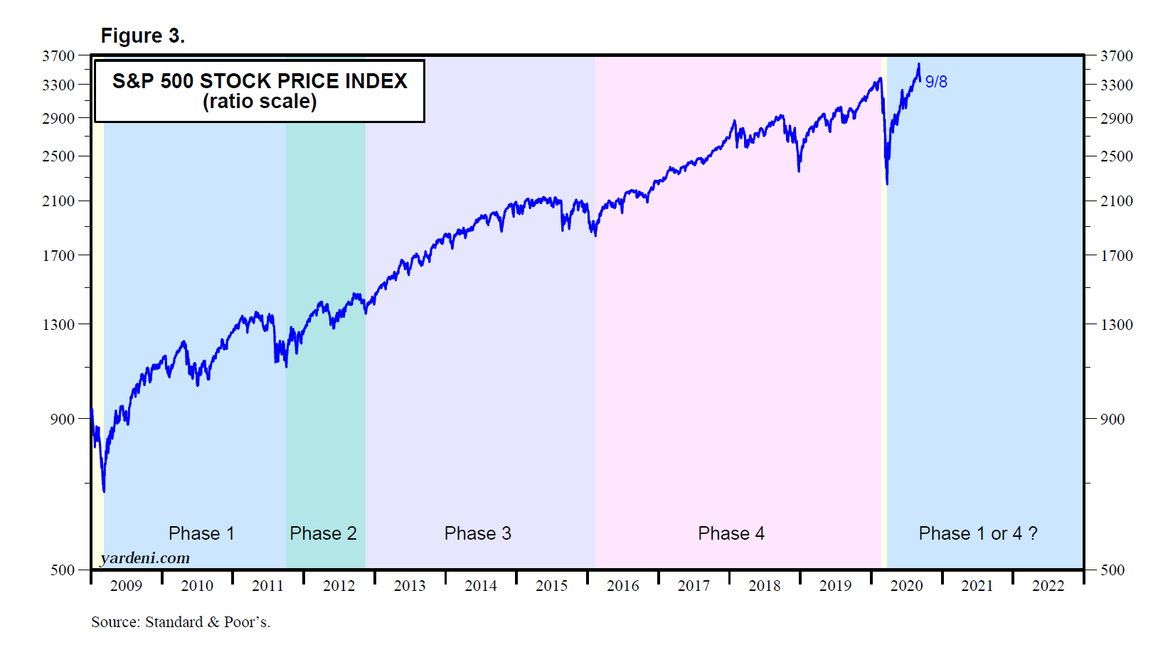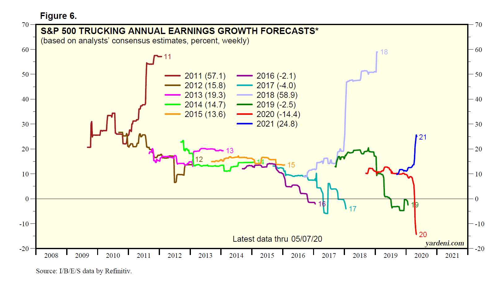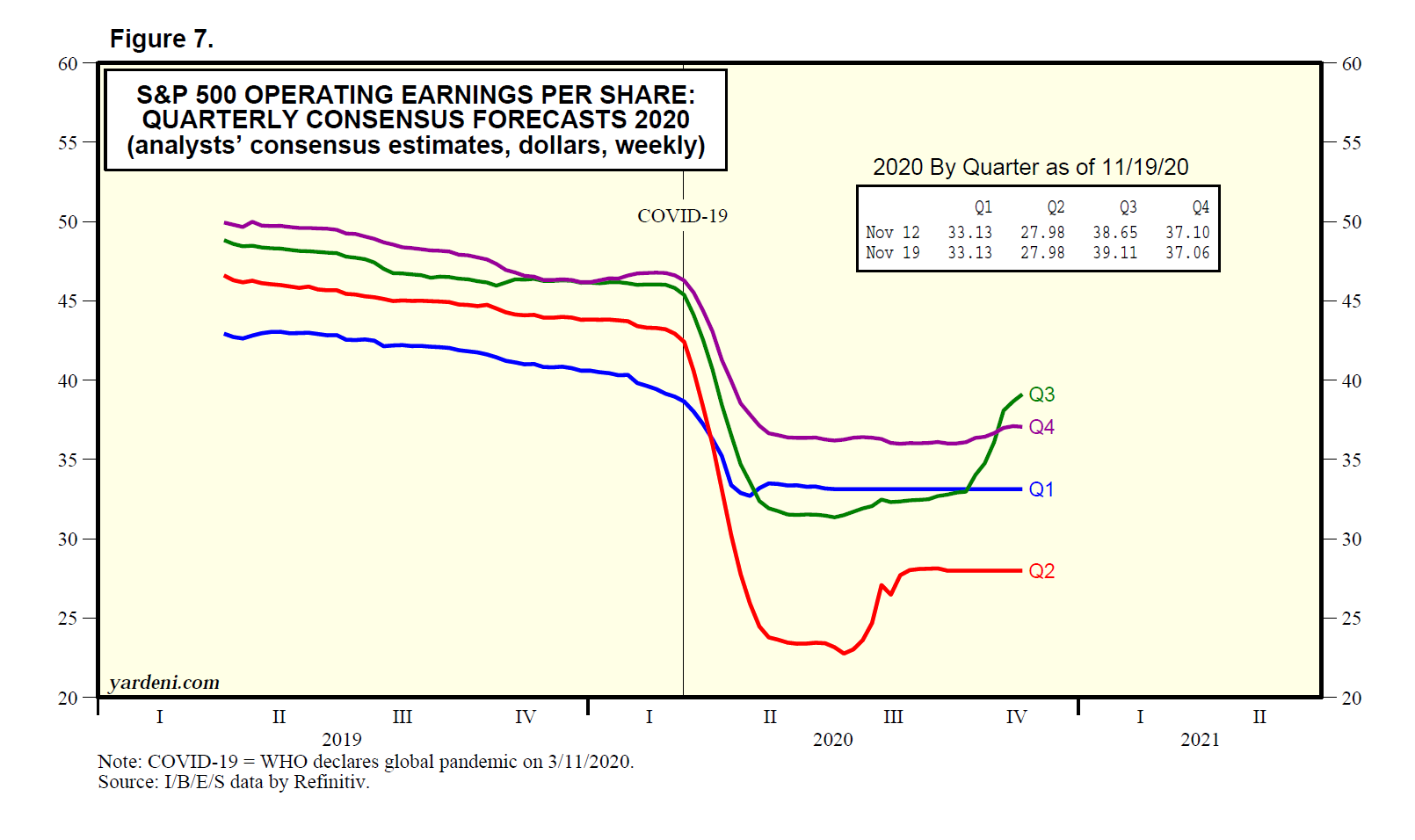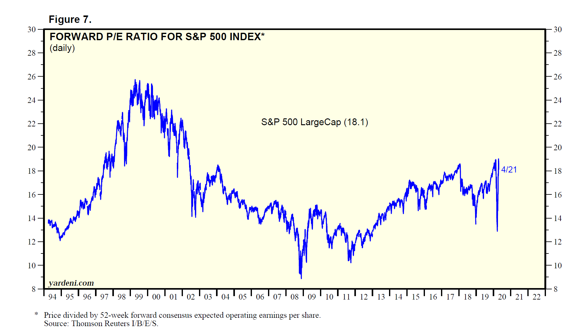 Corporate Finance I: Accounting for Fun & Profits. Yesterday, Joe and I raised our estimates for S&P 500 revenues and earnings per share and profit margins to the following: 2020 ($1,400, $140, 10%), 2021 ($1,545, $170, 11%), and 2022 ($1,625, $195, 12%). As a result, our S&P 500 year-end targets for this year and the next two years are now 3740, 4290, and 4620. (See YRI Earnings Forecasts.)