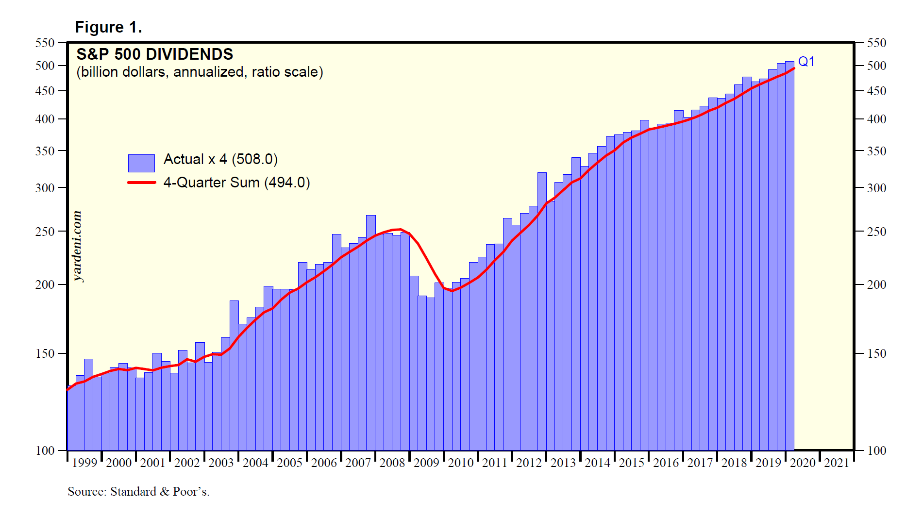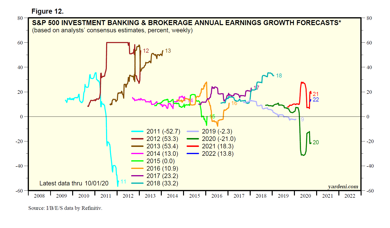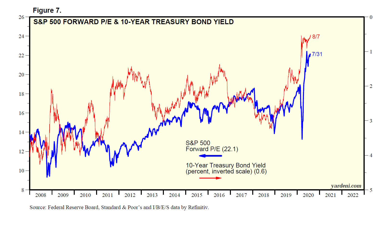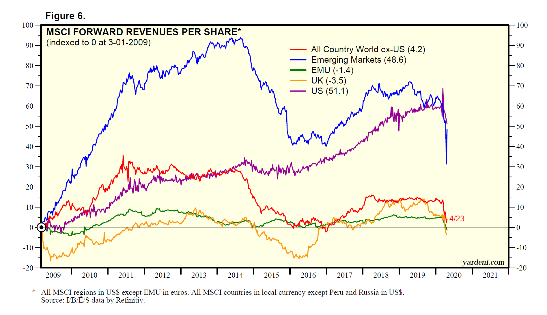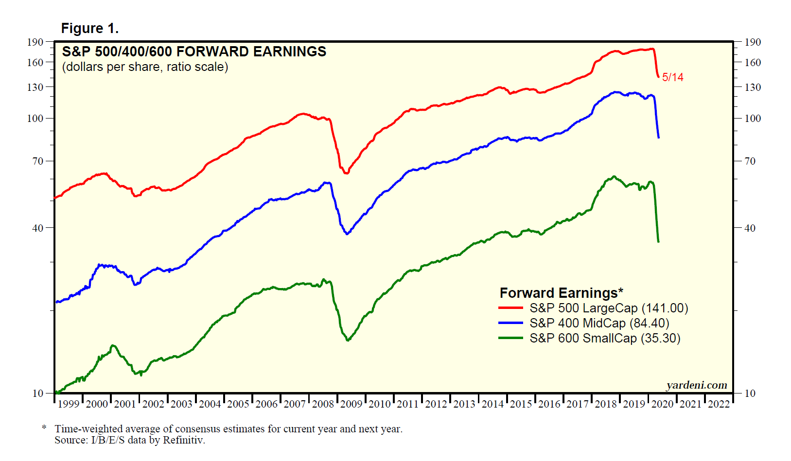 Corporate Finance I: Accounting for Fun & Profits. Yesterday, Joe and I raised our estimates for S&P 500 revenues and earnings per share and profit margins to the following: 2020 ($1,400, $140, 10%), 2021 ($1,545, $170, 11%), and 2022 ($1,625, $195, 12%). As a result, our S&P 500 year-end targets for this year and the next two years are now 3740, 4290, and 4620. (See YRI Earnings Forecasts.)