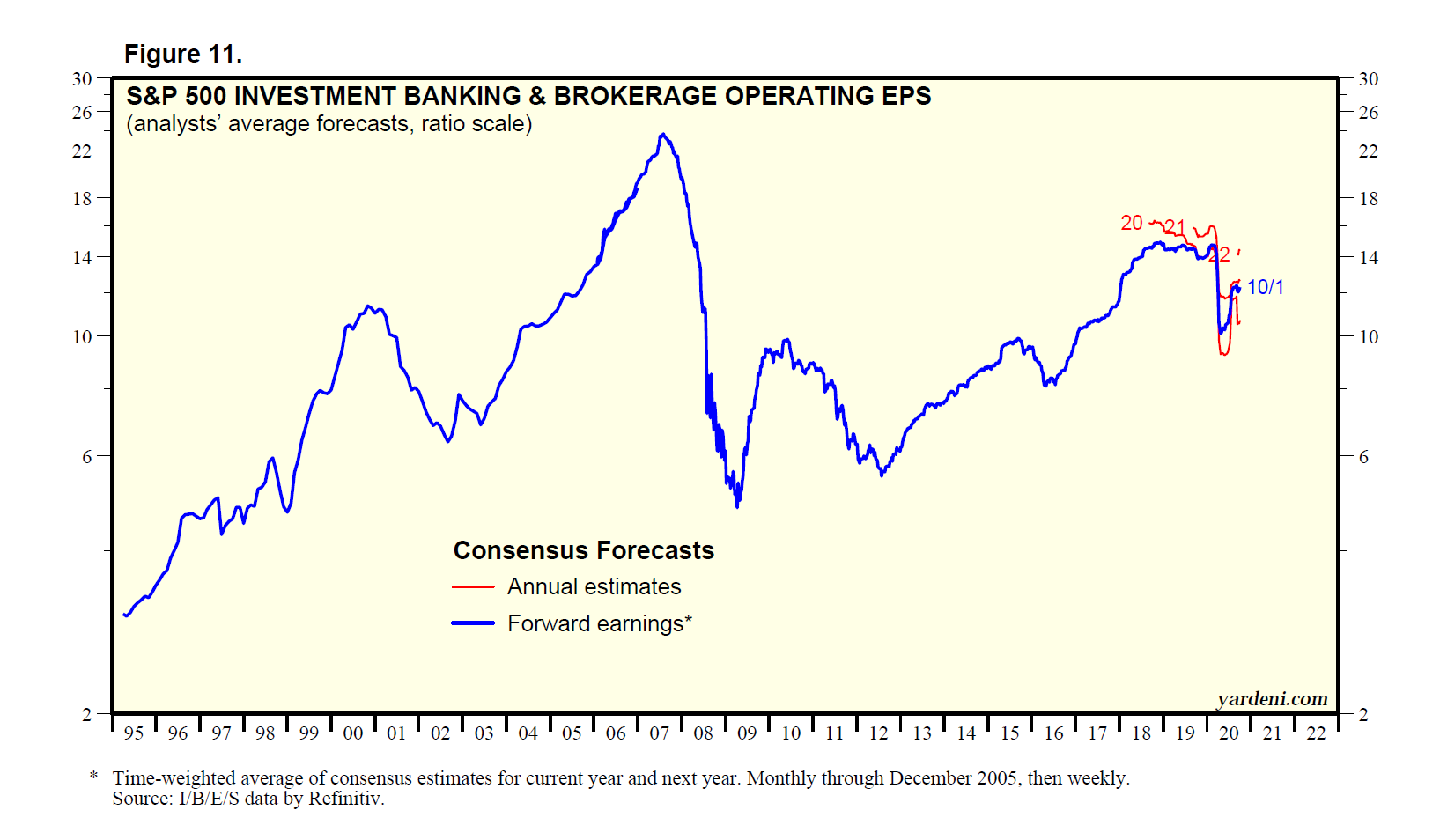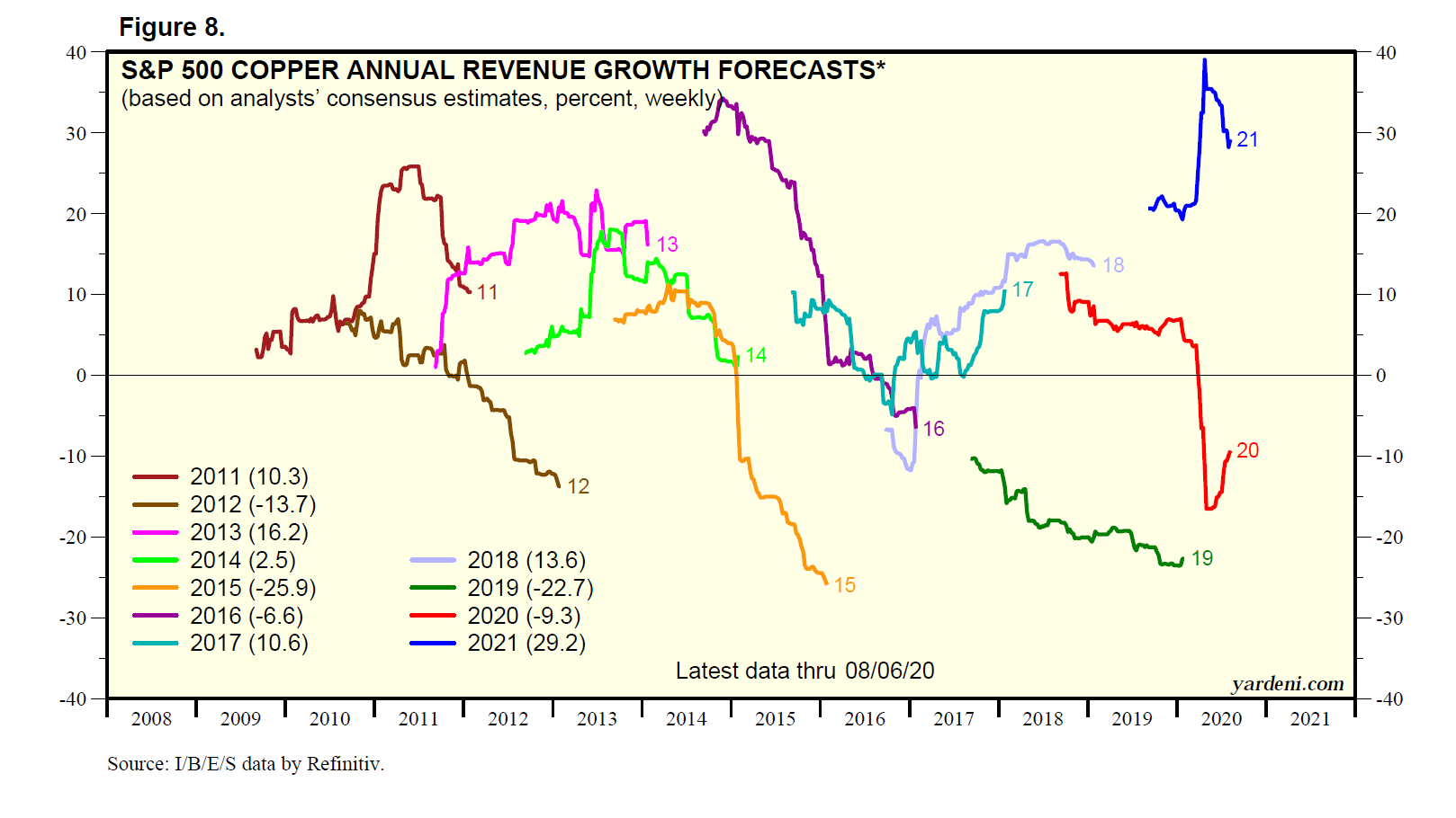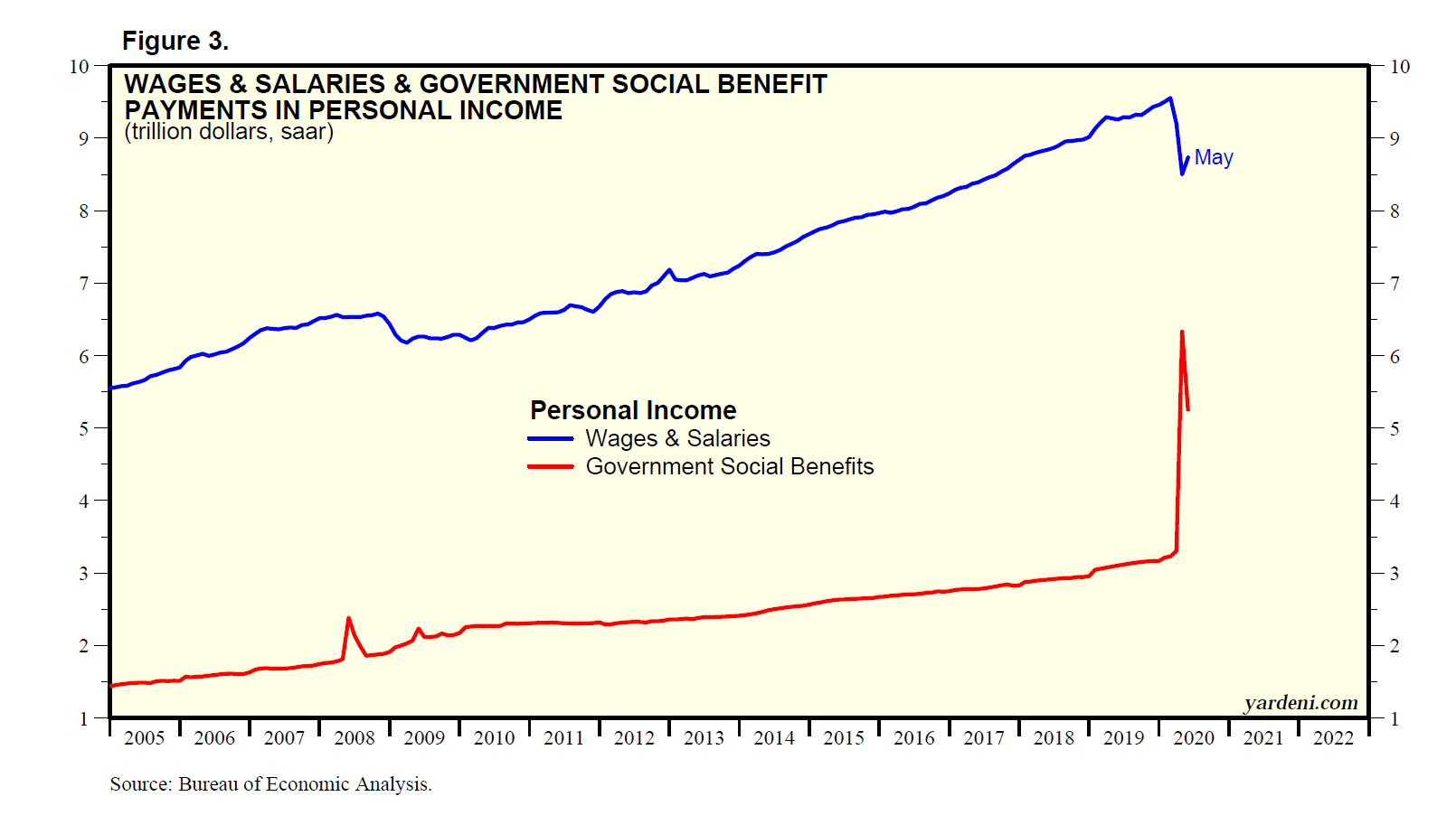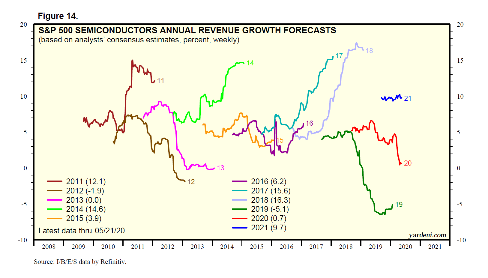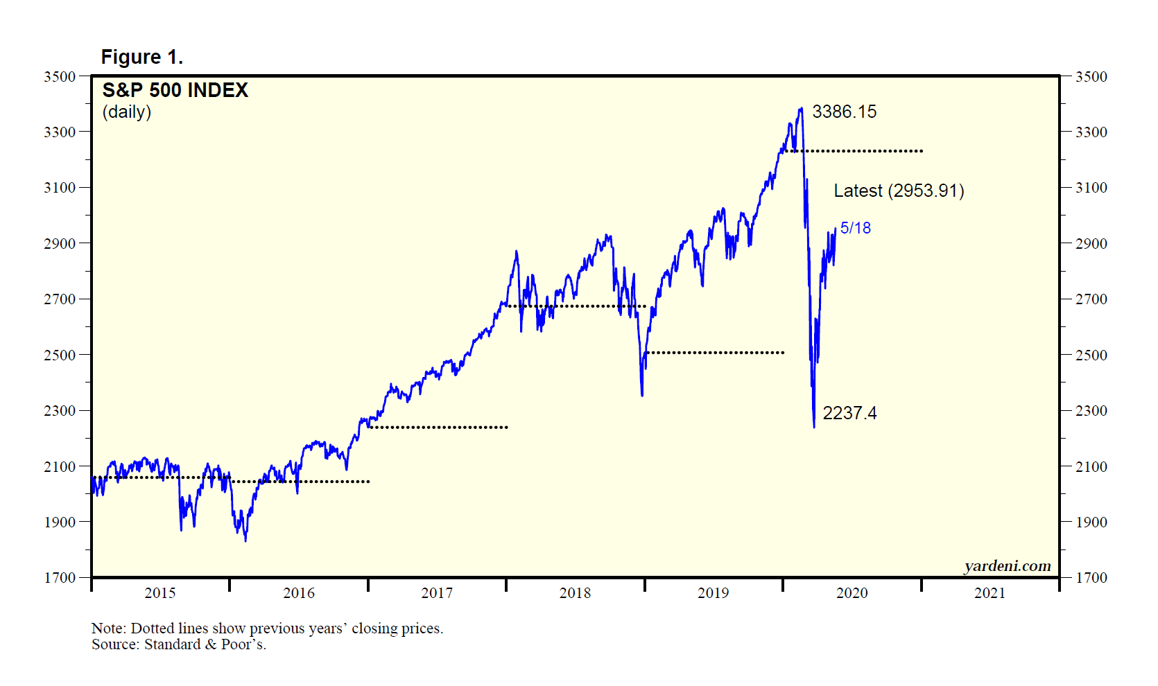 Corporate Finance I: Accounting for Fun & Profits. Yesterday, Joe and I raised our estimates for S&P 500 revenues and earnings per share and profit margins to the following: 2020 ($1,400, $140, 10%), 2021 ($1,545, $170, 11%), and 2022 ($1,625, $195, 12%). As a result, our S&P 500 year-end targets for this year and the next two years are now 3740, 4290, and 4620. (See YRI Earnings Forecasts.)